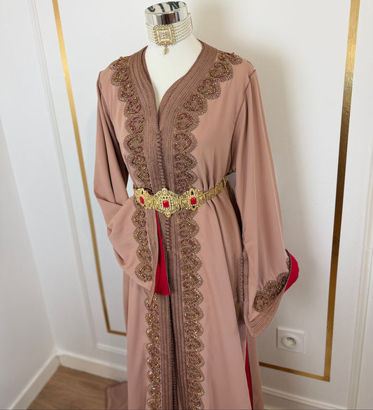 Regular price €0,00 EURRegular priceUnit price / perSale price €0,00 EURImmerse yourself in the world of refinement with this sumptuous caftan, designed for those seeking both elegance and comfort.This long style flatters your figure with its matching belt, wide sleeves, and flowing drape.Perfect for ceremonies, weddings, engagements, or special evenings,this caftan combines the charm of Moroccan craftsmanship with a contemporary touch,for a distinguished and contemporary look. -