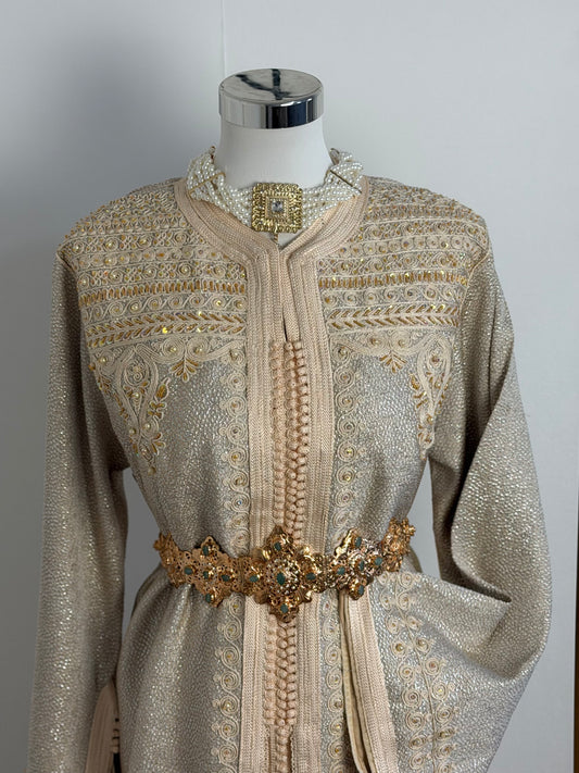 Regular price €0,00 EURRegular priceUnit price / perSale price €0,00 EURImmerse yourself in the world of refinement with this sumptuous caftan, designed for those seeking both elegance and comfort.This long style flatters your figure with its matching belt, wide sleeves, and flowing drape.Perfect for ceremonies, weddings, engagements, or special evenings,this caftan combines the charm of Moroccan craftsmanship with a contemporary touch,for a distinguished and contemporary look.