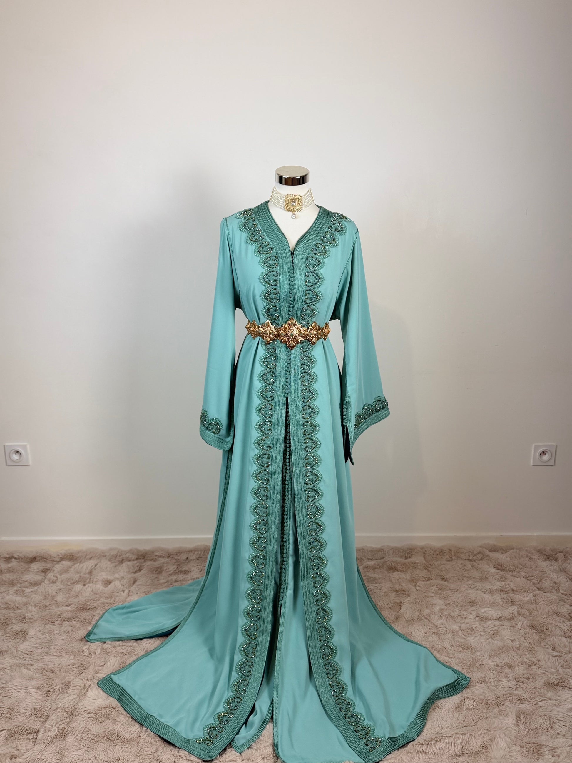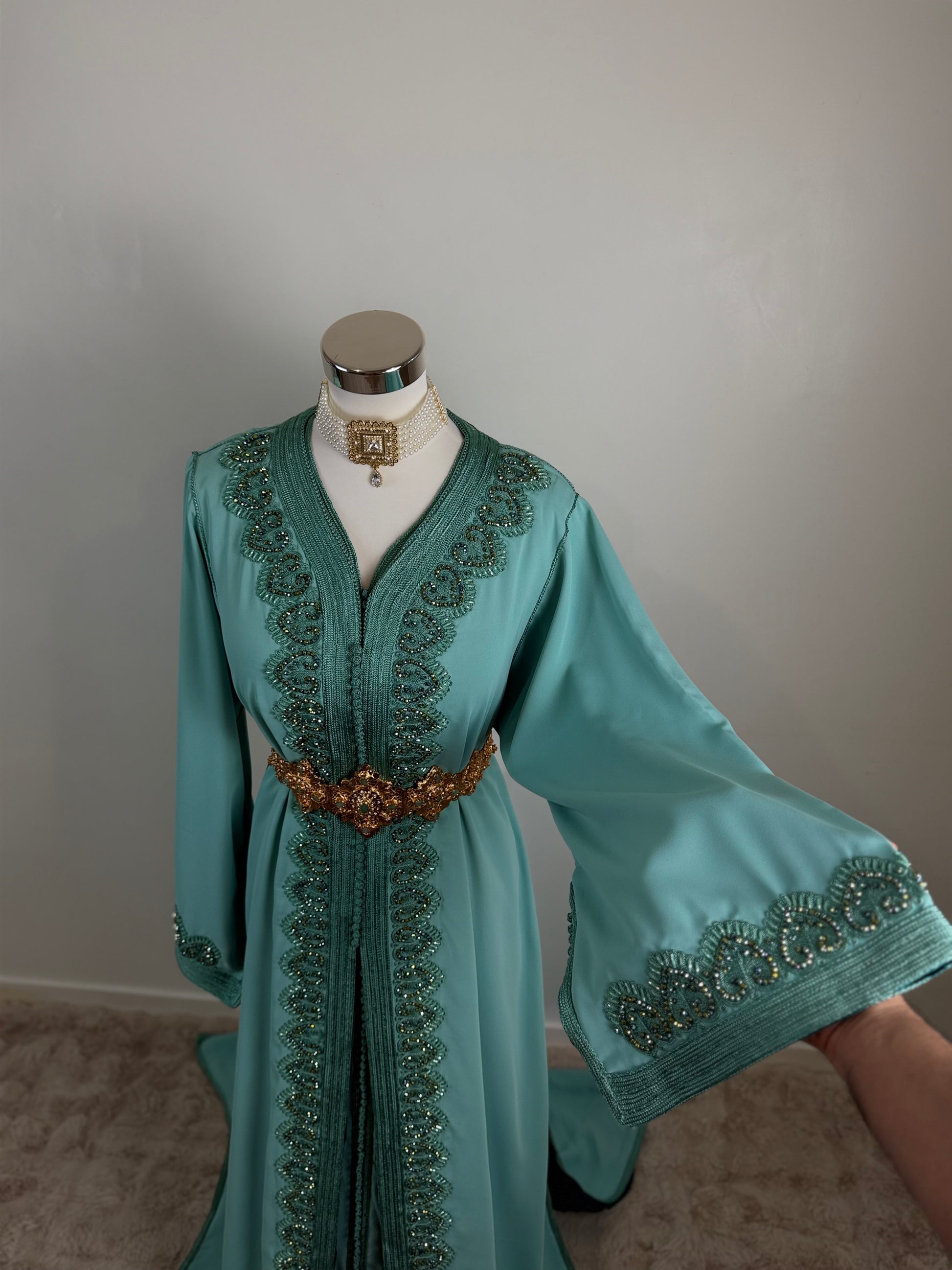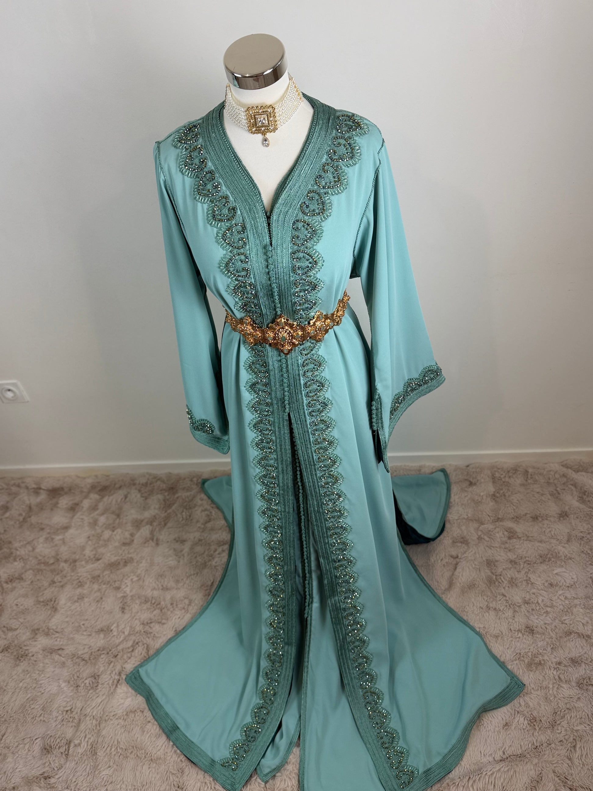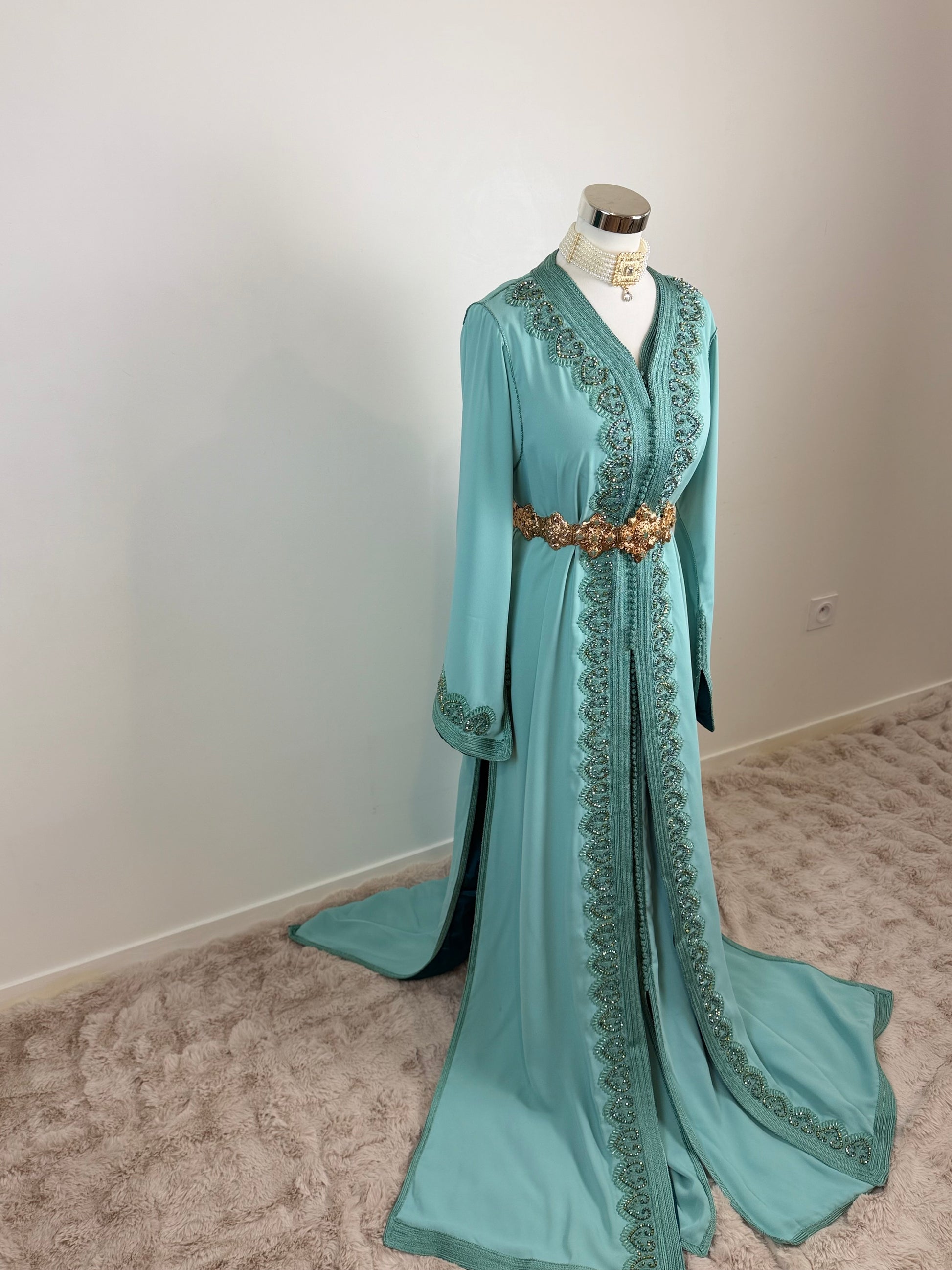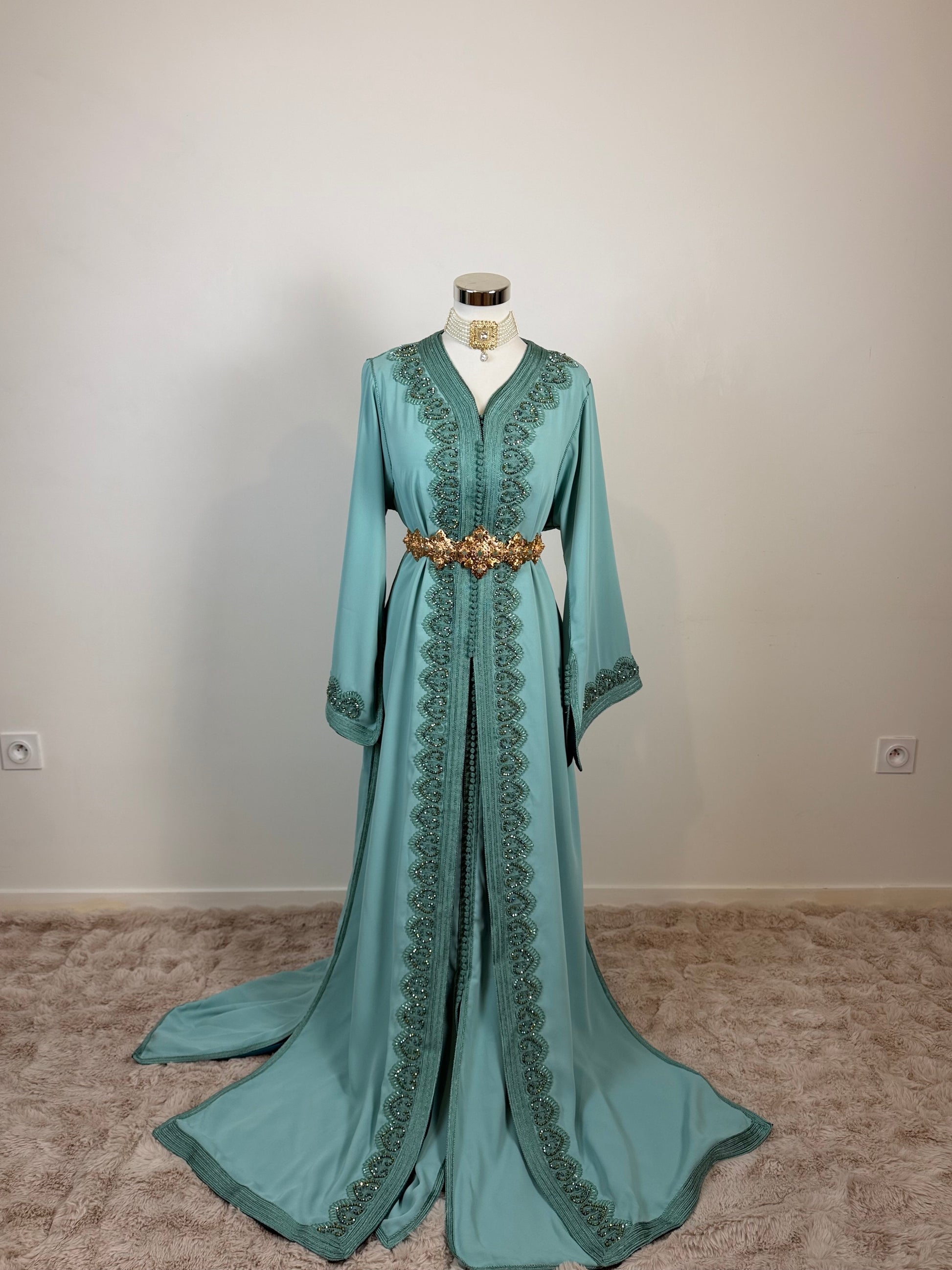 this caftan combines the charm of Moroccan craftsmanship with a contemporary touch,