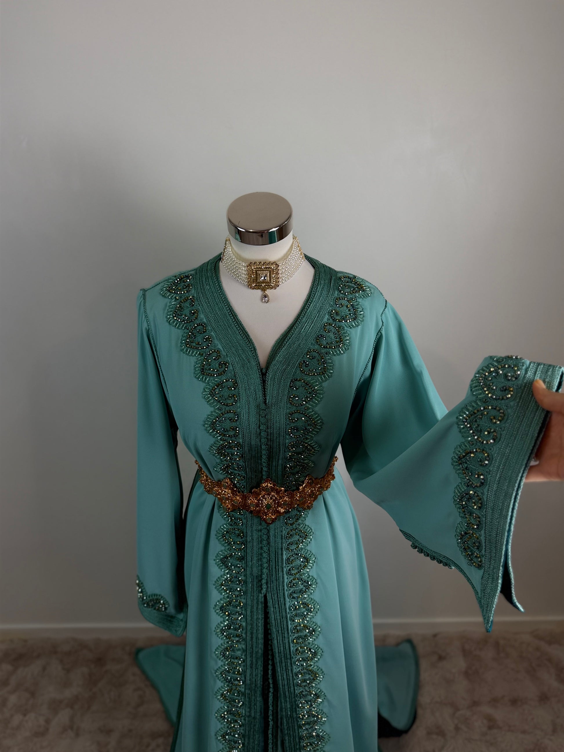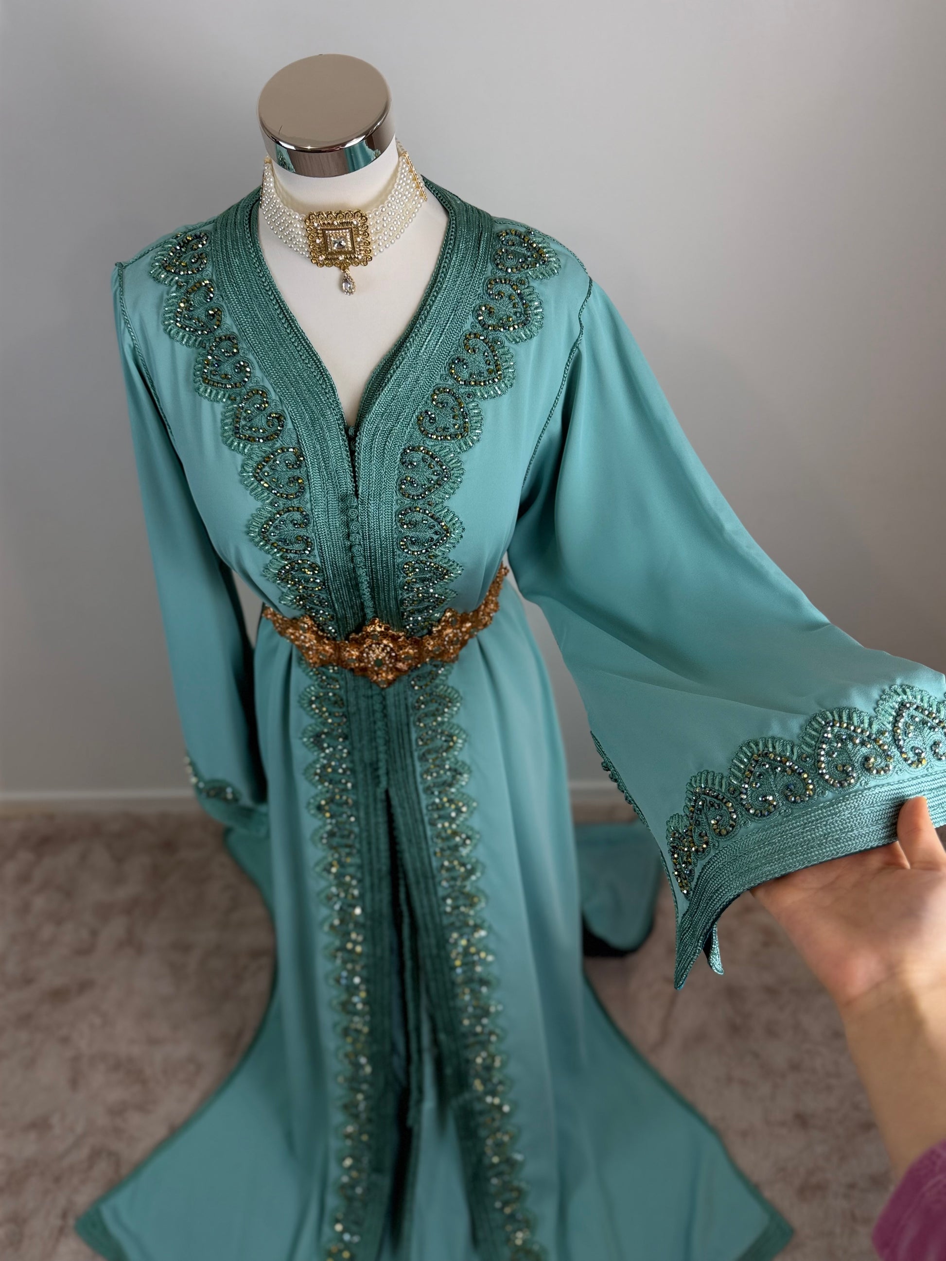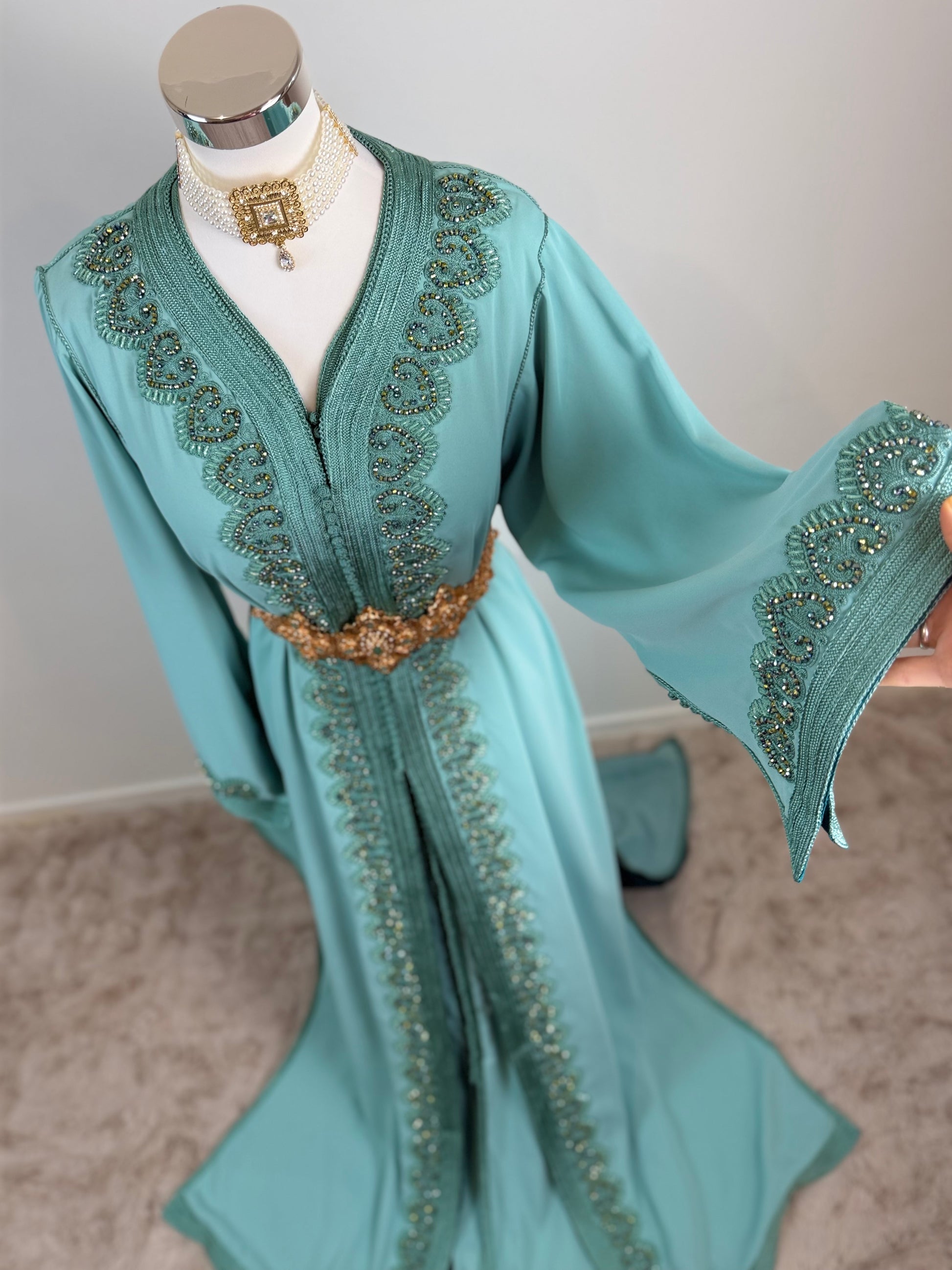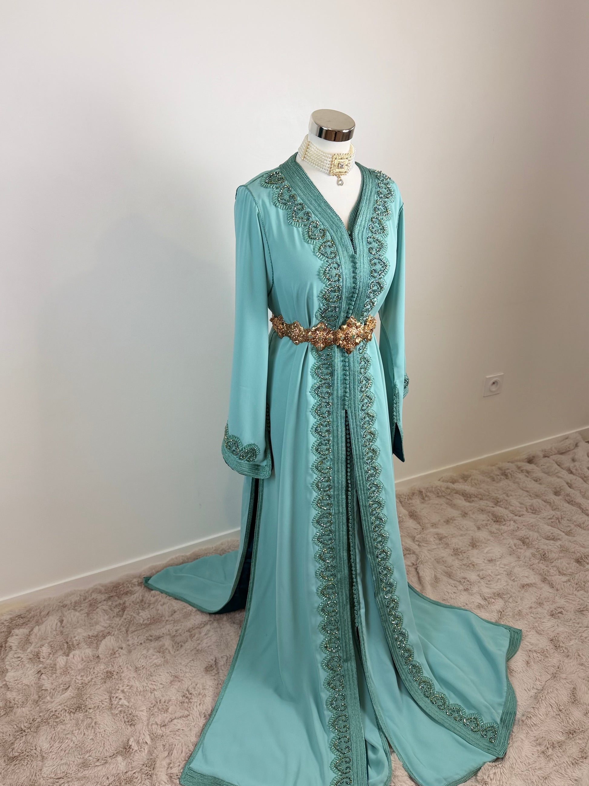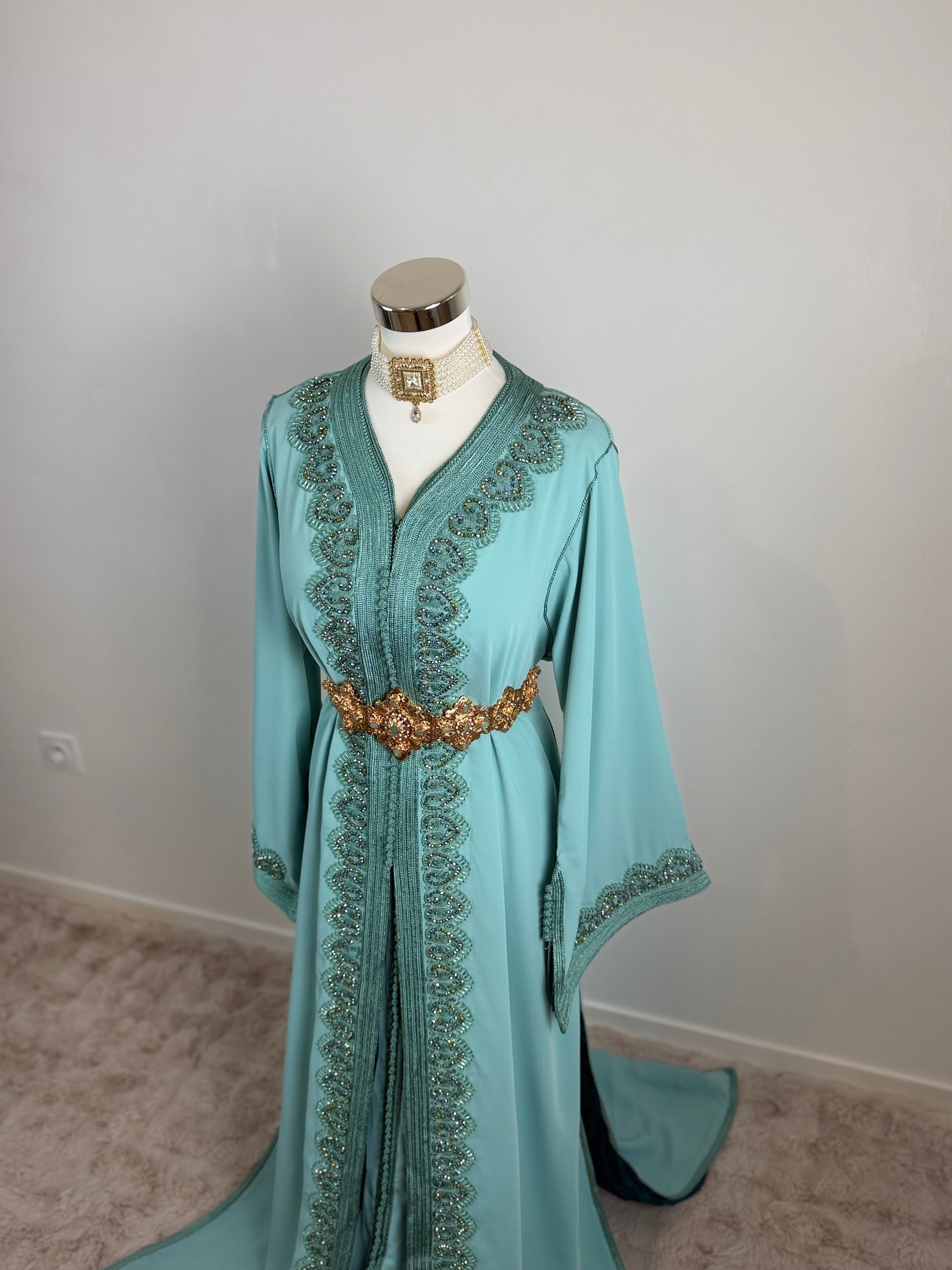 this caftan combines the charm of Moroccan craftsmanship with a contemporary touch,