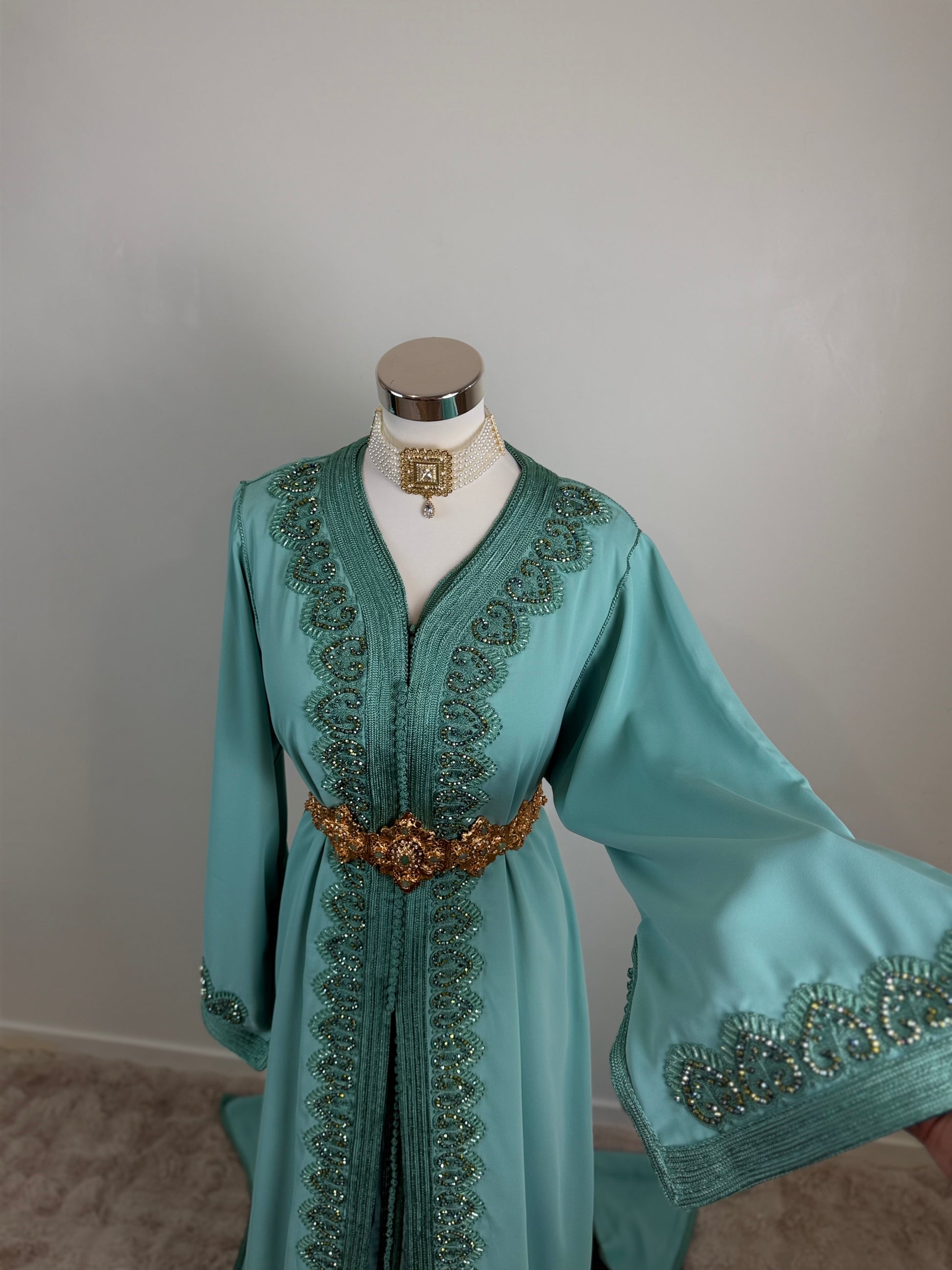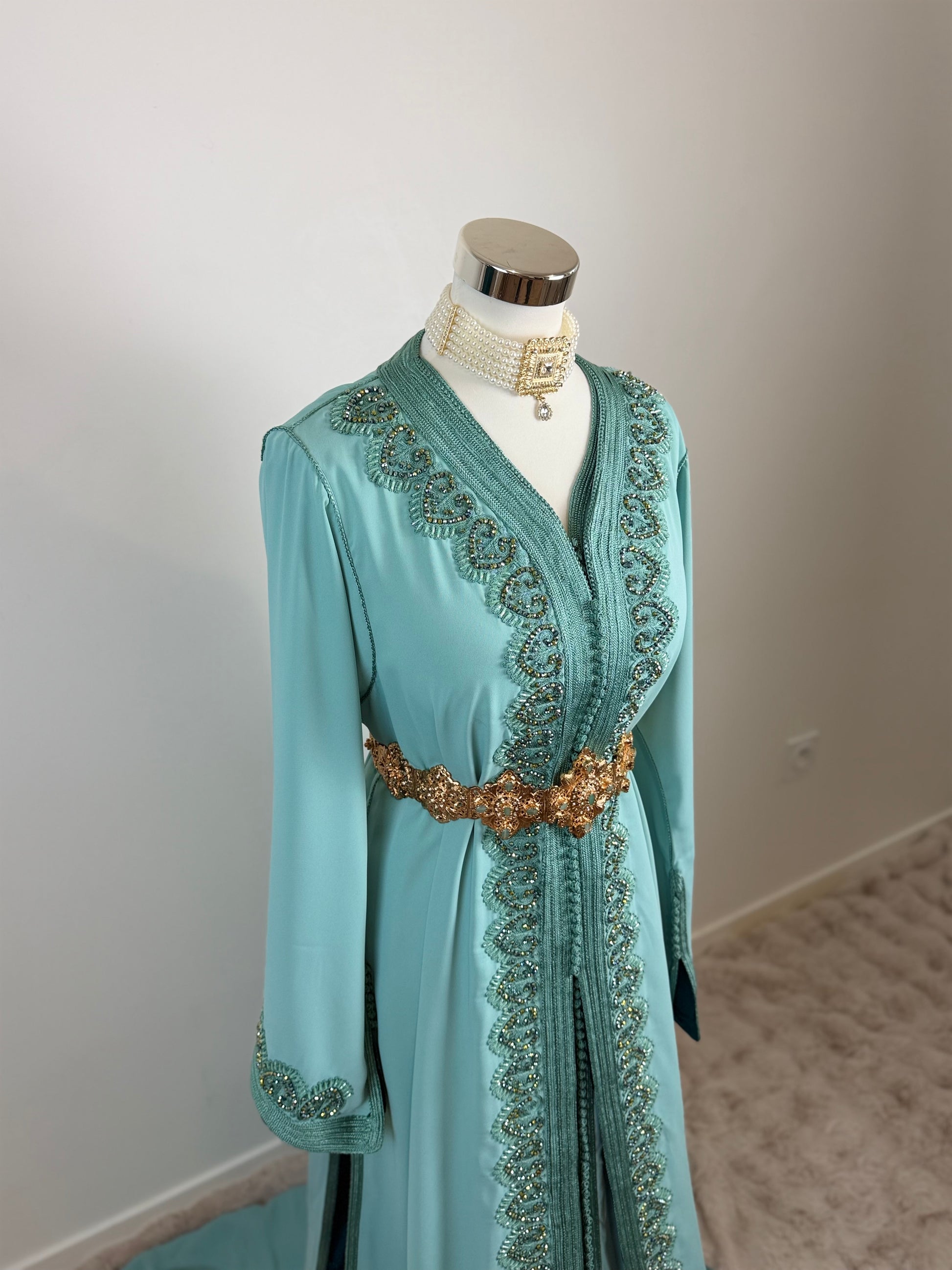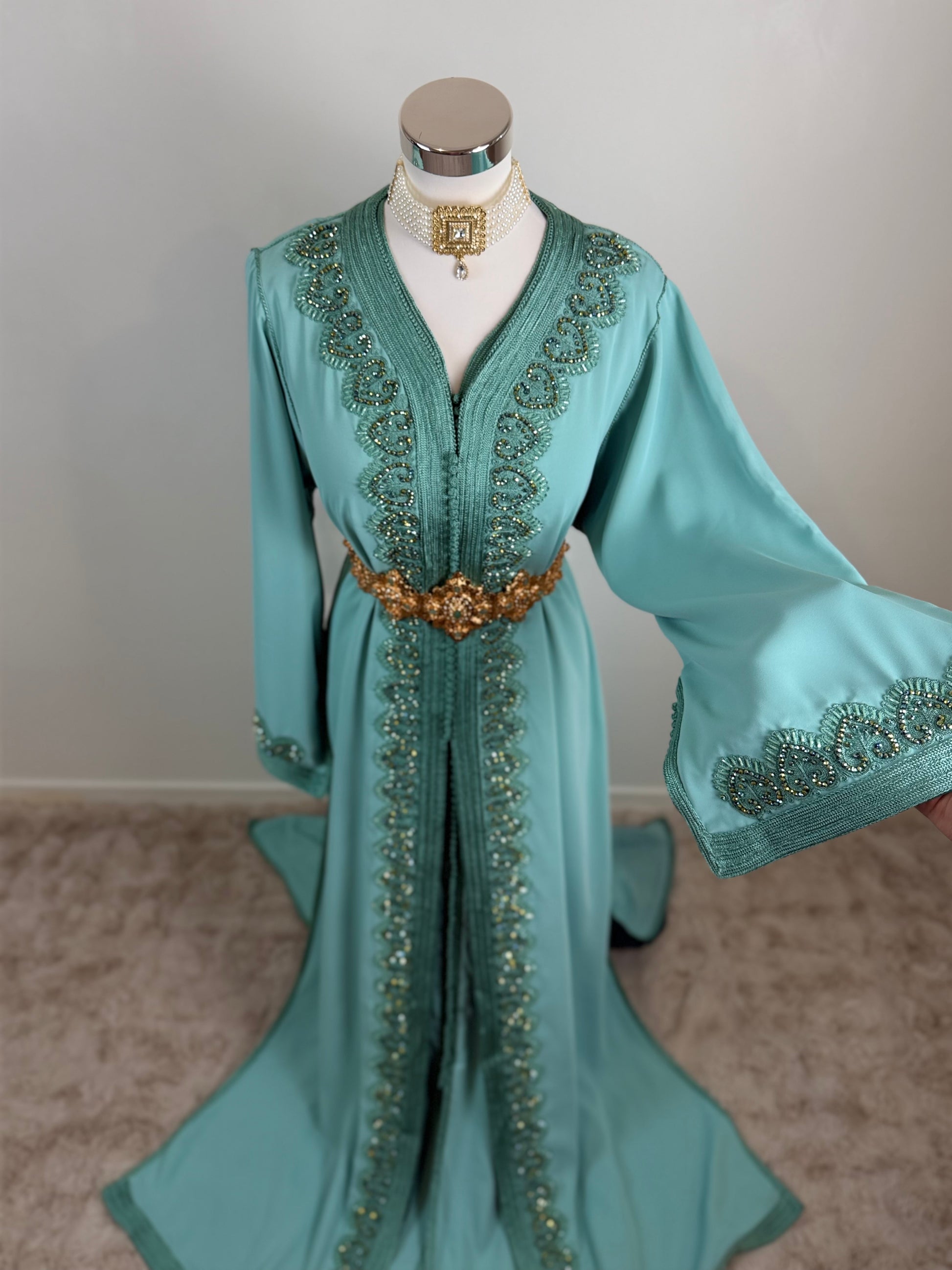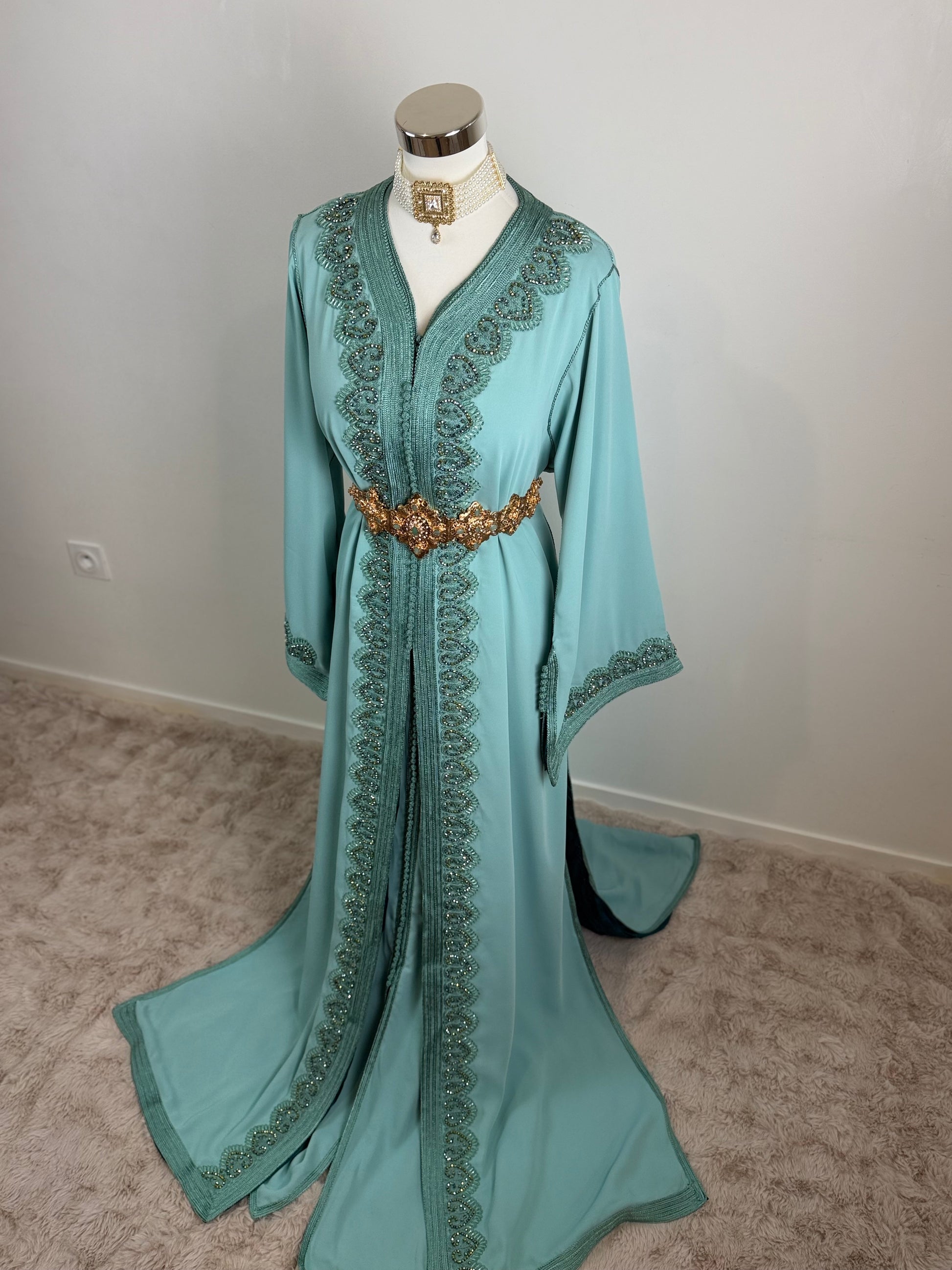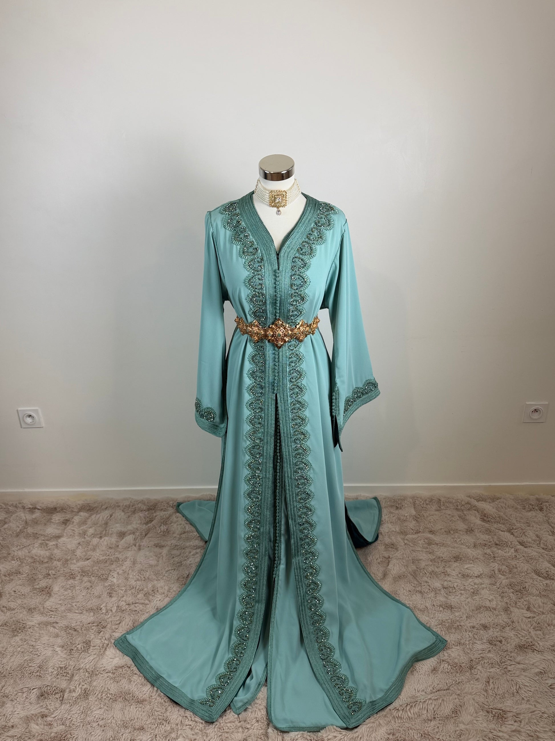 this caftan combines the charm of Moroccan craftsmanship with a contemporary touch,