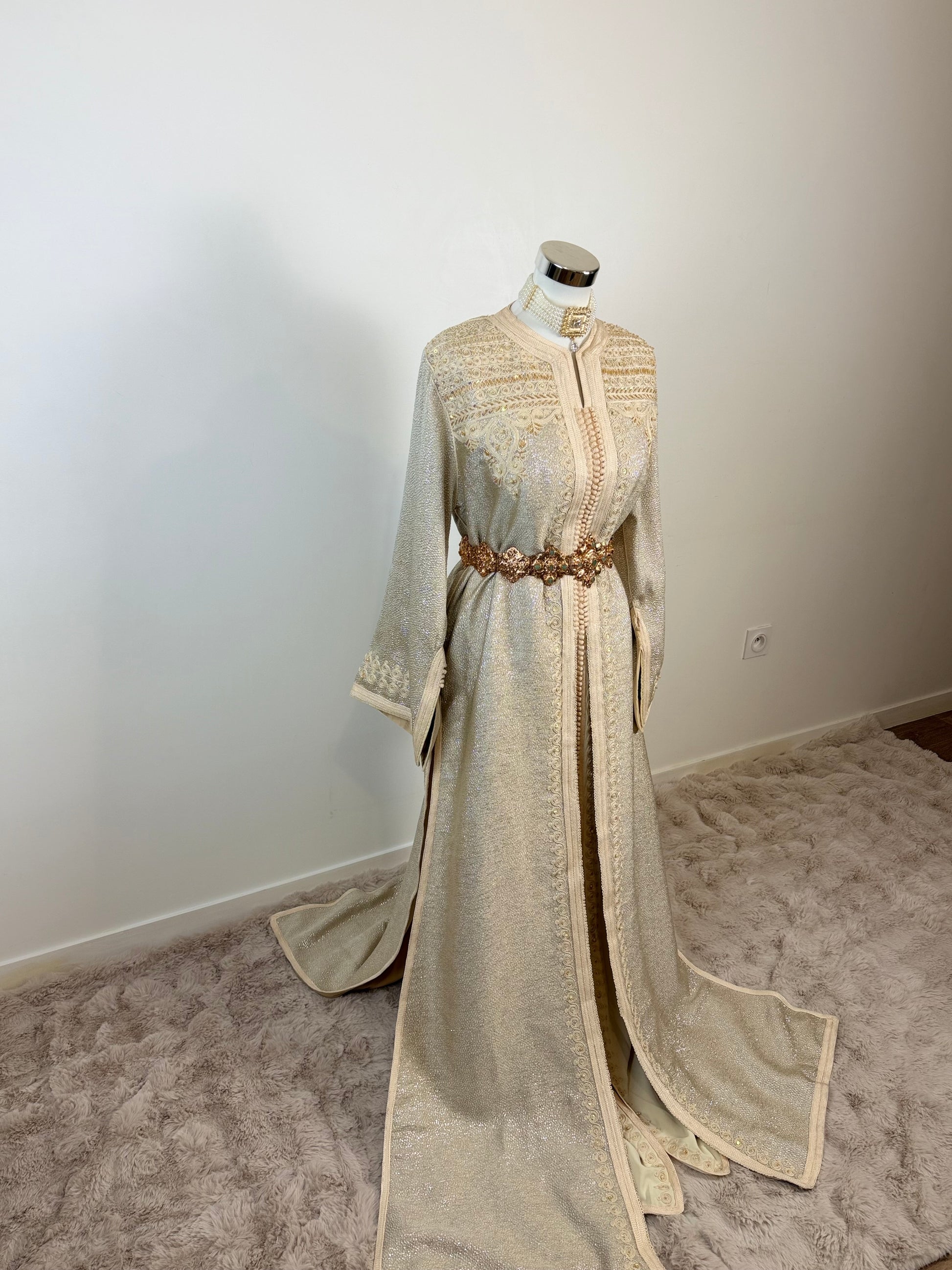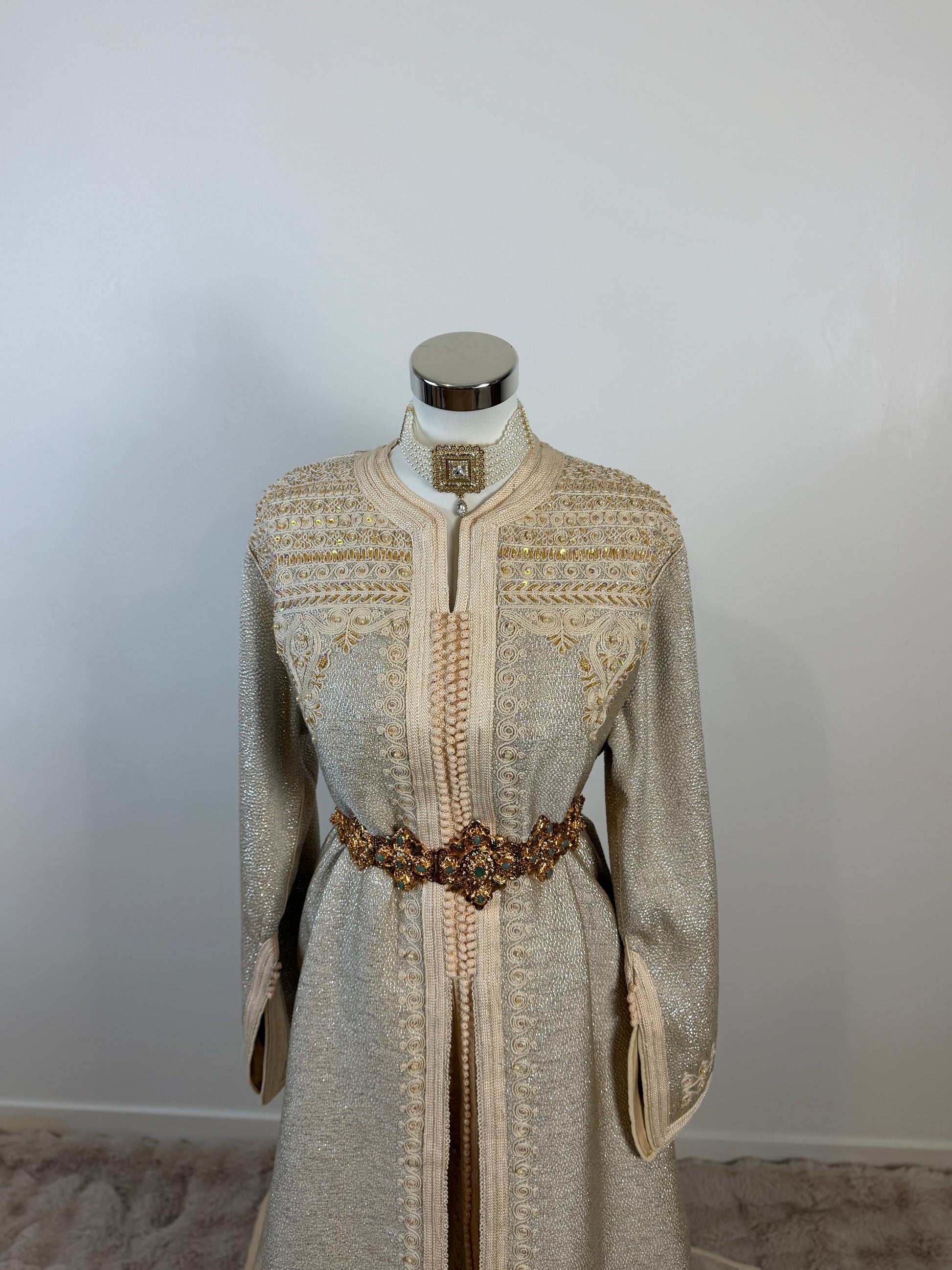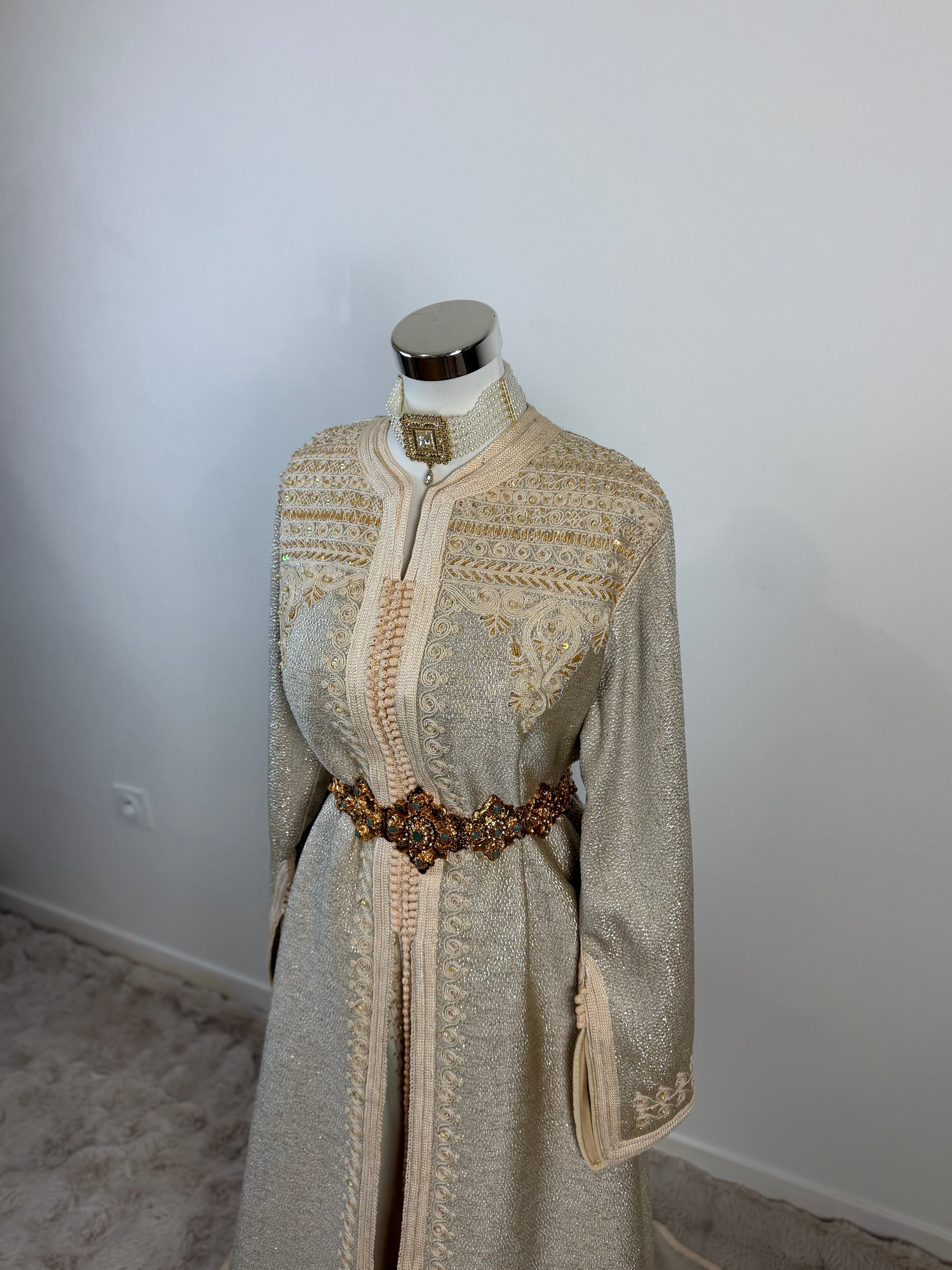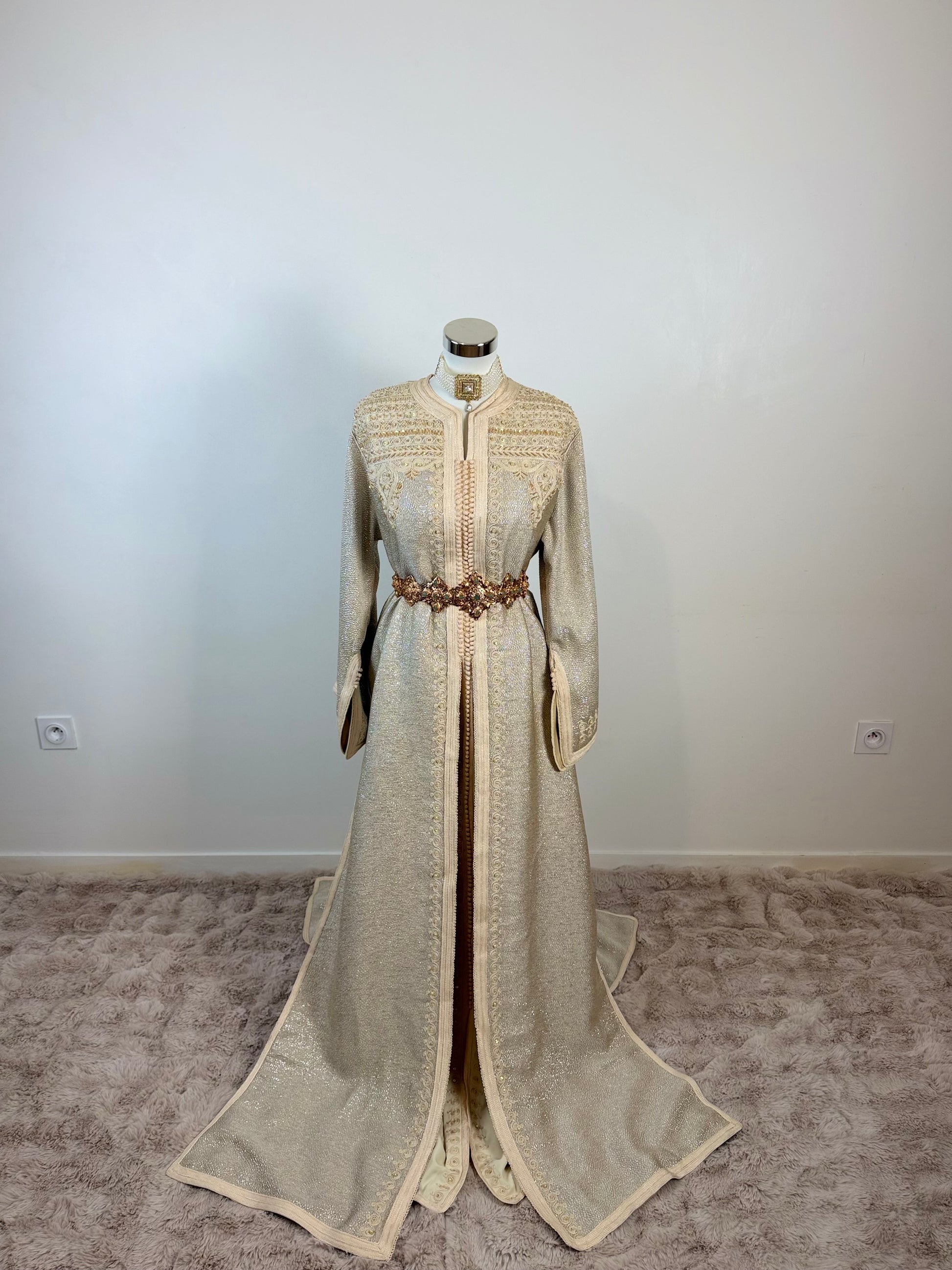 this caftan combines the charm of Moroccan craftsmanship with a contemporary touch,