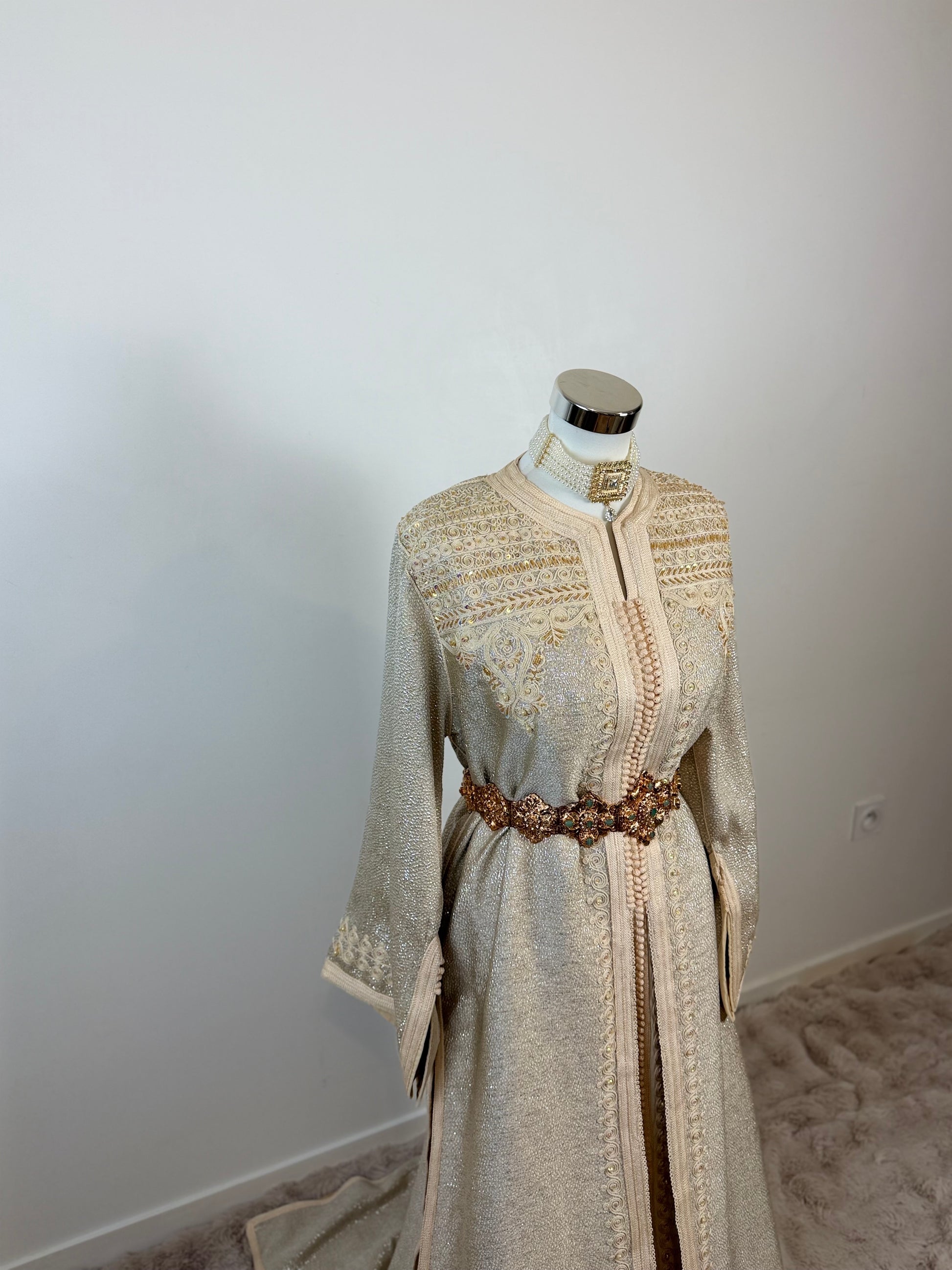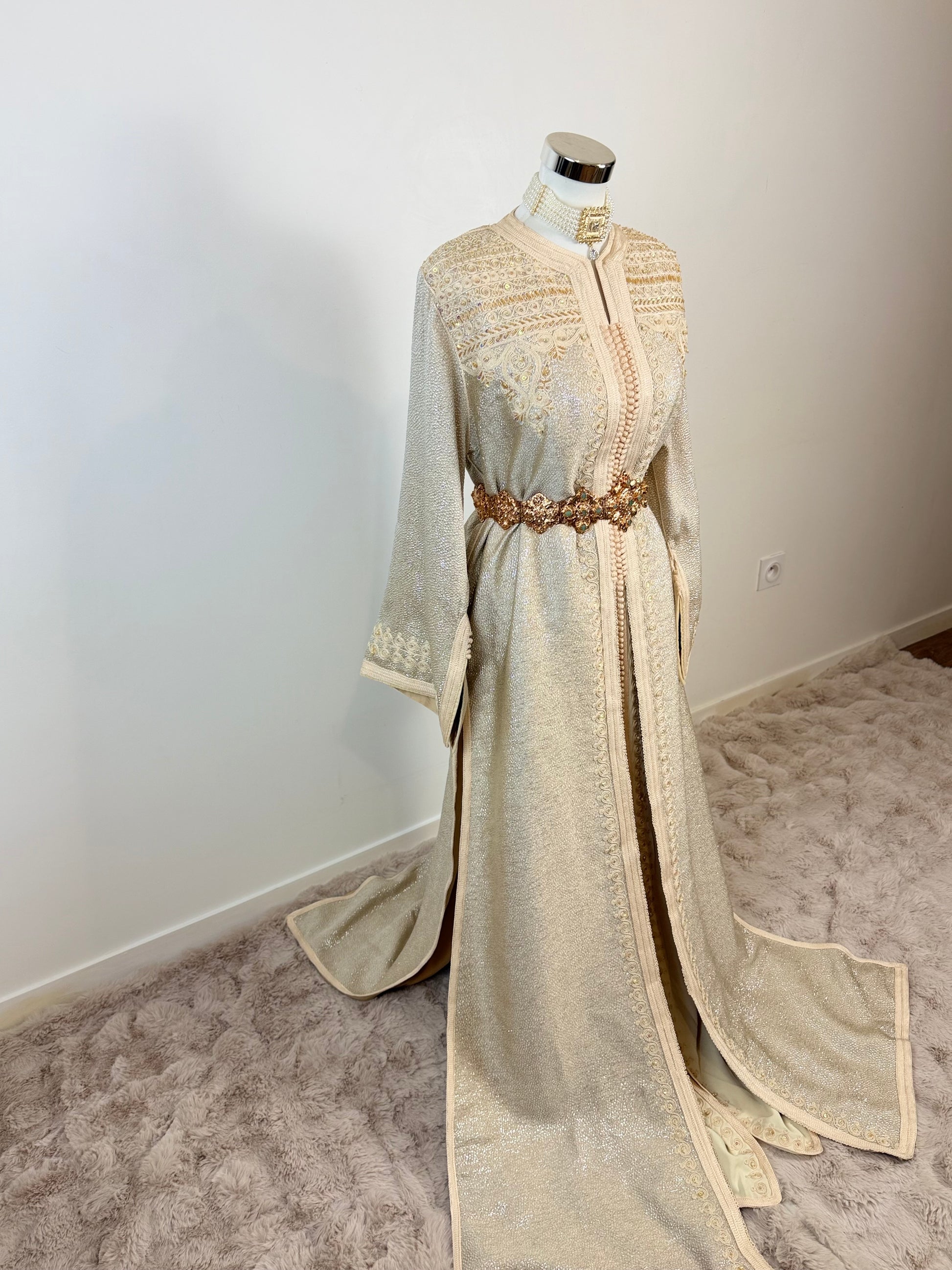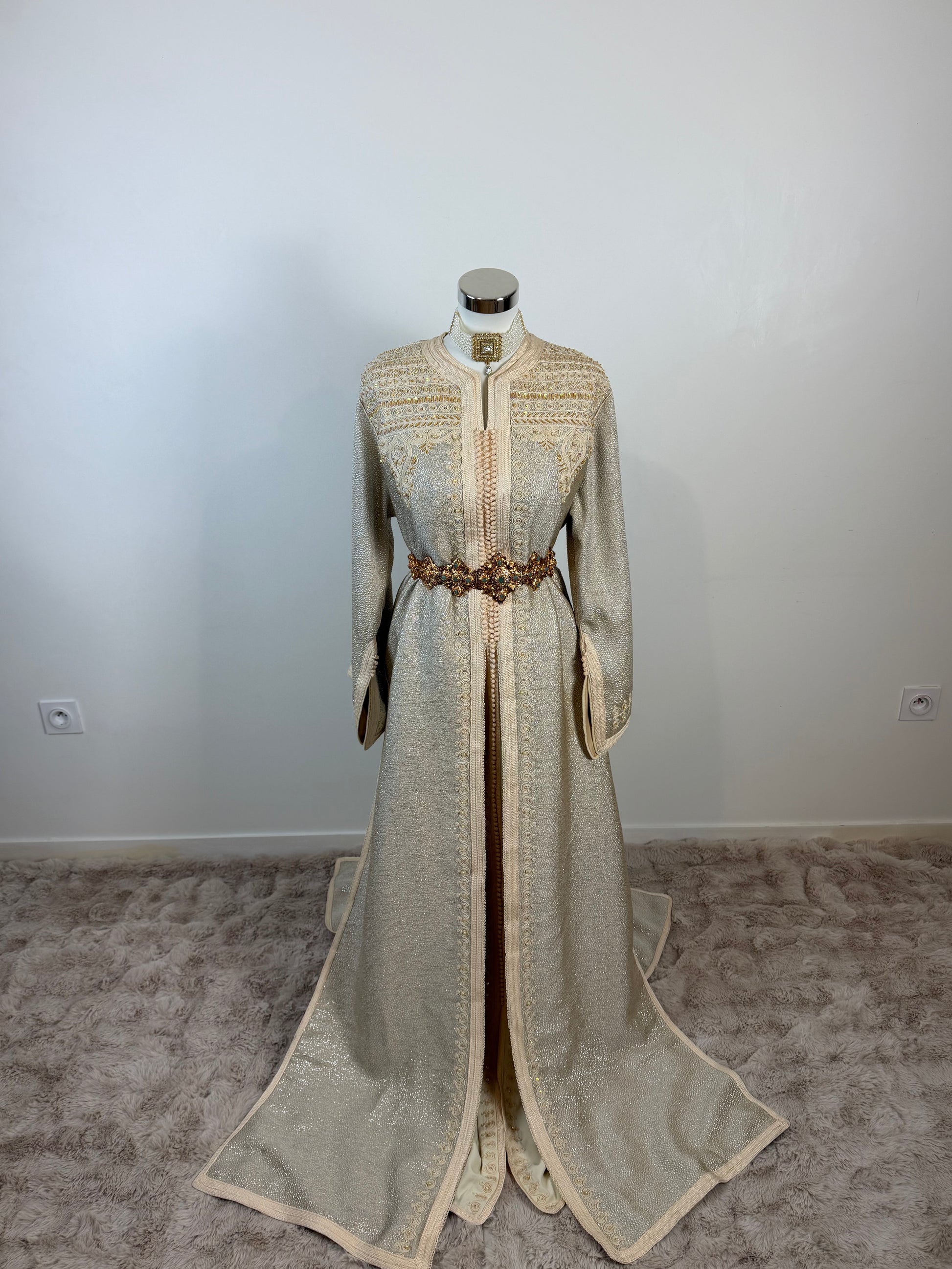 this caftan combines the charm of Moroccan craftsmanship with a contemporary touch,
