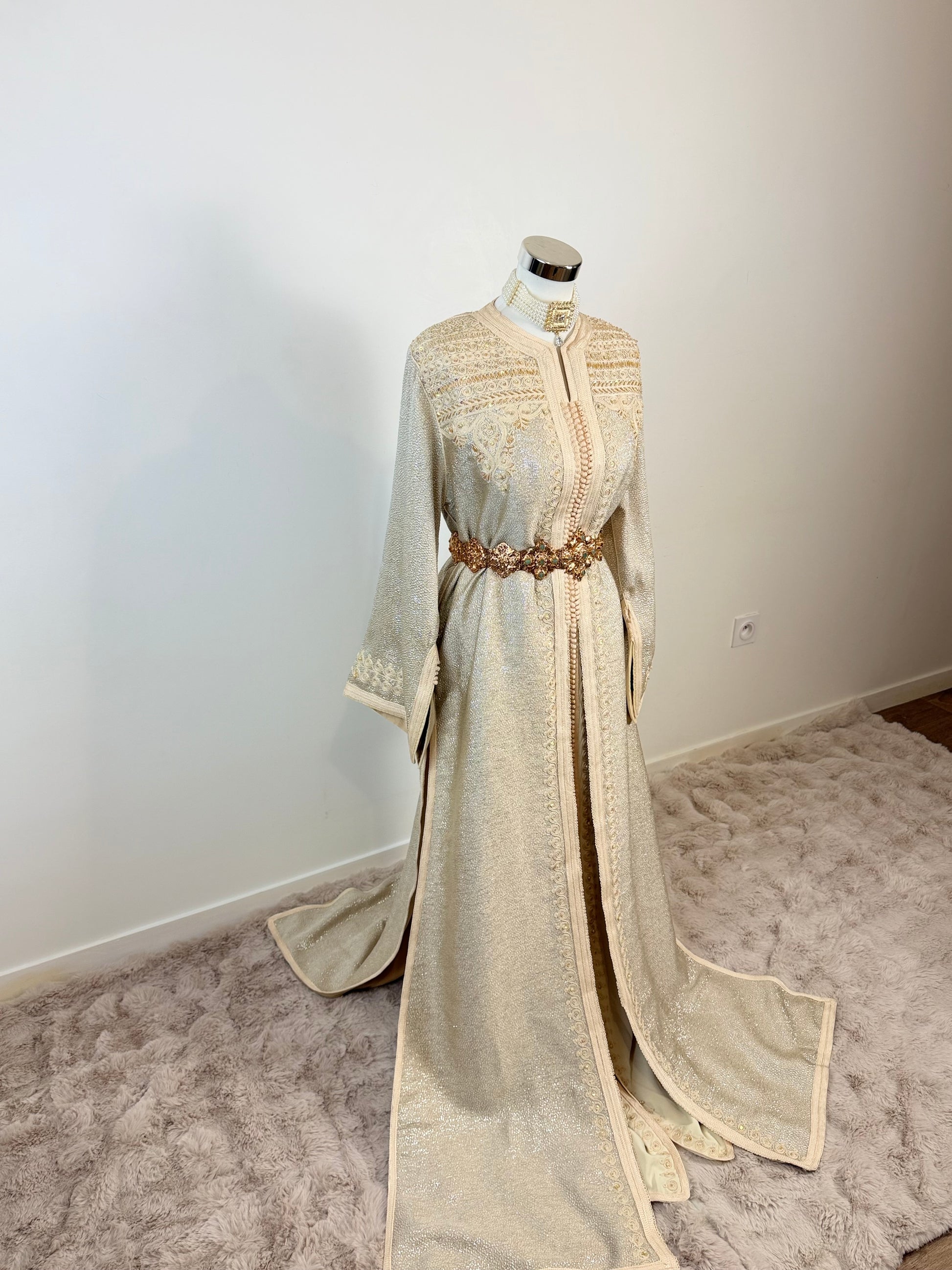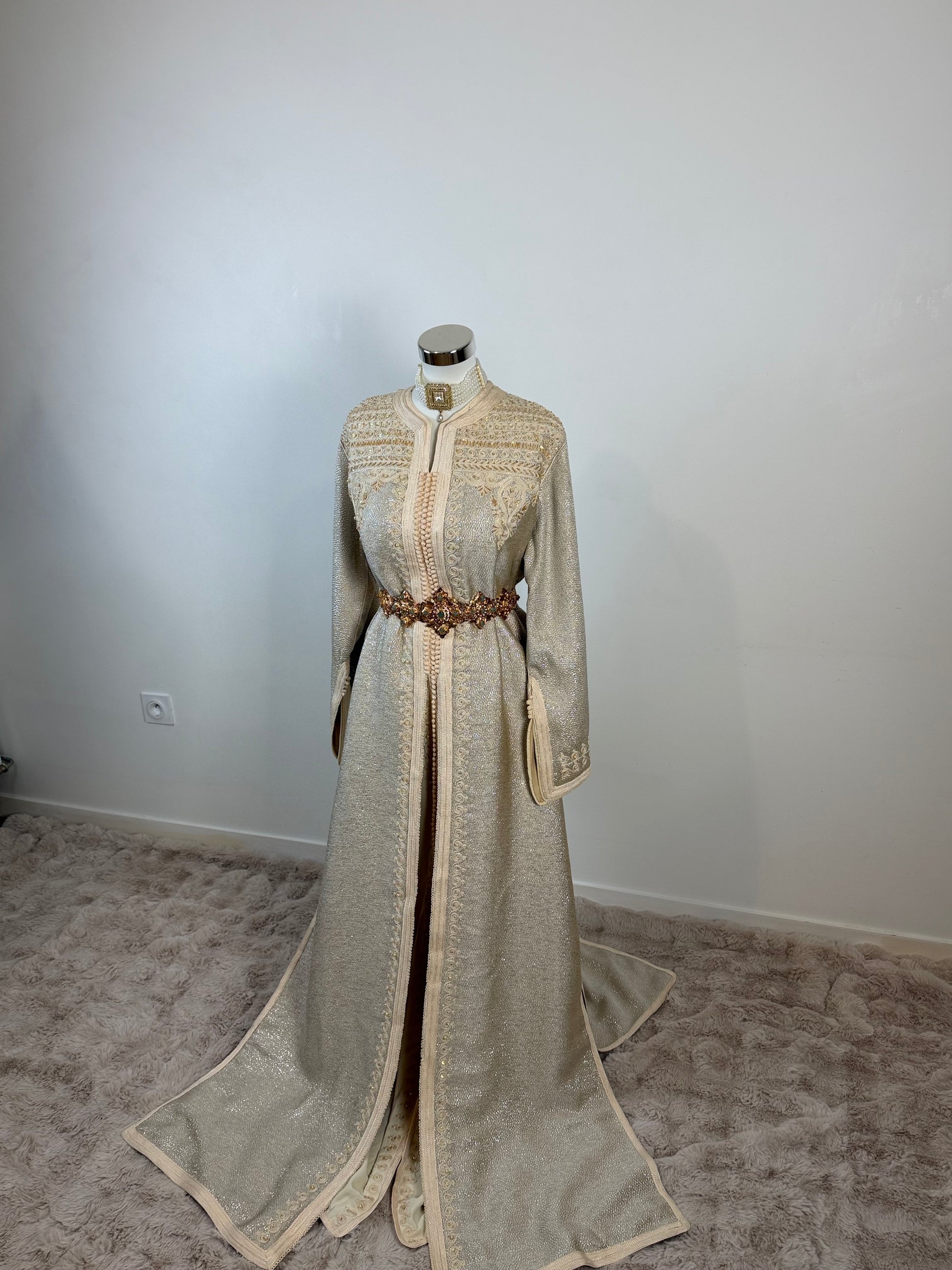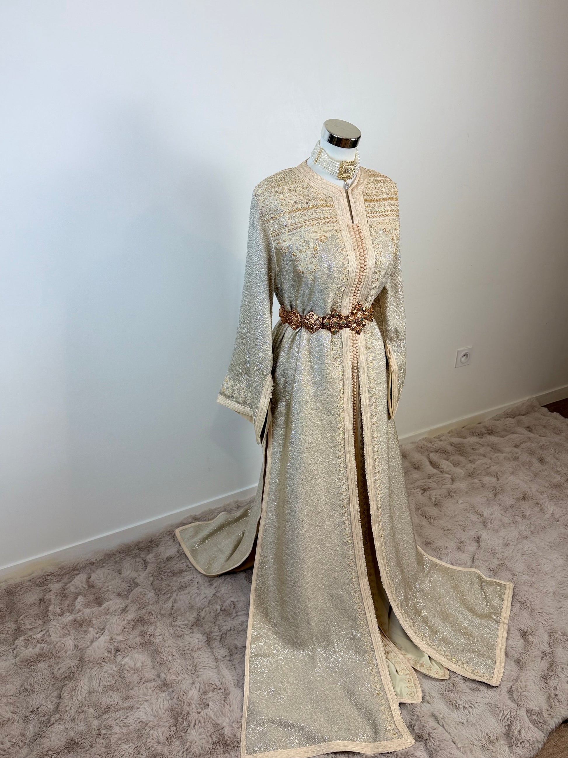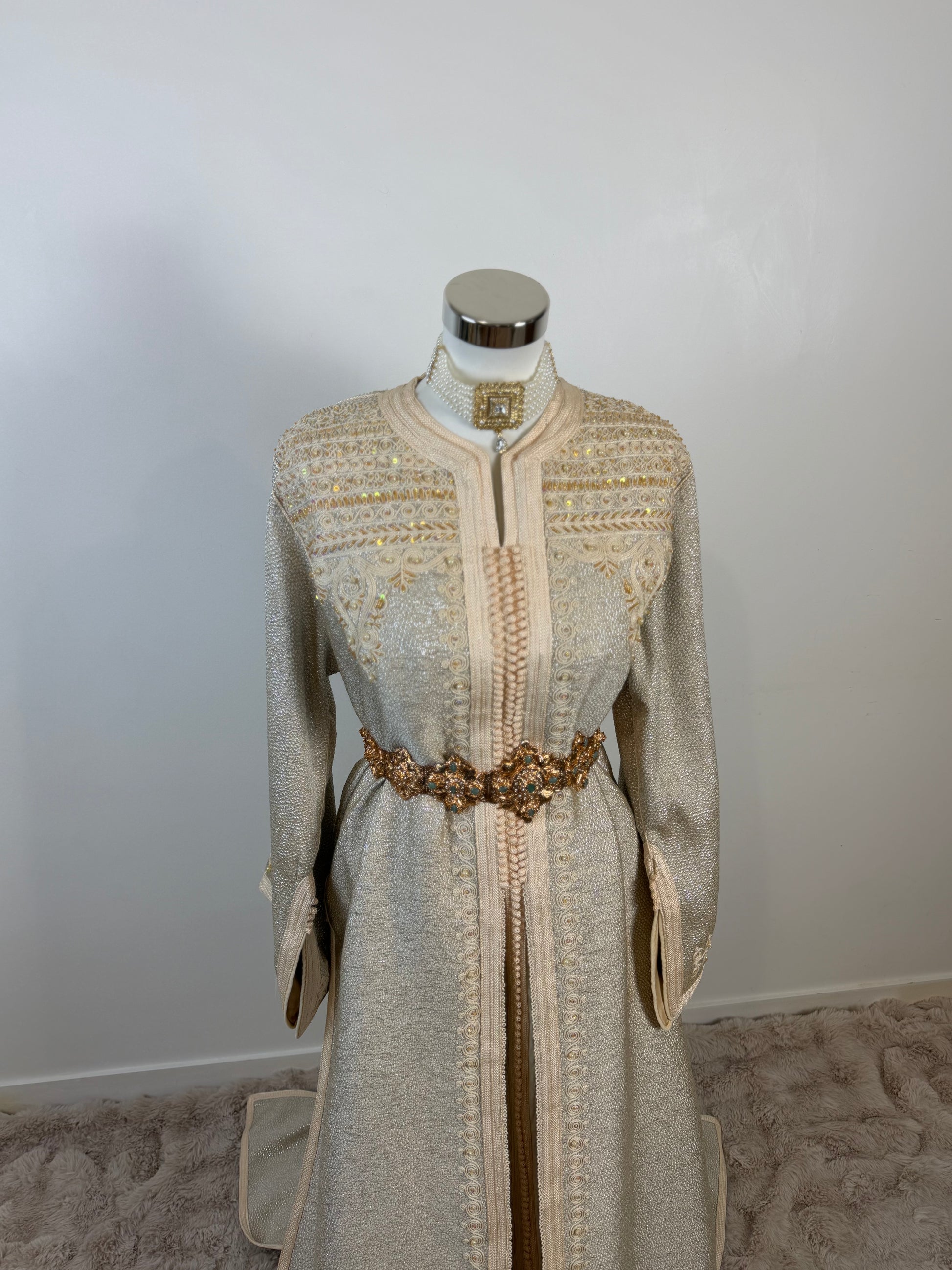 this caftan combines the charm of Moroccan craftsmanship with a contemporary touch,
