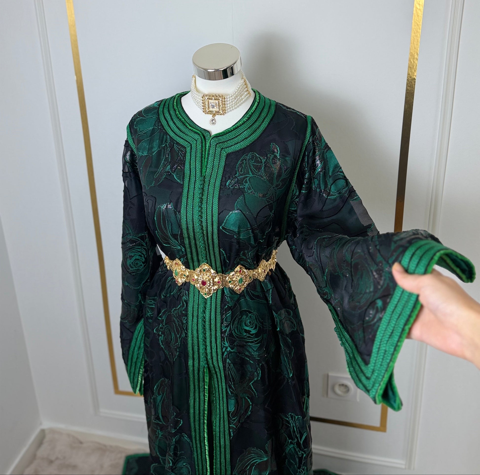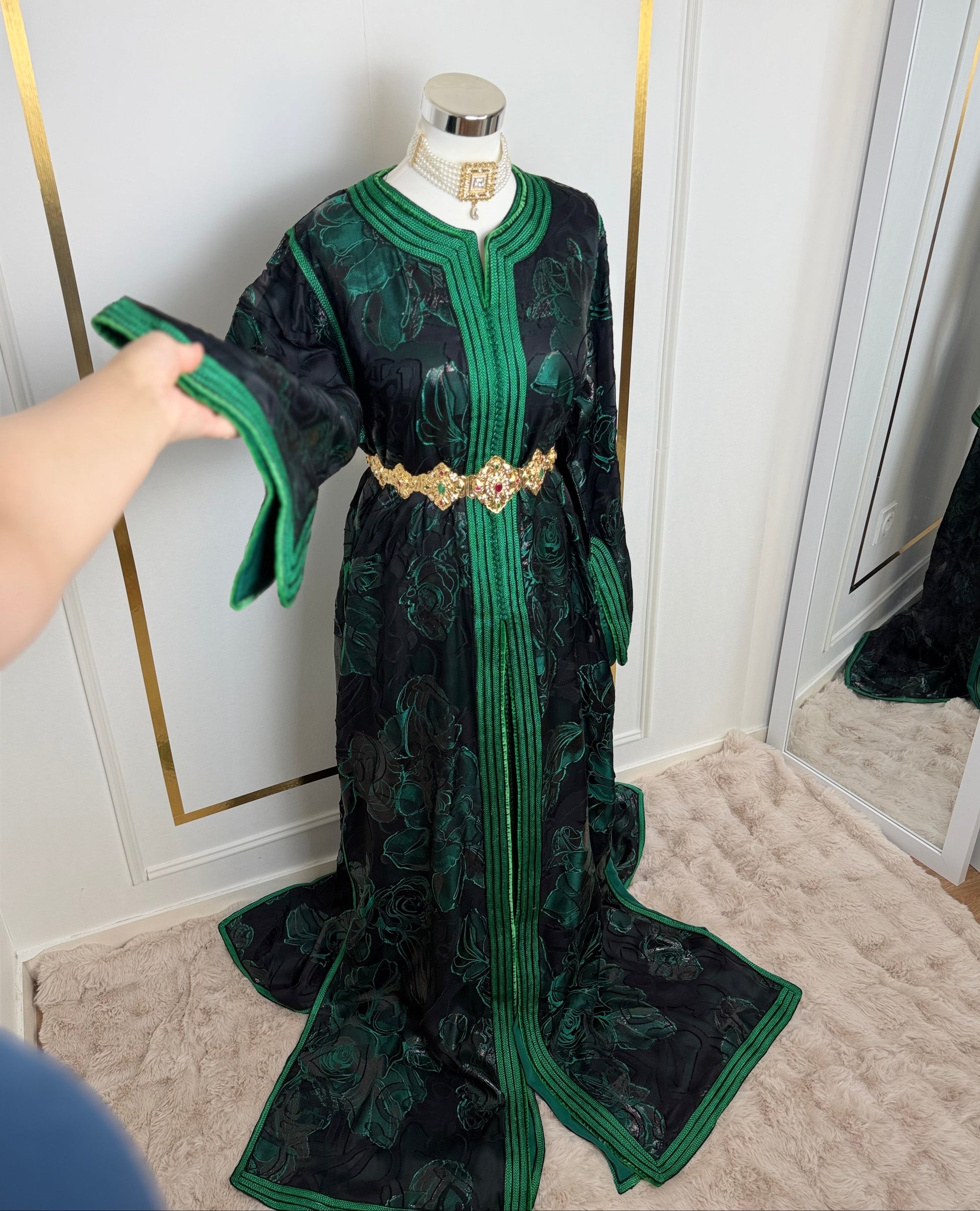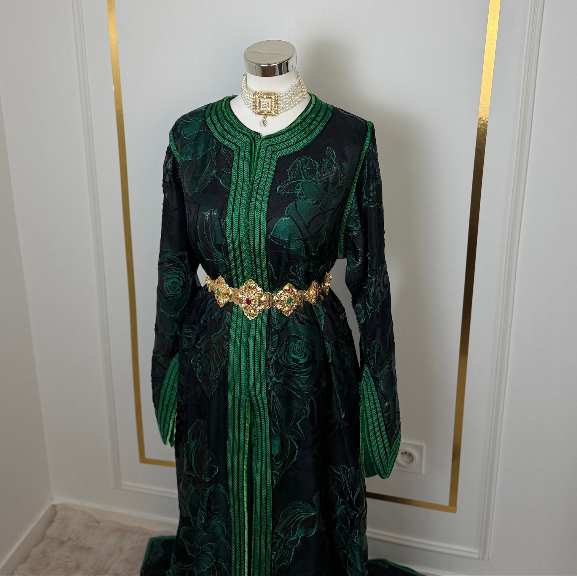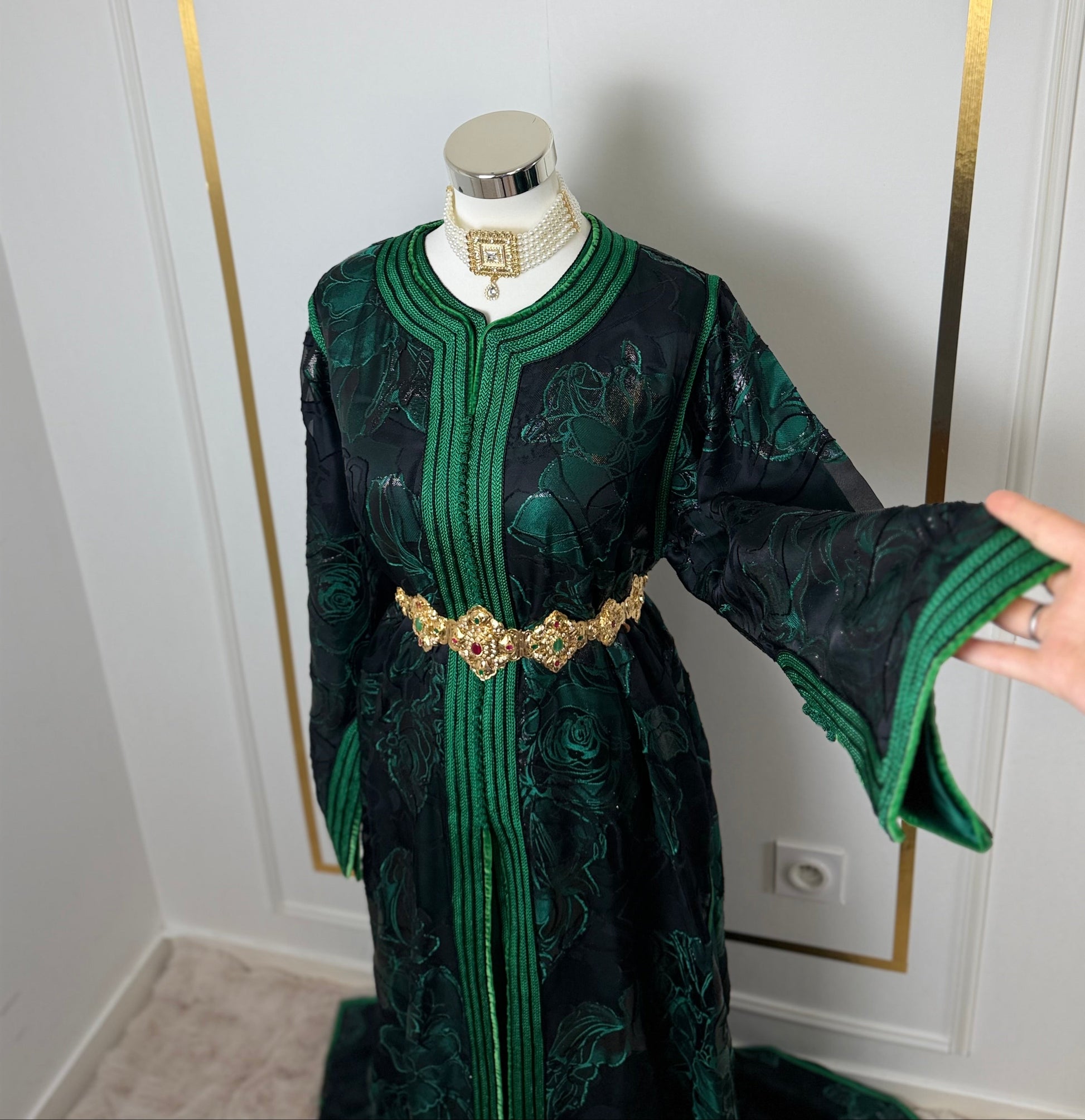 this caftan combines the charm of Moroccan craftsmanship with a contemporary touch,