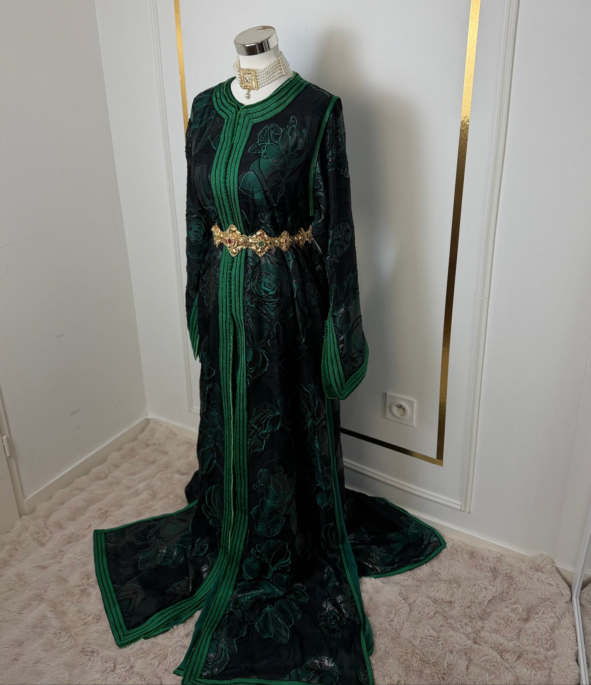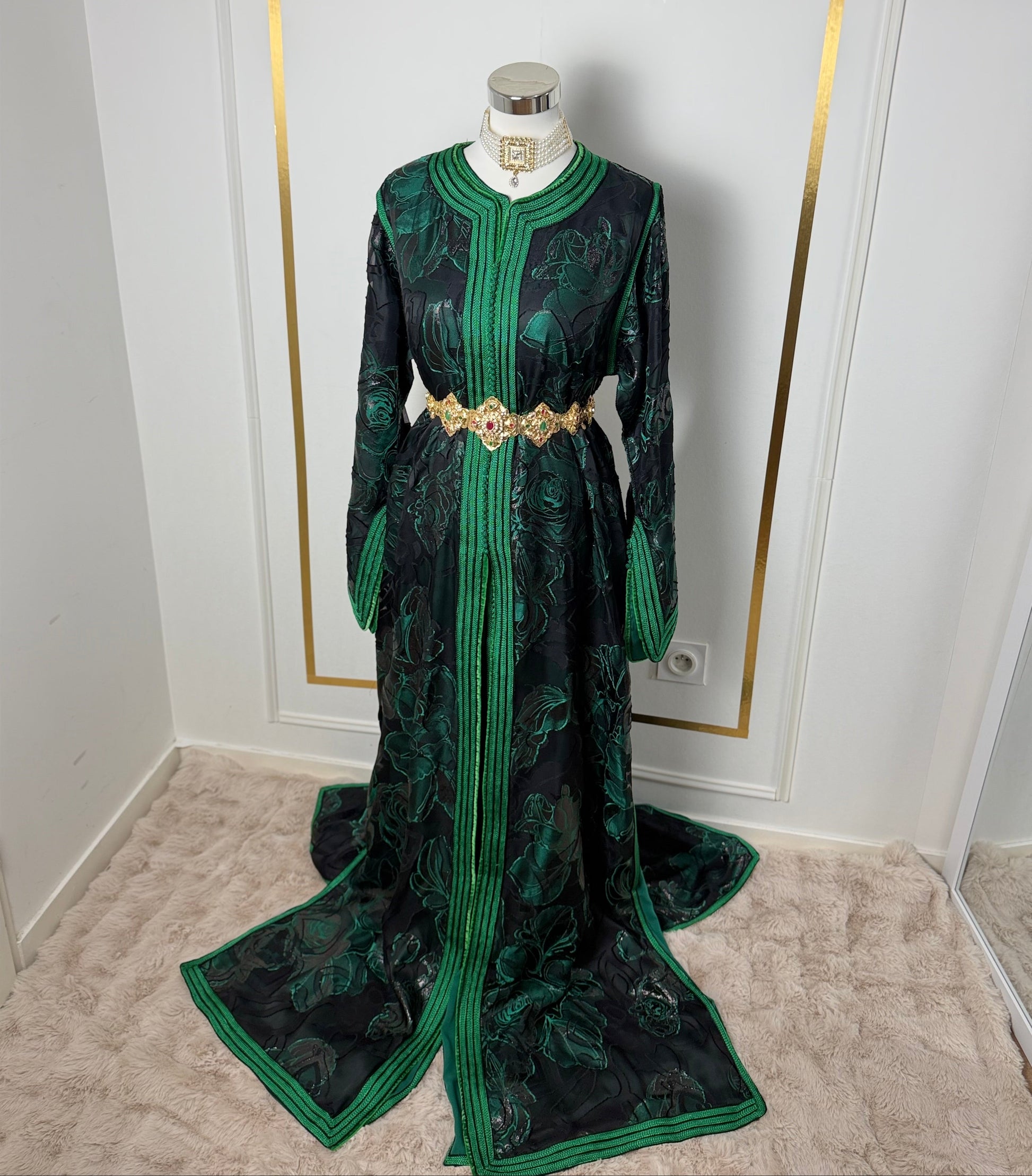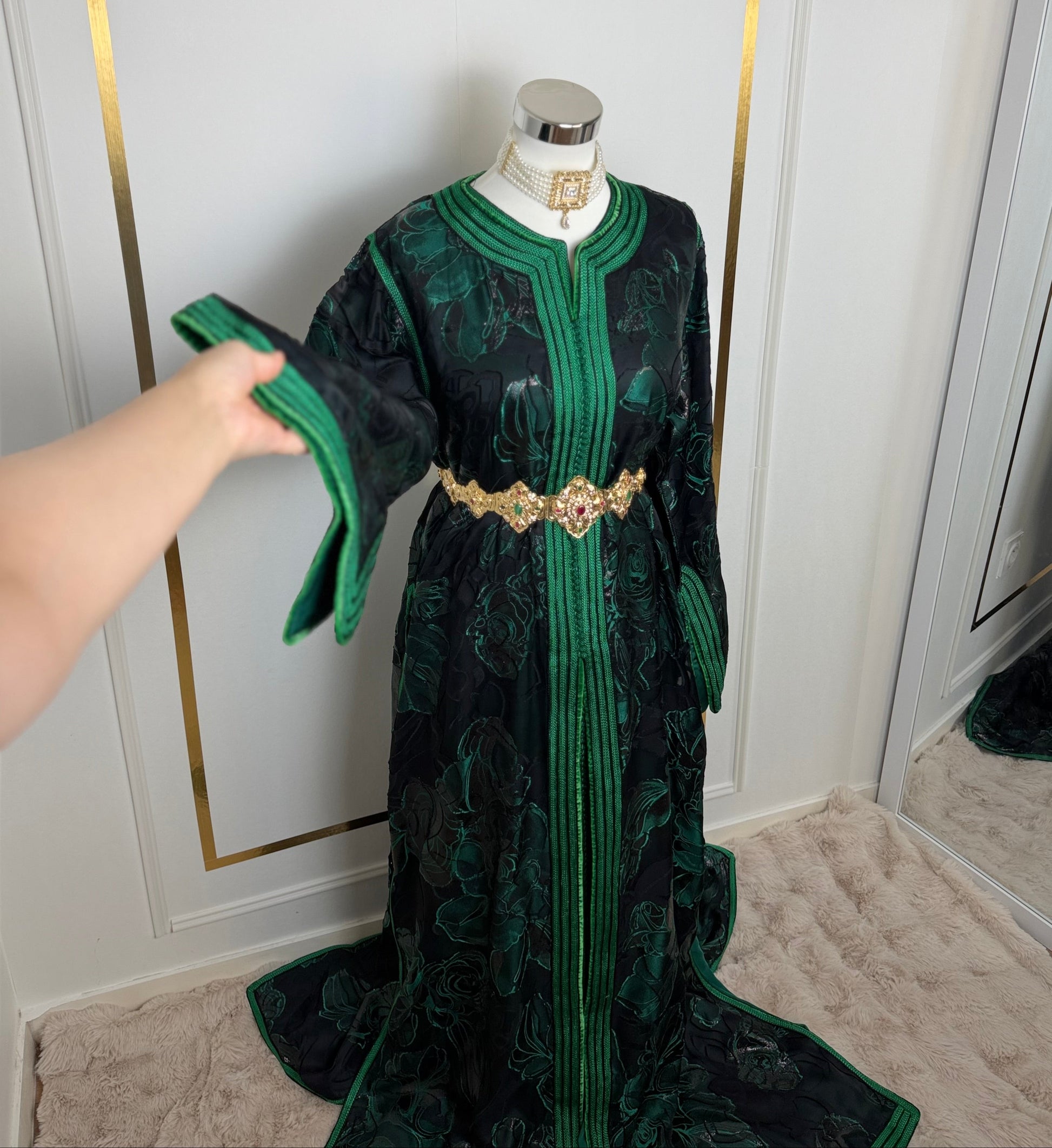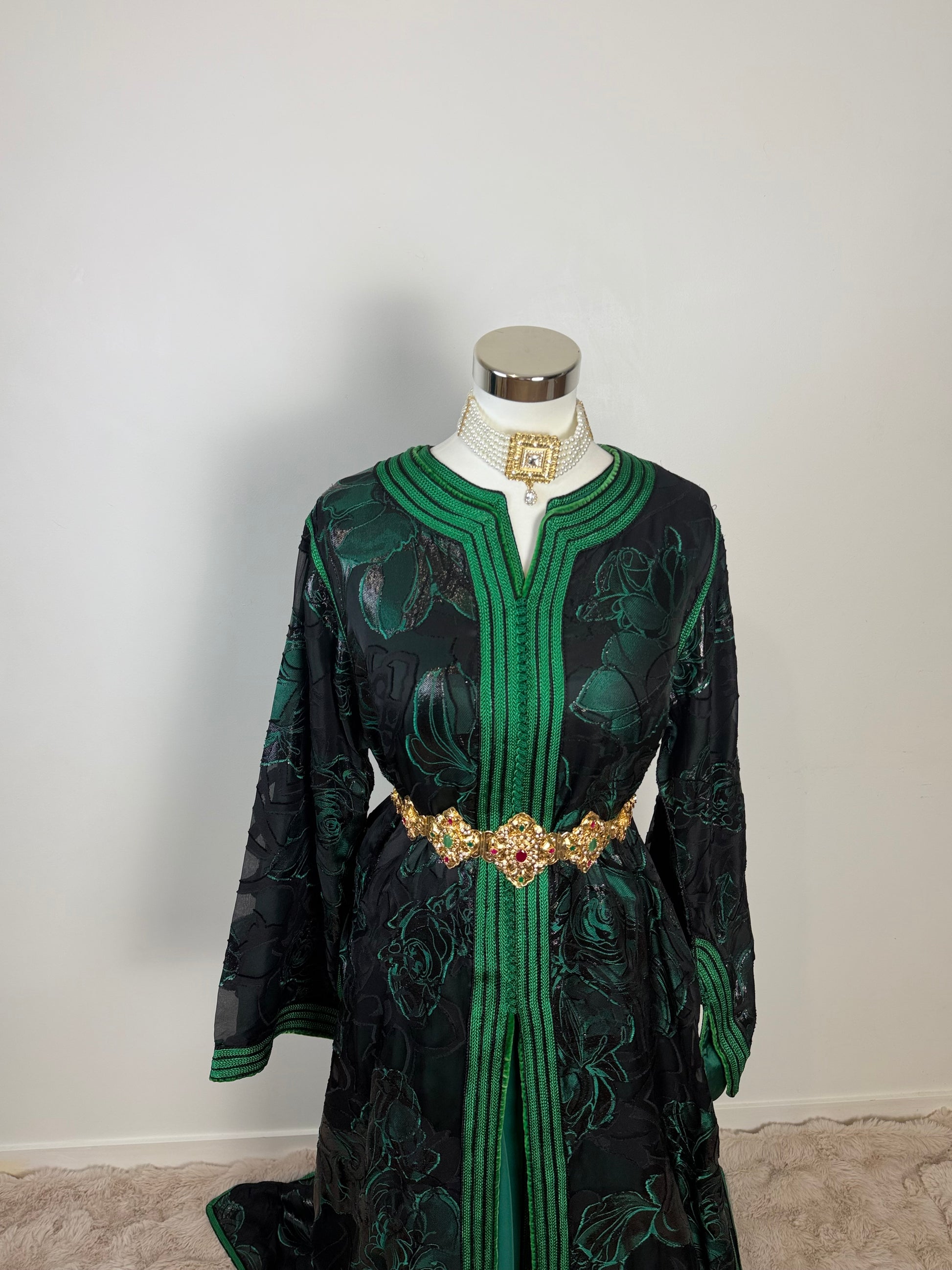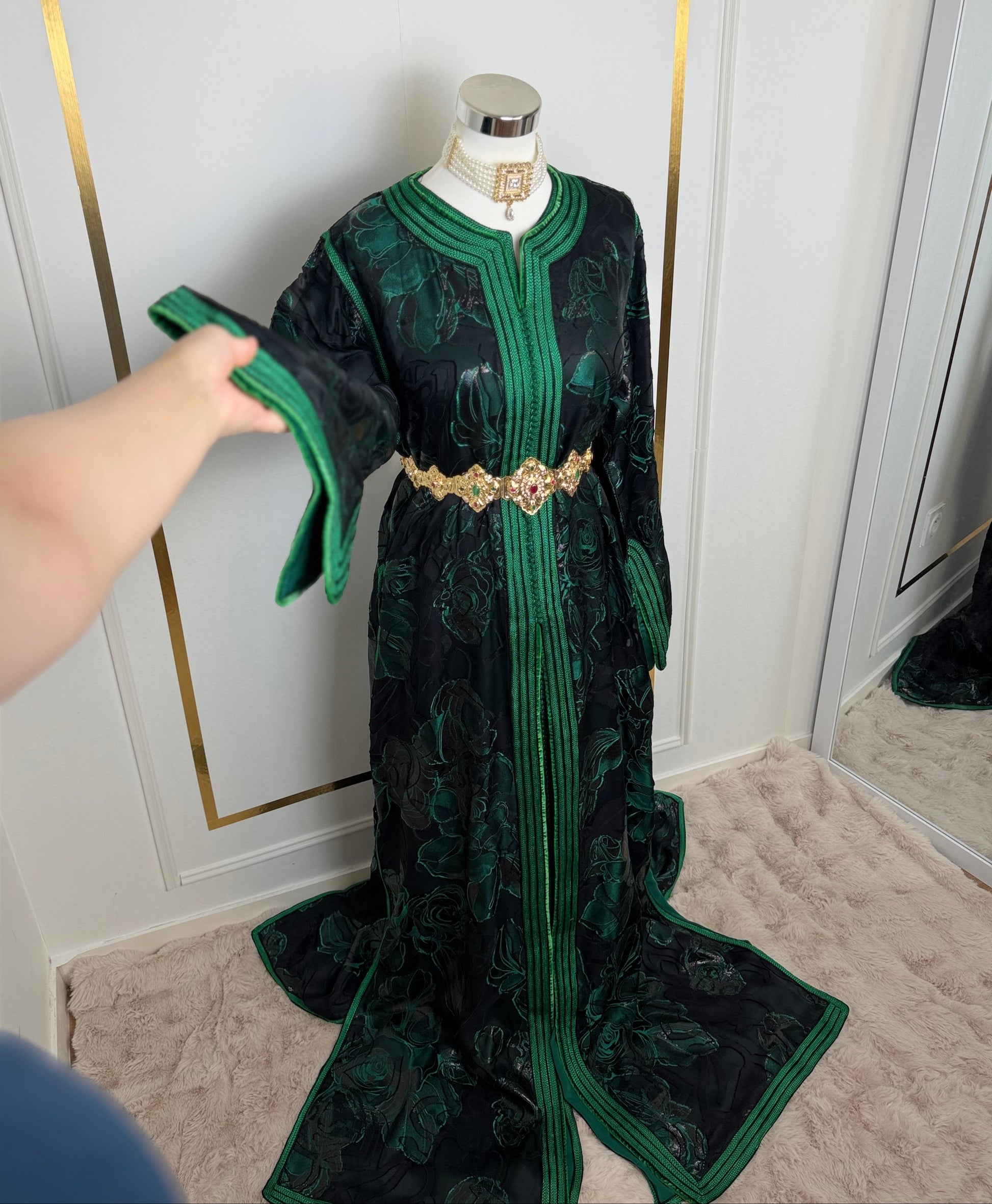 this caftan combines the charm of Moroccan craftsmanship with a contemporary touch,