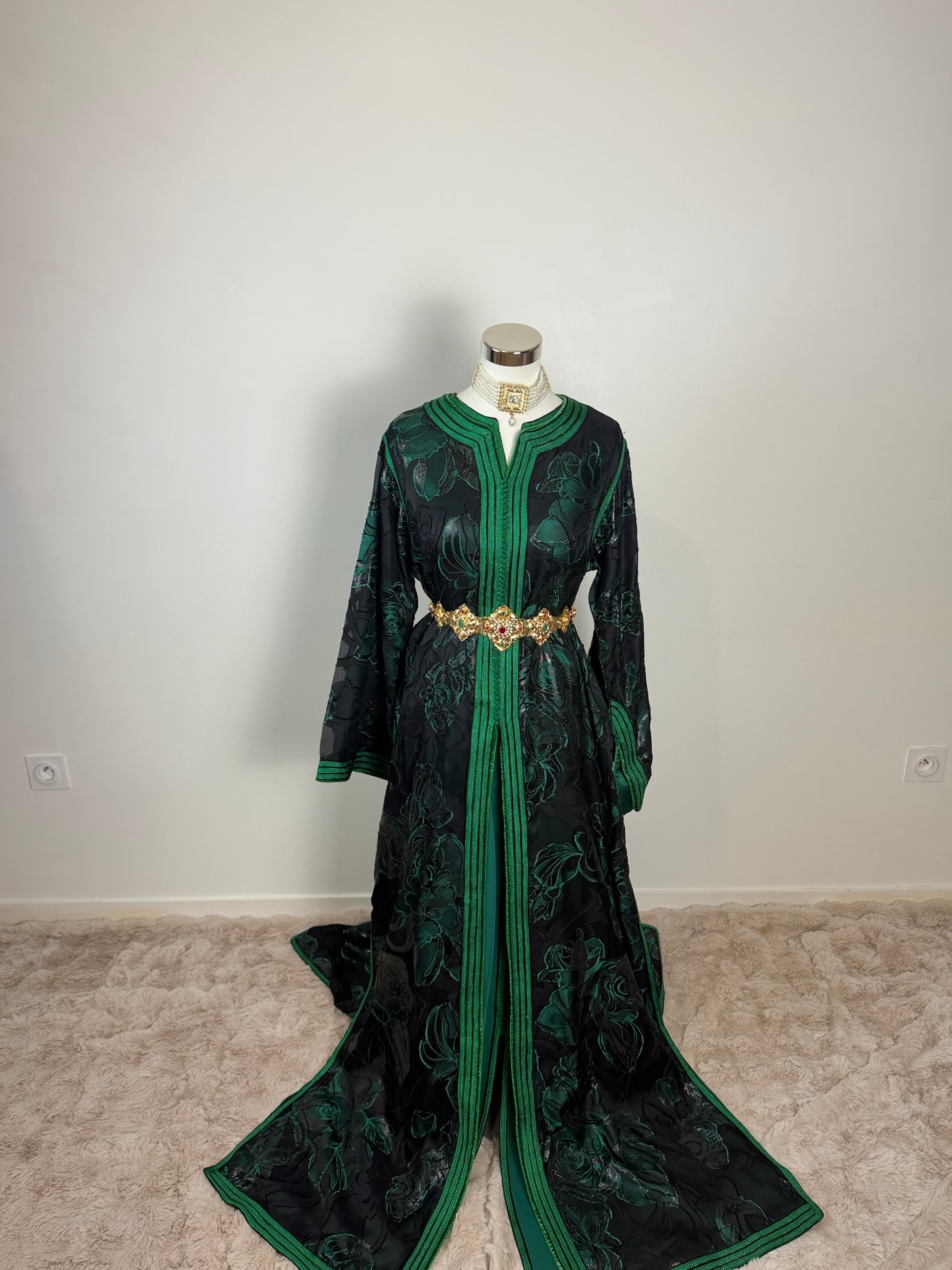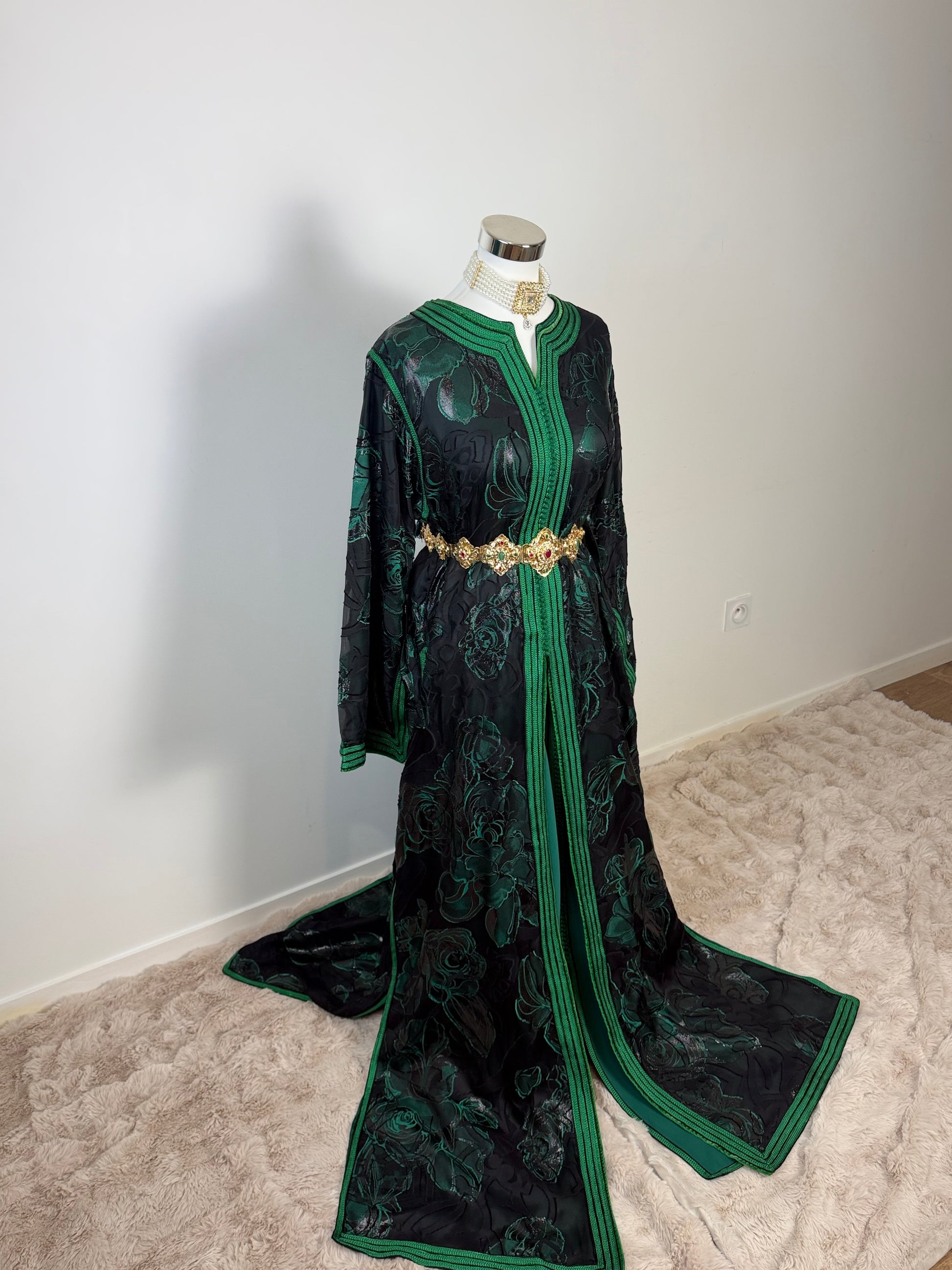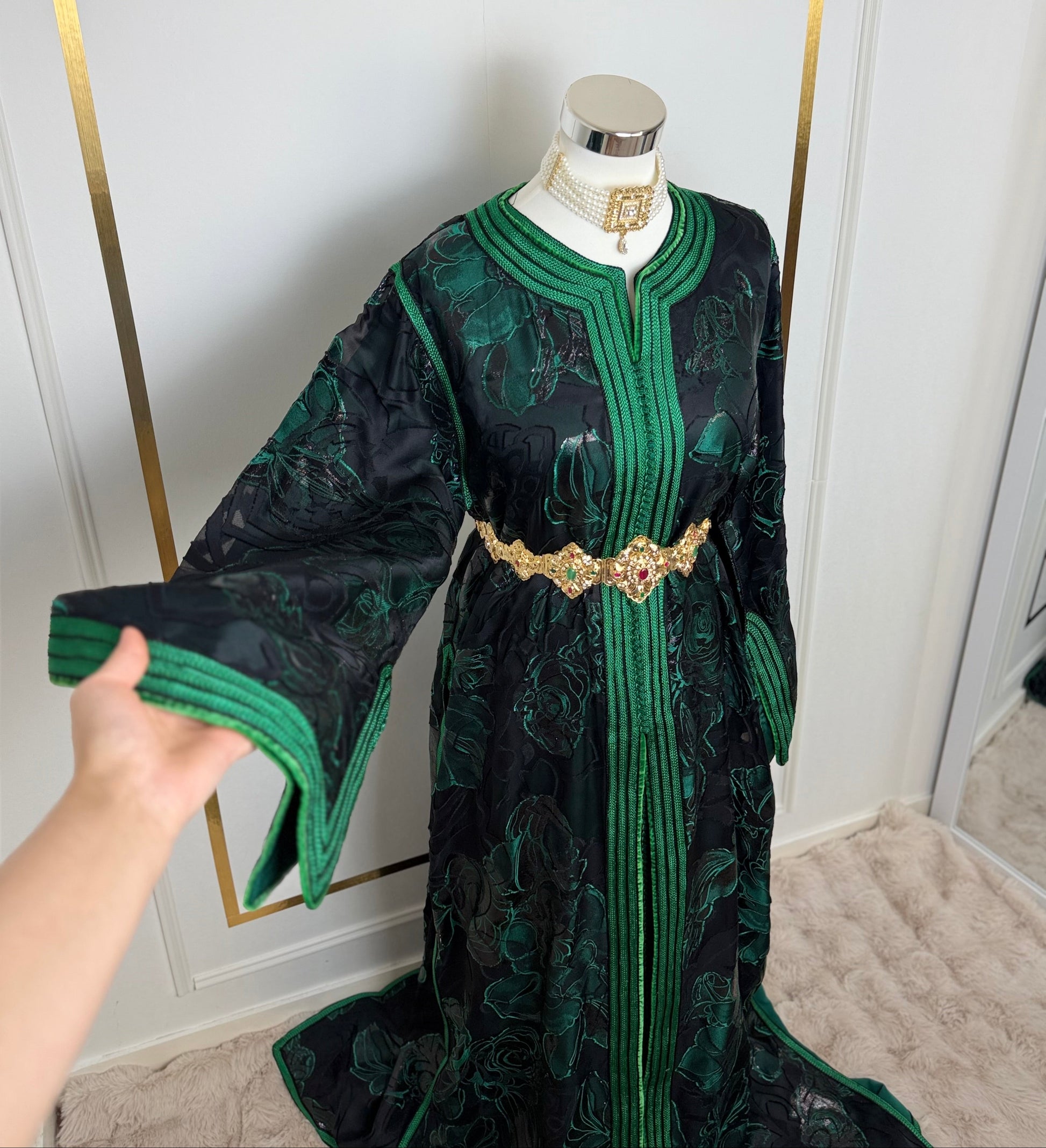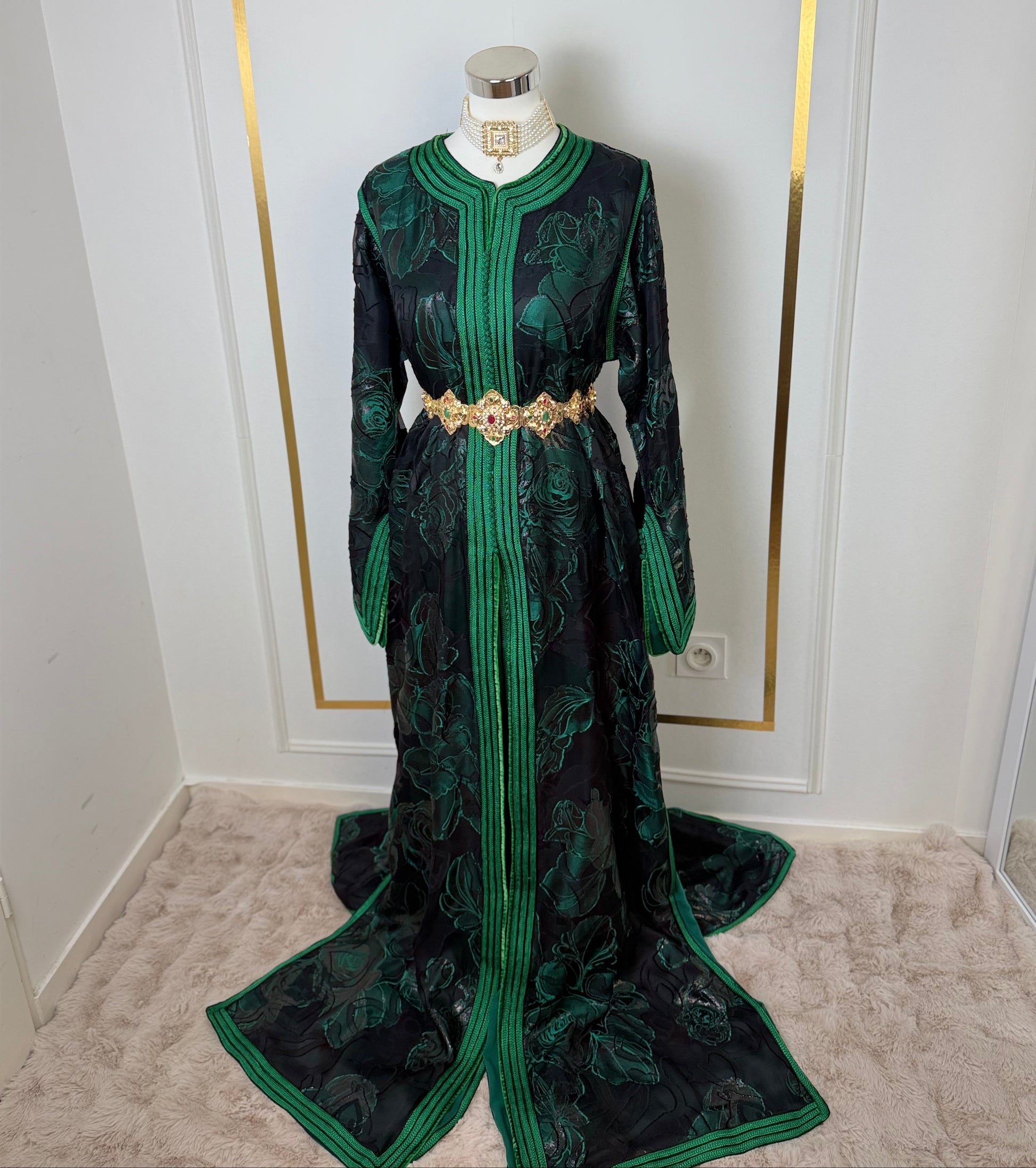 this caftan combines the charm of Moroccan craftsmanship with a contemporary touch,