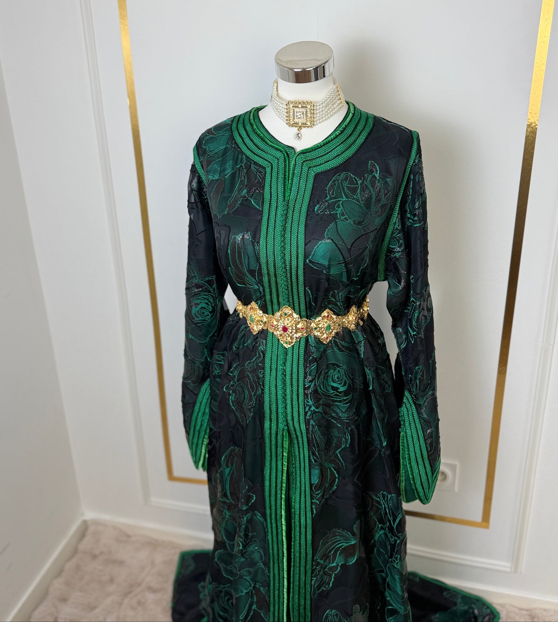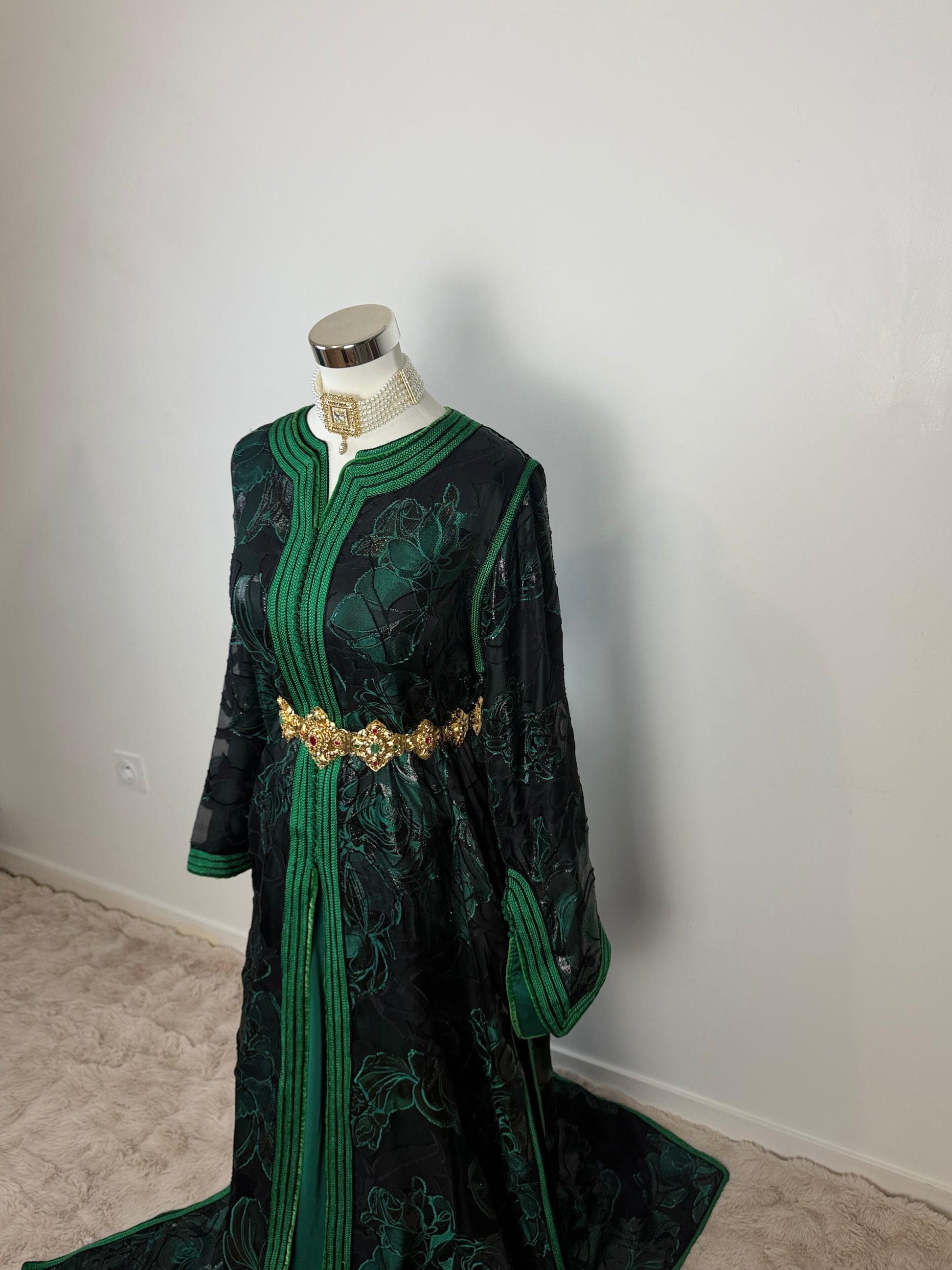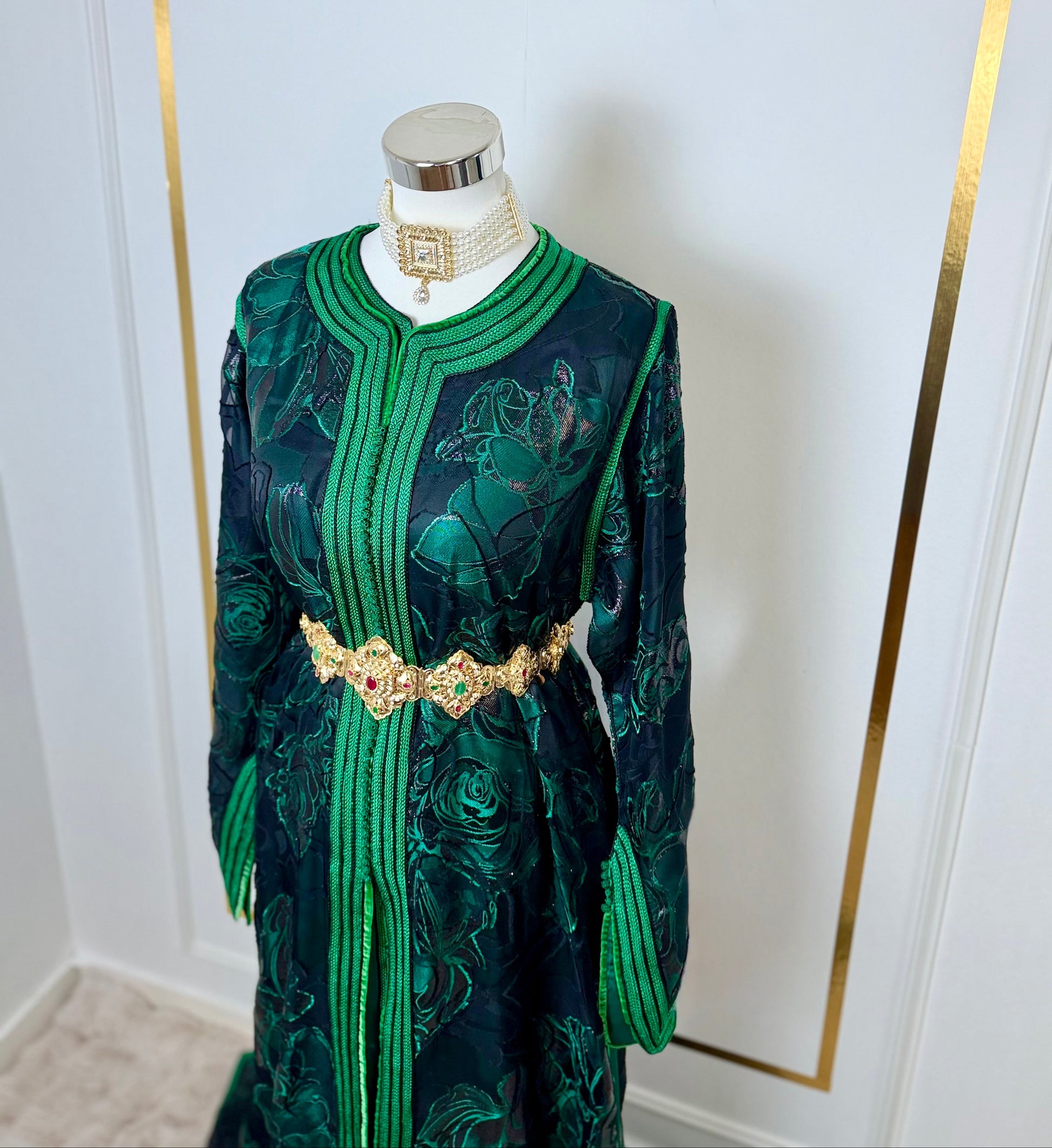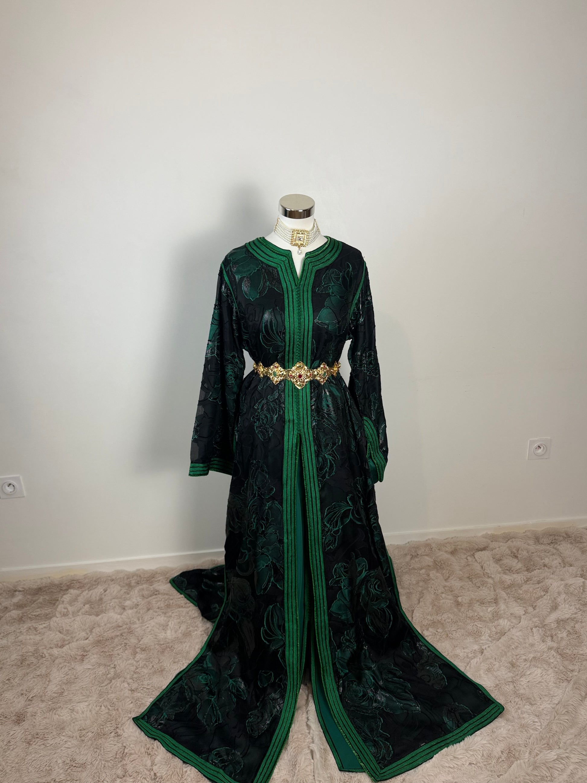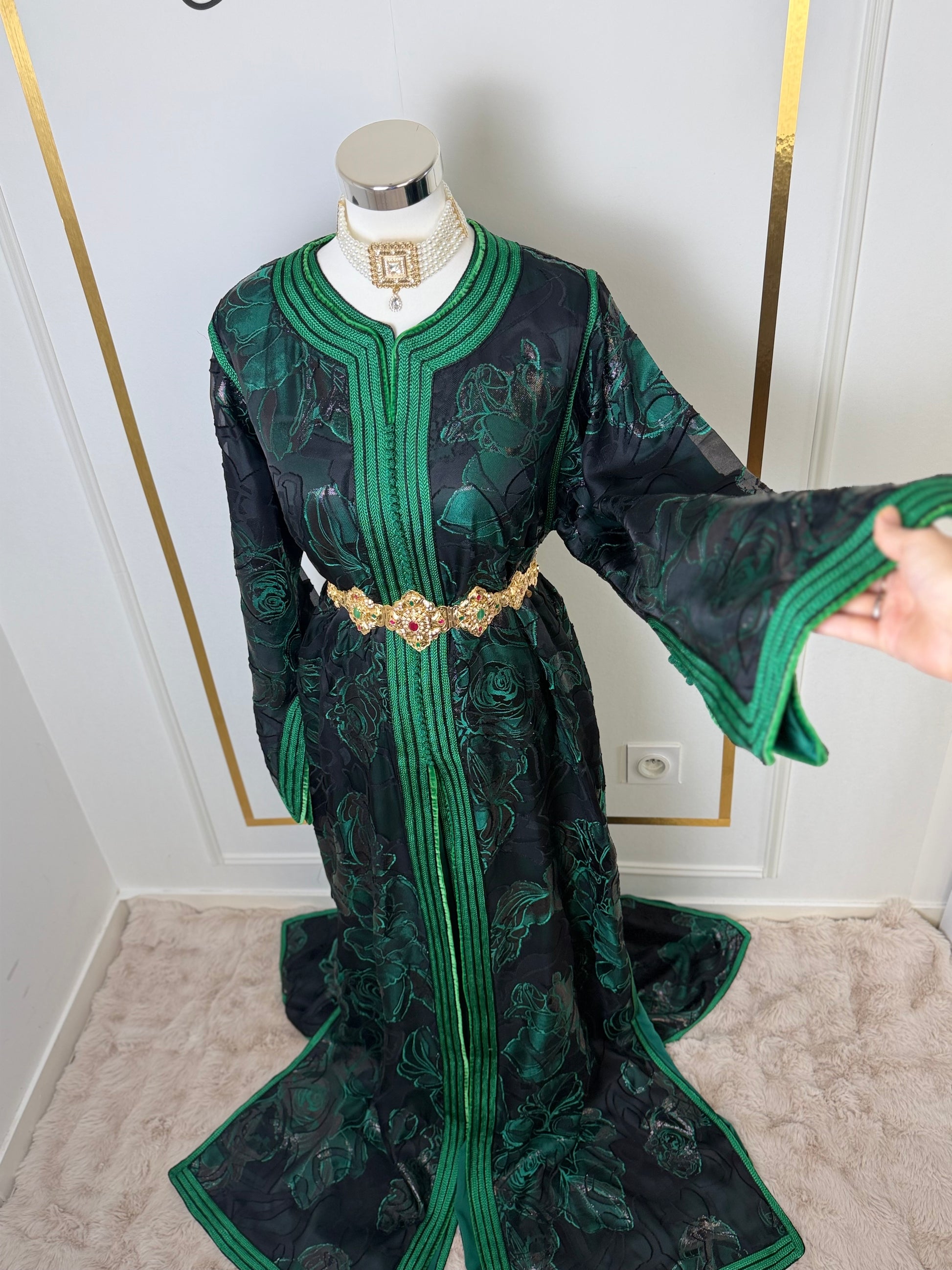this caftan combines the charm of Moroccan craftsmanship with a contemporary touch,