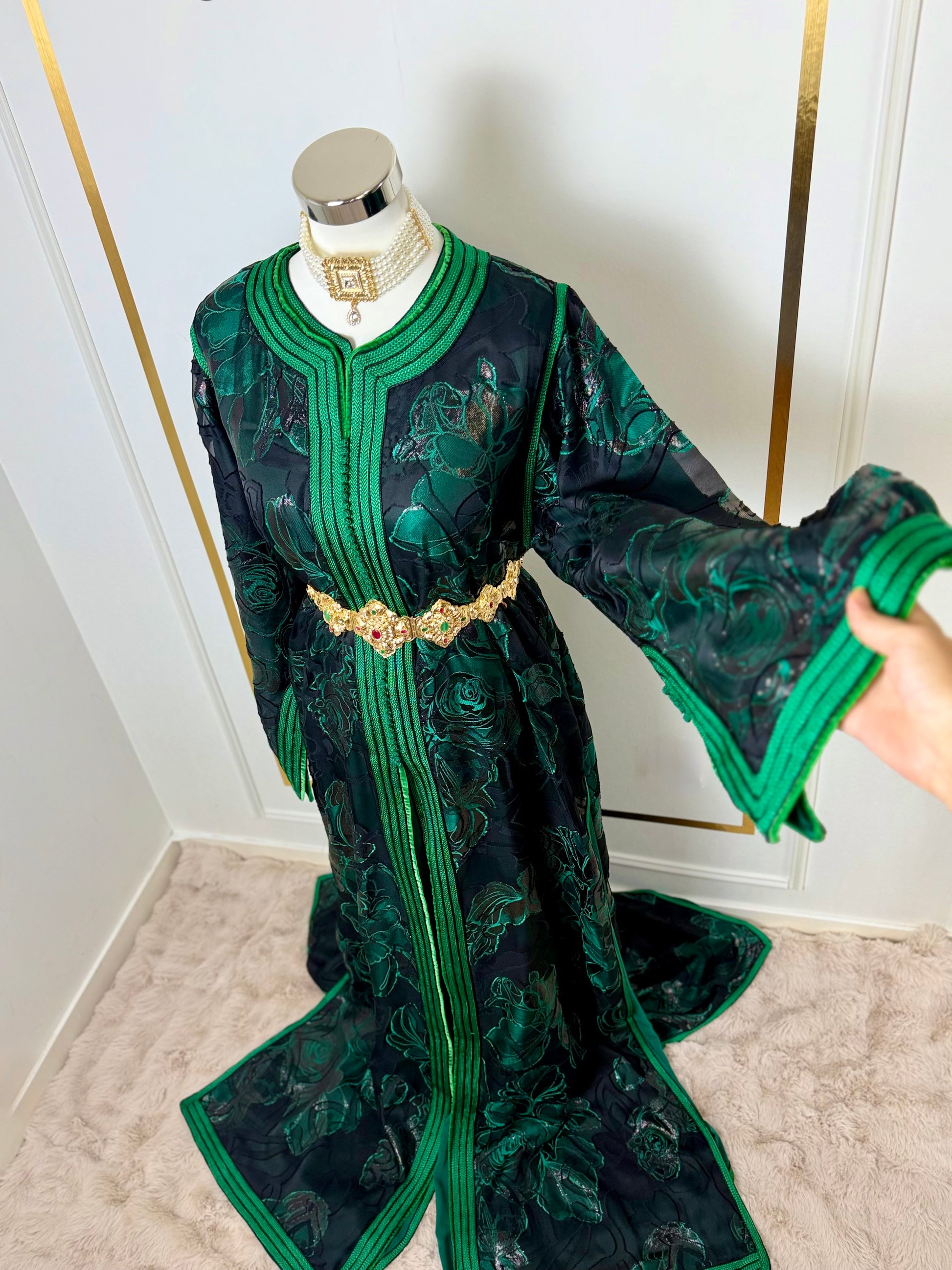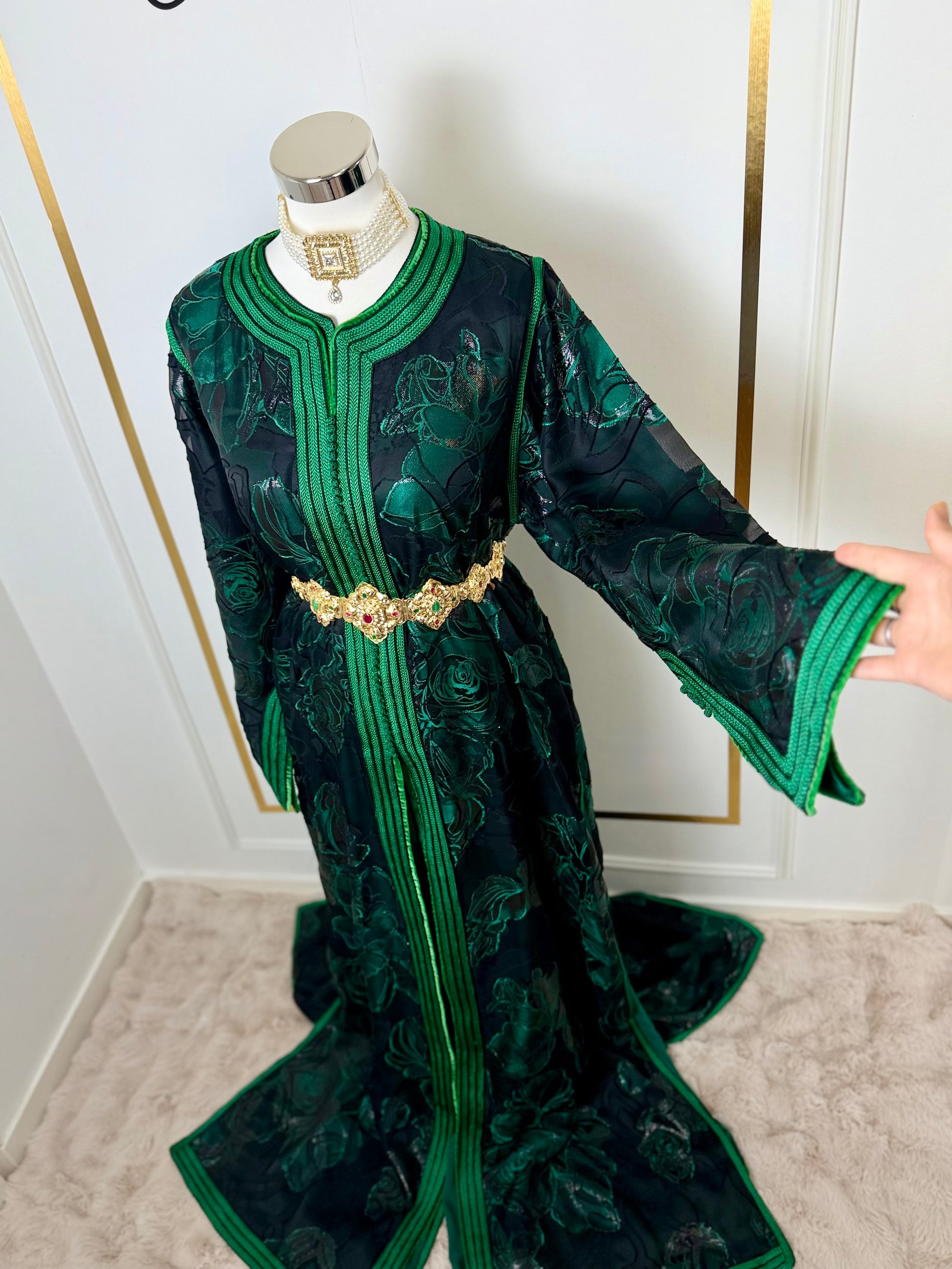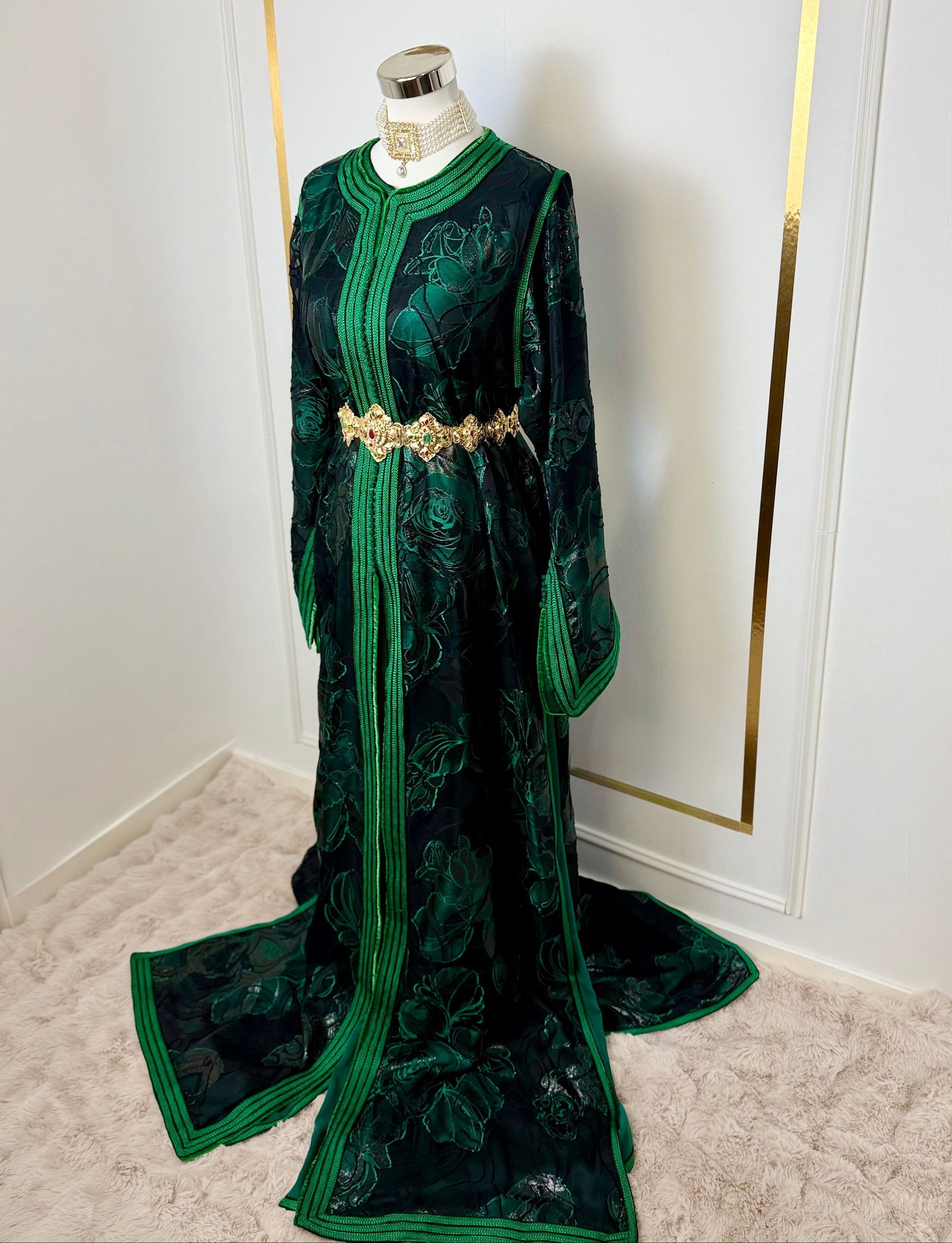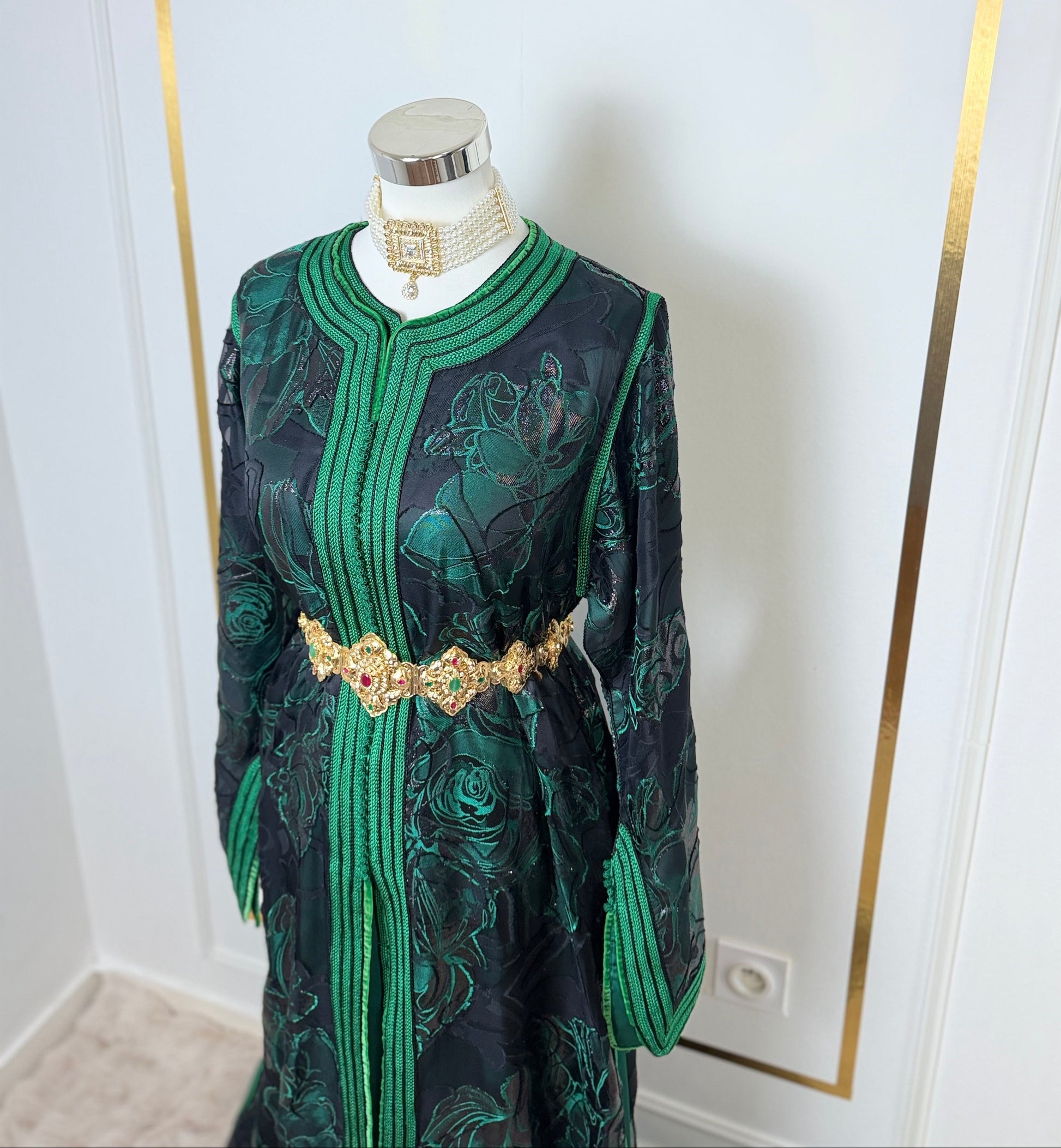 this caftan combines the charm of Moroccan craftsmanship with a contemporary touch,