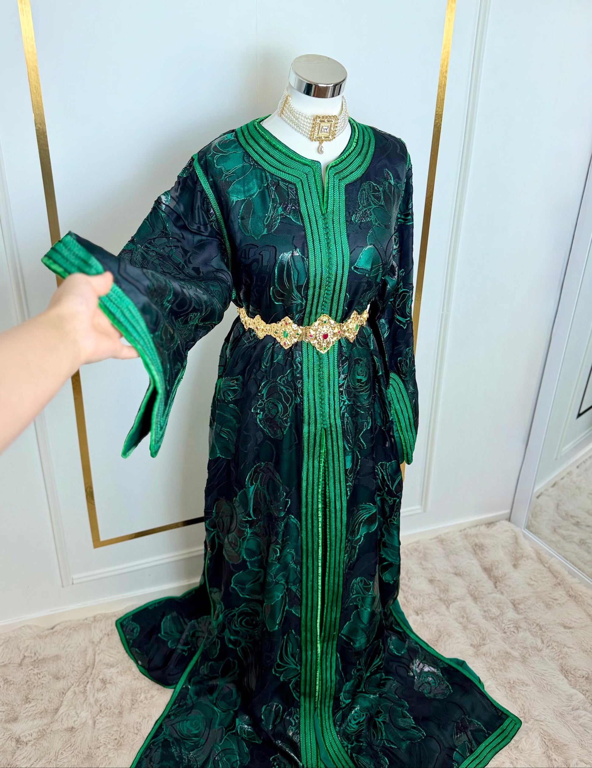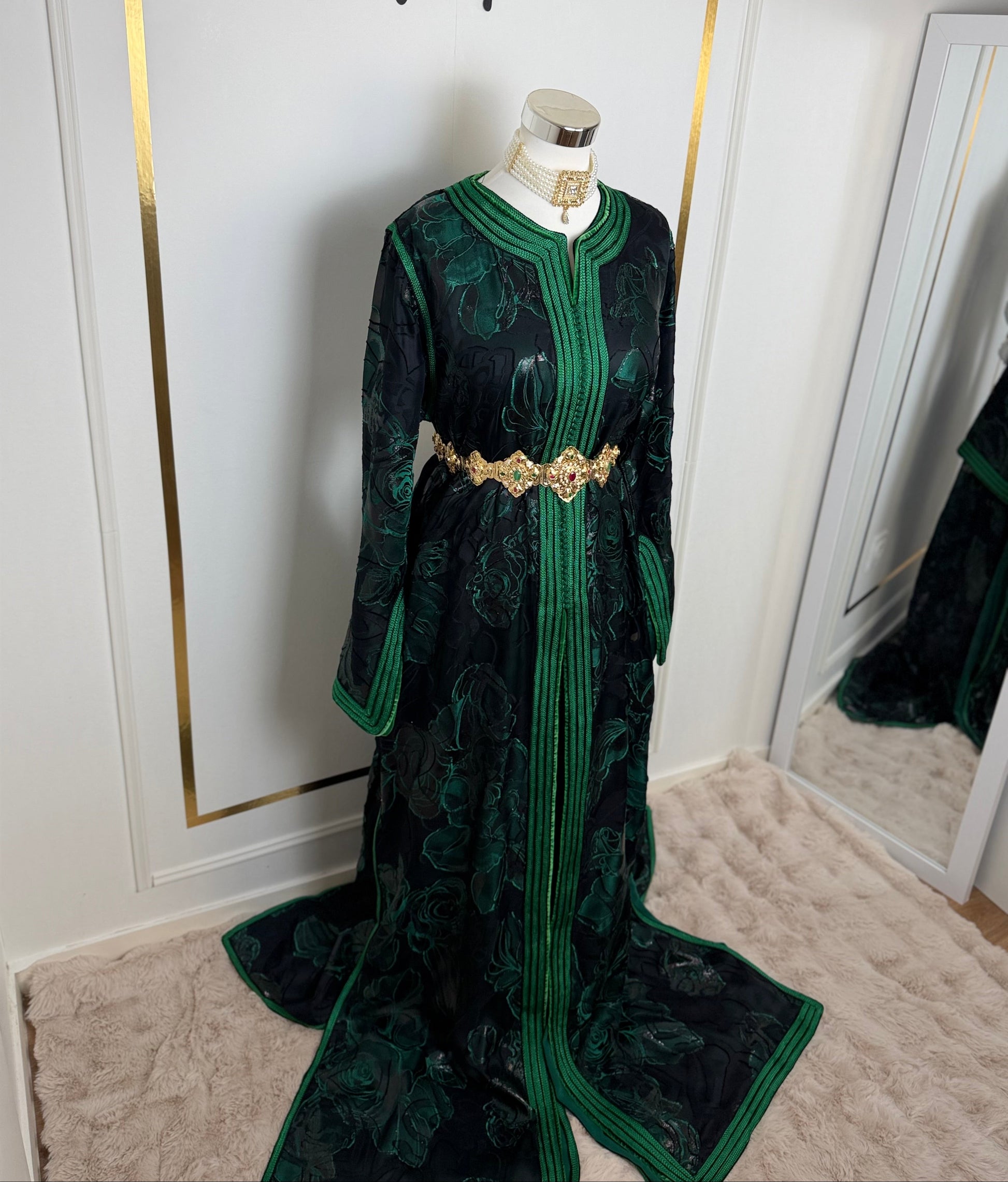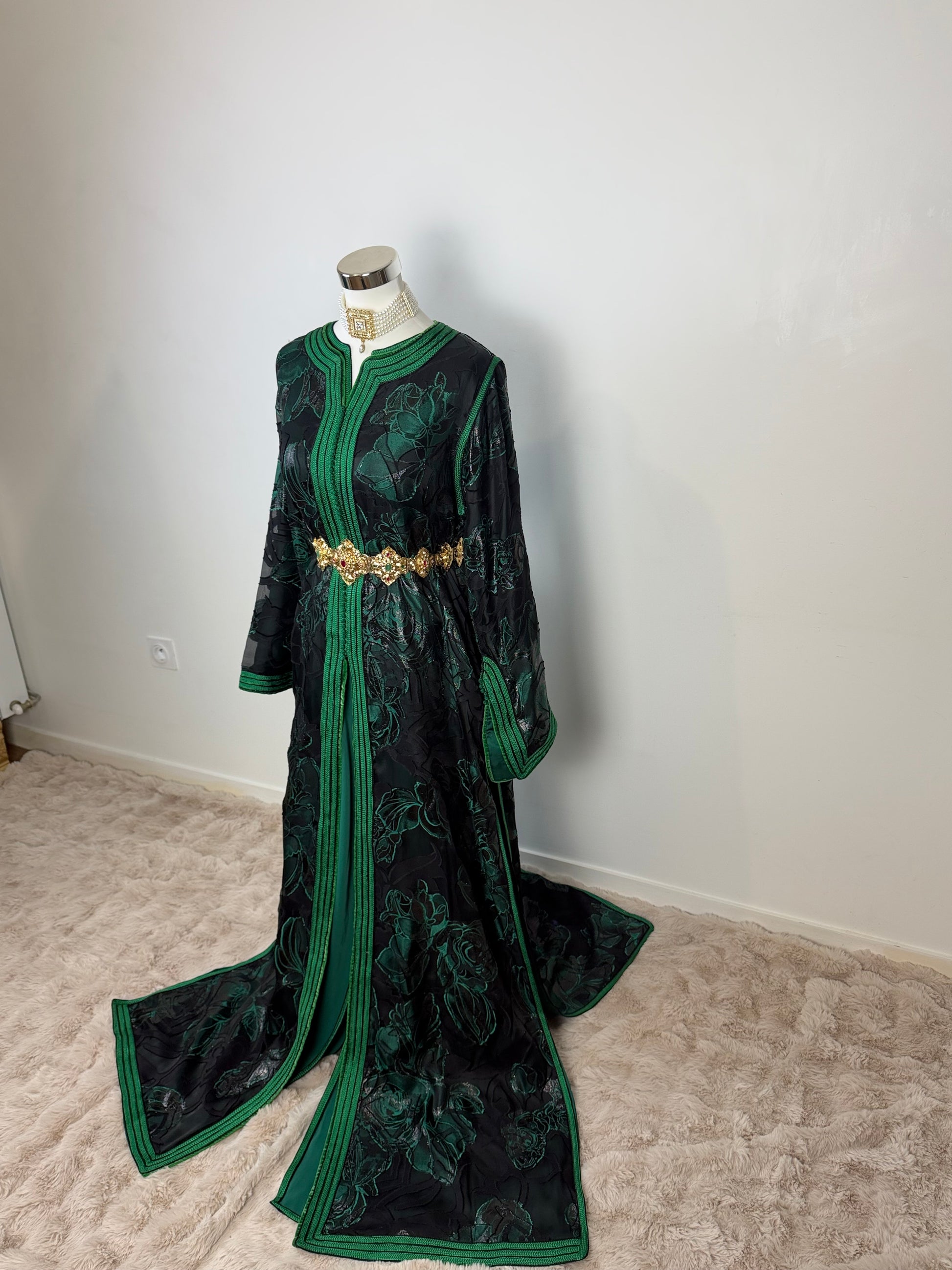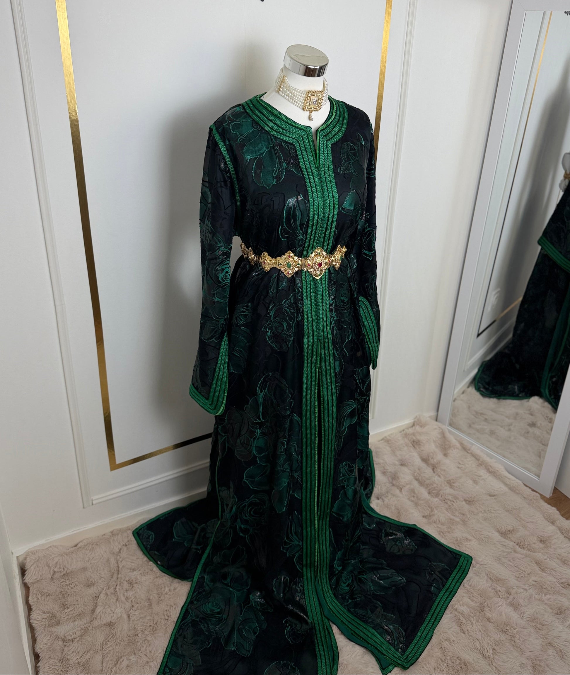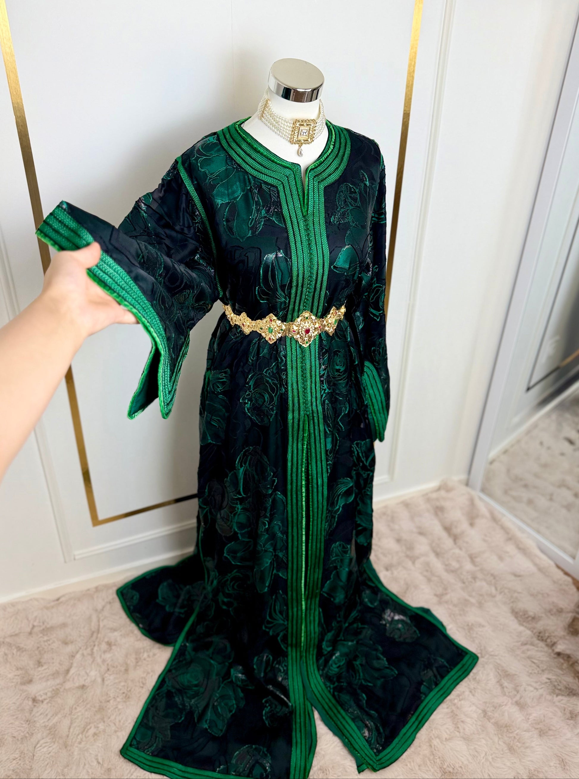 this caftan combines the charm of Moroccan craftsmanship with a contemporary touch,