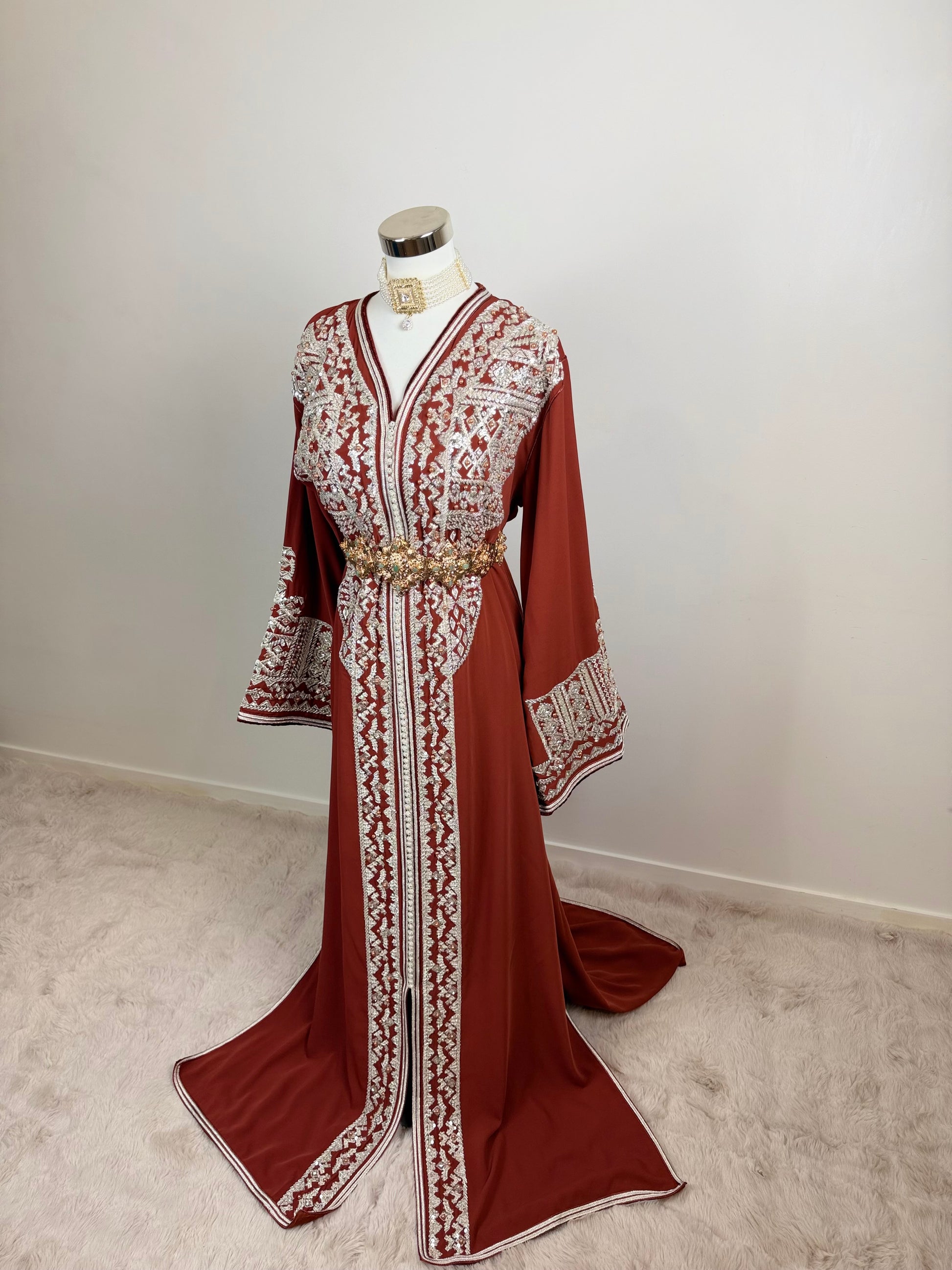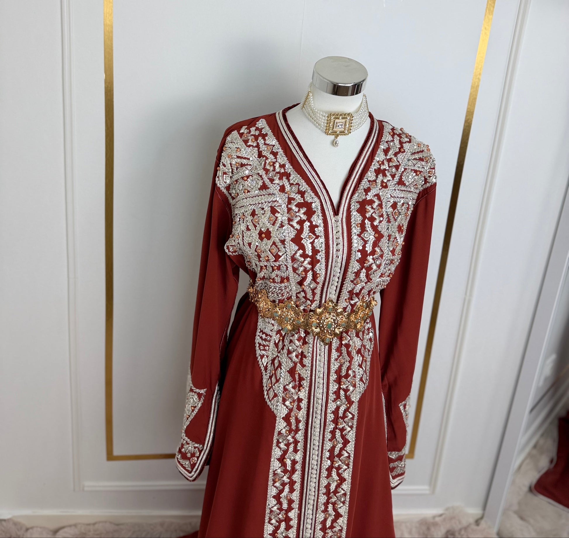 this caftan combines the charm of Moroccan craftsmanship with a contemporary touch,