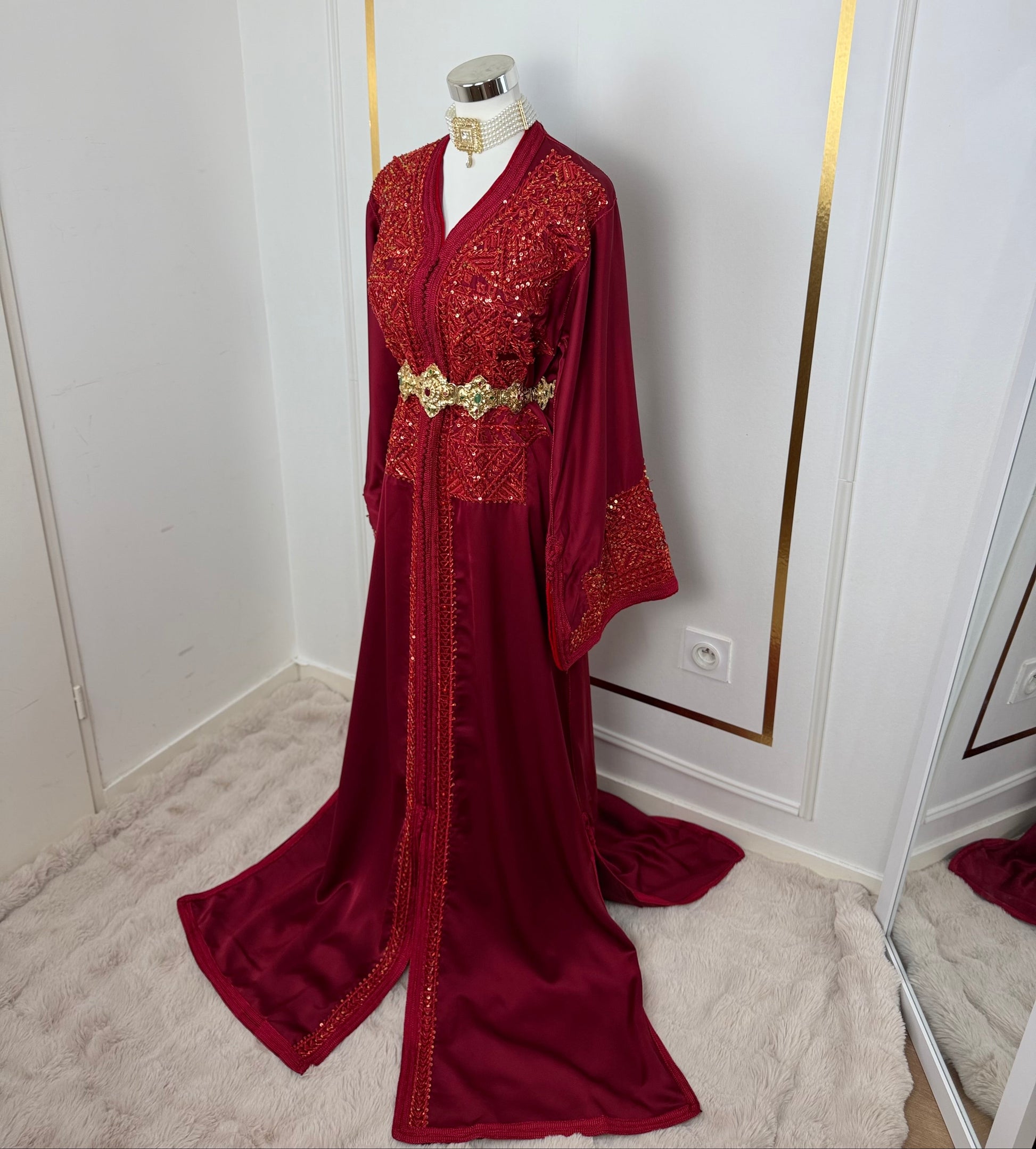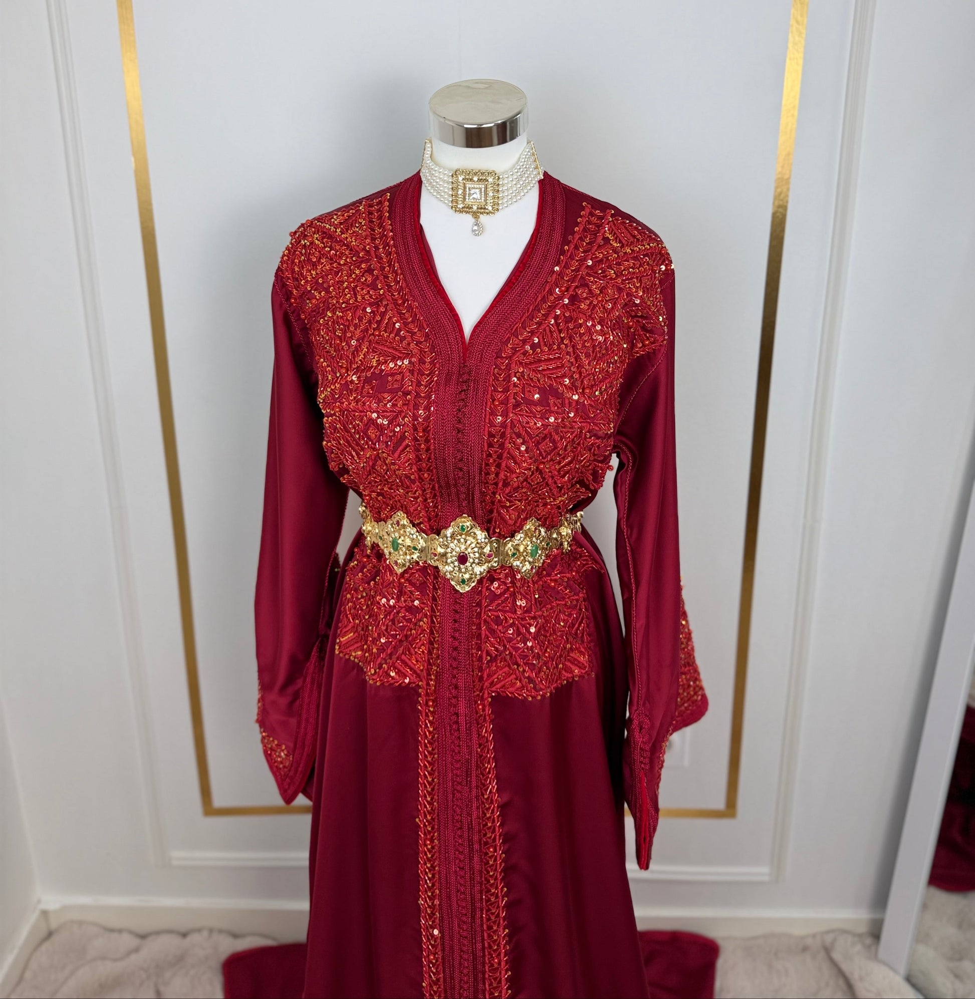 this caftan combines the charm of Moroccan craftsmanship with a contemporary touch,