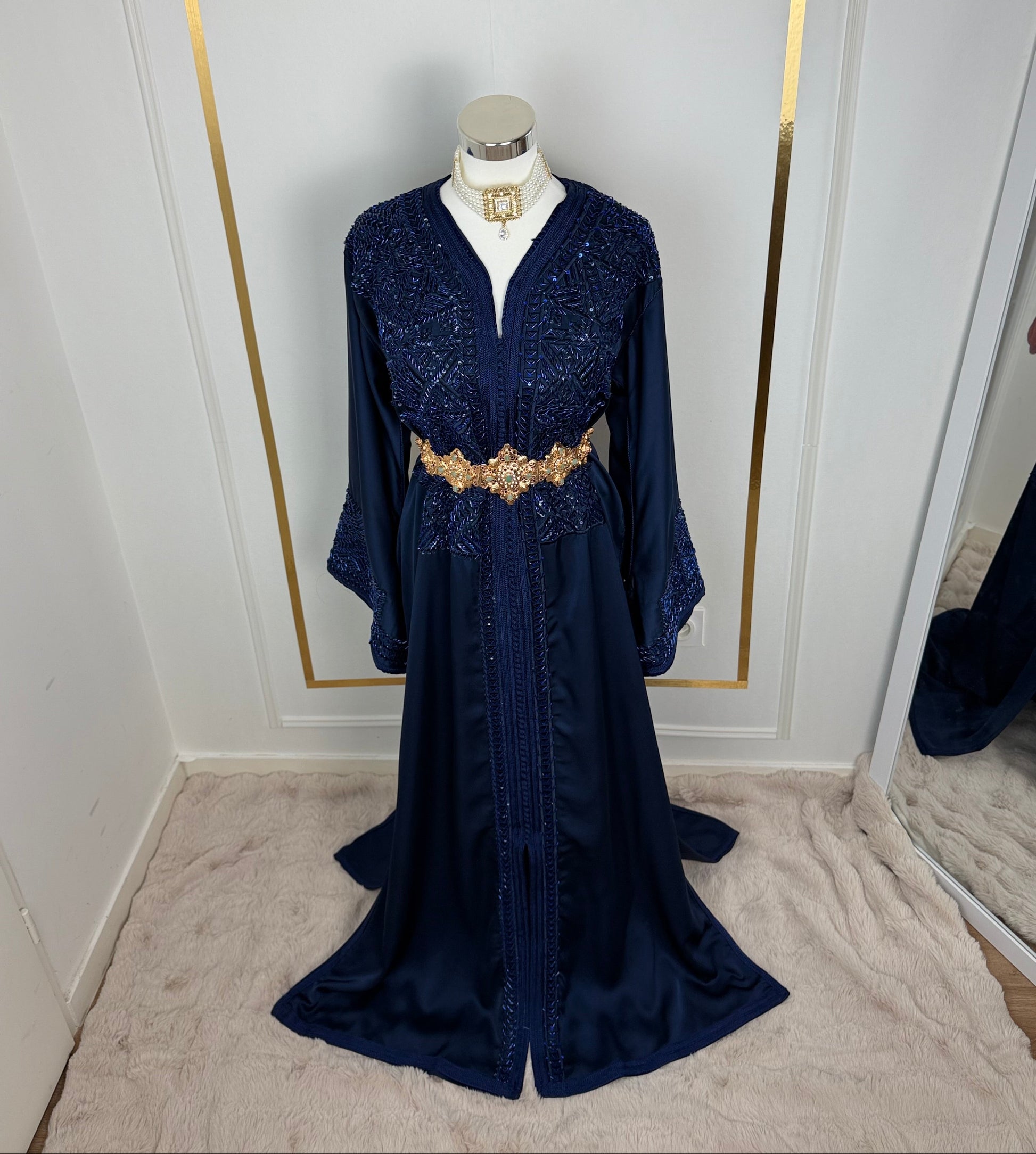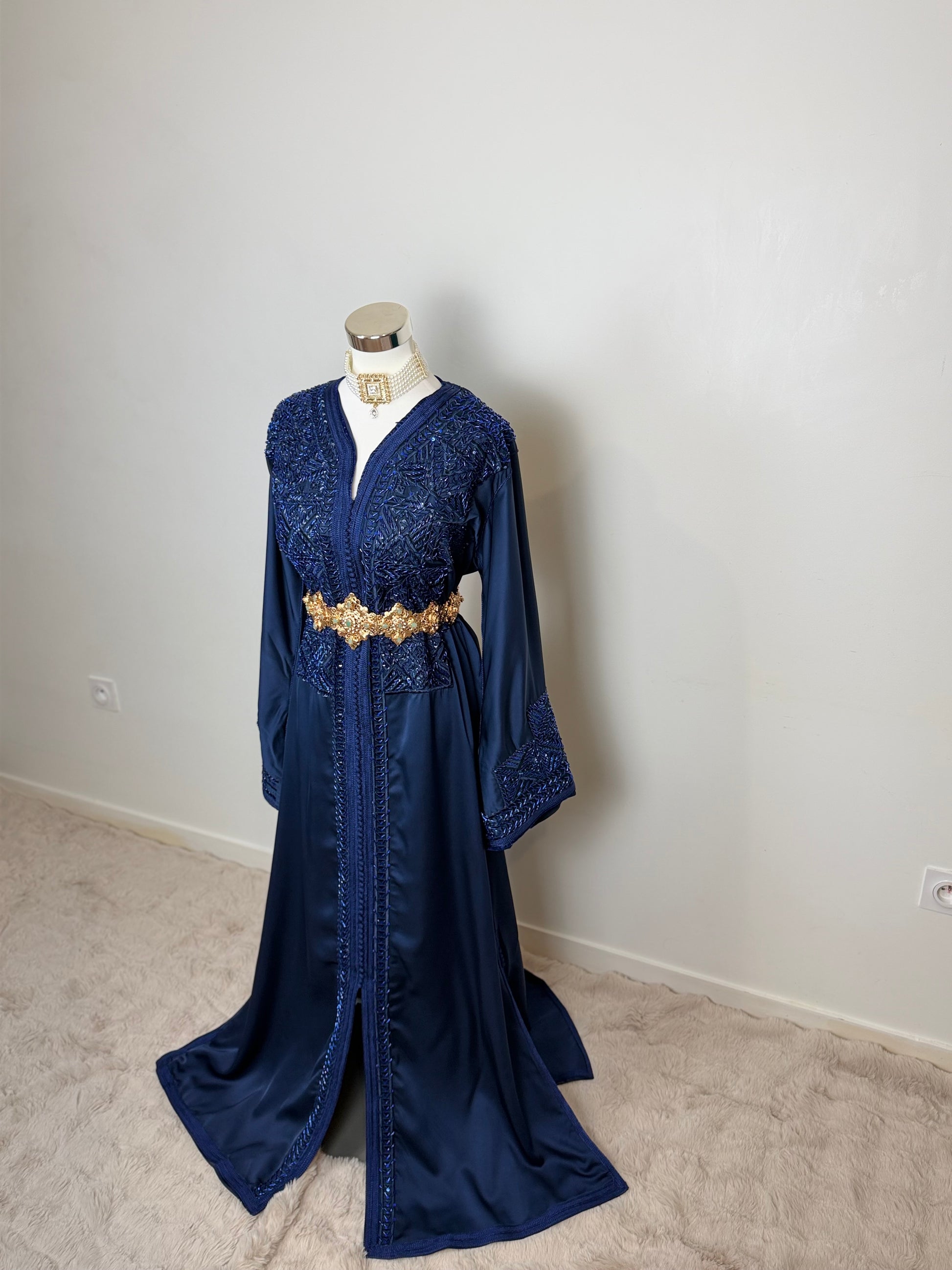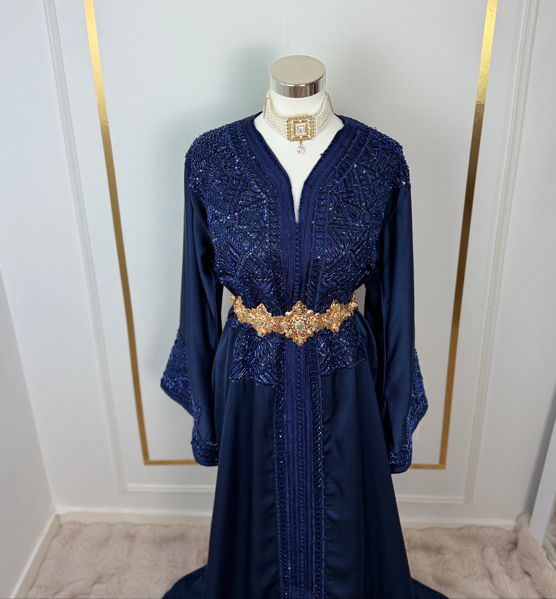 this caftan combines the charm of Moroccan craftsmanship with a contemporary touch,