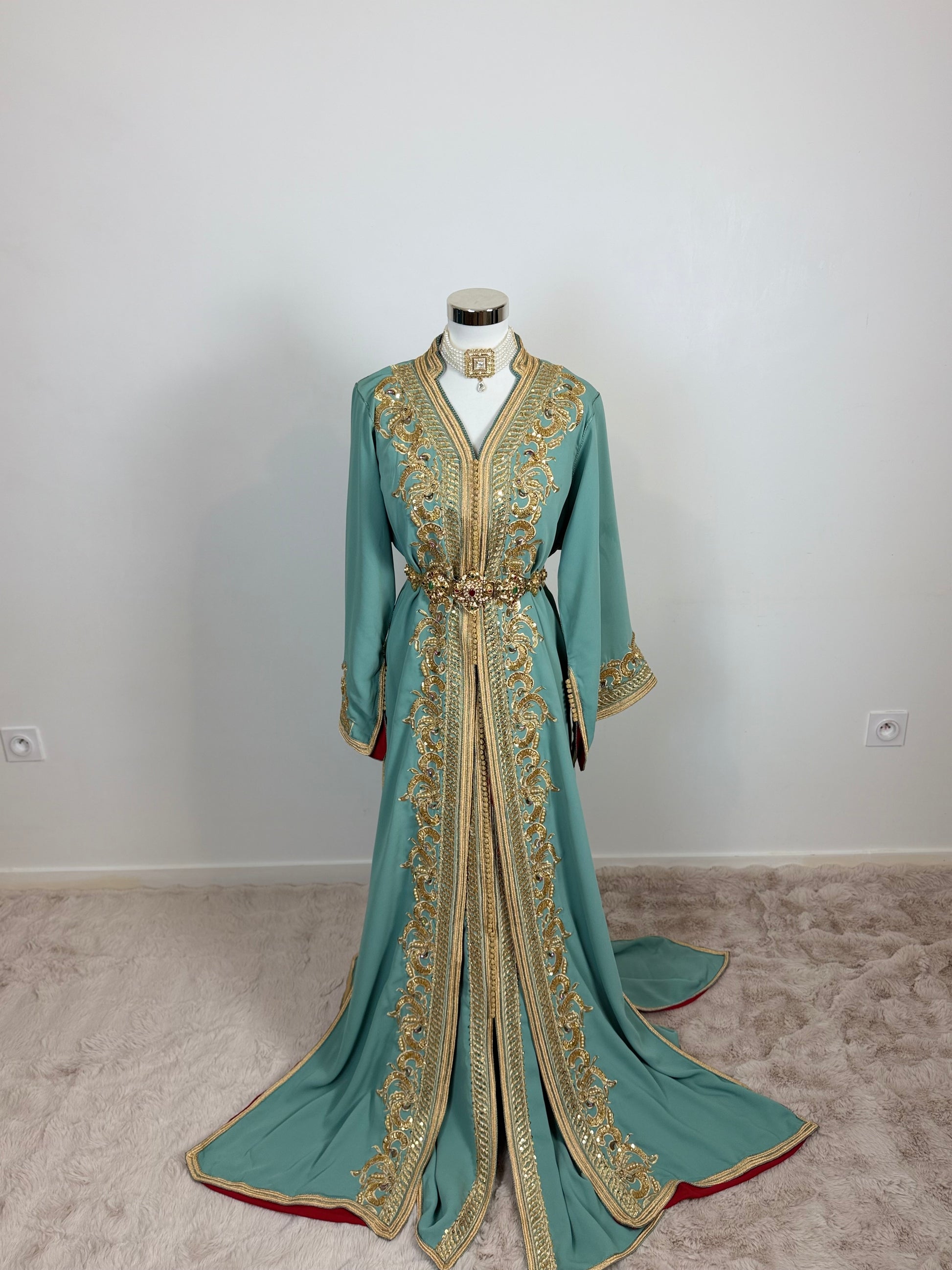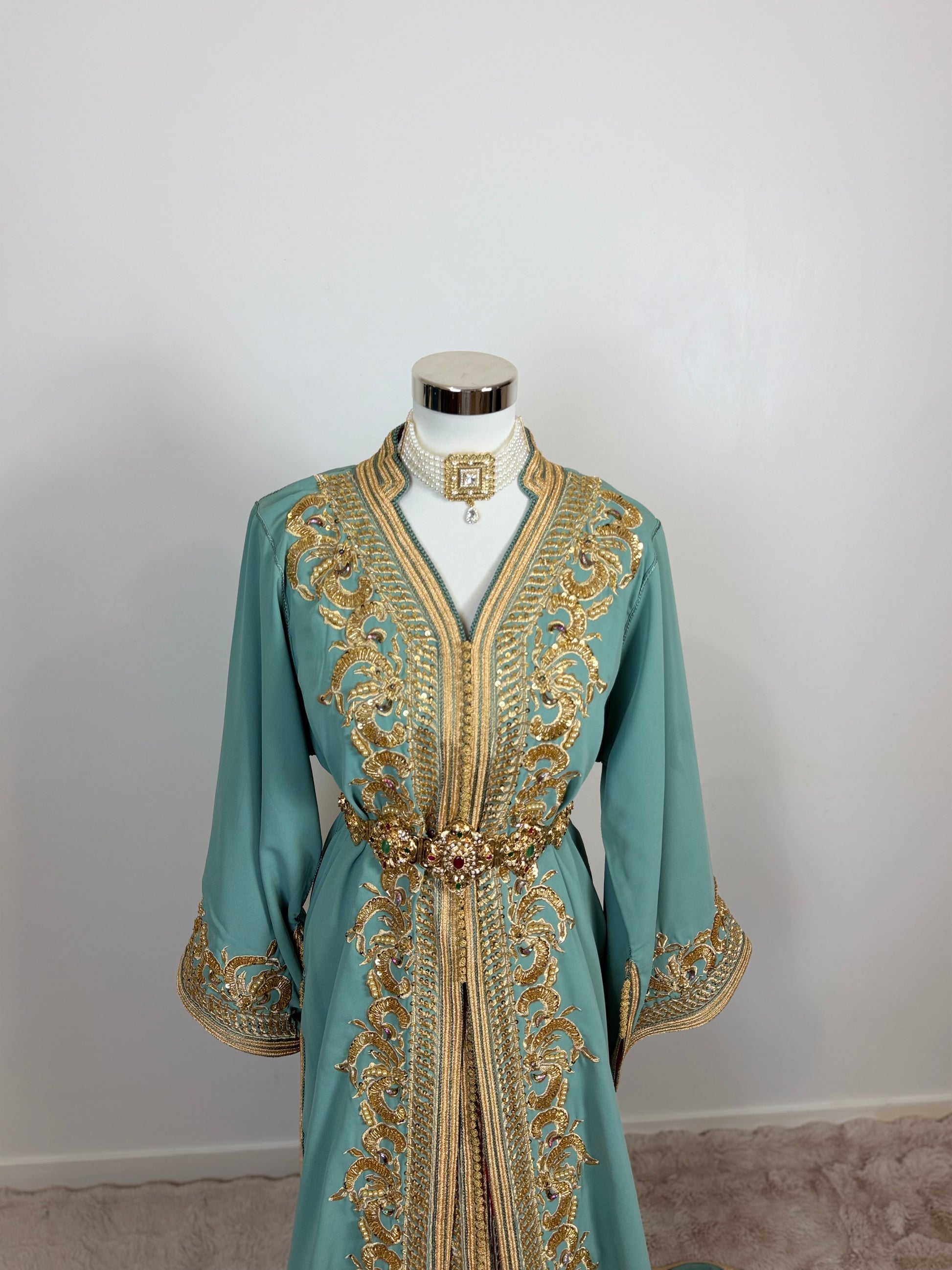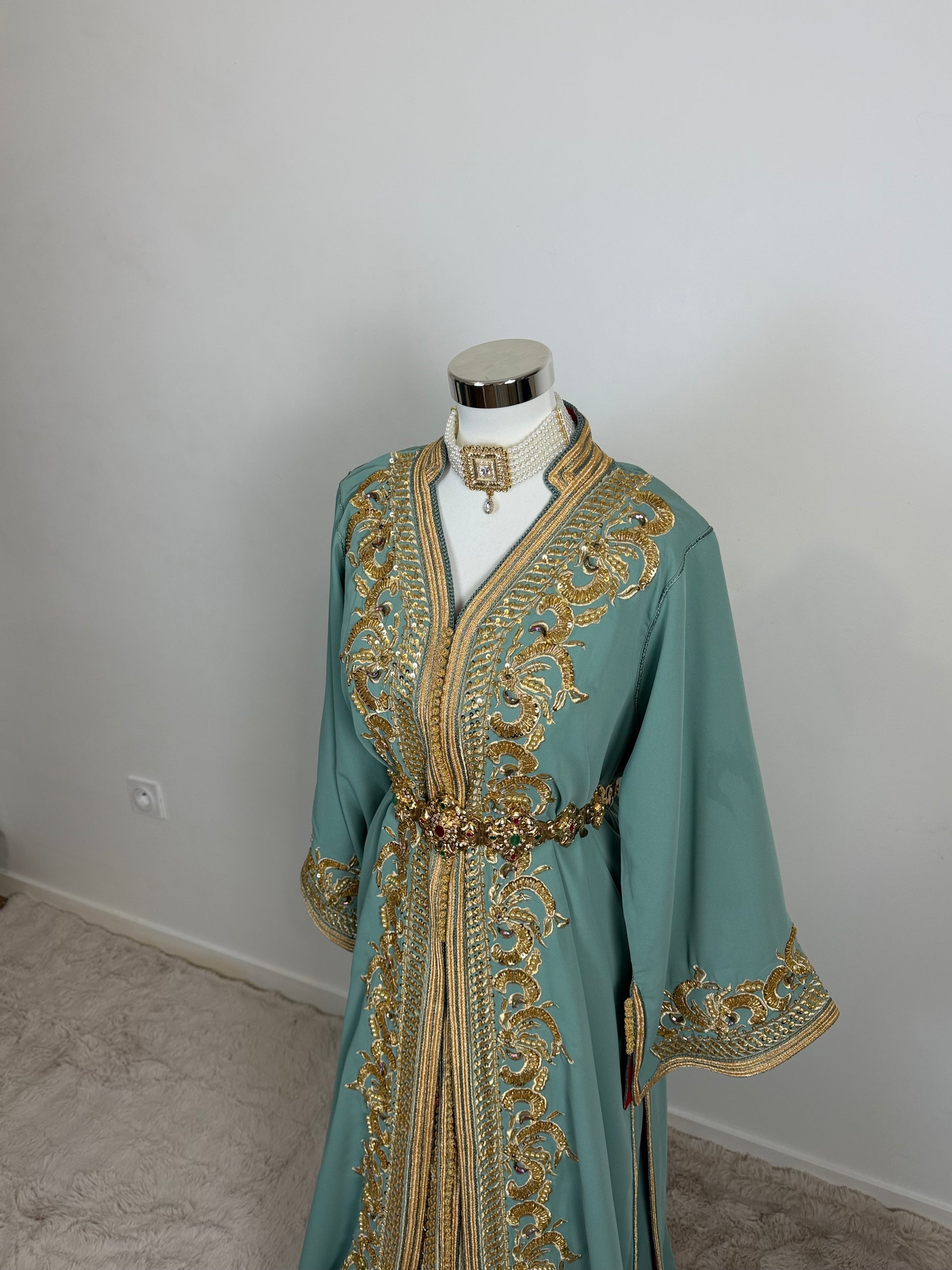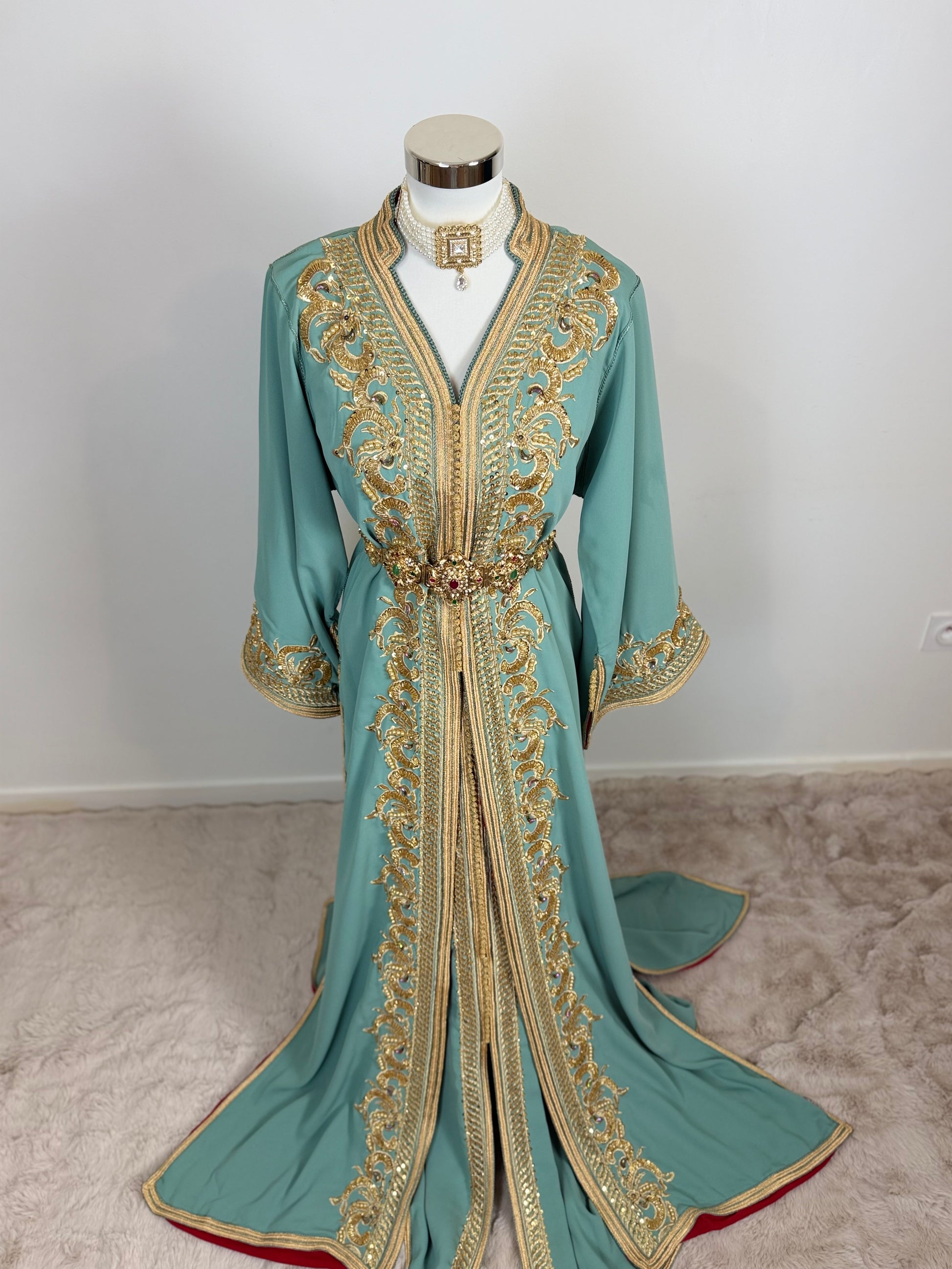 this caftan combines the charm of Moroccan craftsmanship with a contemporary touch,
