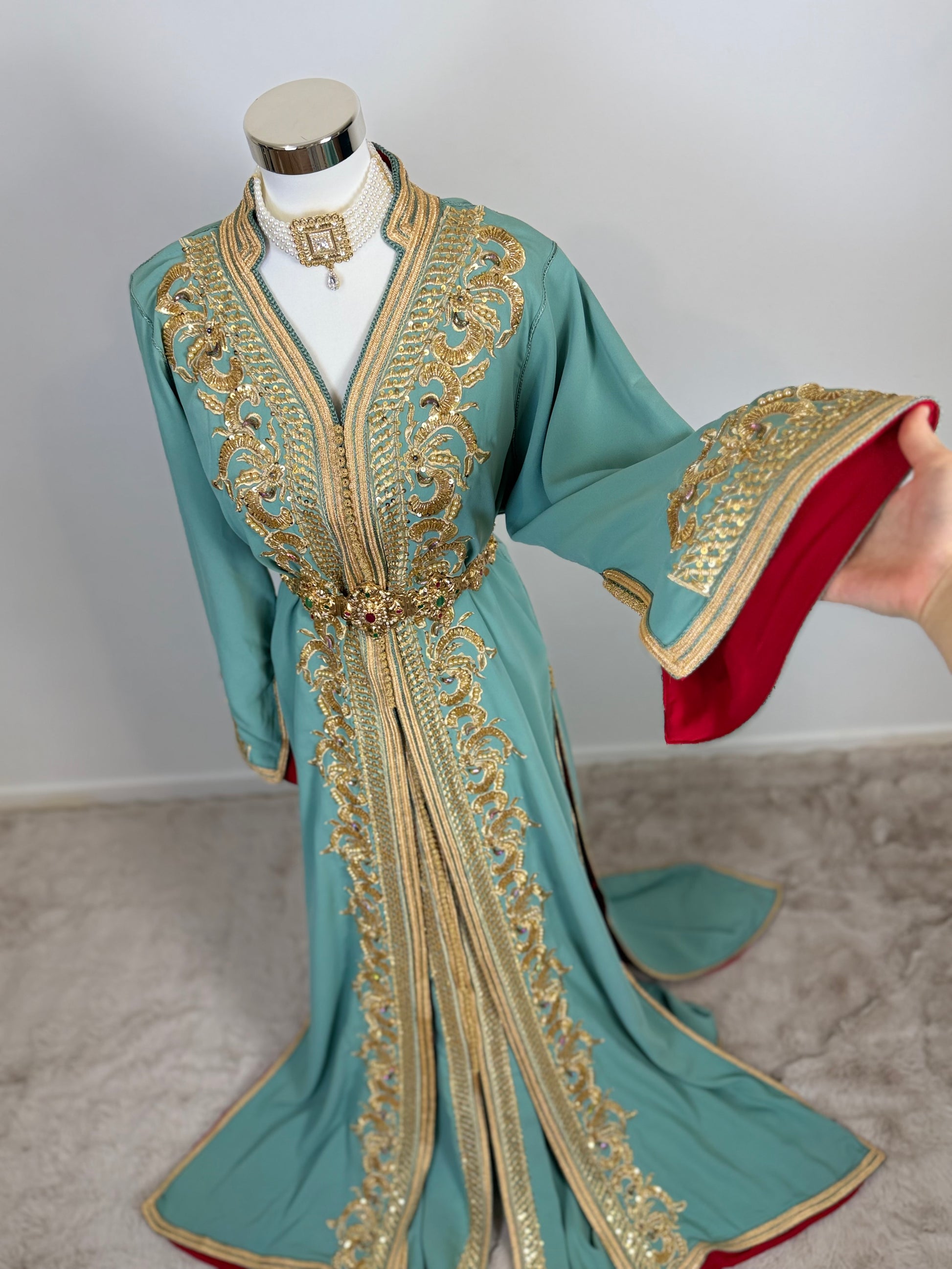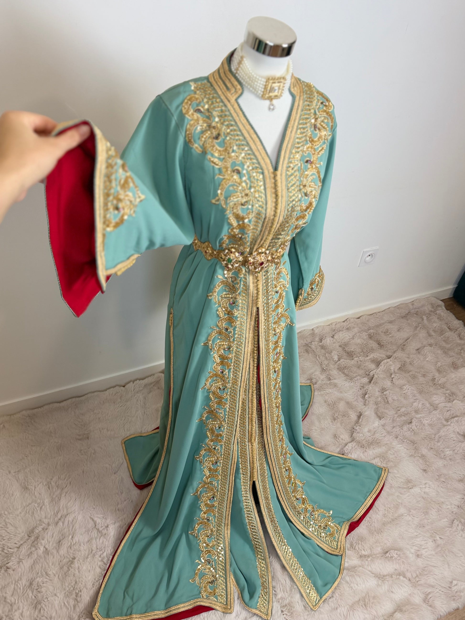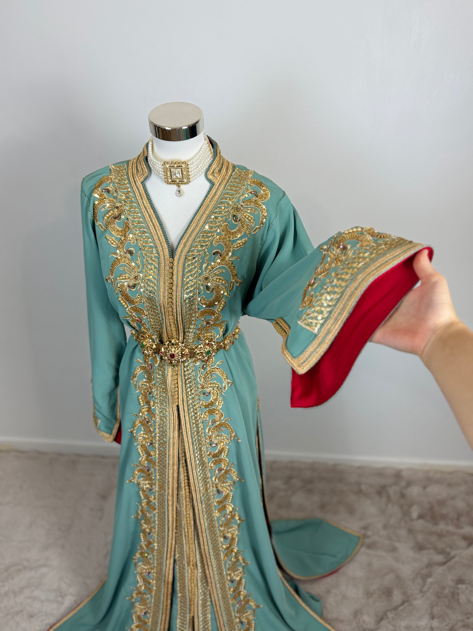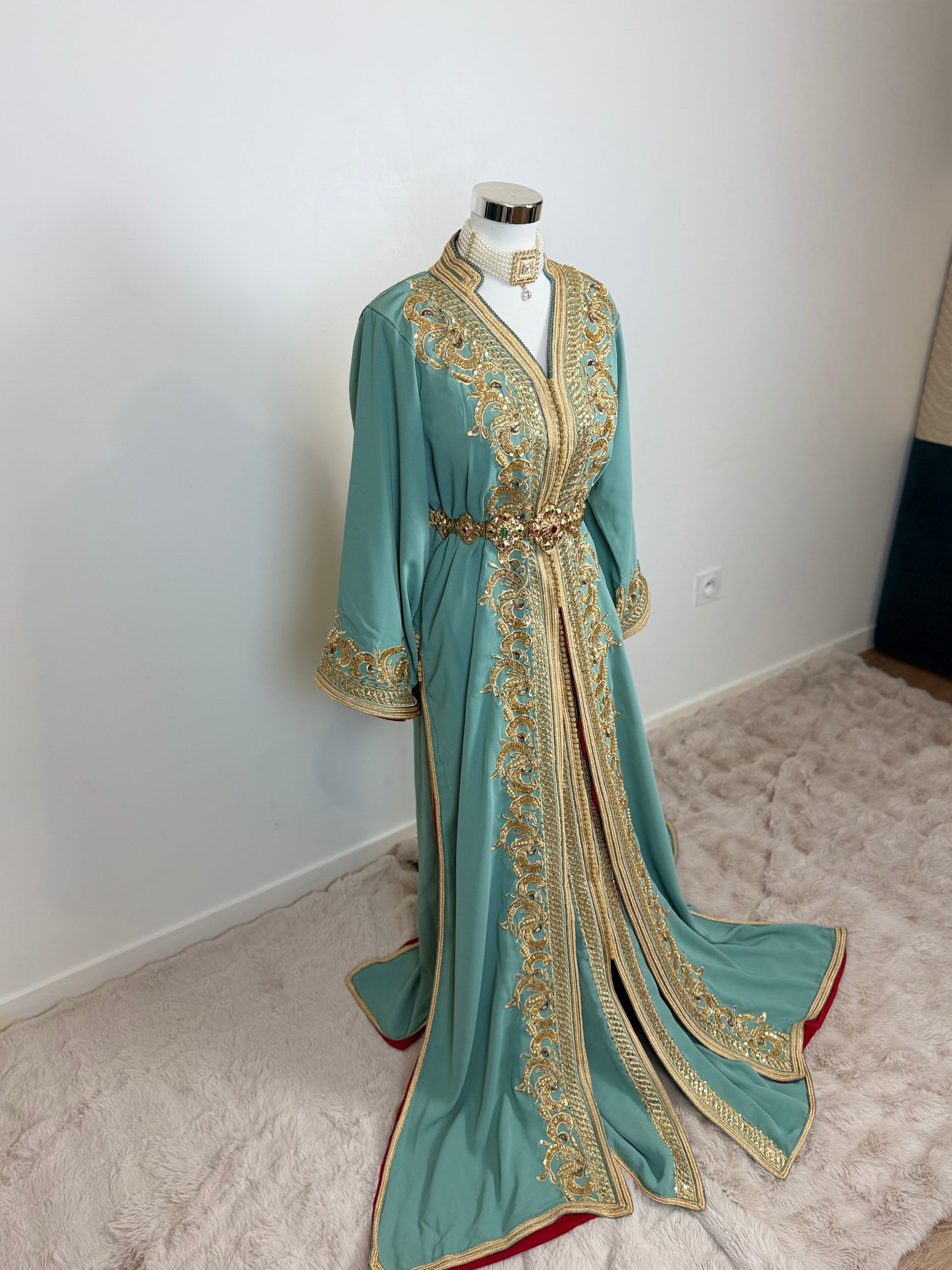 this caftan combines the charm of Moroccan craftsmanship with a contemporary touch,