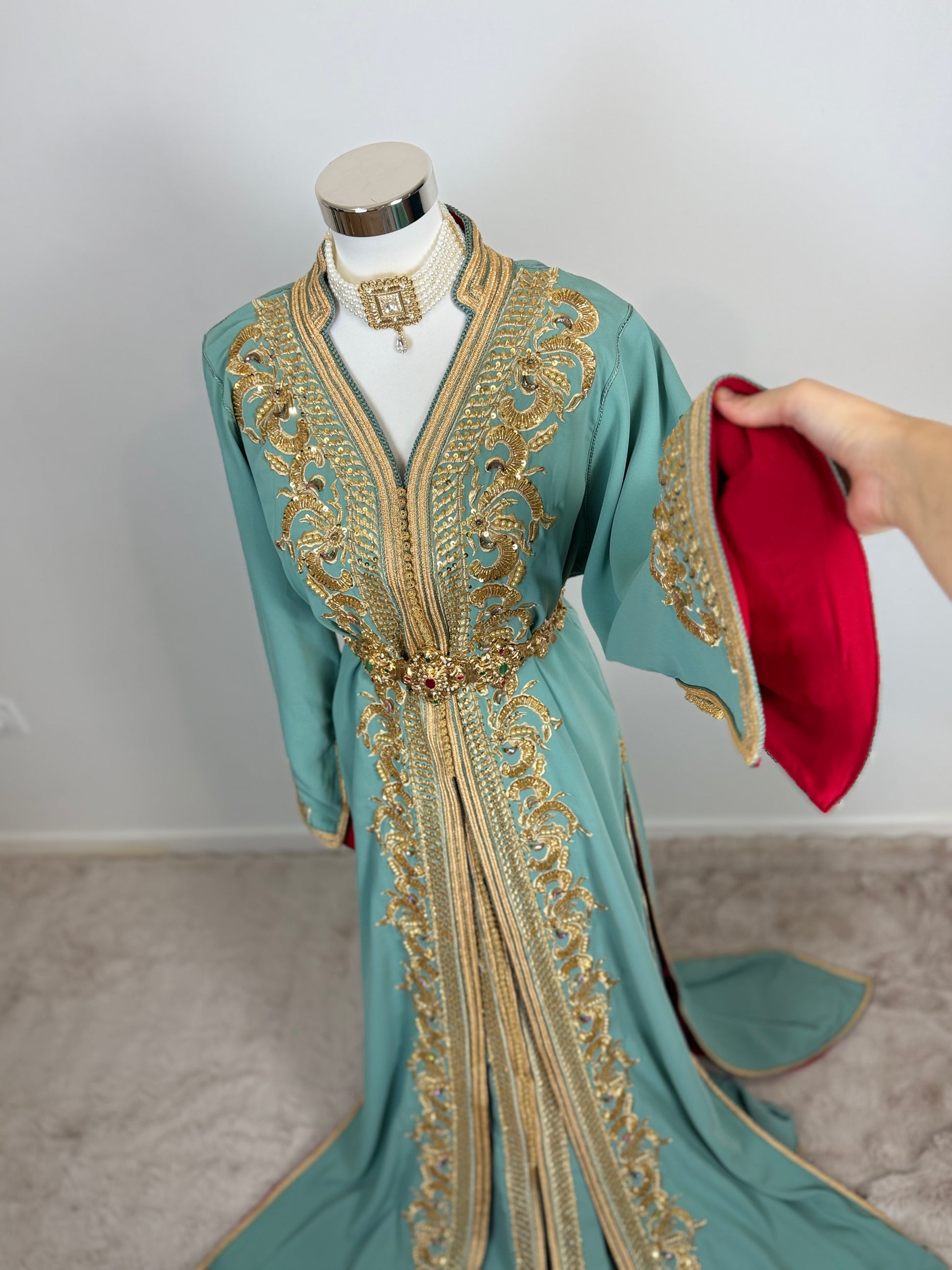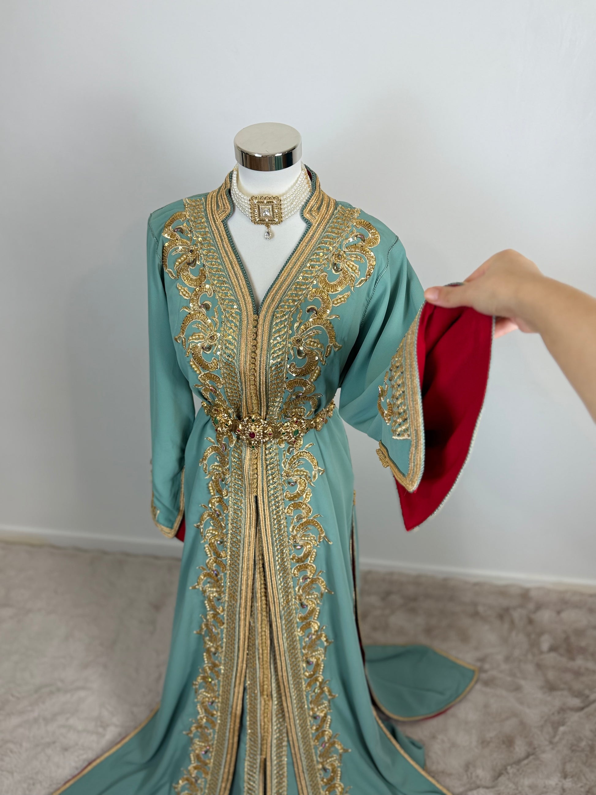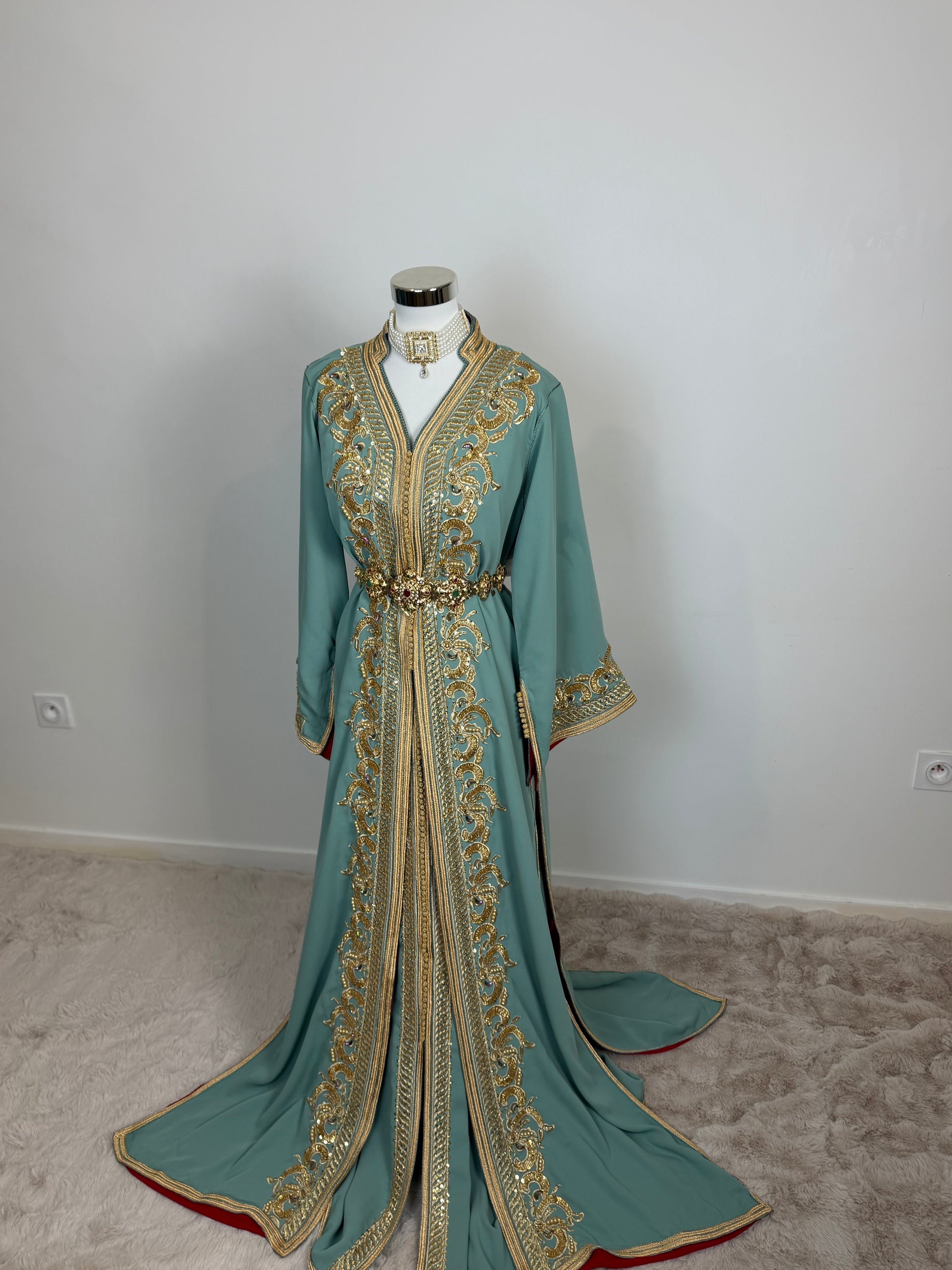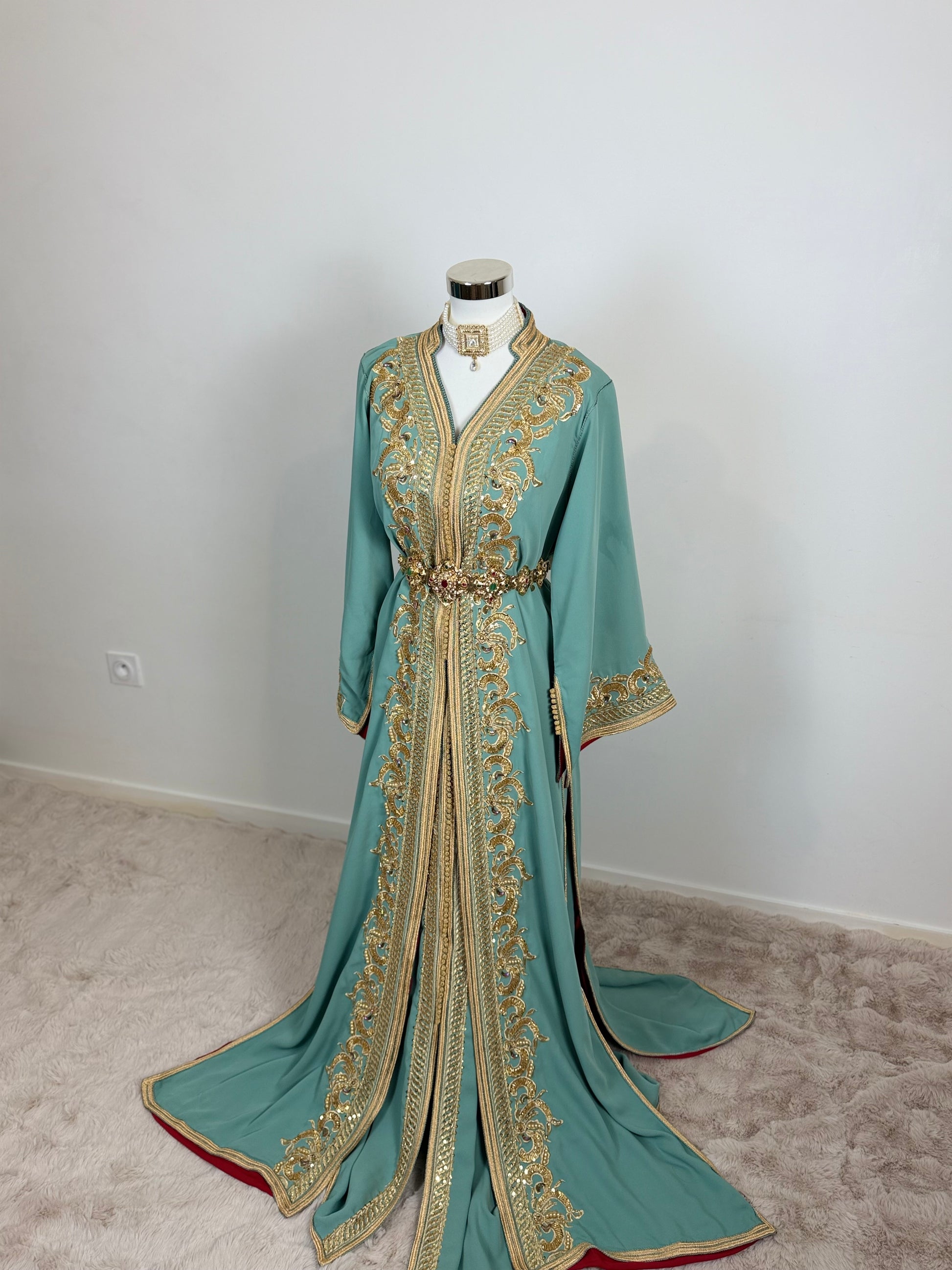 this caftan combines the charm of Moroccan craftsmanship with a contemporary touch,