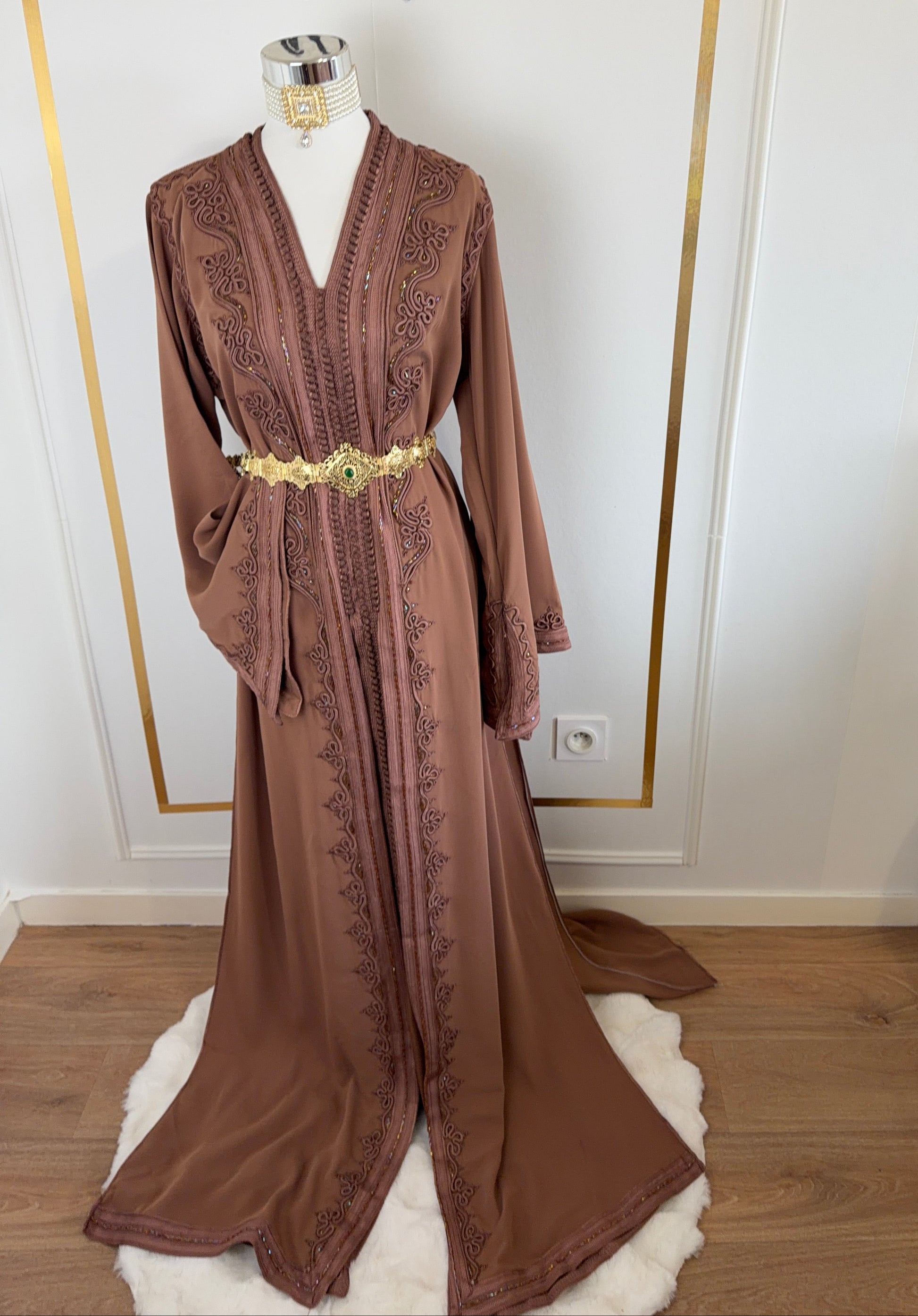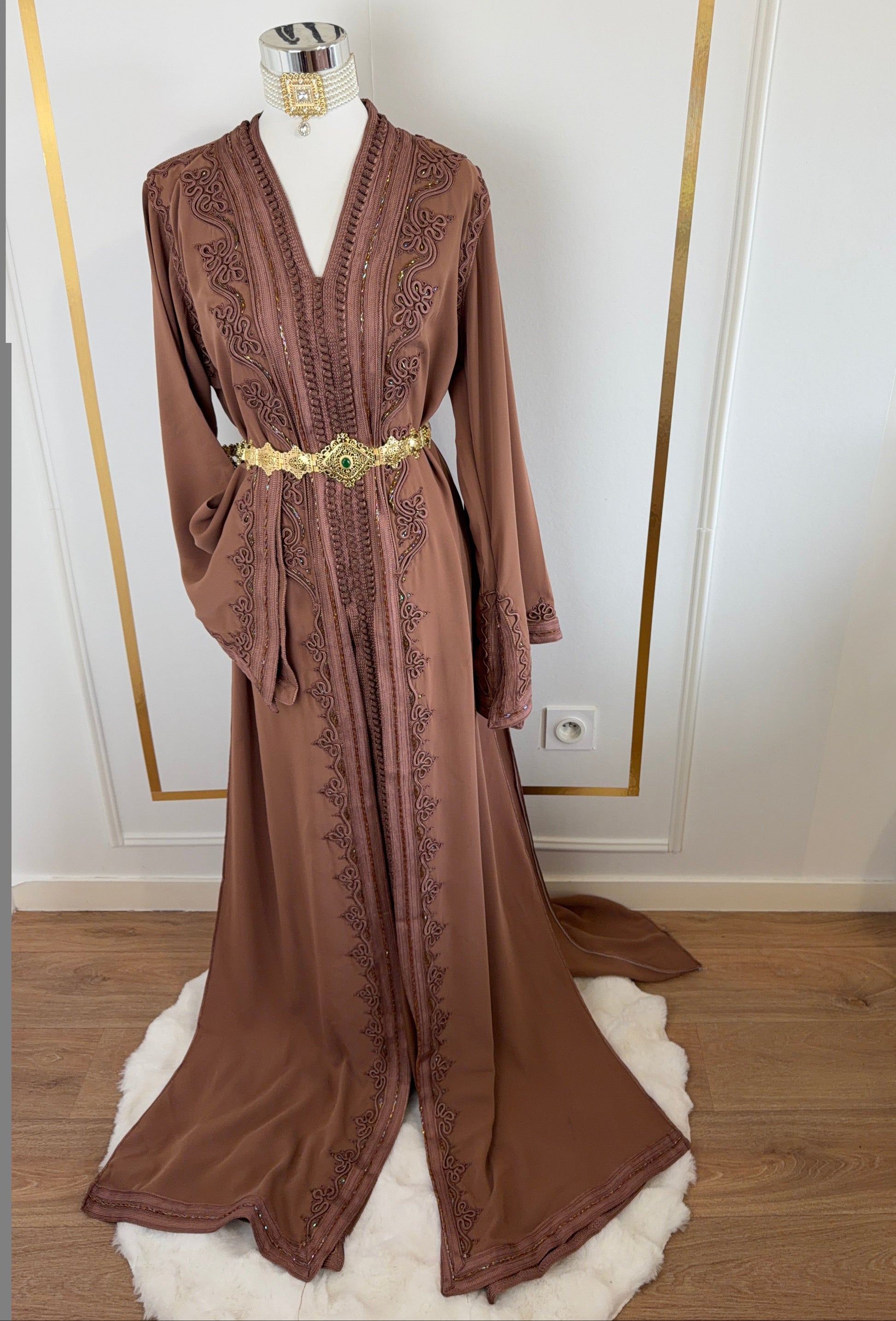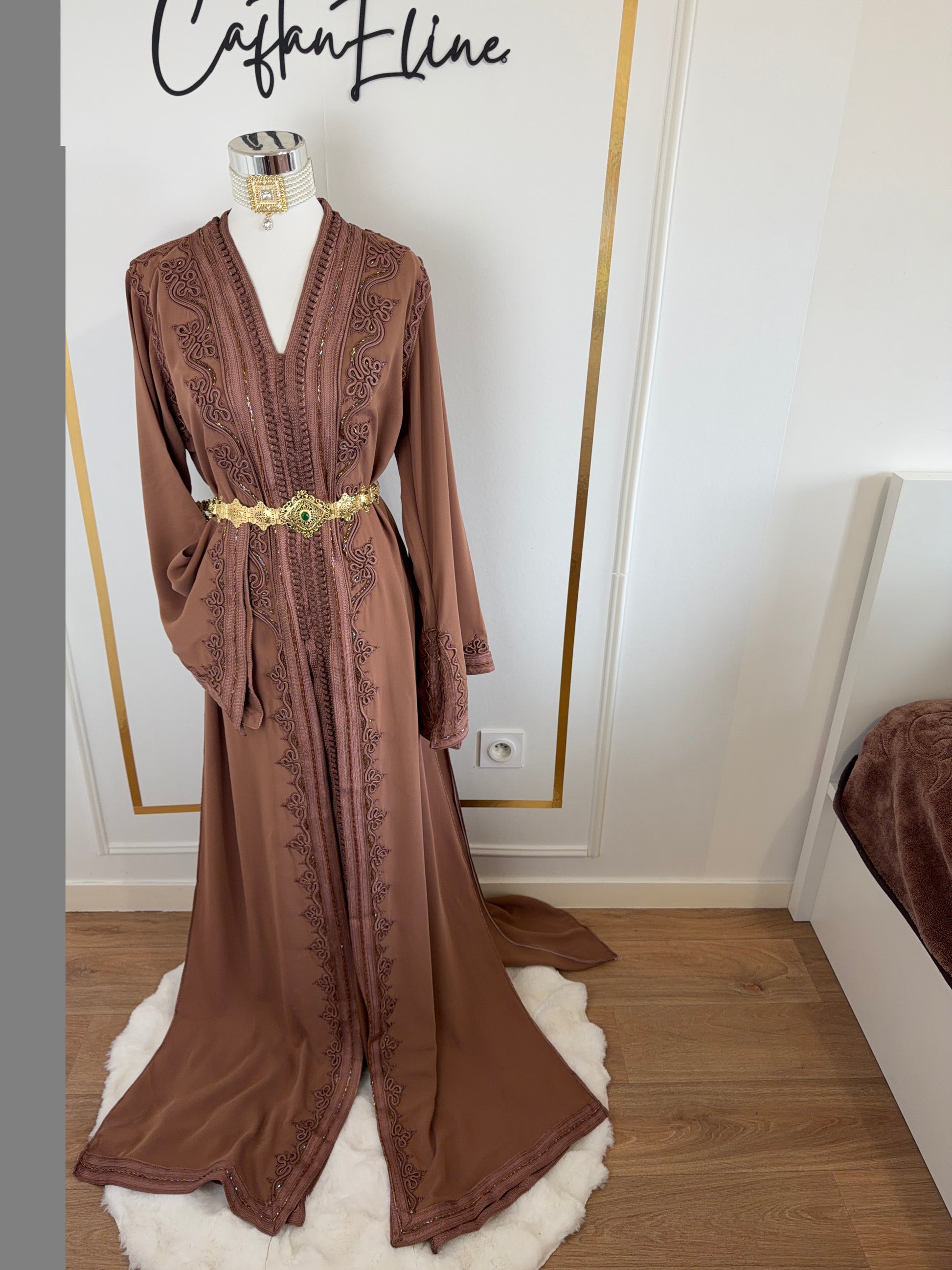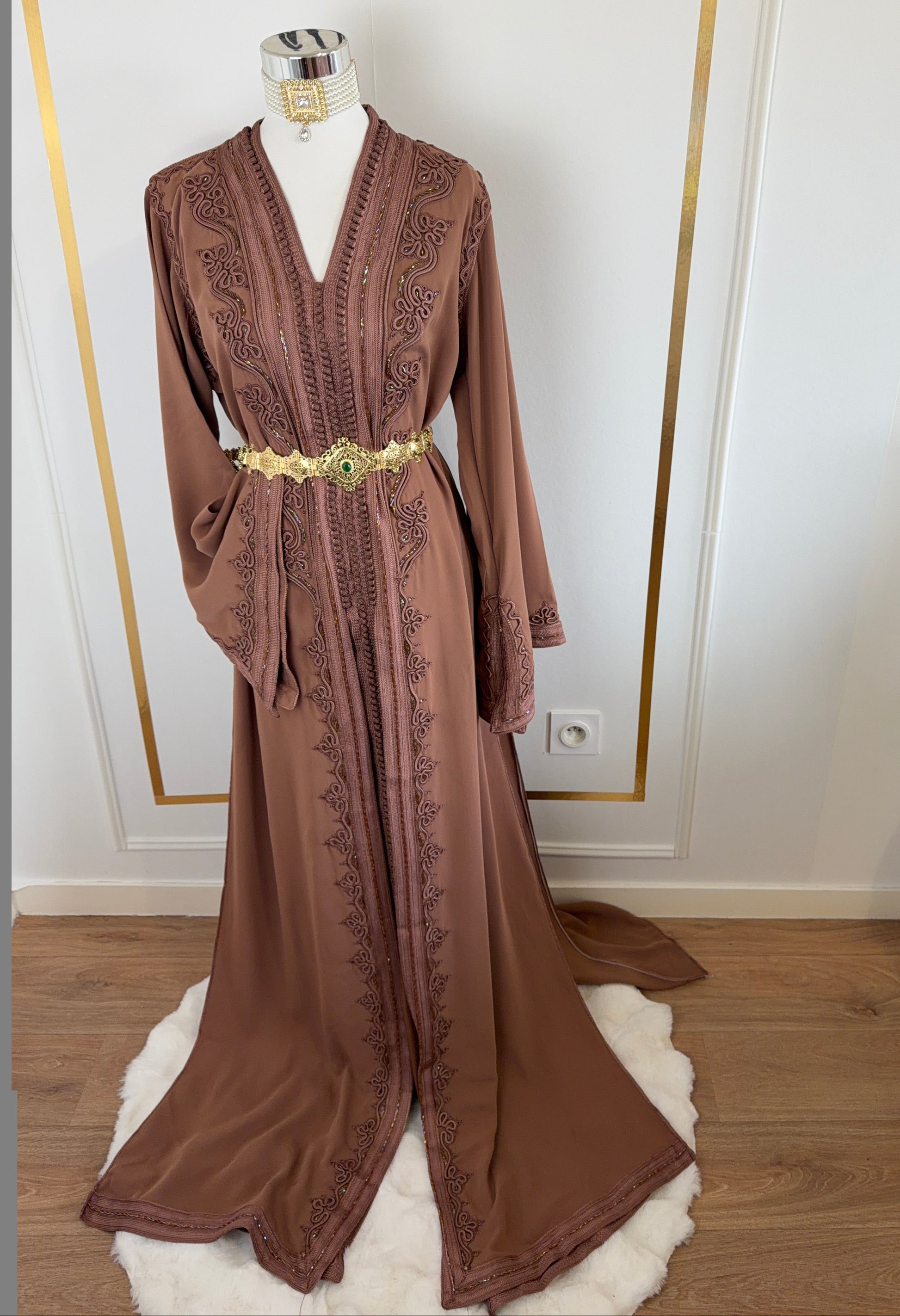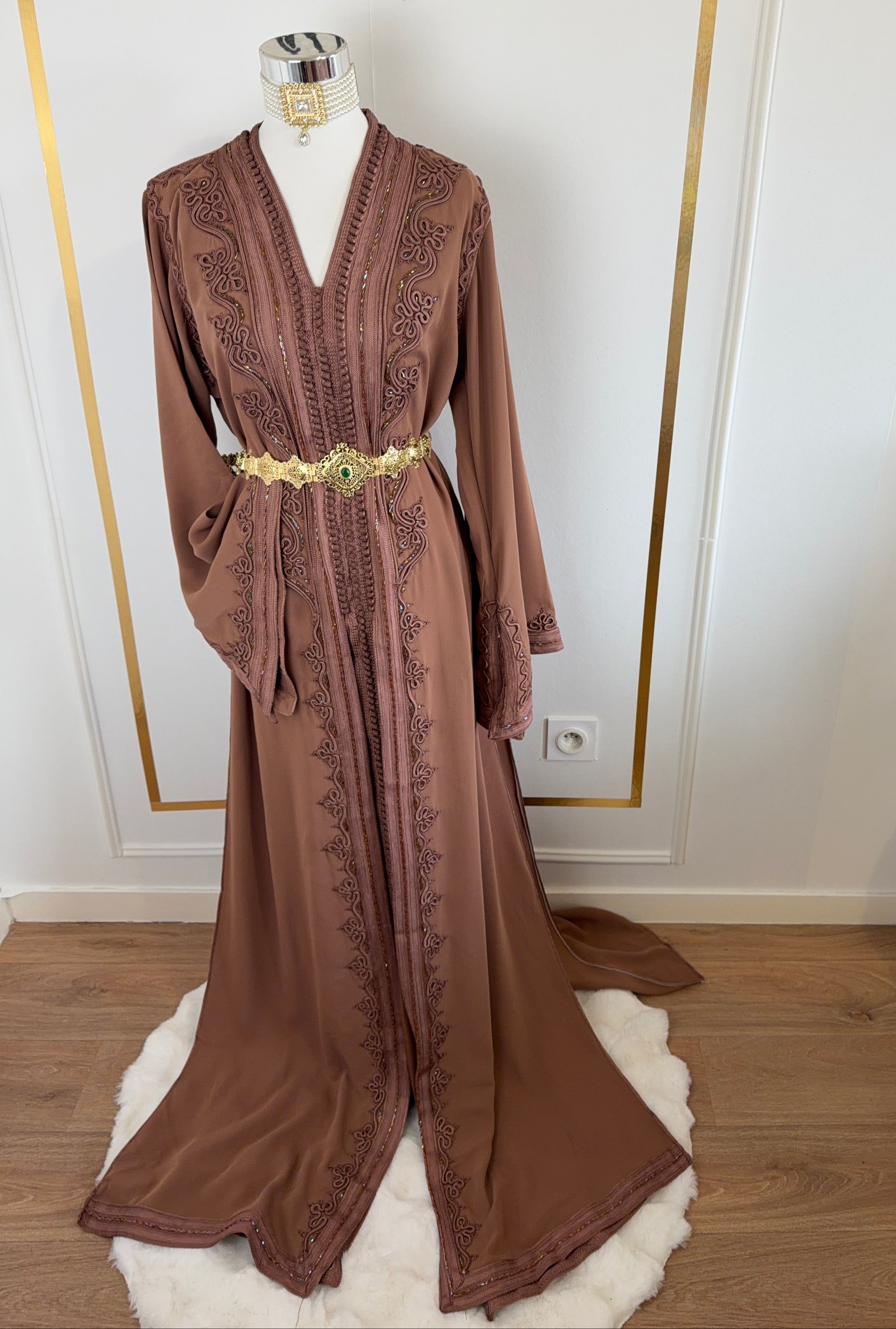 this caftan combines the charm of Moroccan craftsmanship with a contemporary touch,