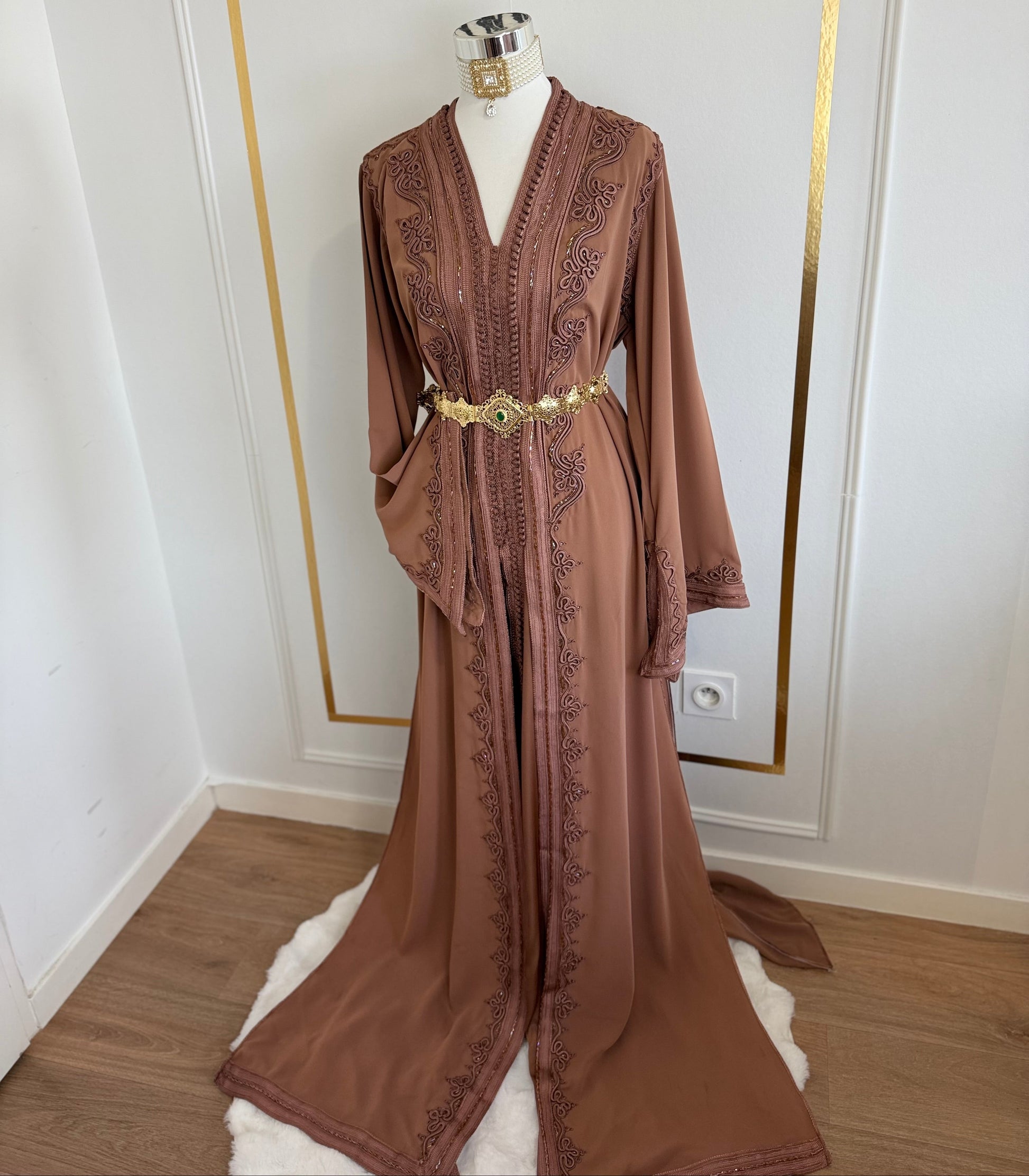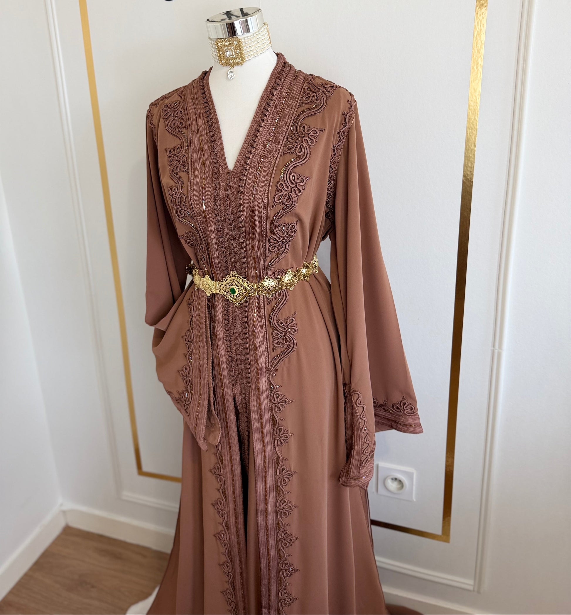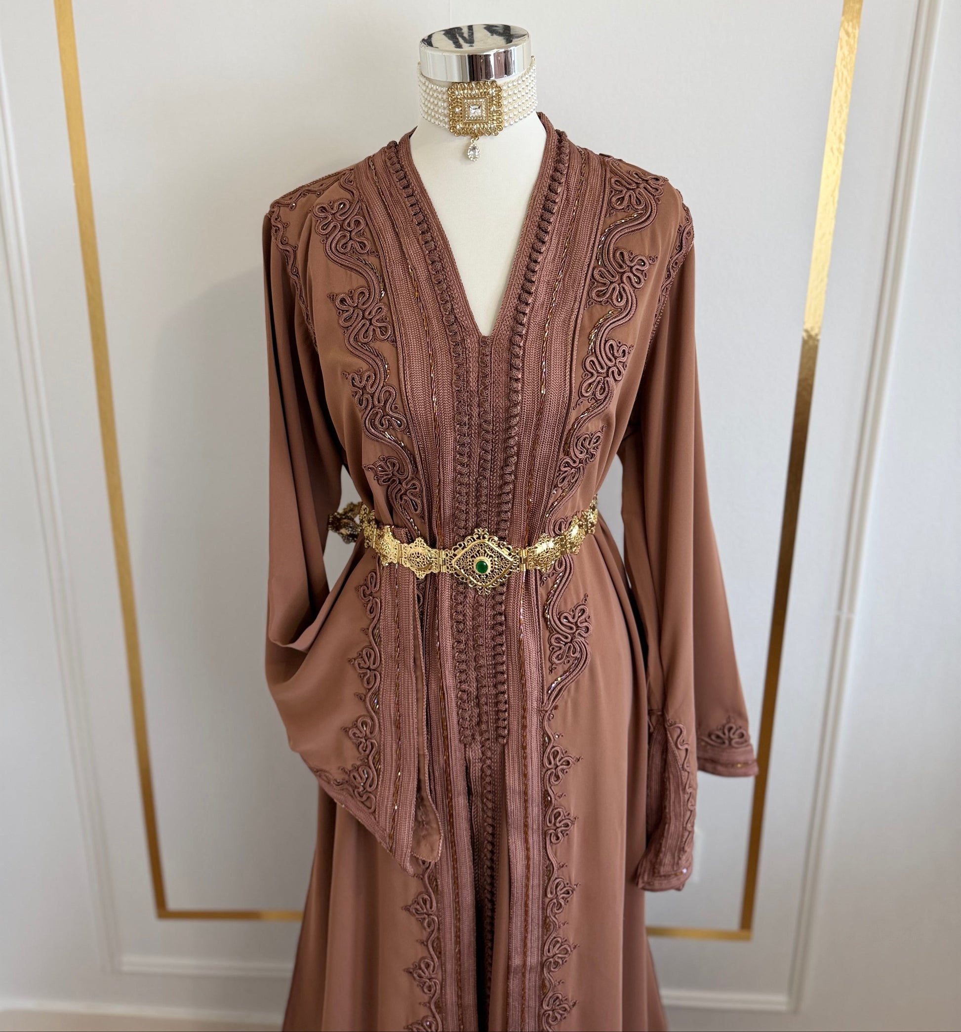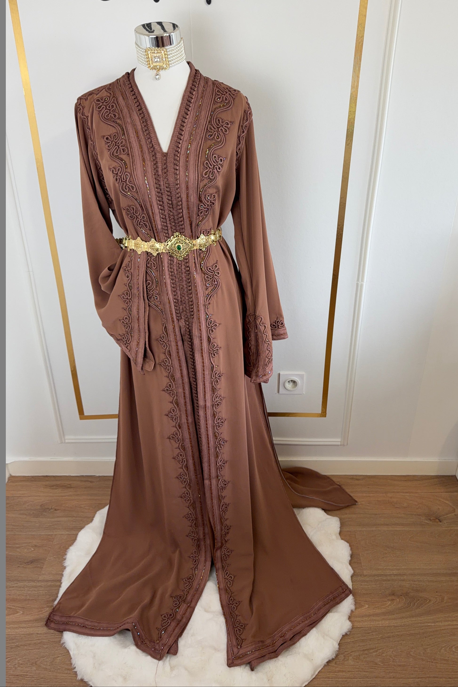 this caftan combines the charm of Moroccan craftsmanship with a contemporary touch,