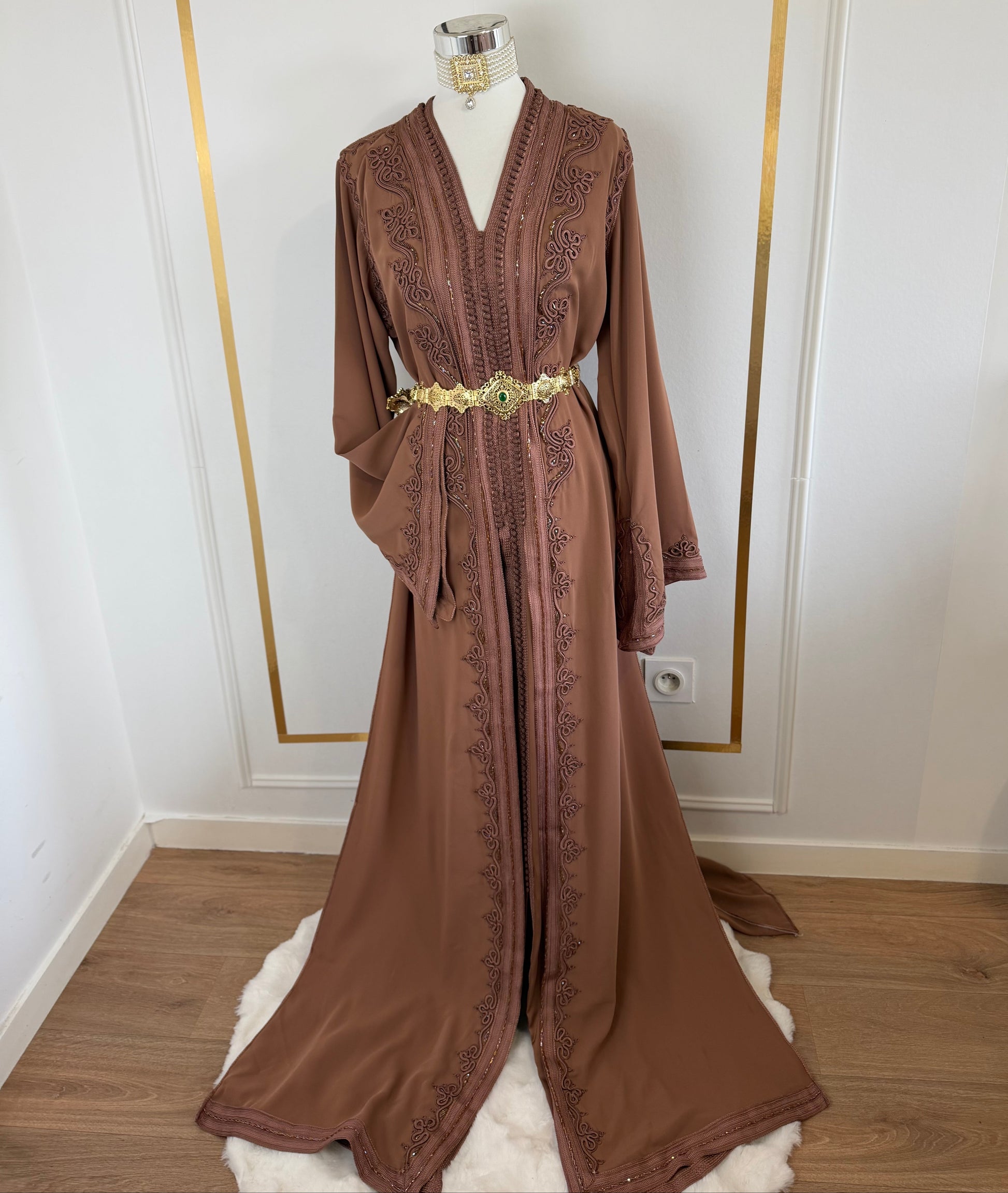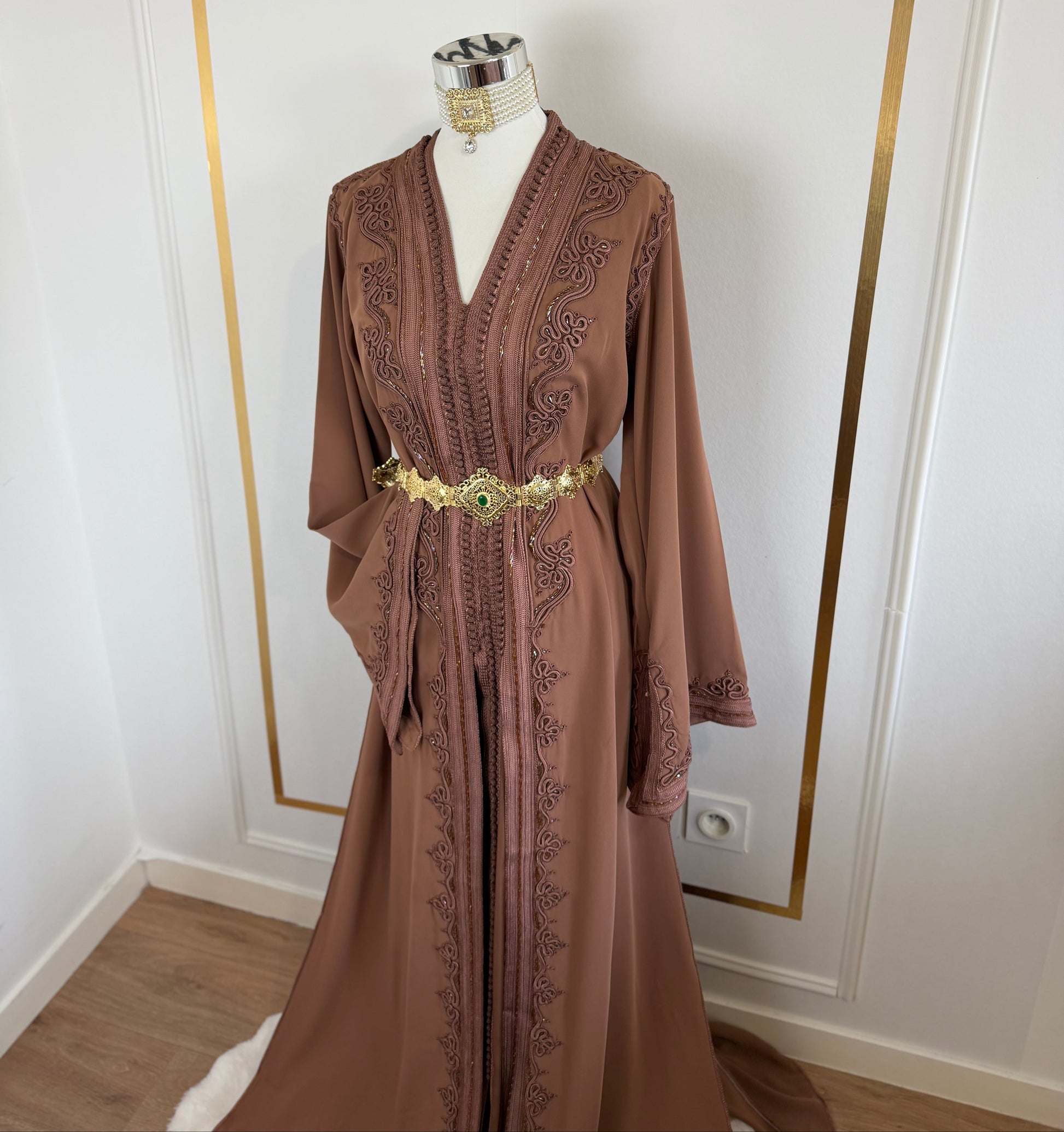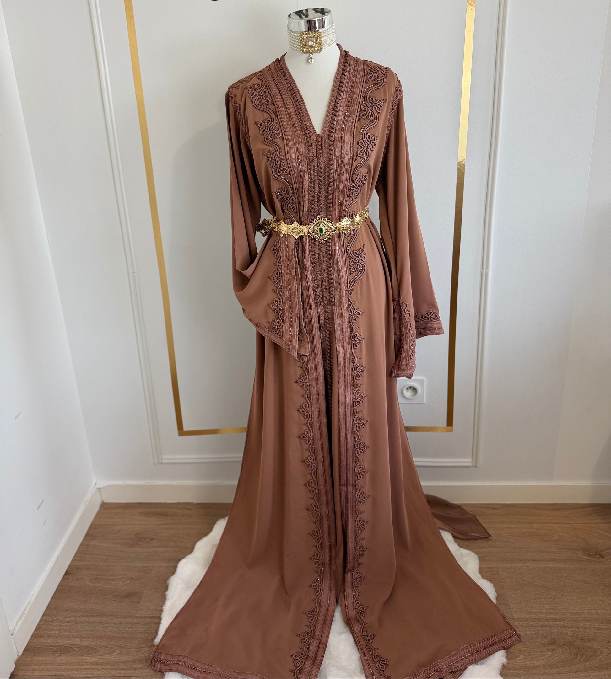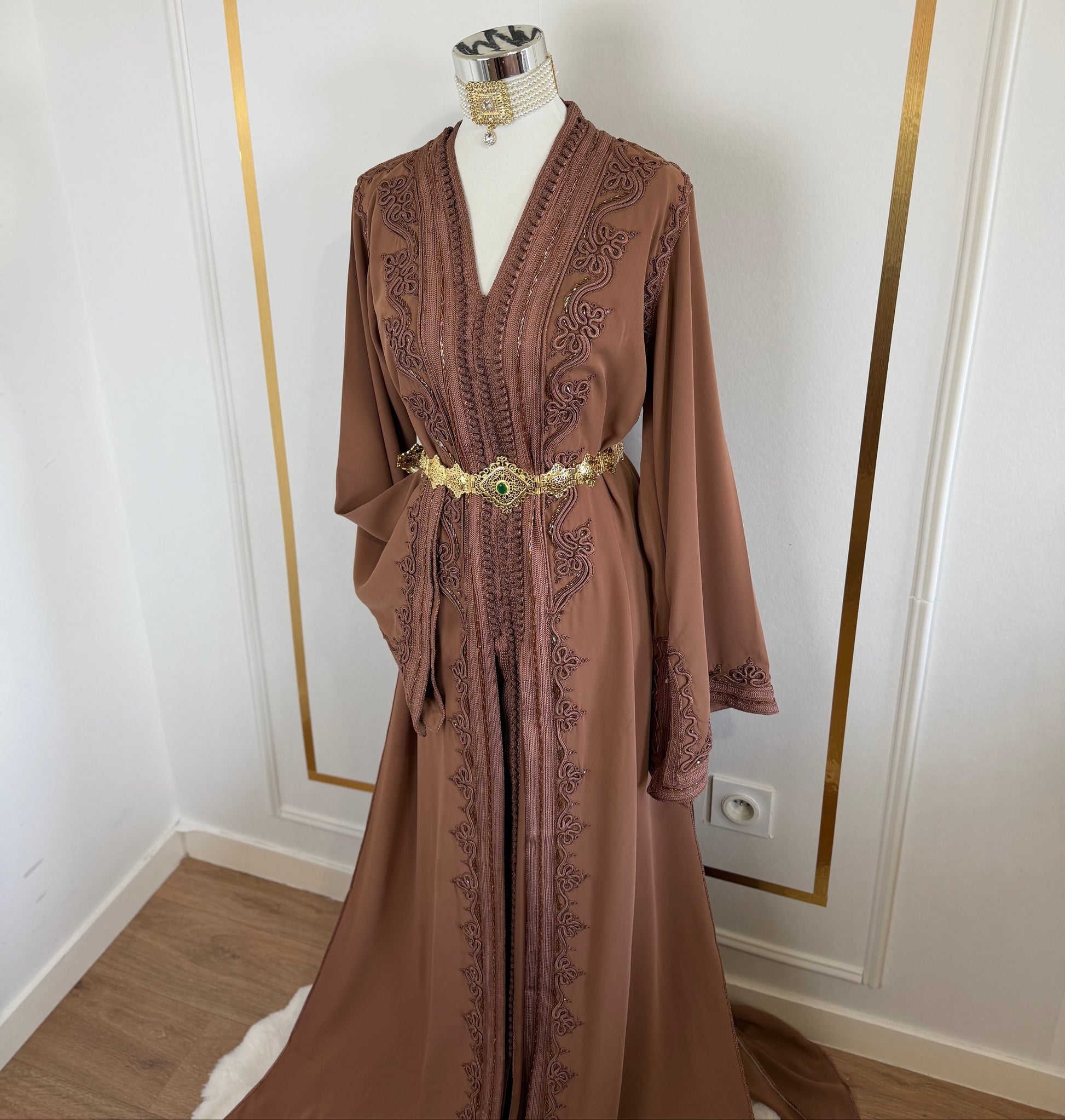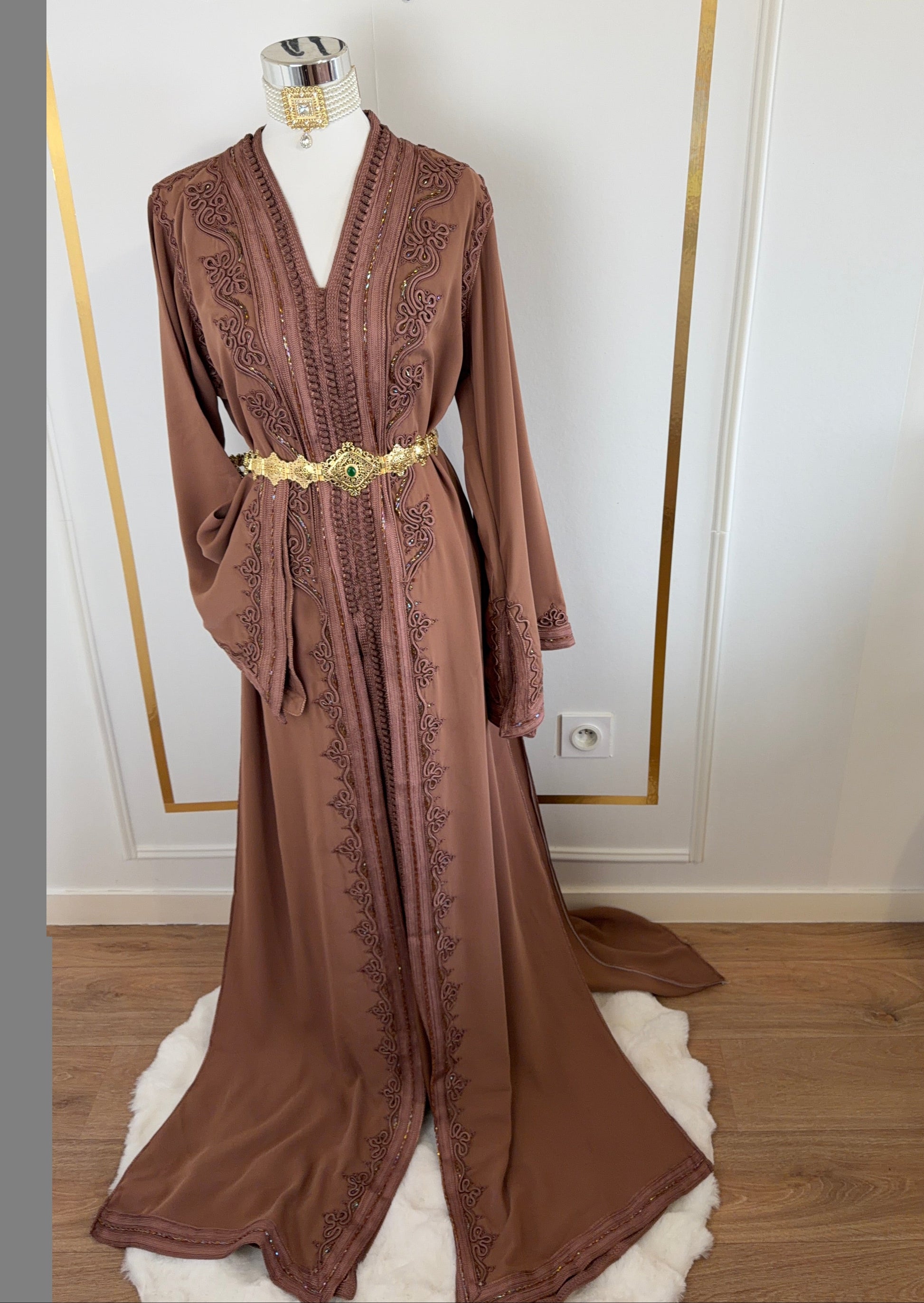 this caftan combines the charm of Moroccan craftsmanship with a contemporary touch,