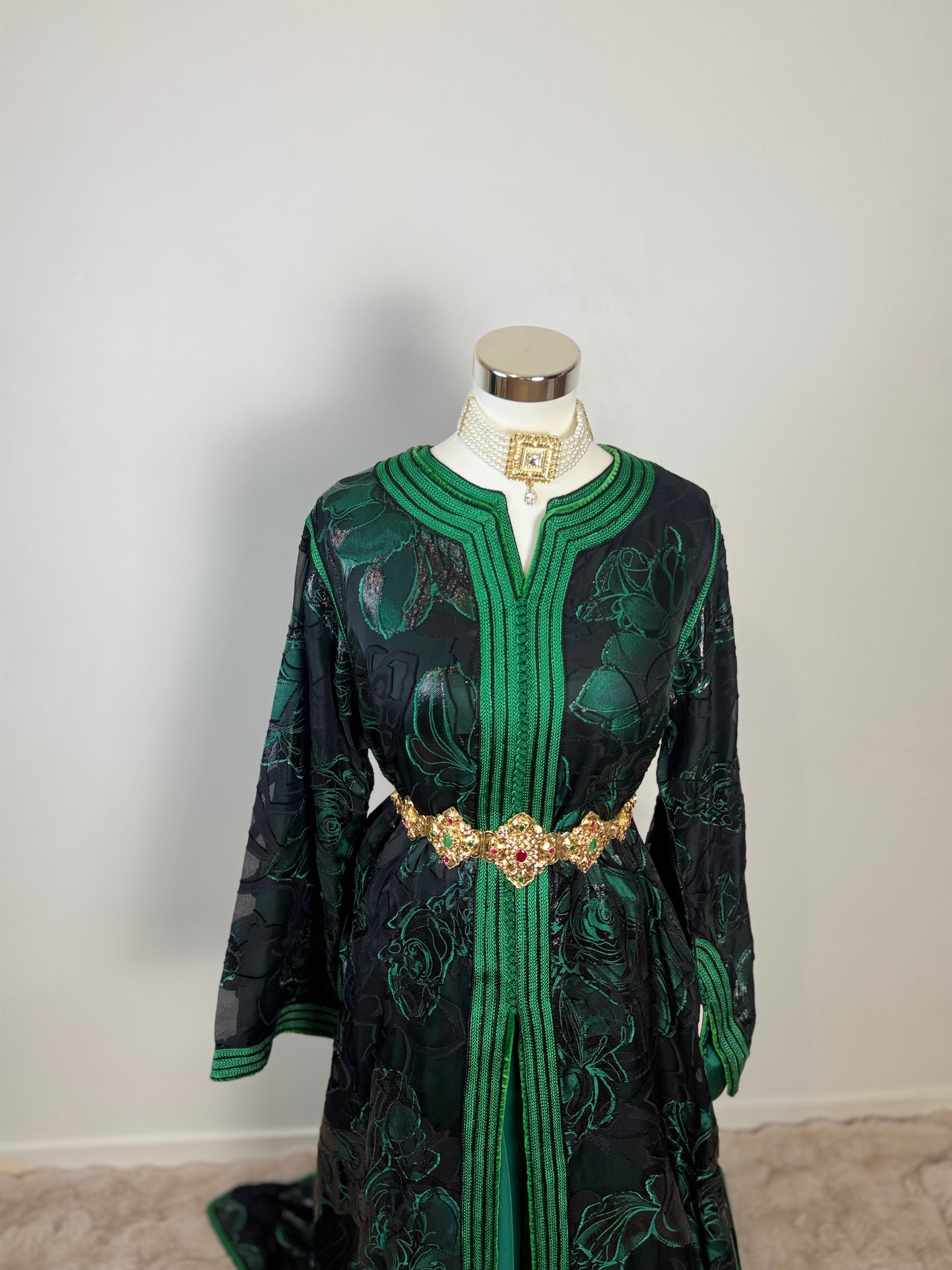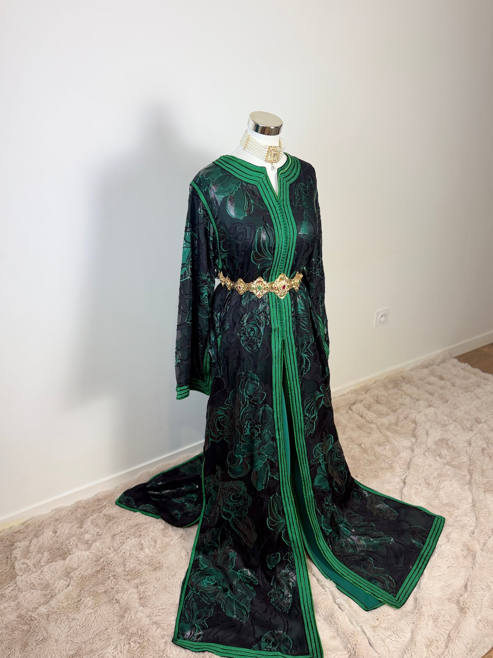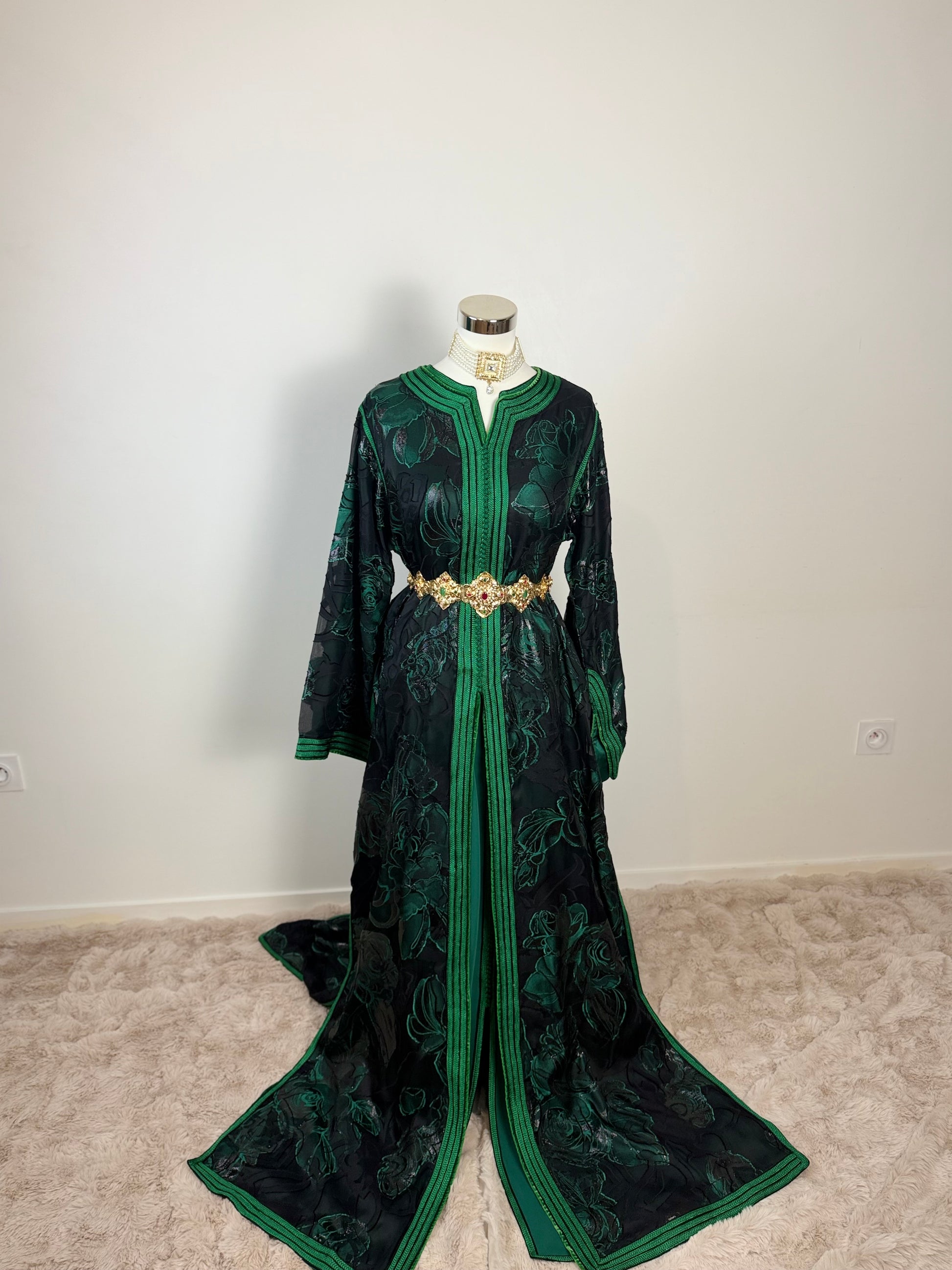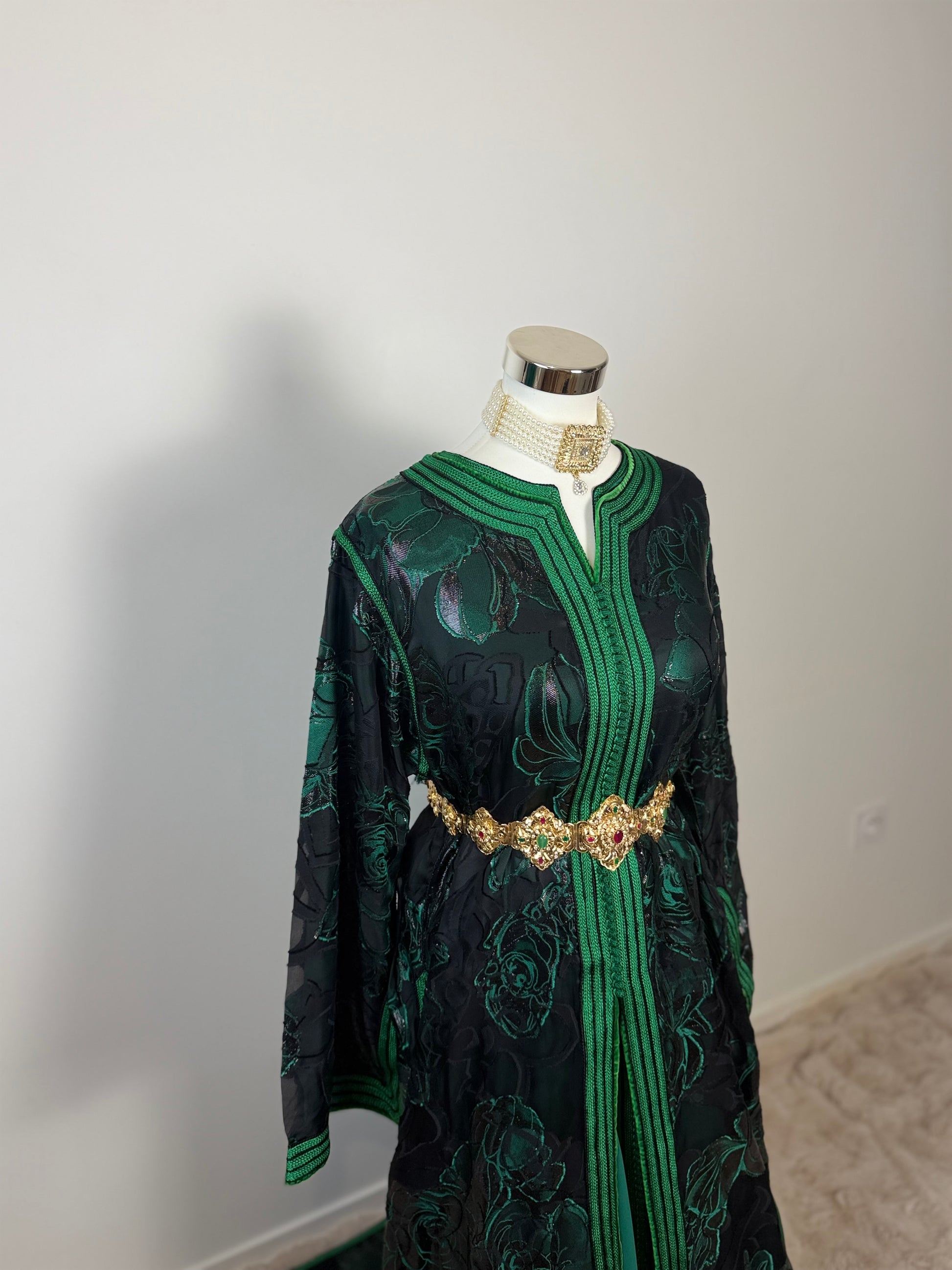 this caftan combines the charm of Moroccan craftsmanship with a contemporary touch,