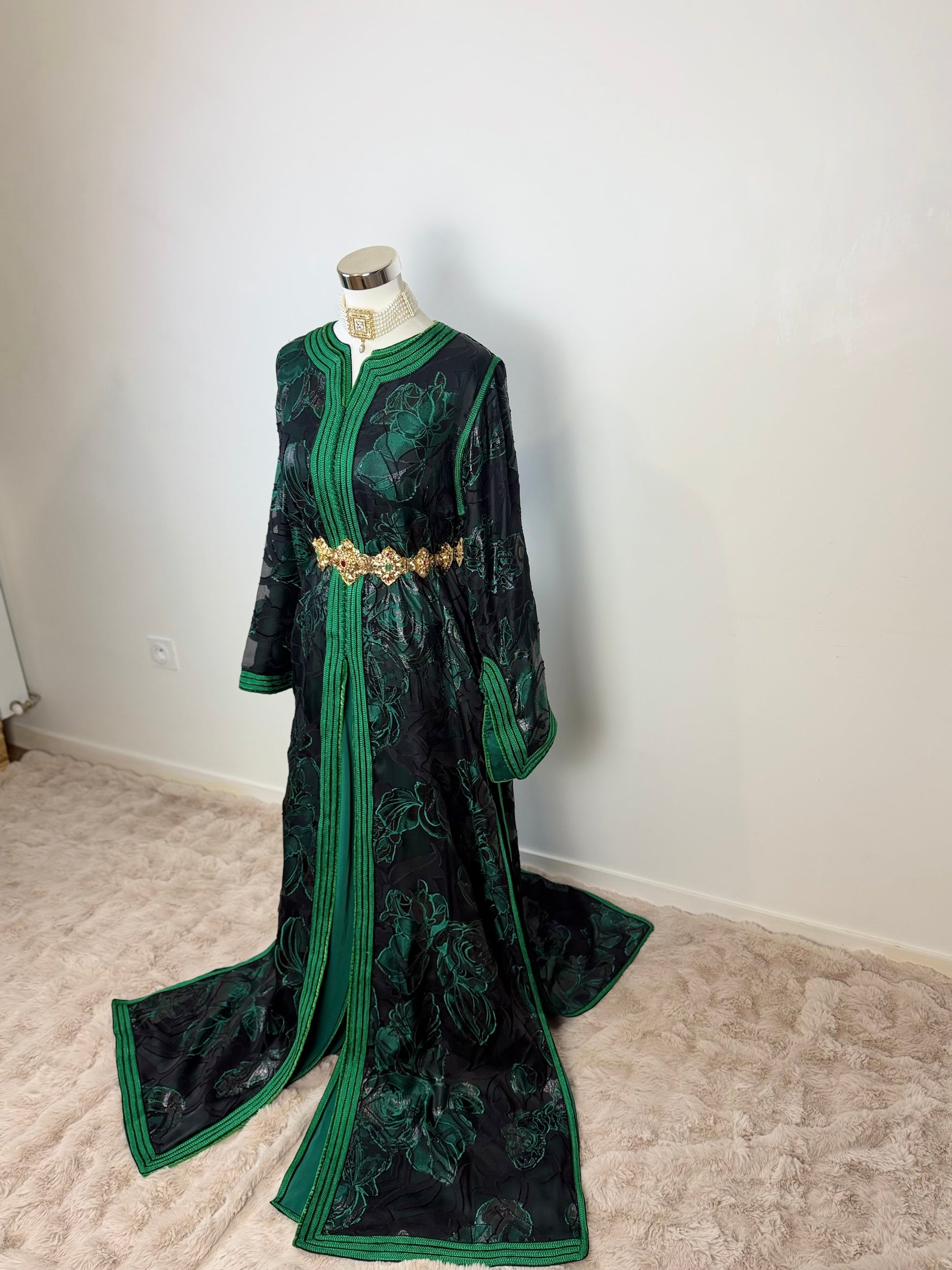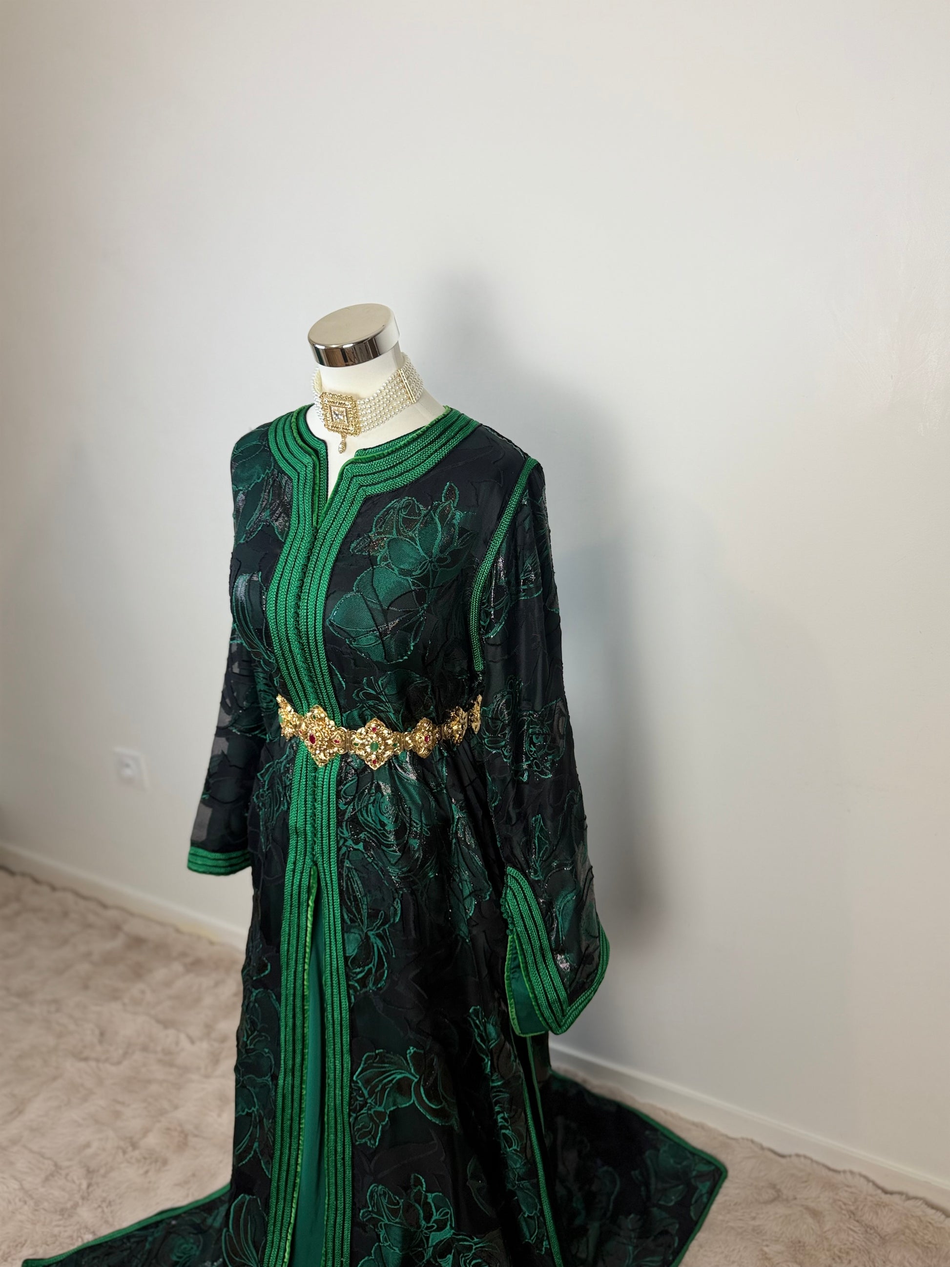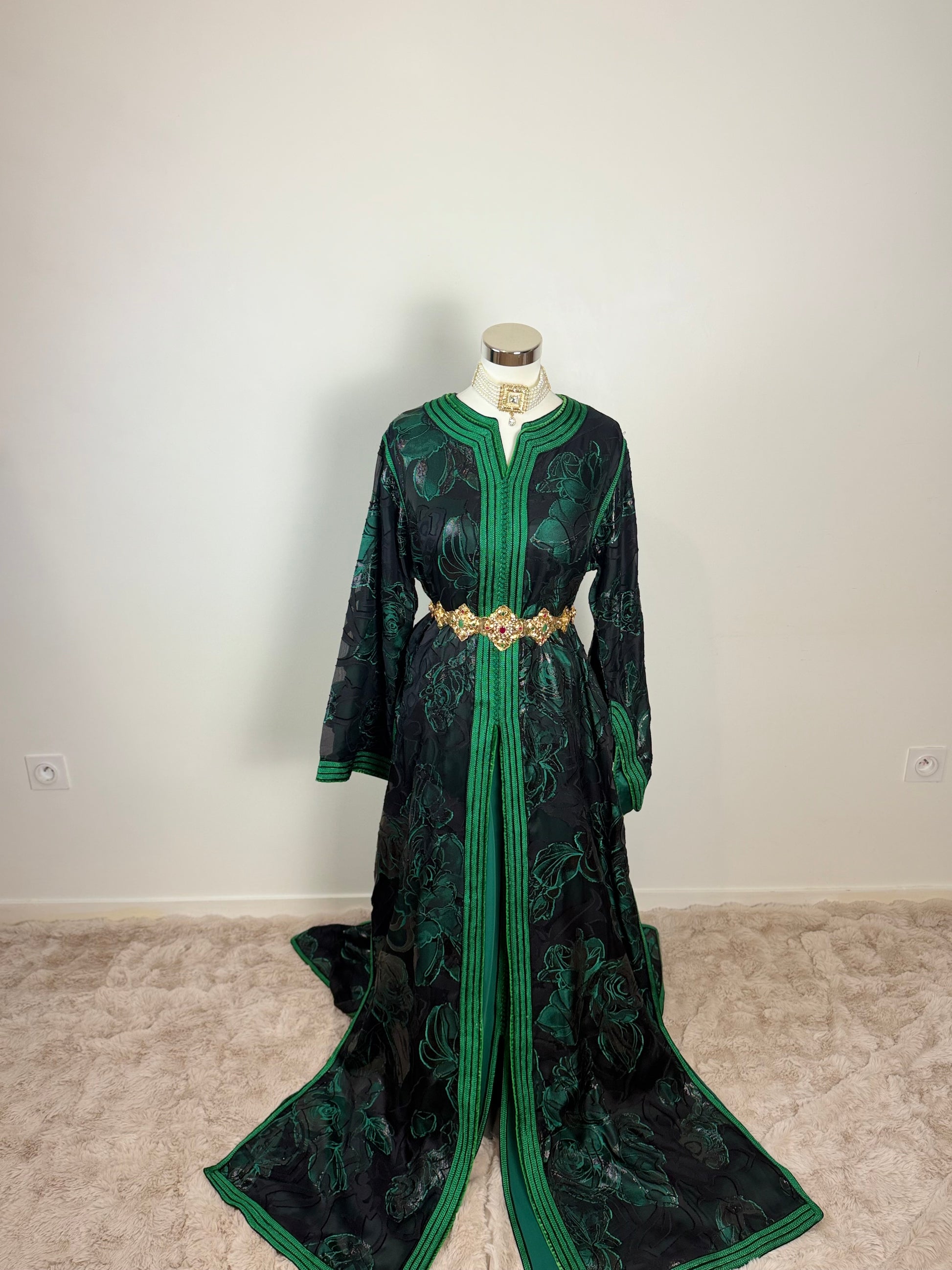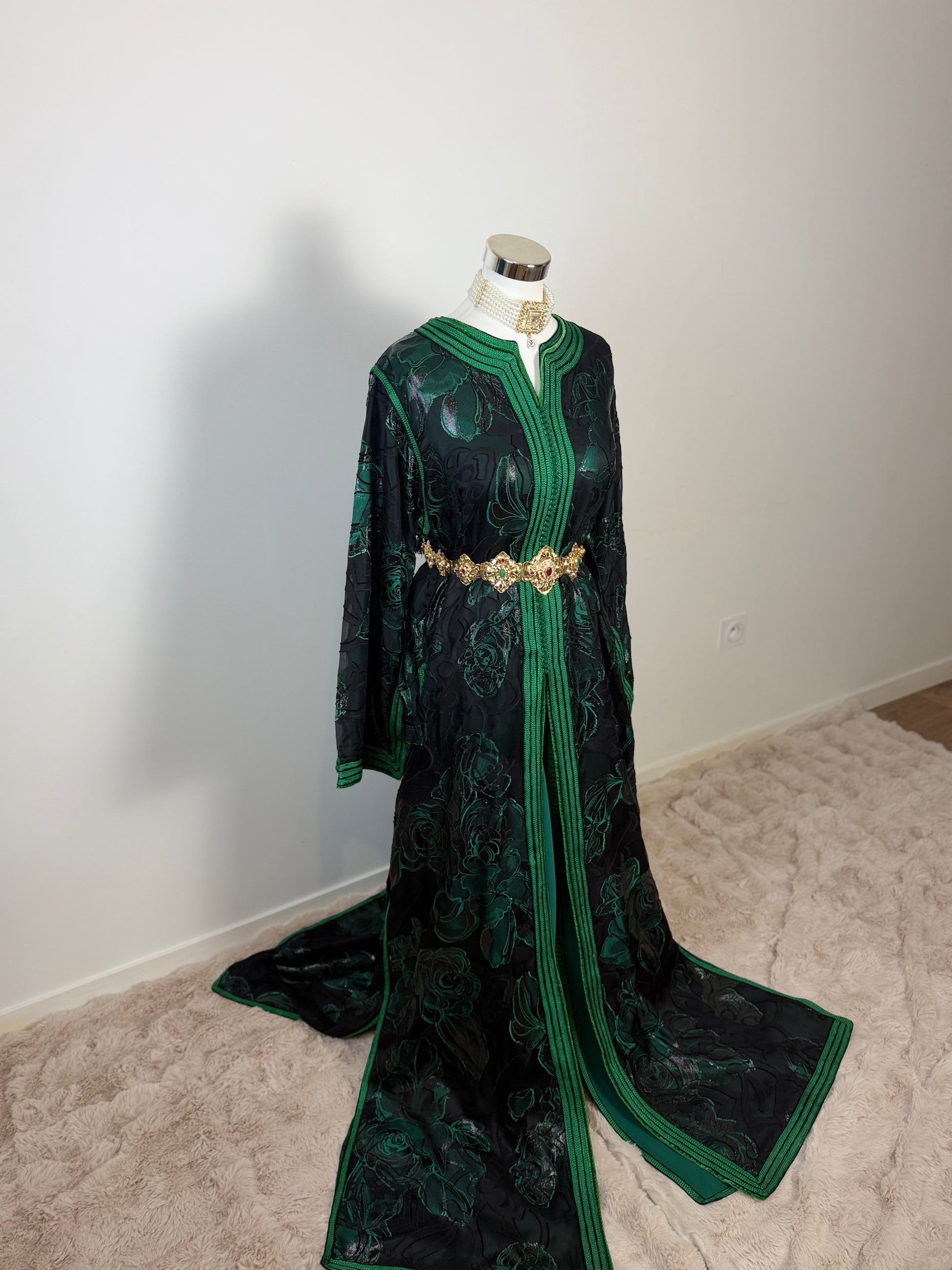 this caftan combines the charm of Moroccan craftsmanship with a contemporary touch,