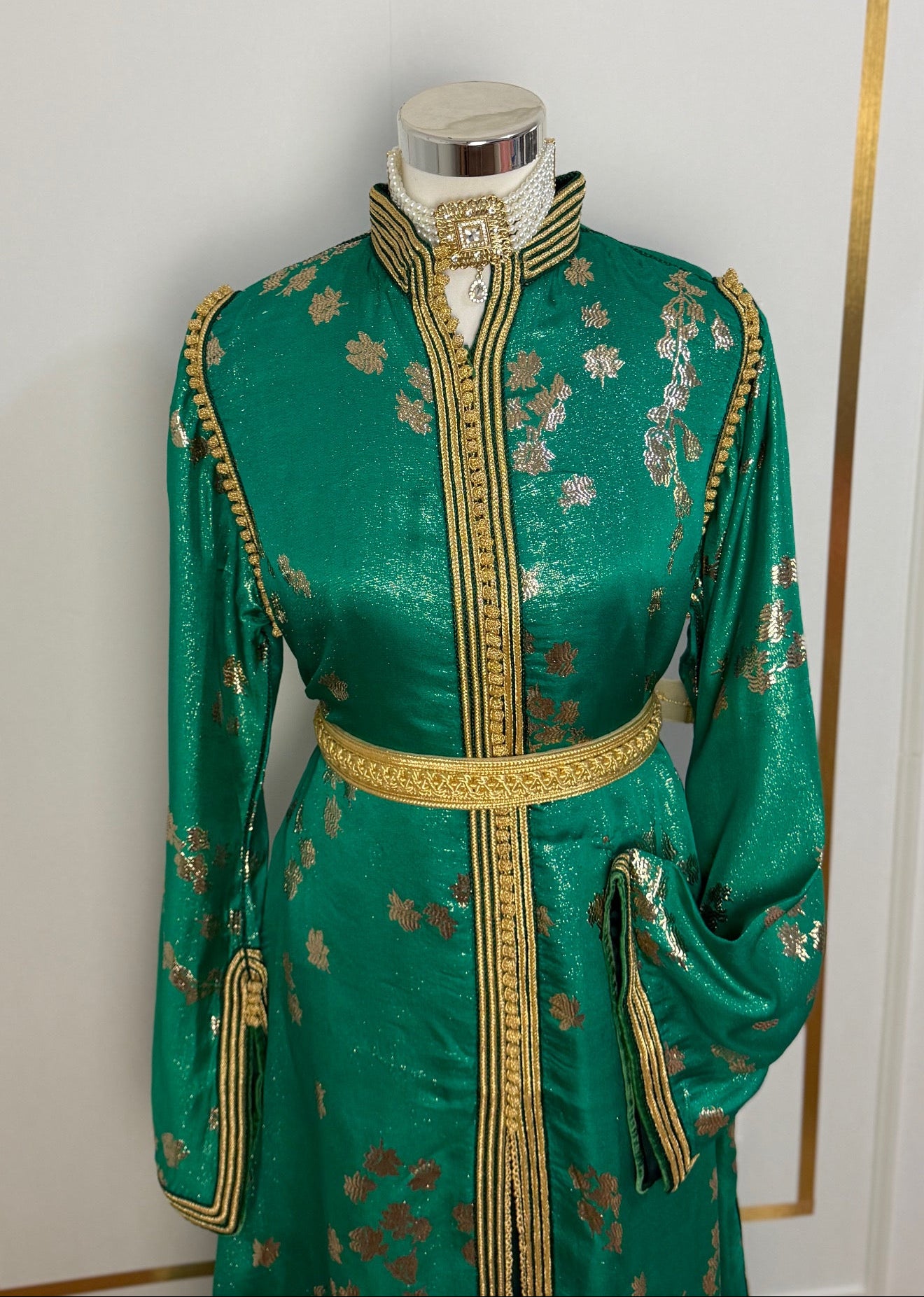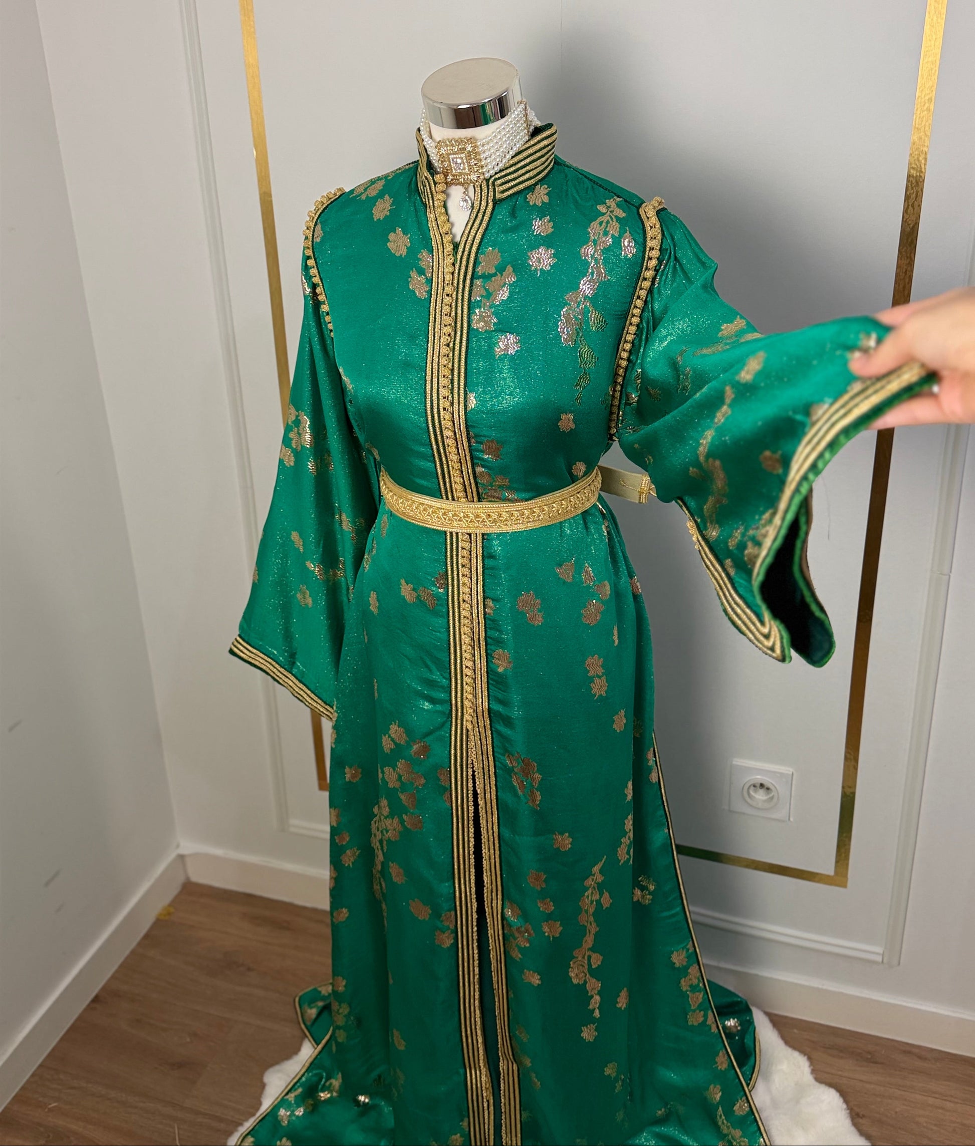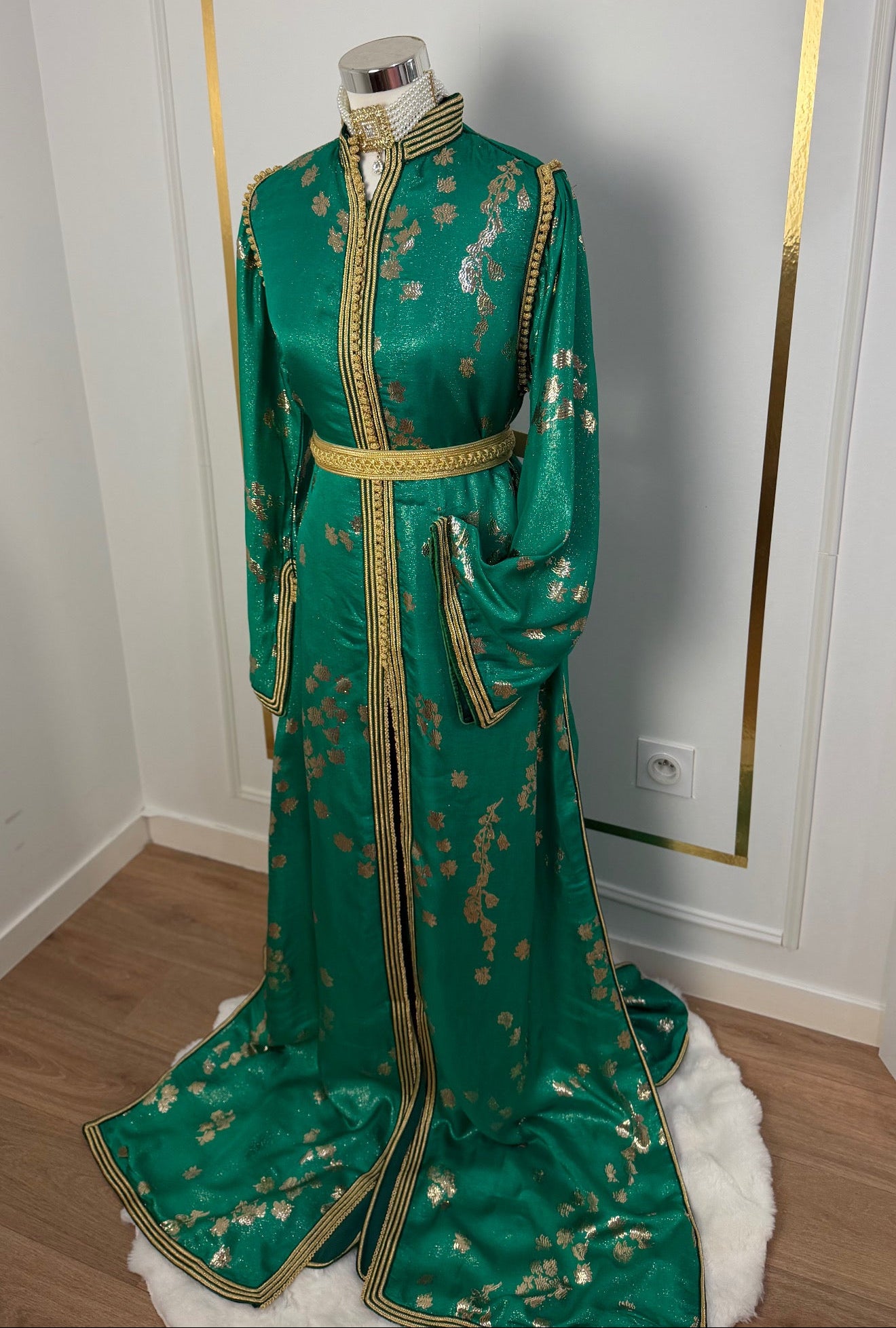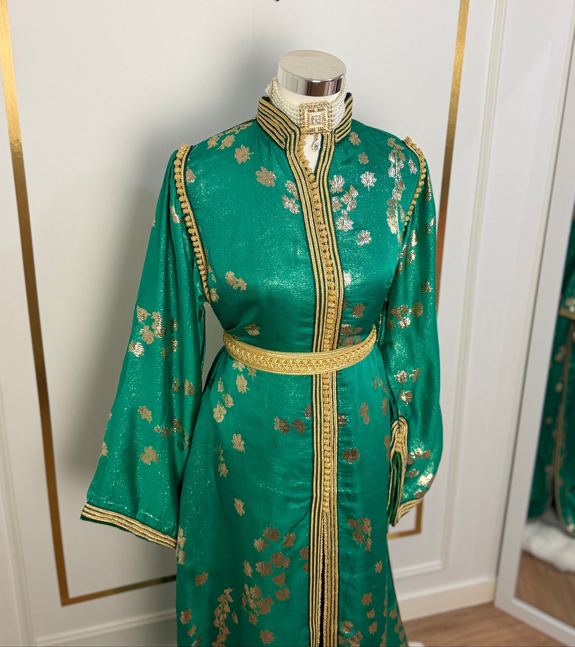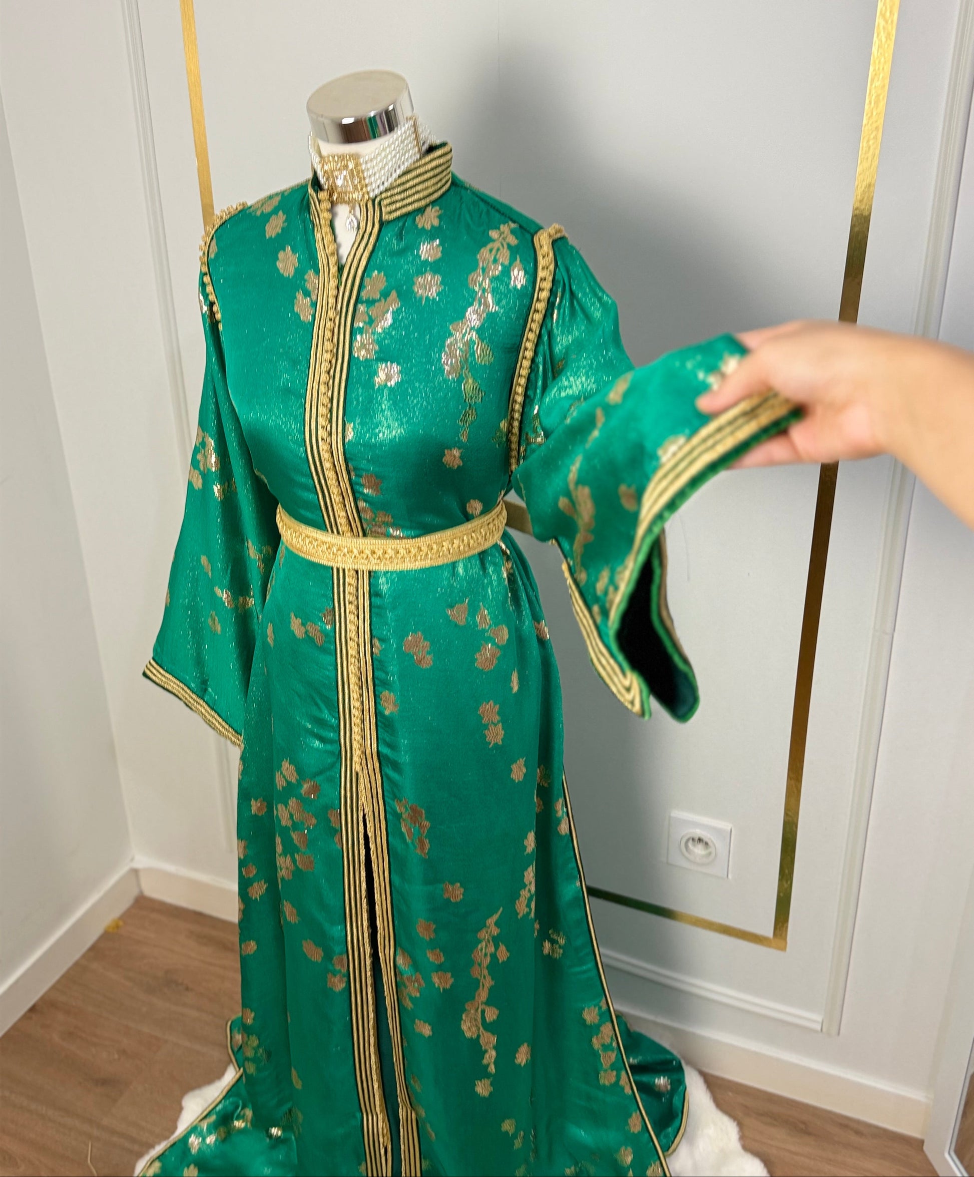 this caftan combines the charm of Moroccan craftsmanship with a contemporary touch,