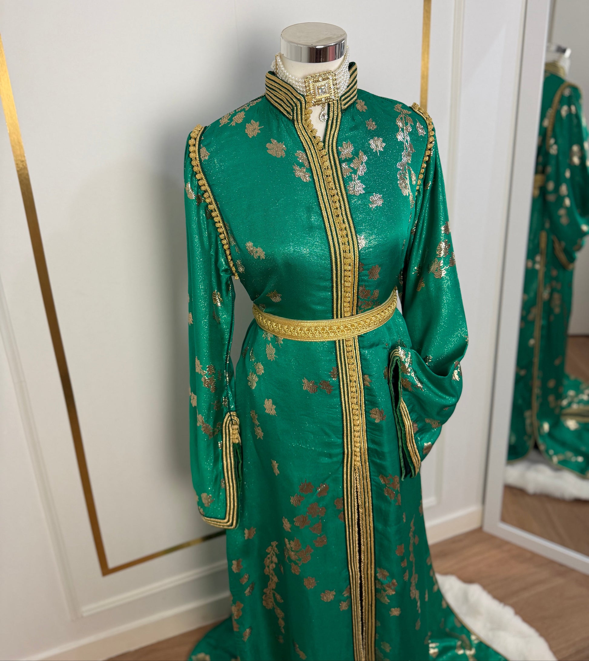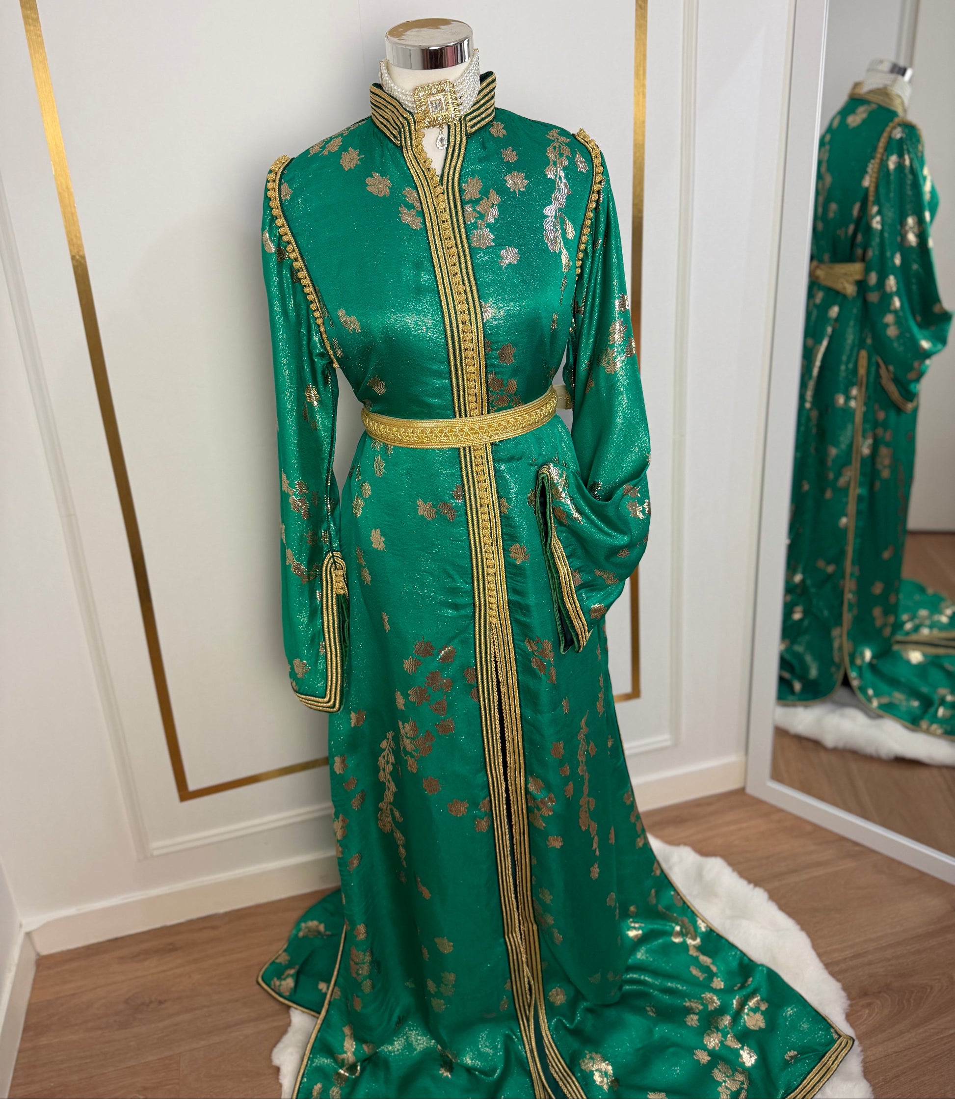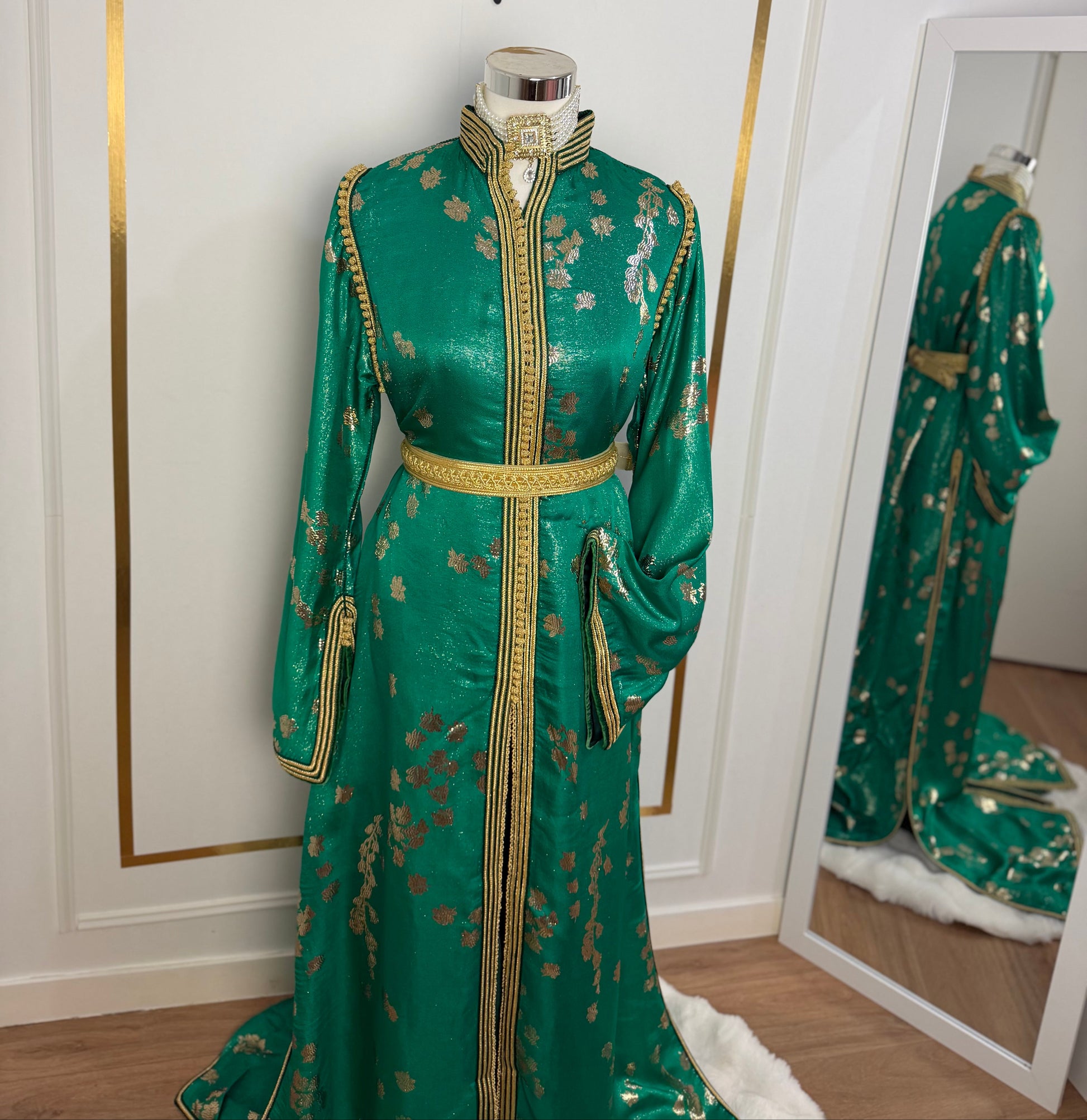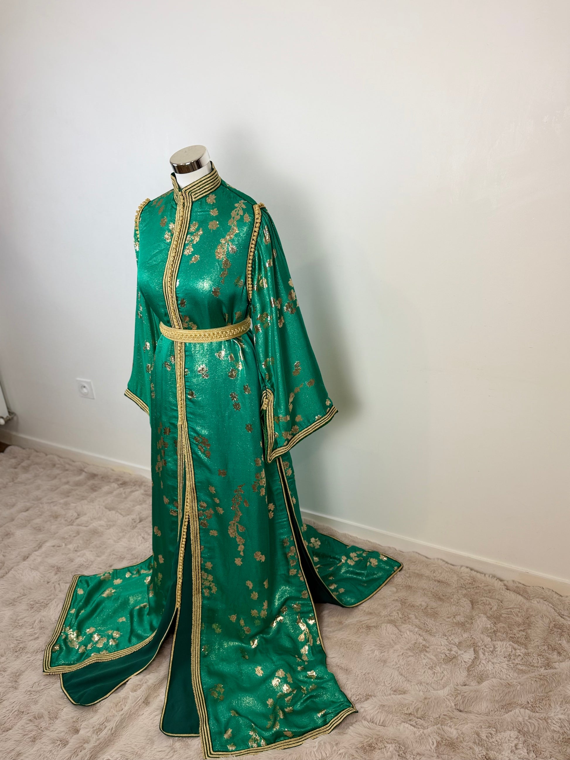 this caftan combines the charm of Moroccan craftsmanship with a contemporary touch,