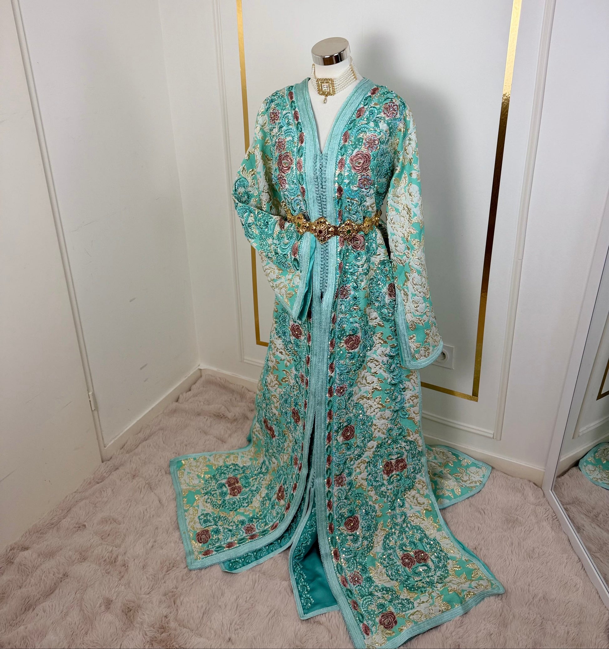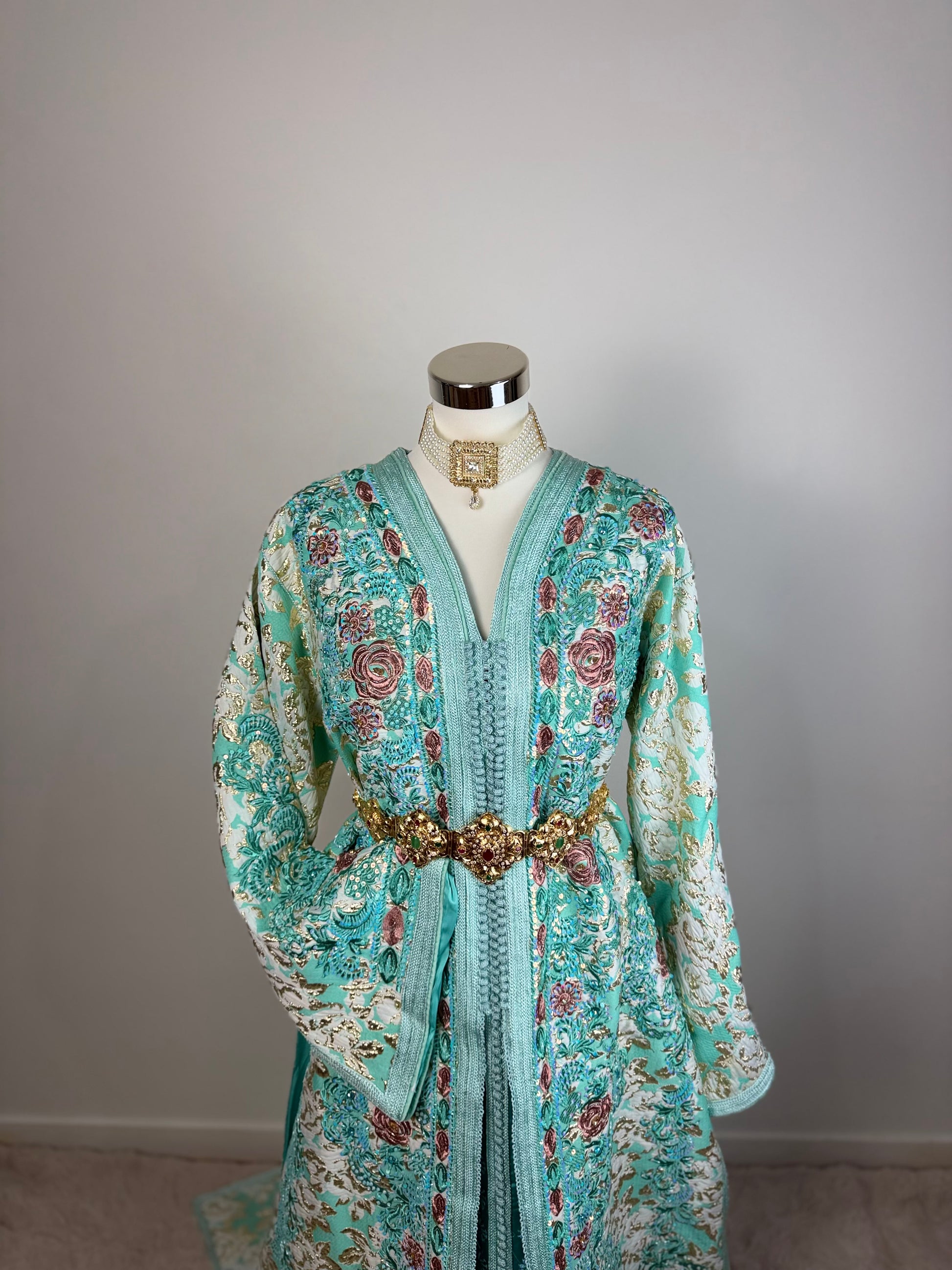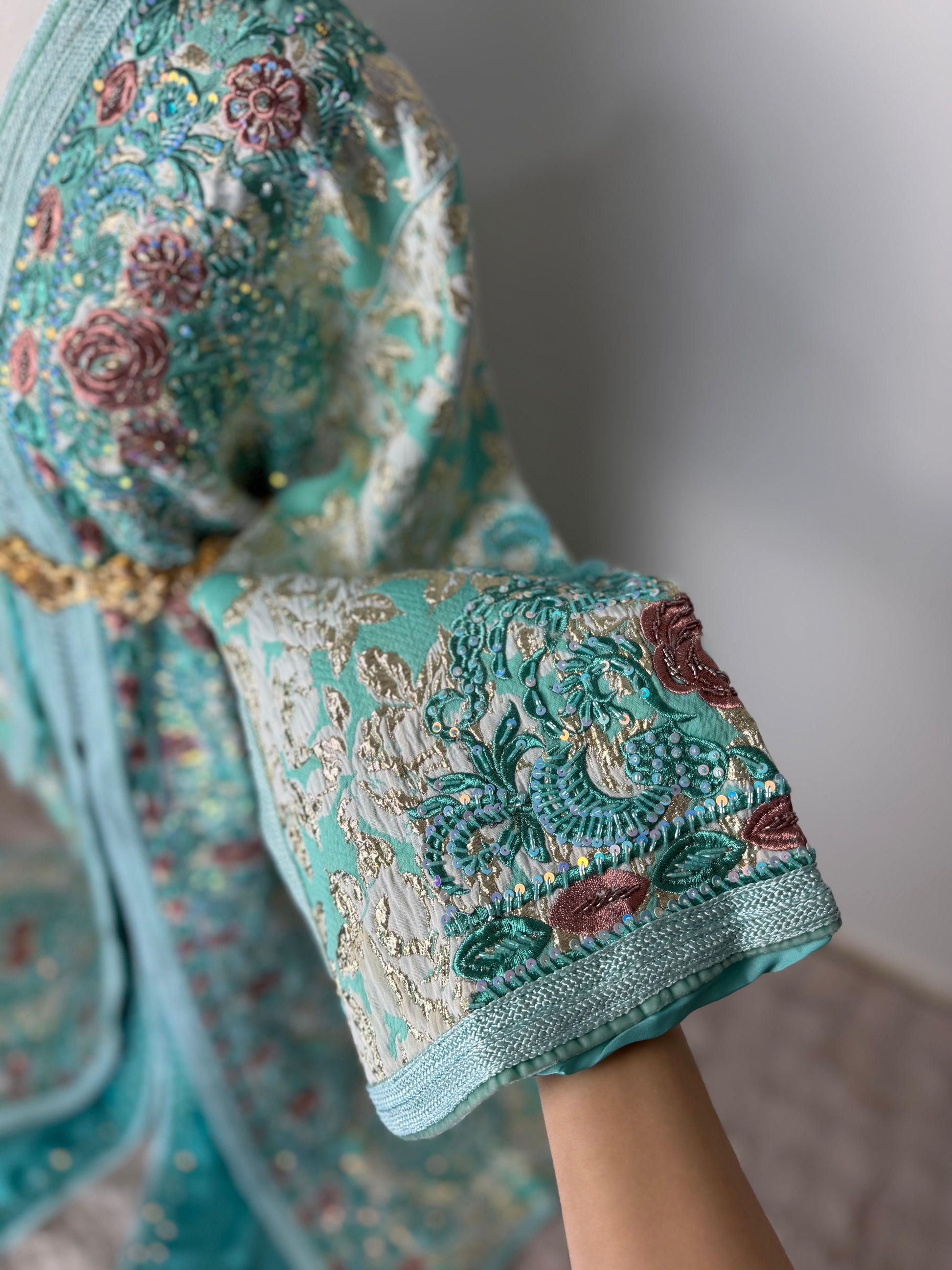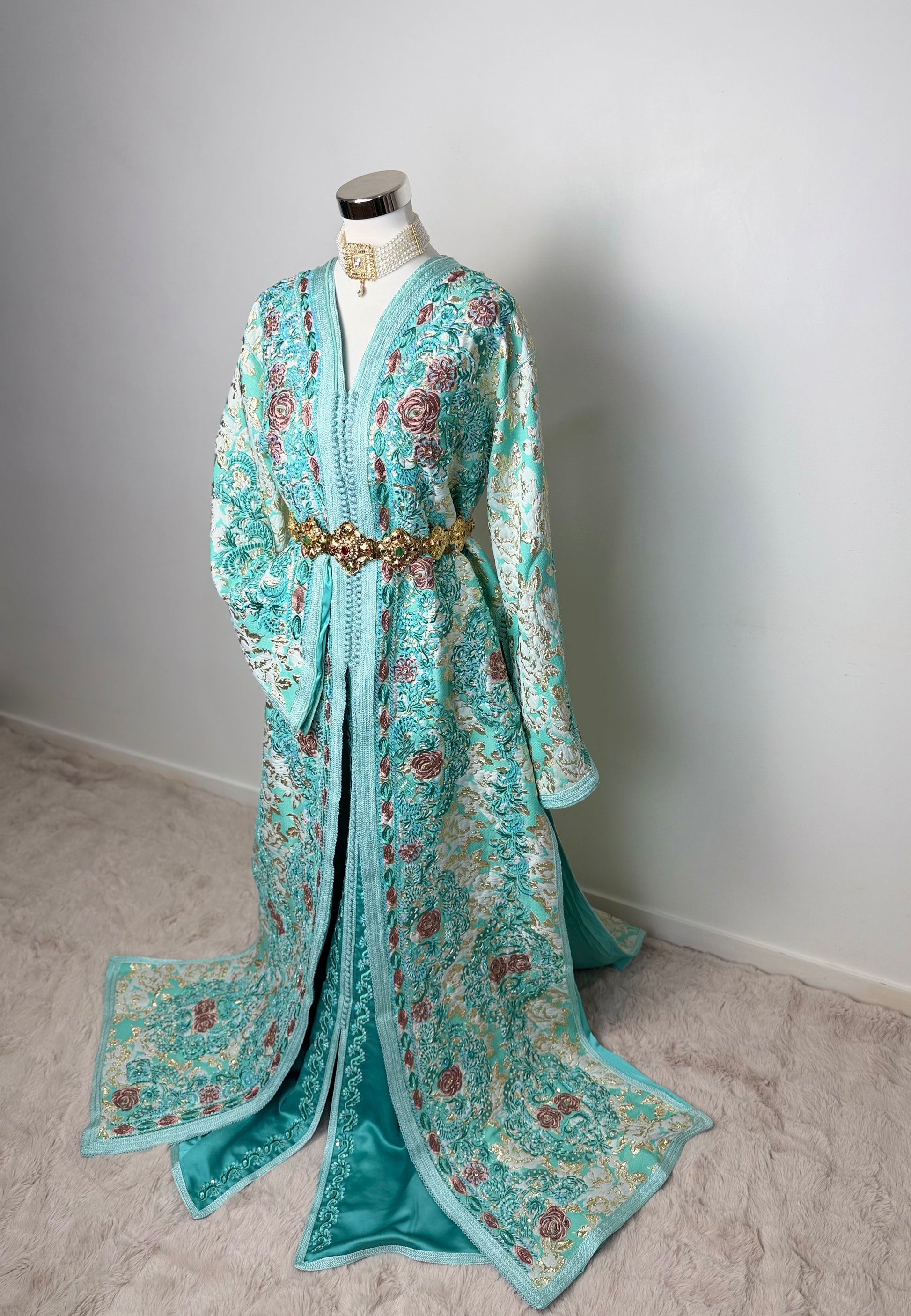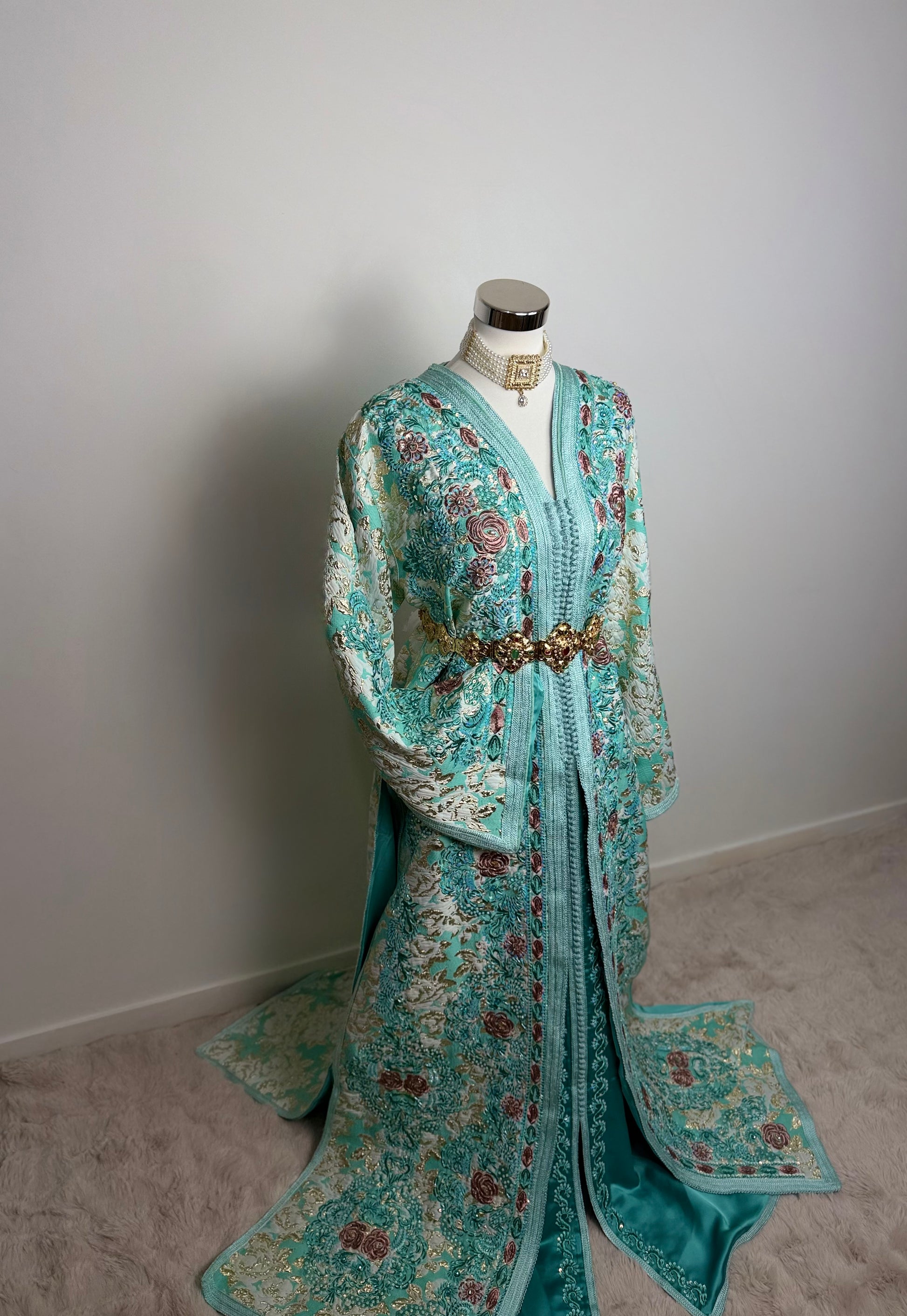 this caftan combines the charm of Moroccan craftsmanship with a contemporary touch,