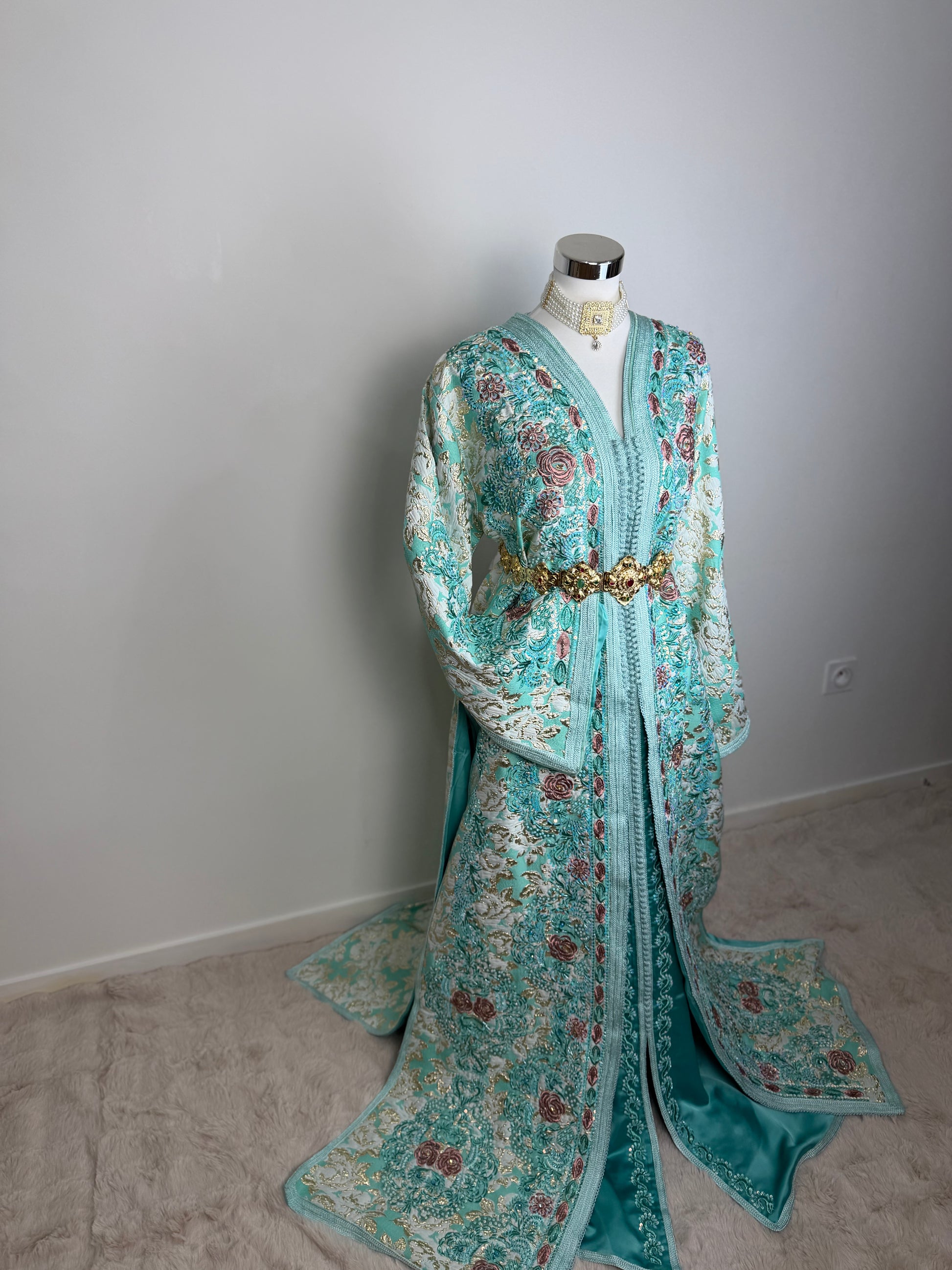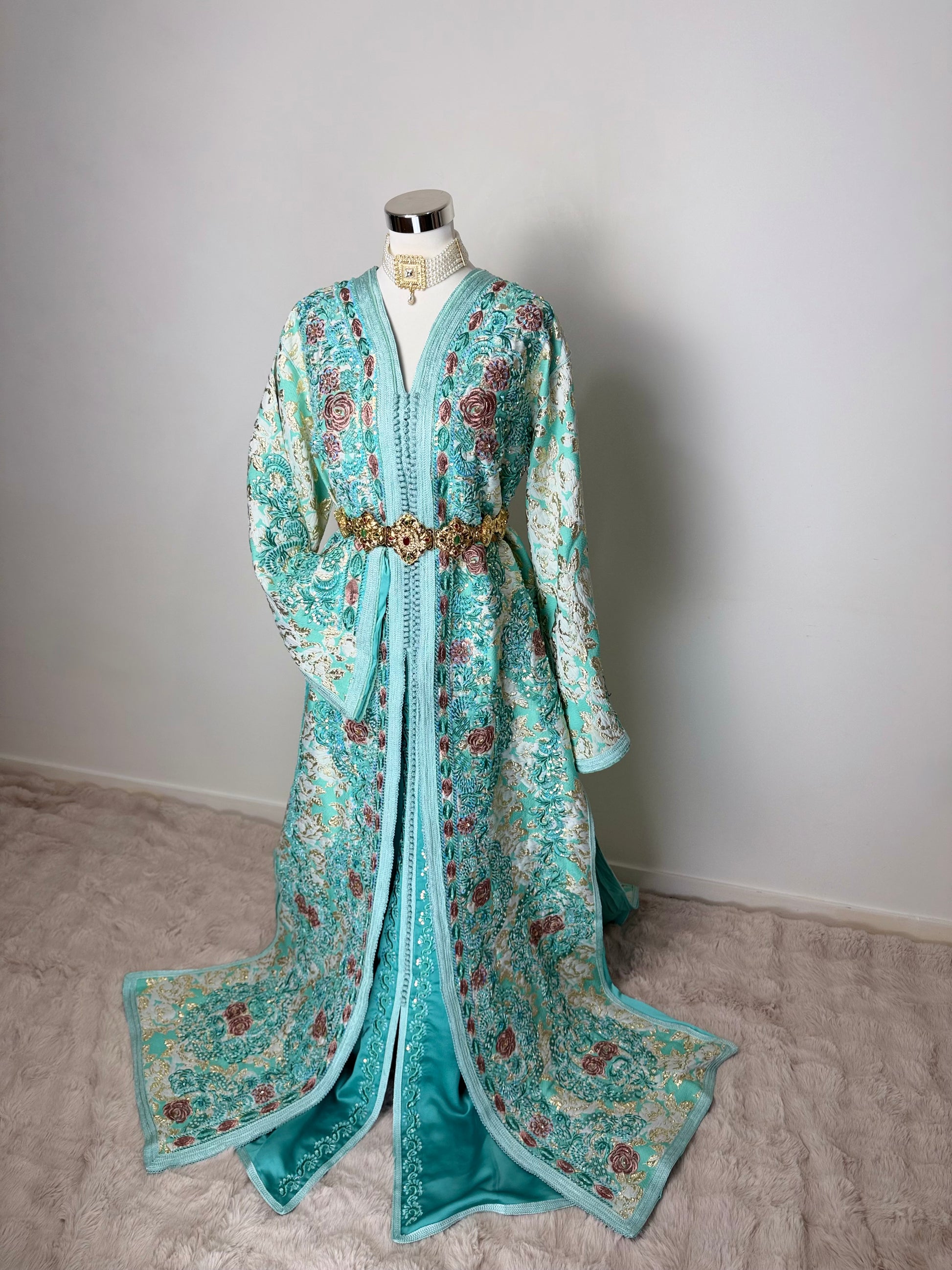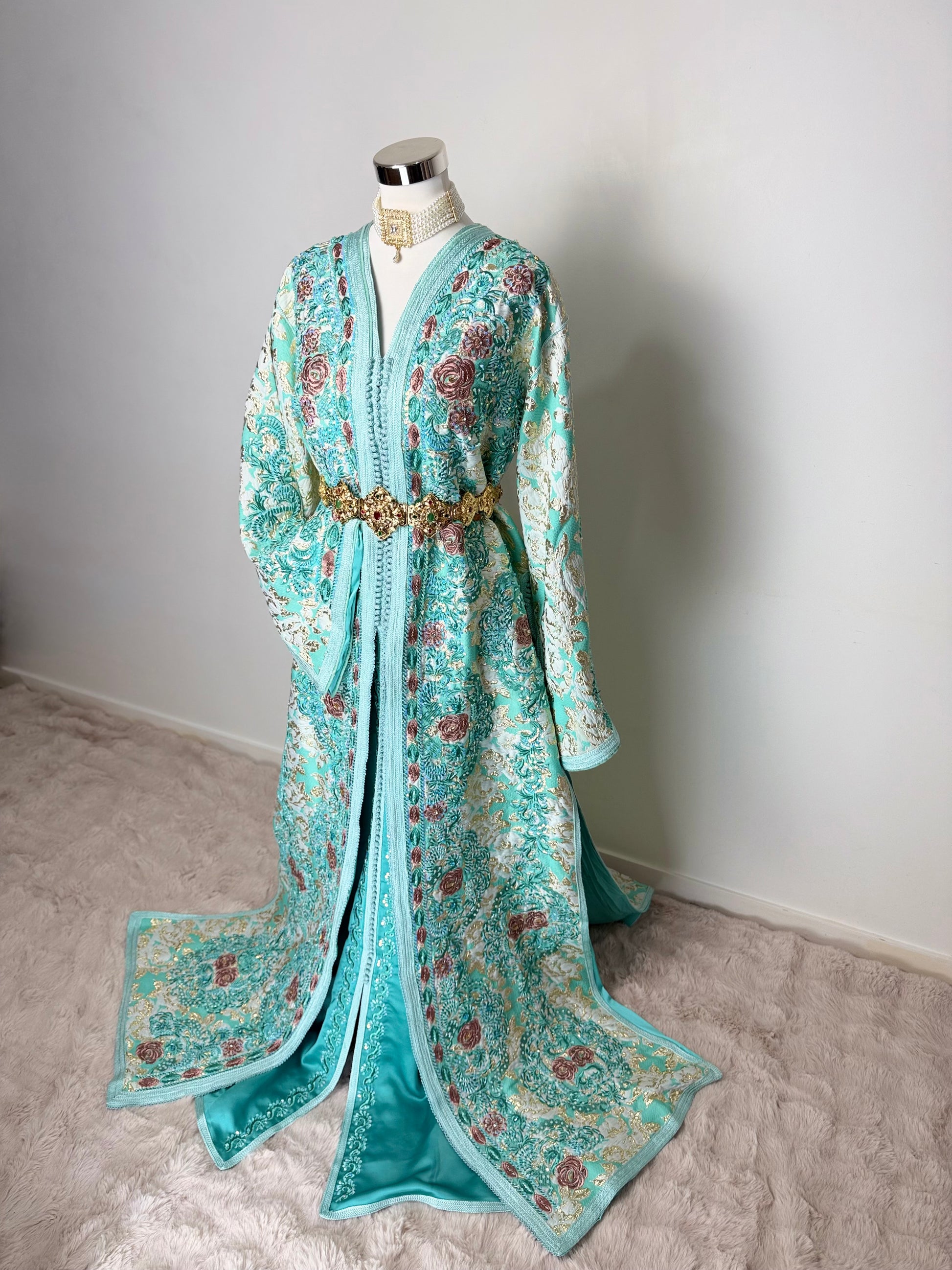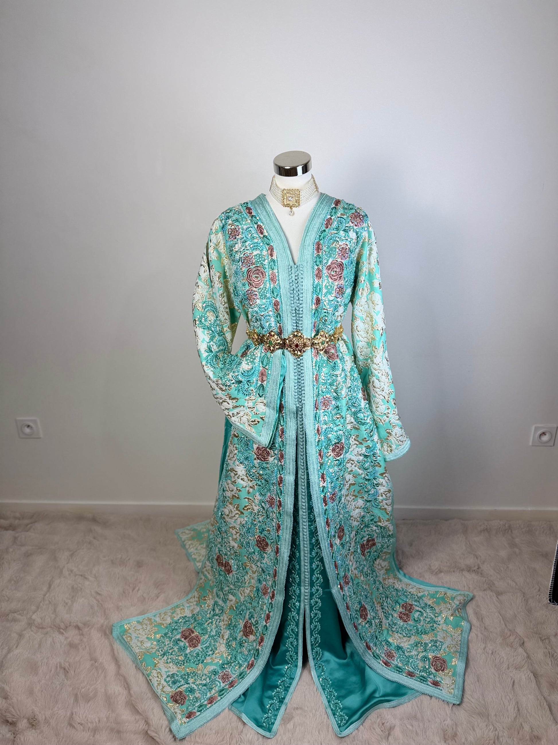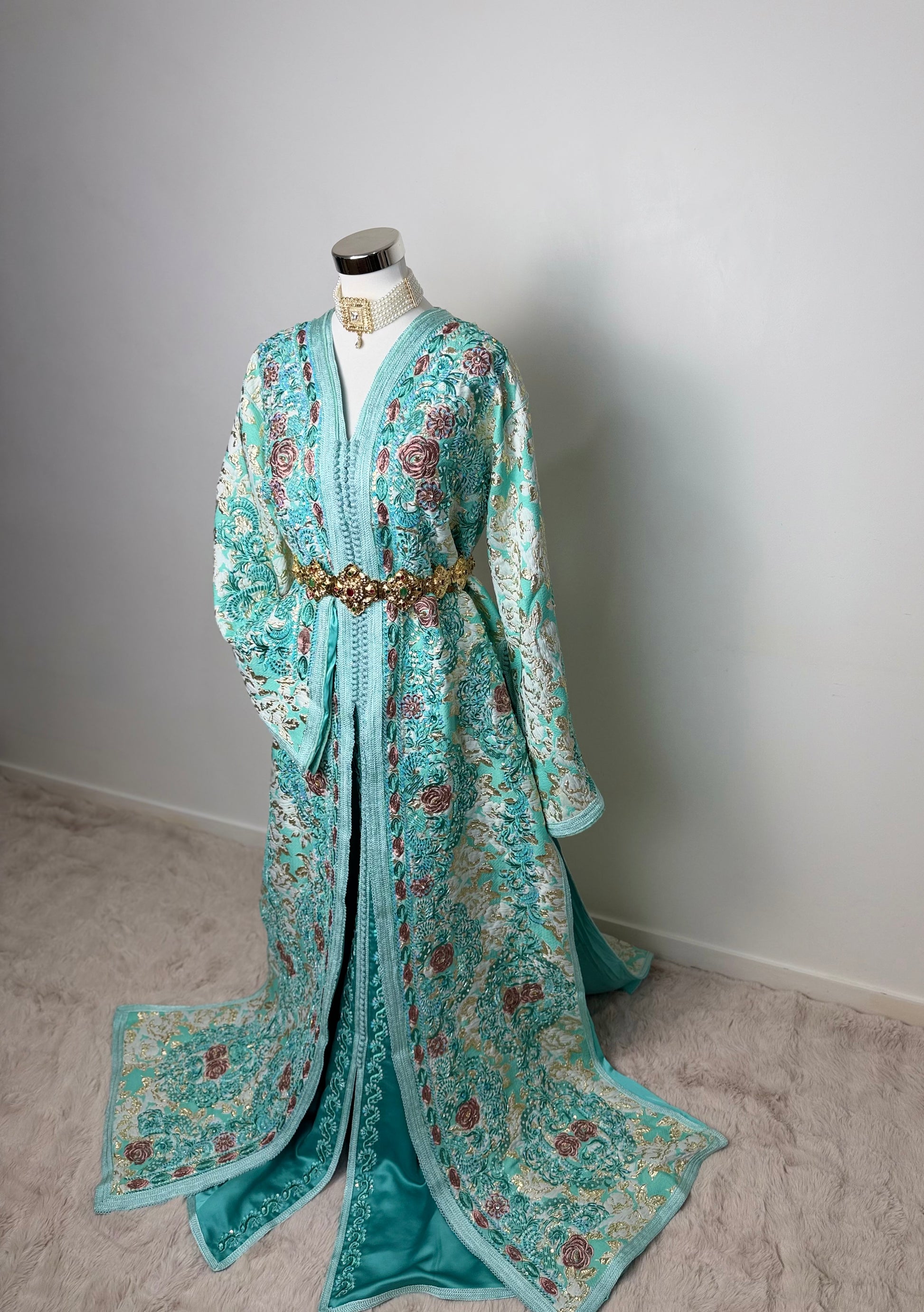 this caftan combines the charm of Moroccan craftsmanship with a contemporary touch,