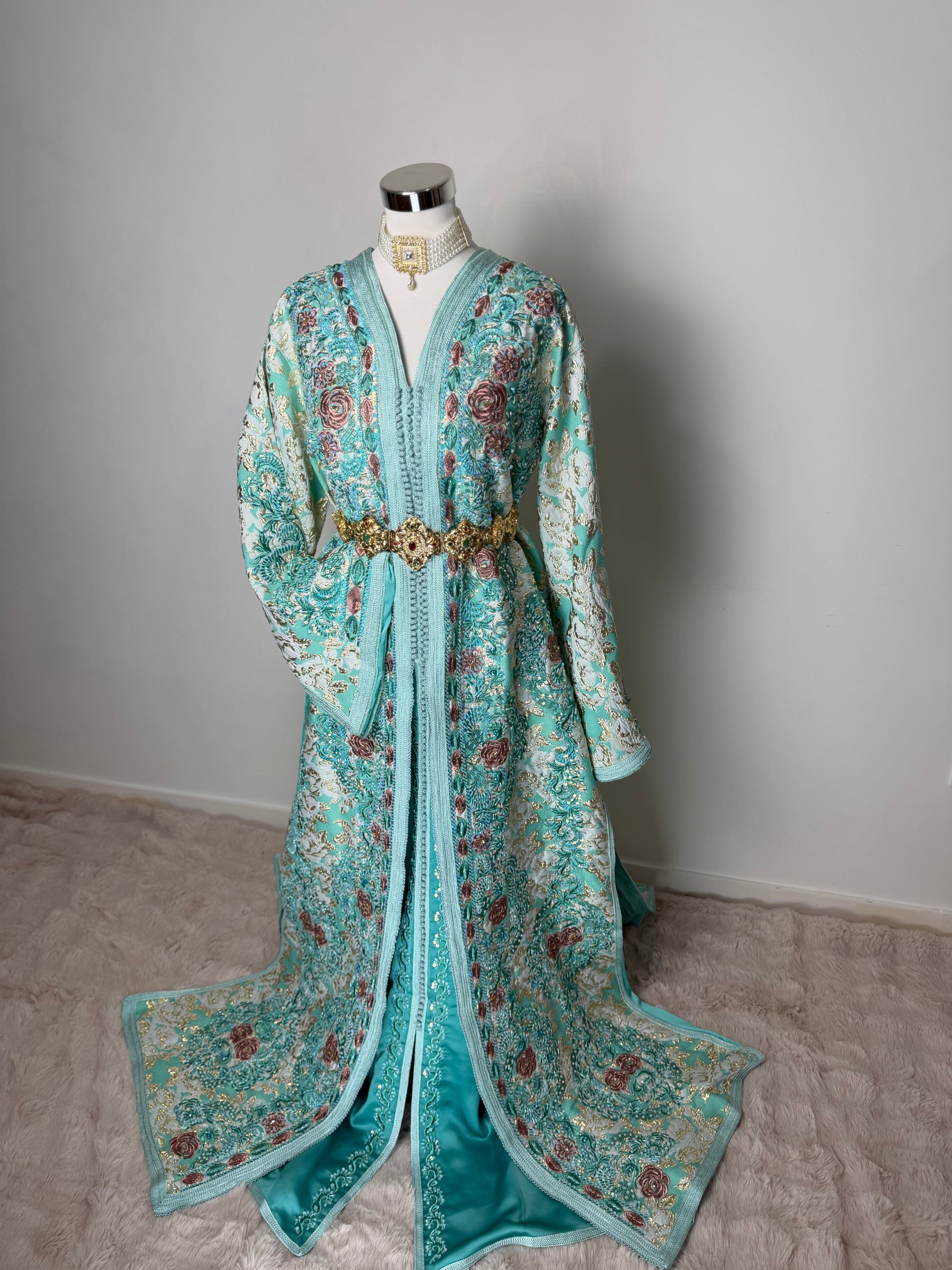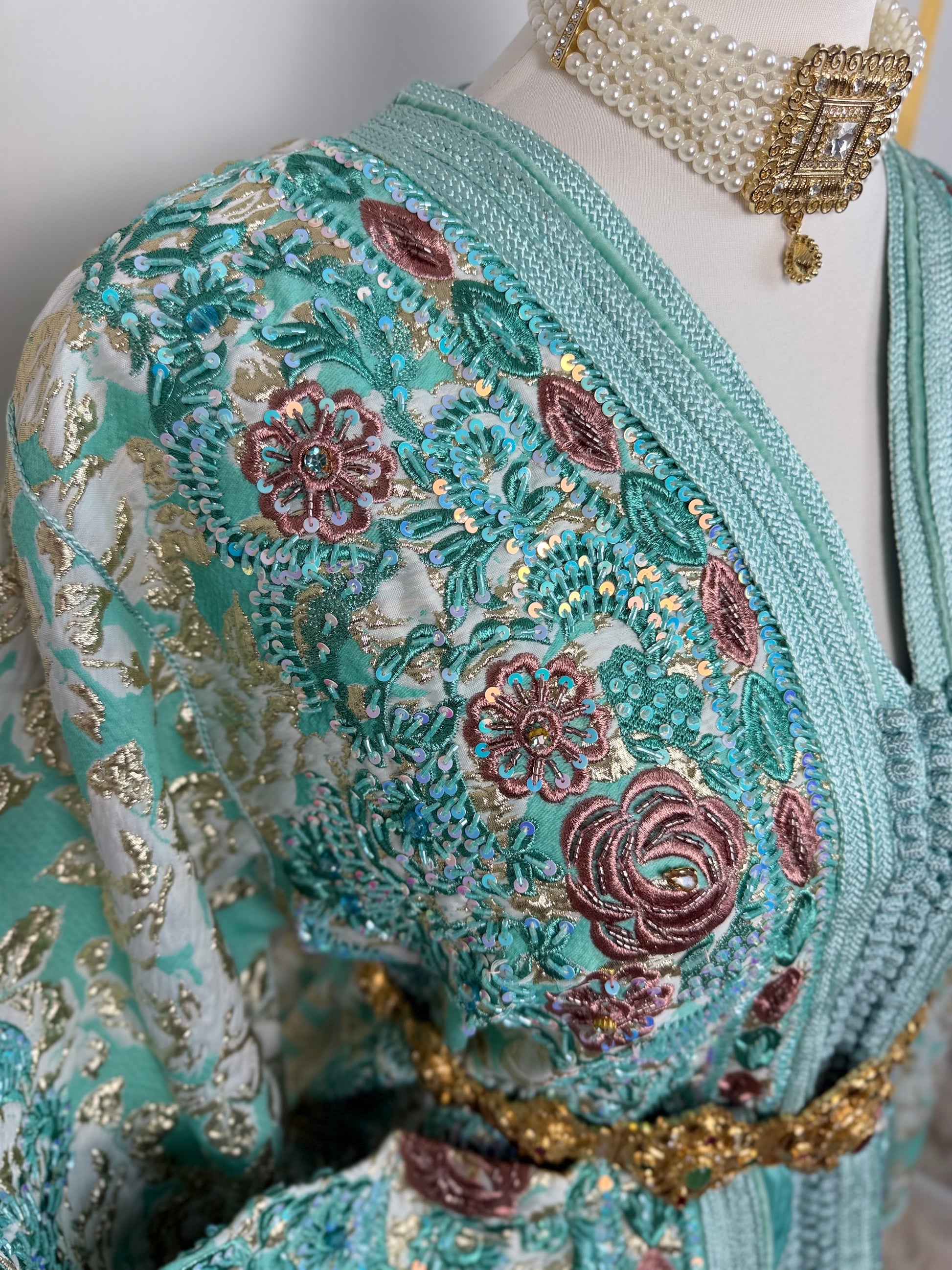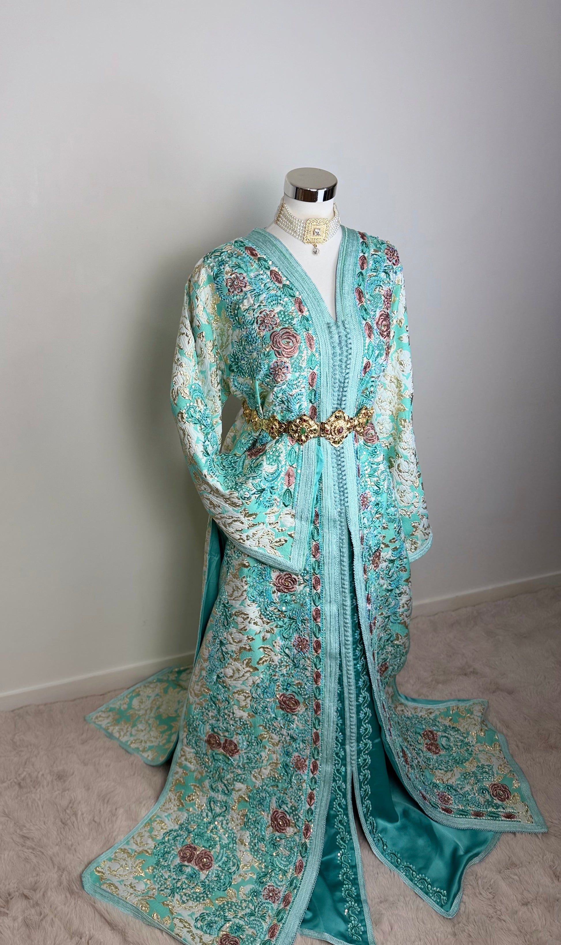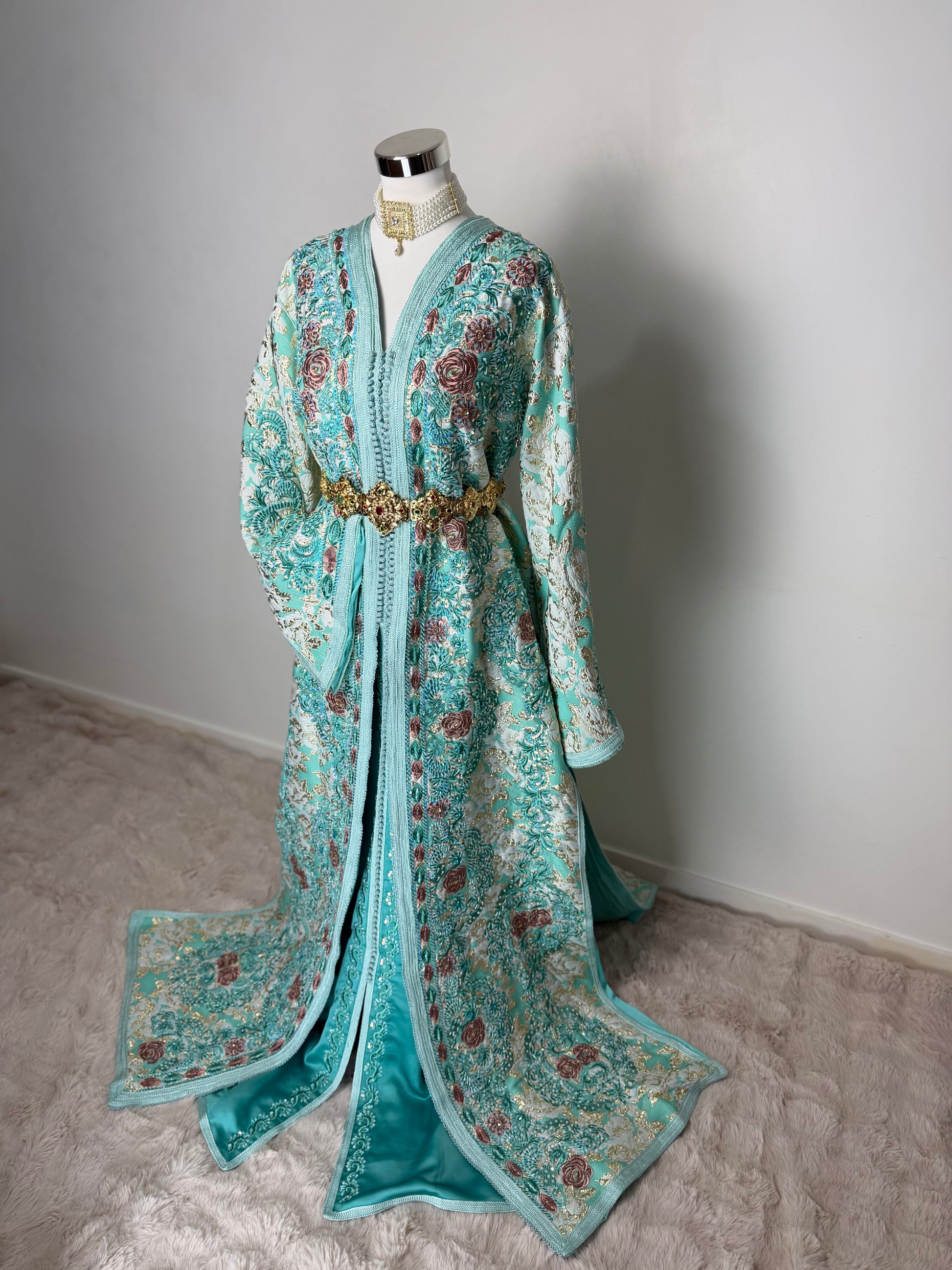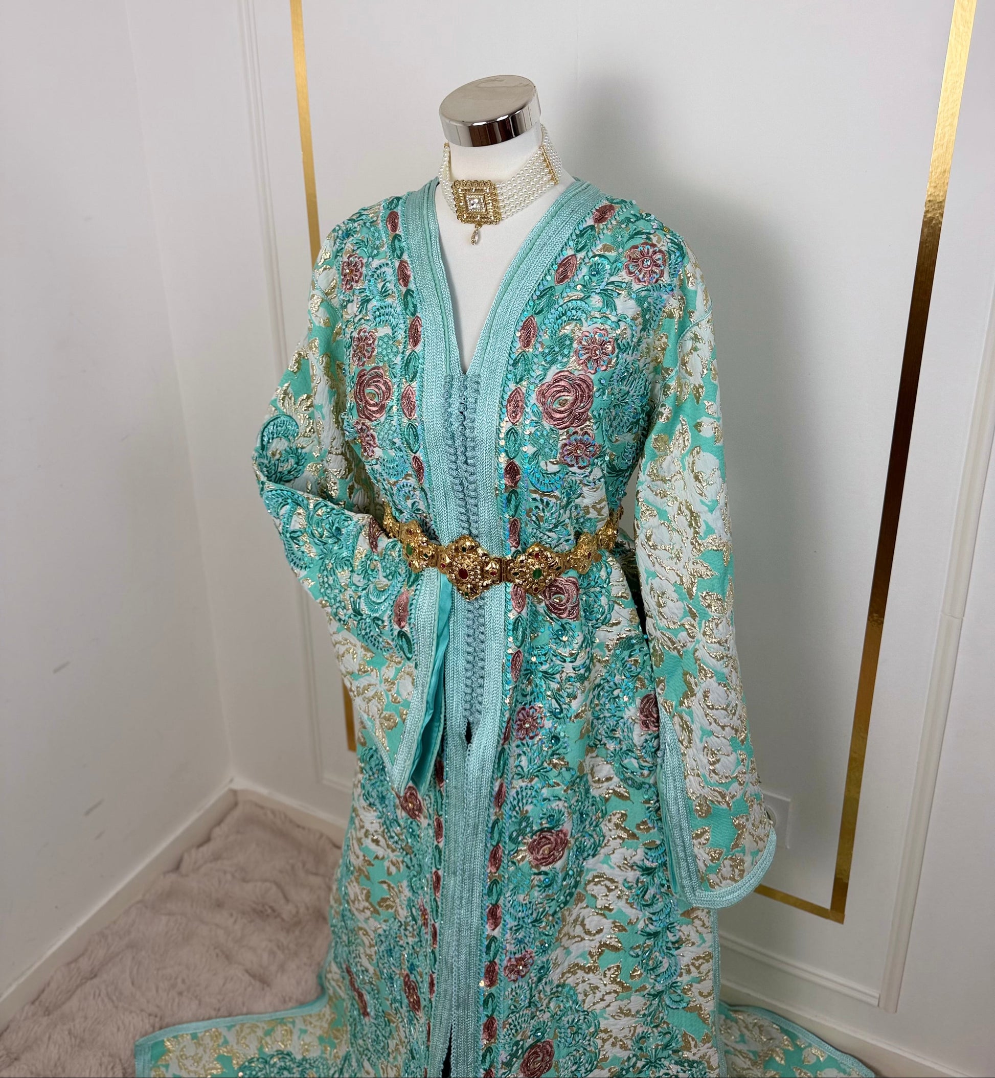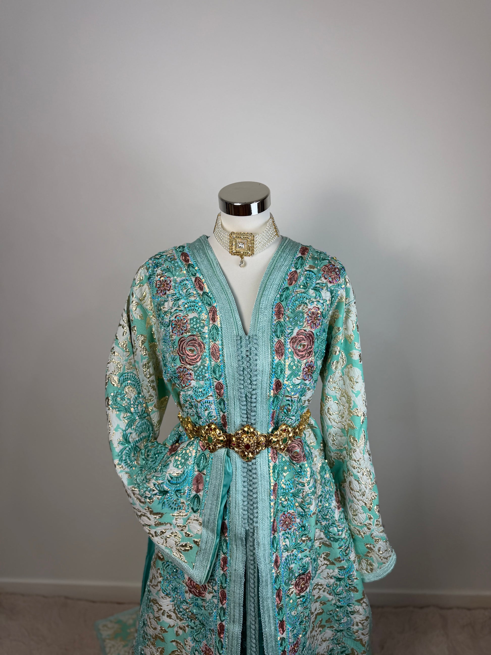 this caftan combines the charm of Moroccan craftsmanship with a contemporary touch,