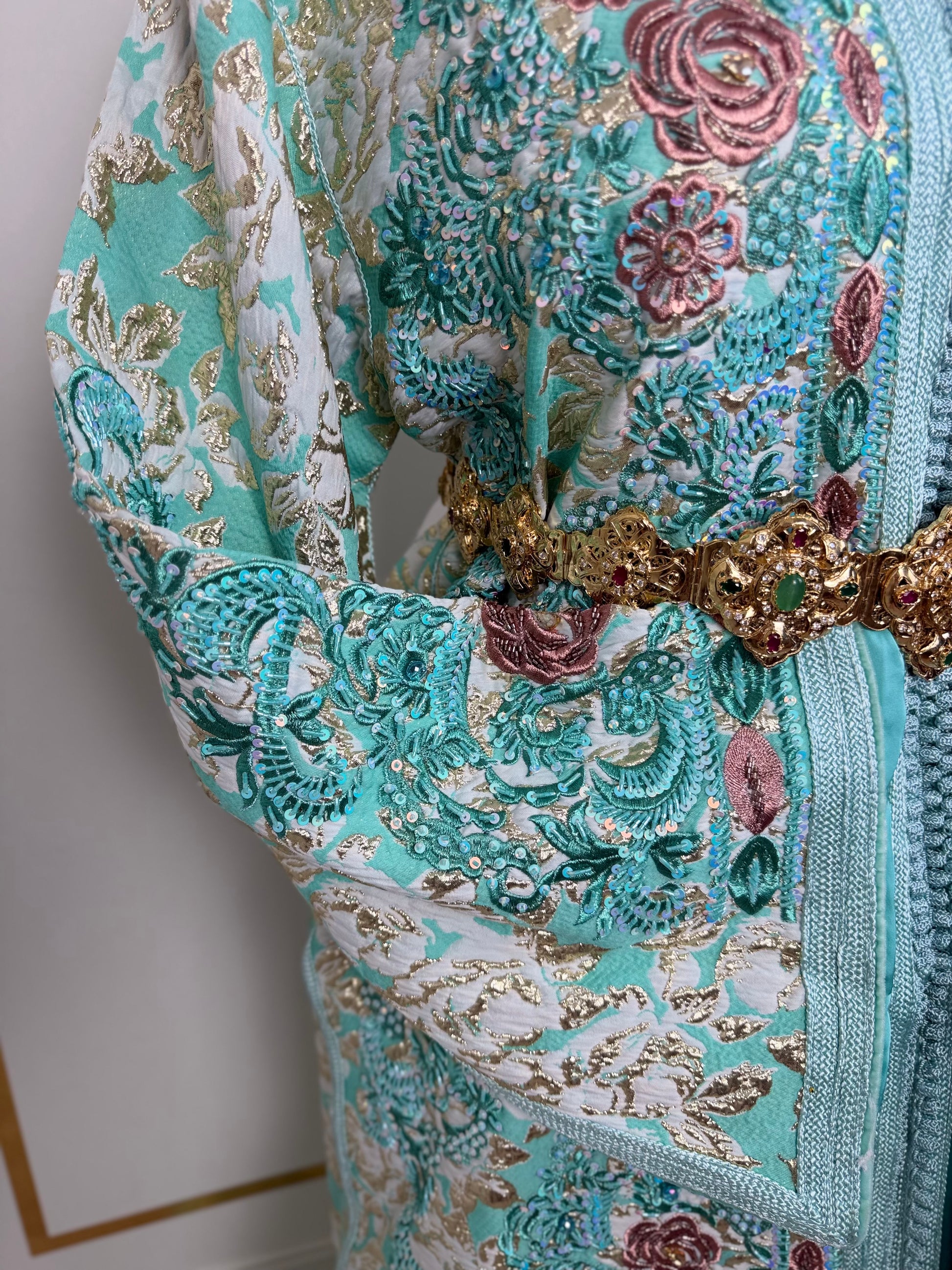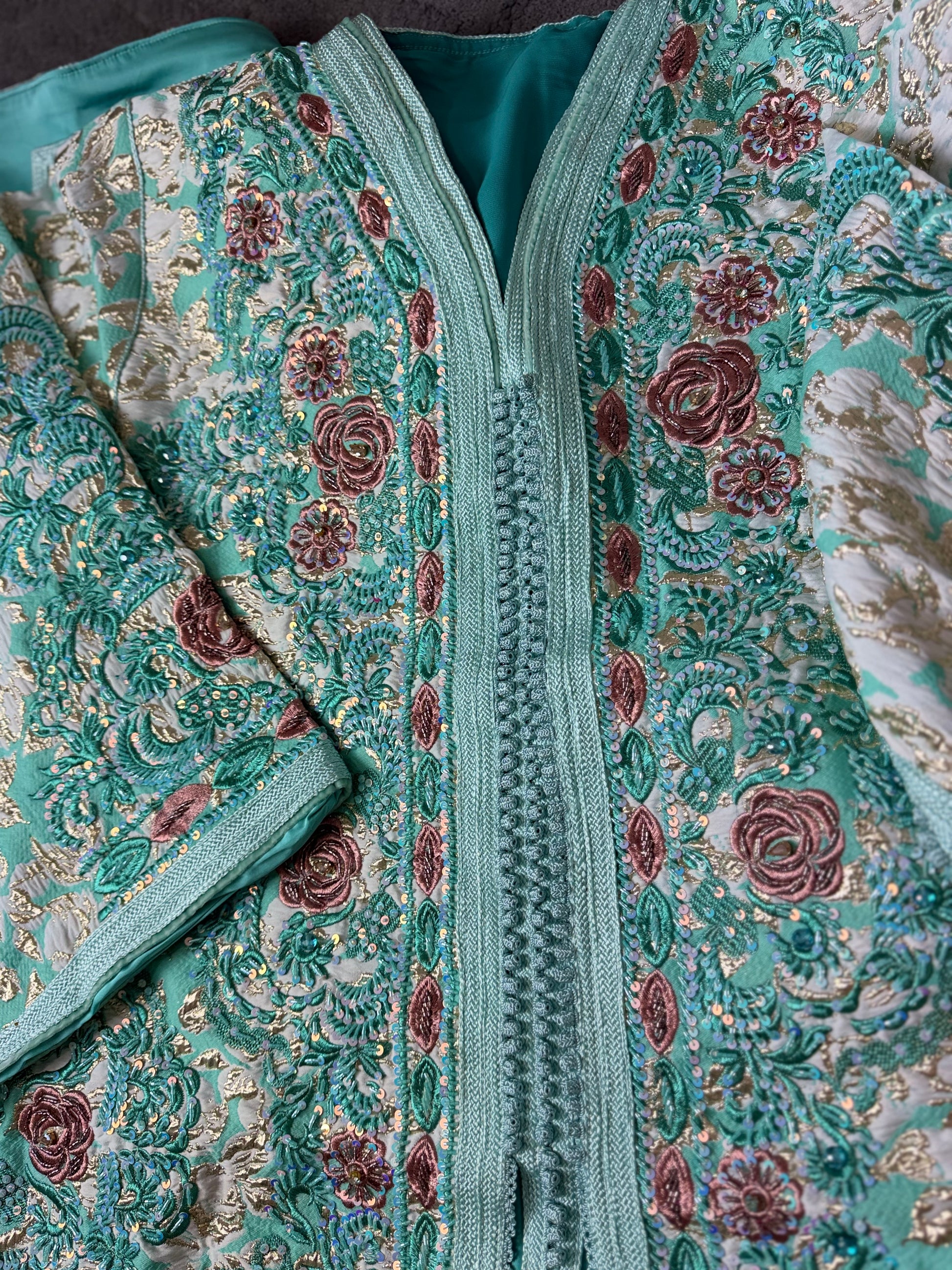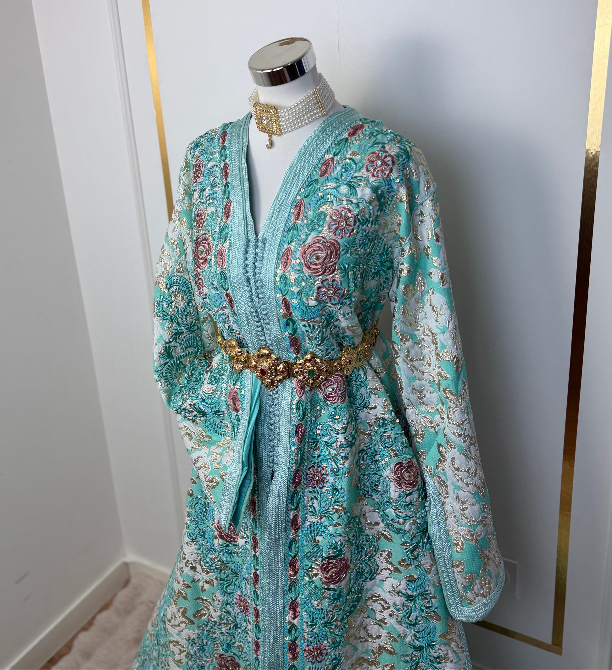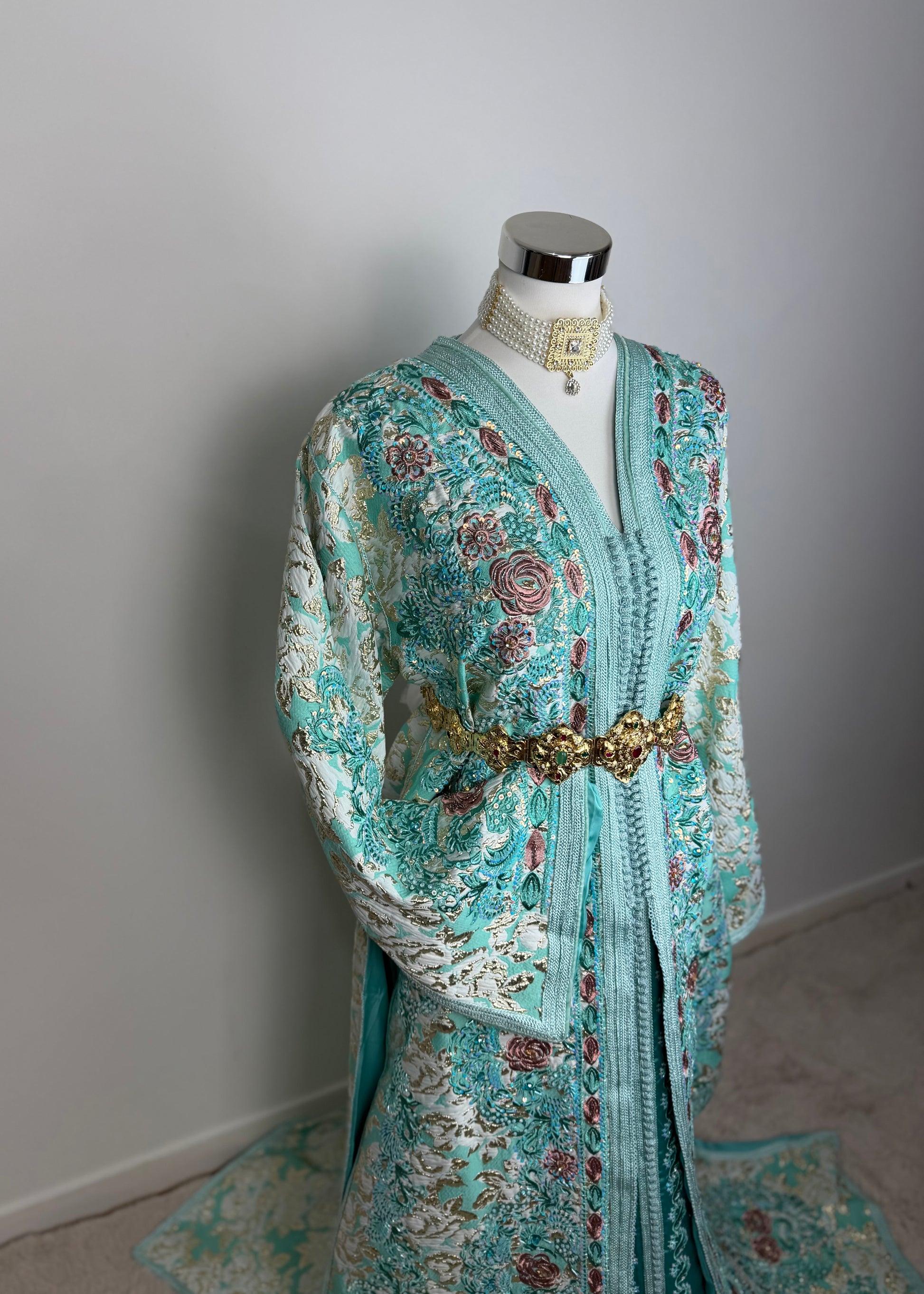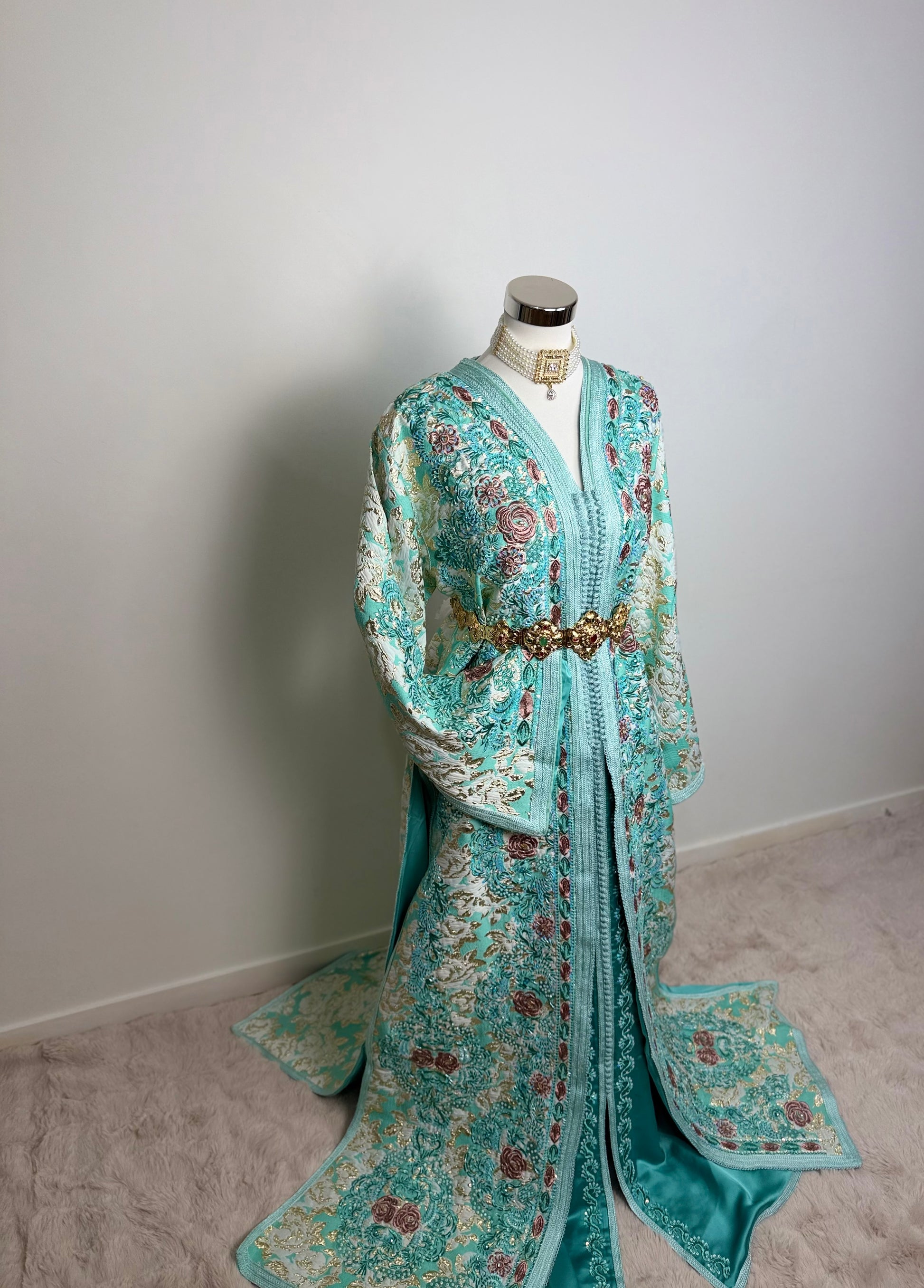 this caftan combines the charm of Moroccan craftsmanship with a contemporary touch,