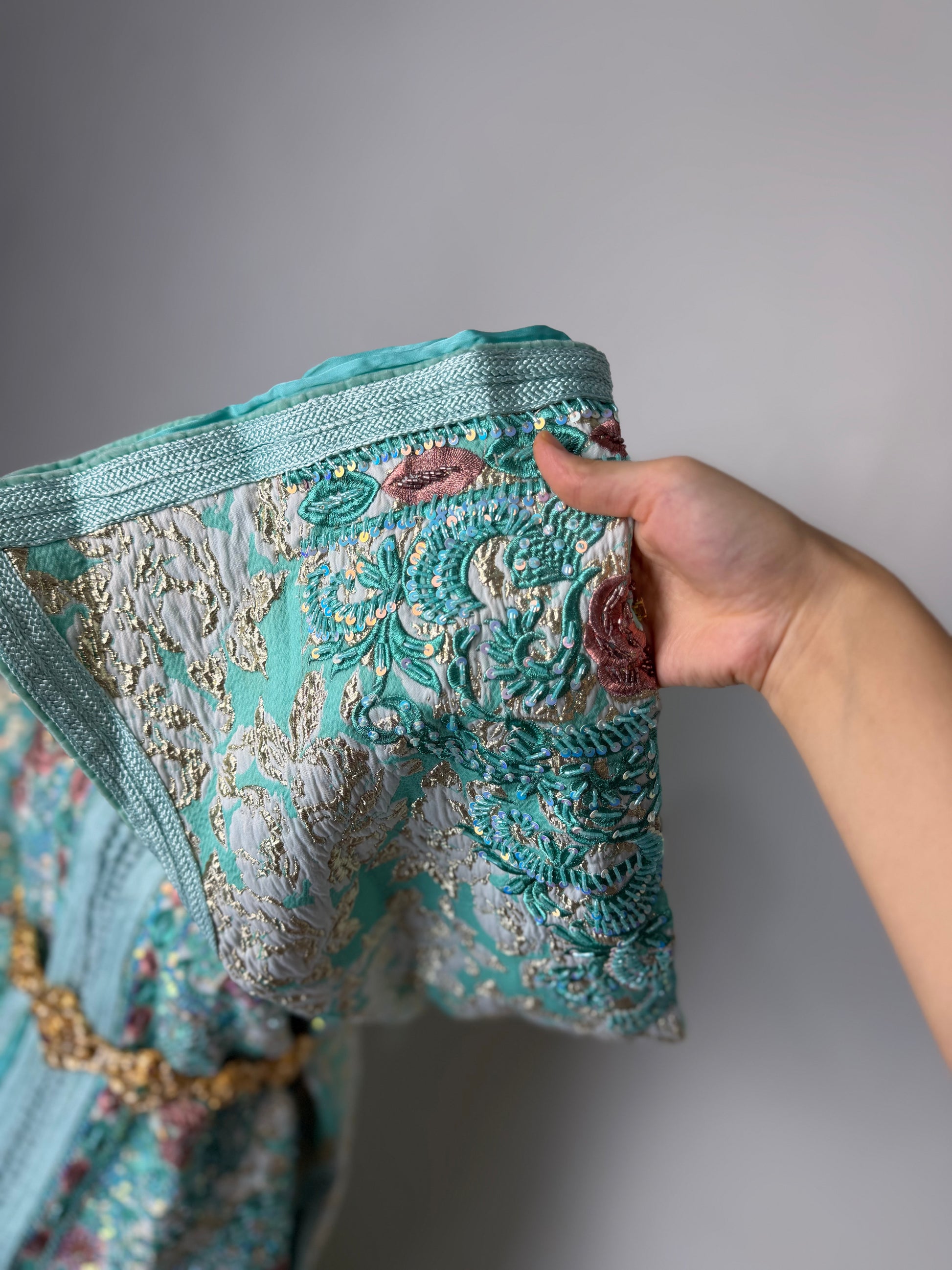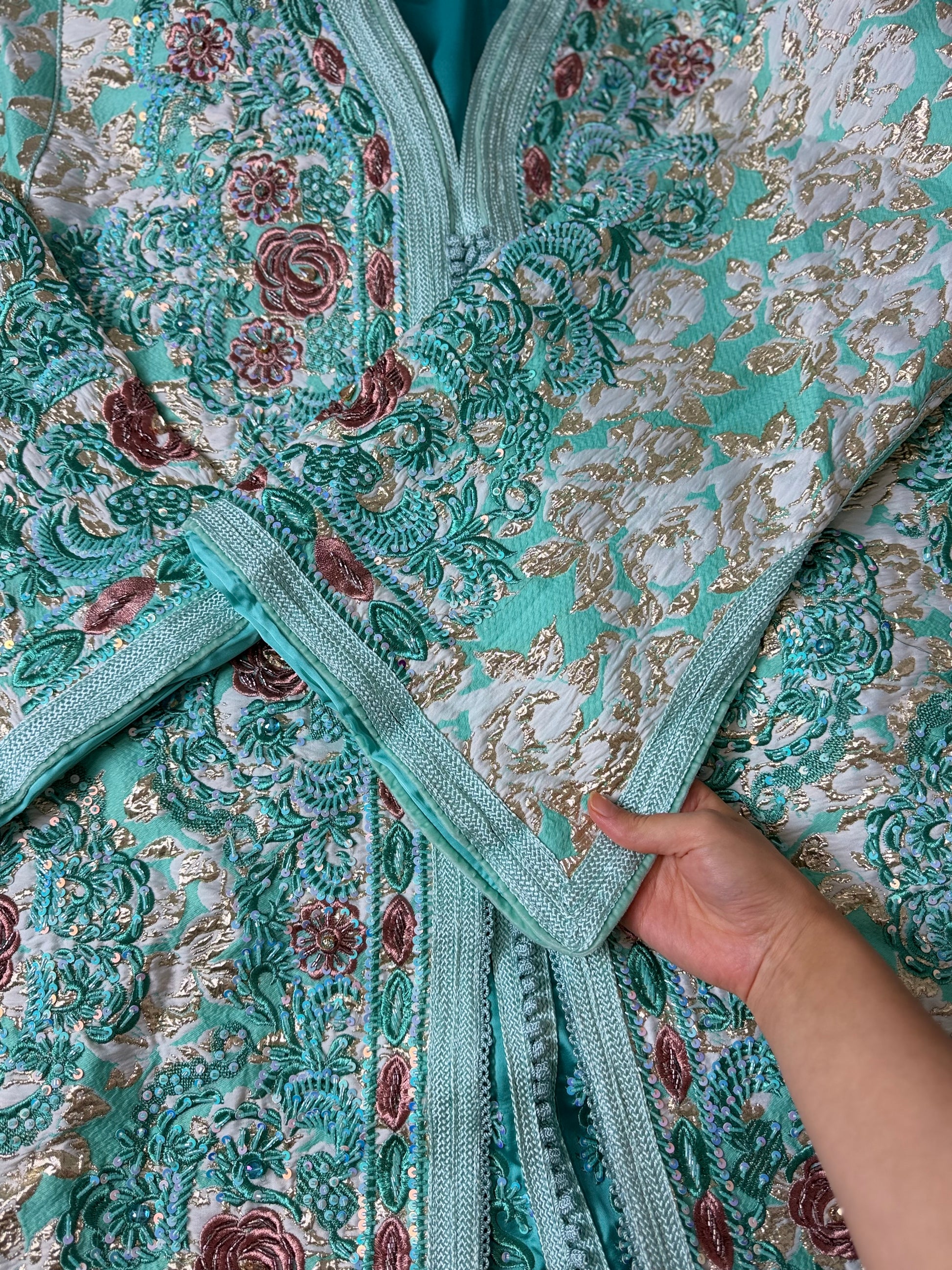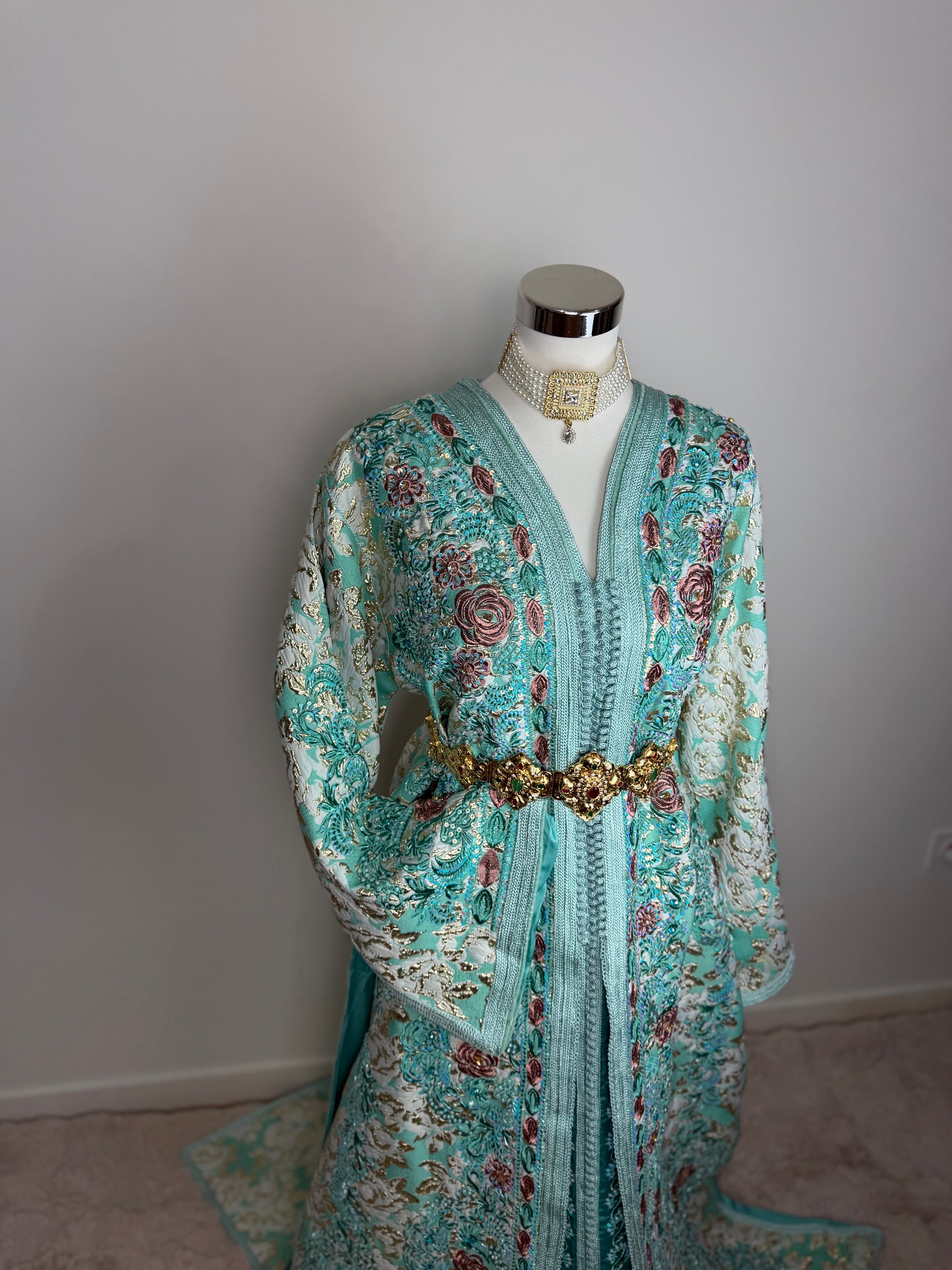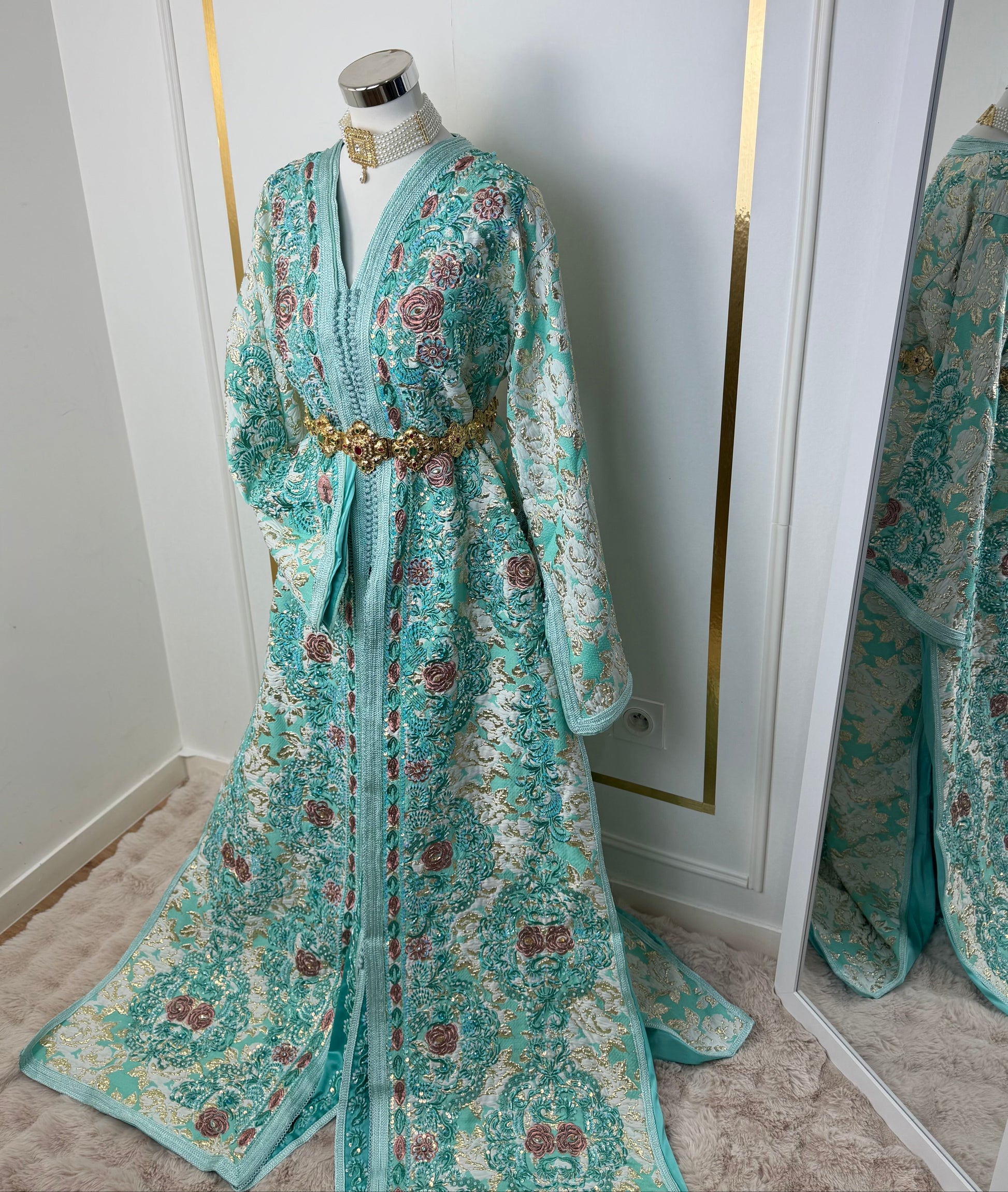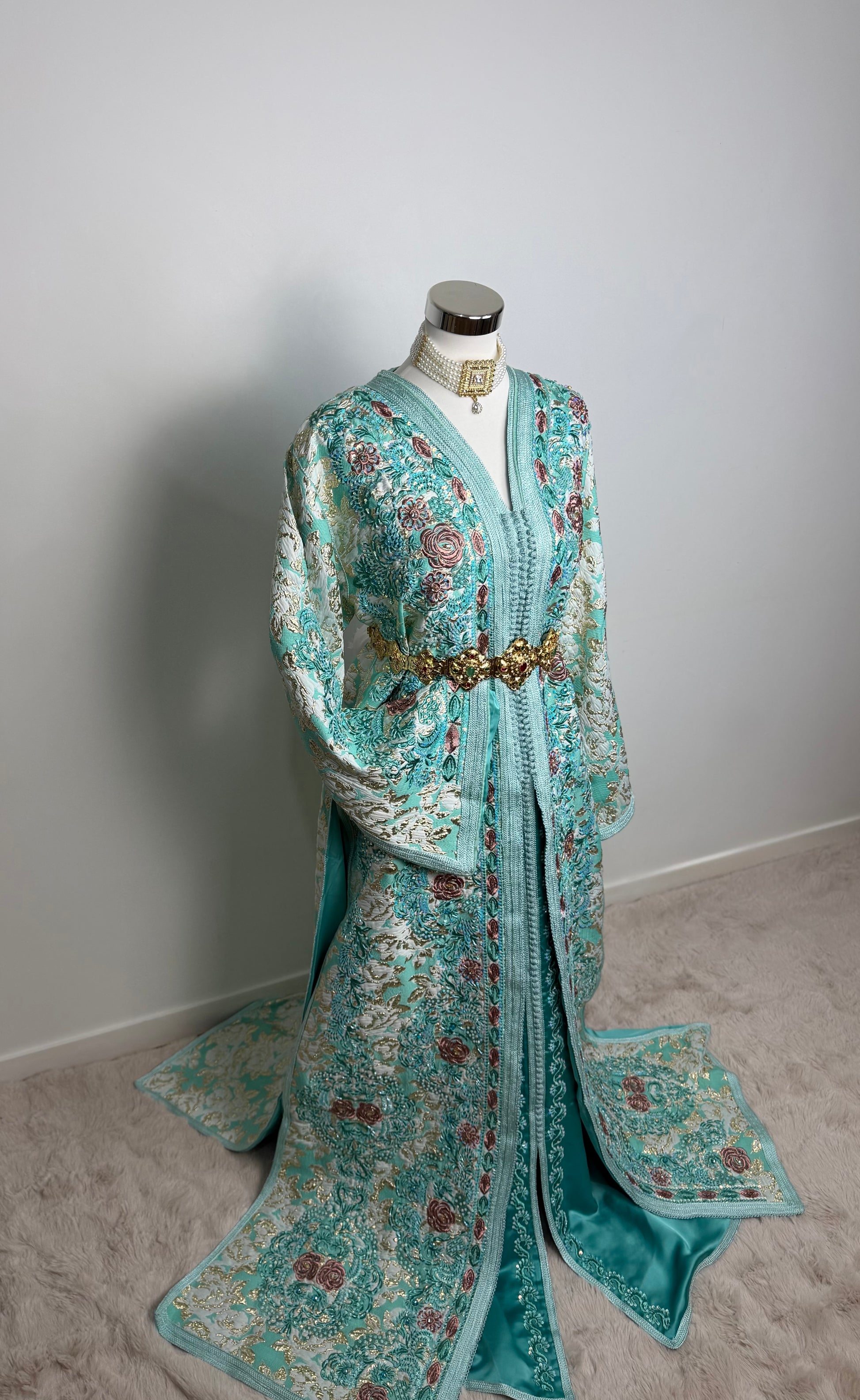 this caftan combines the charm of Moroccan craftsmanship with a contemporary touch,