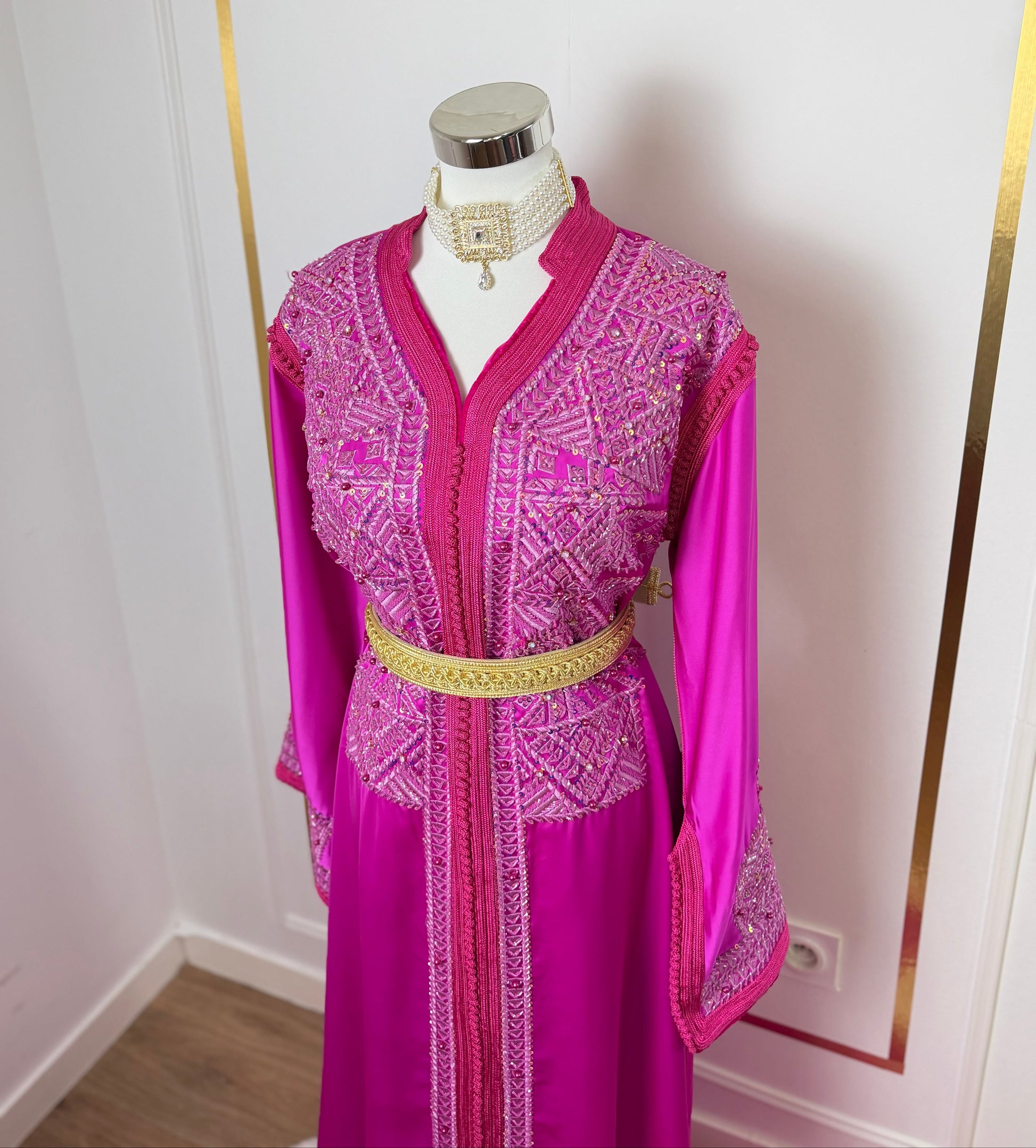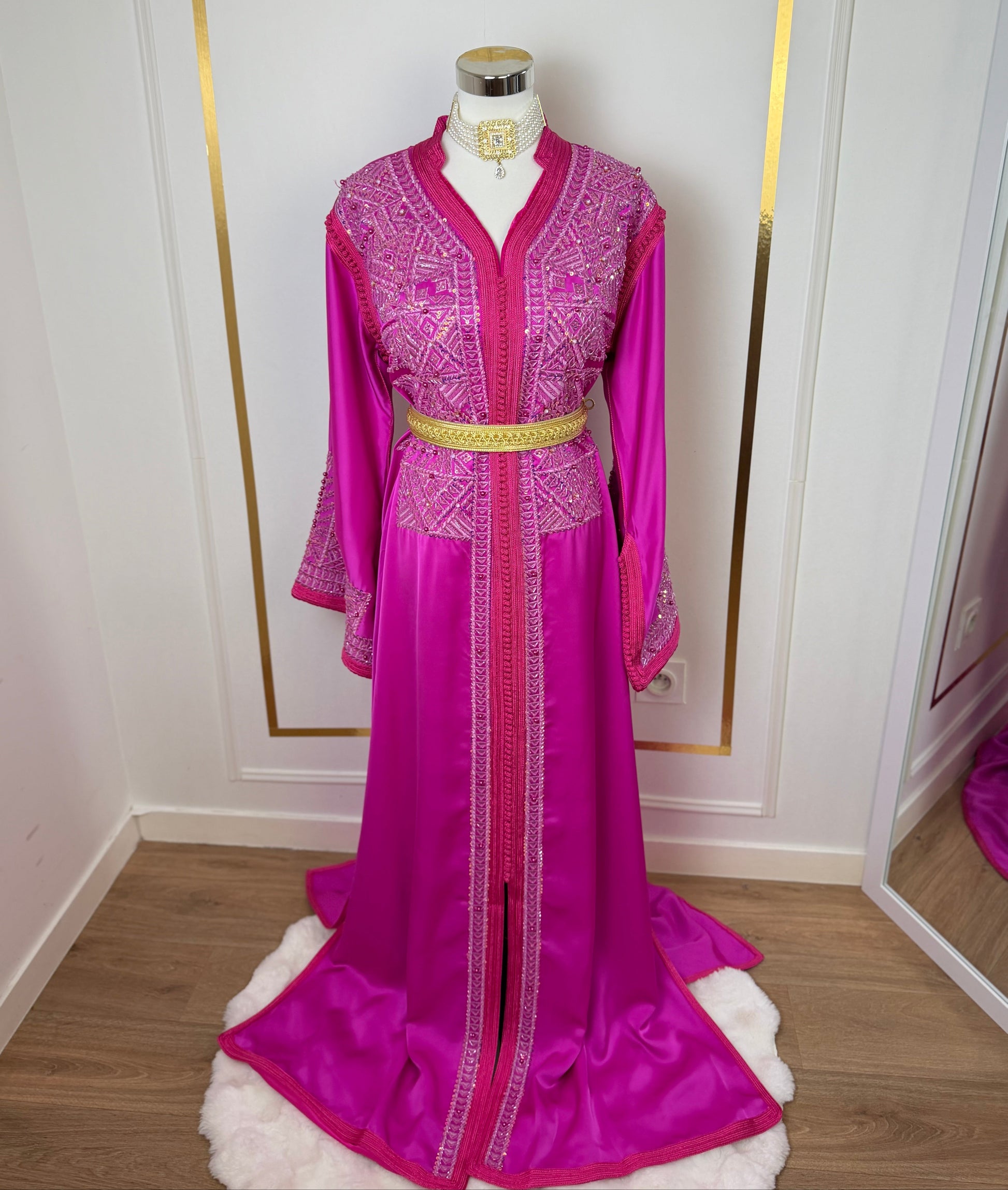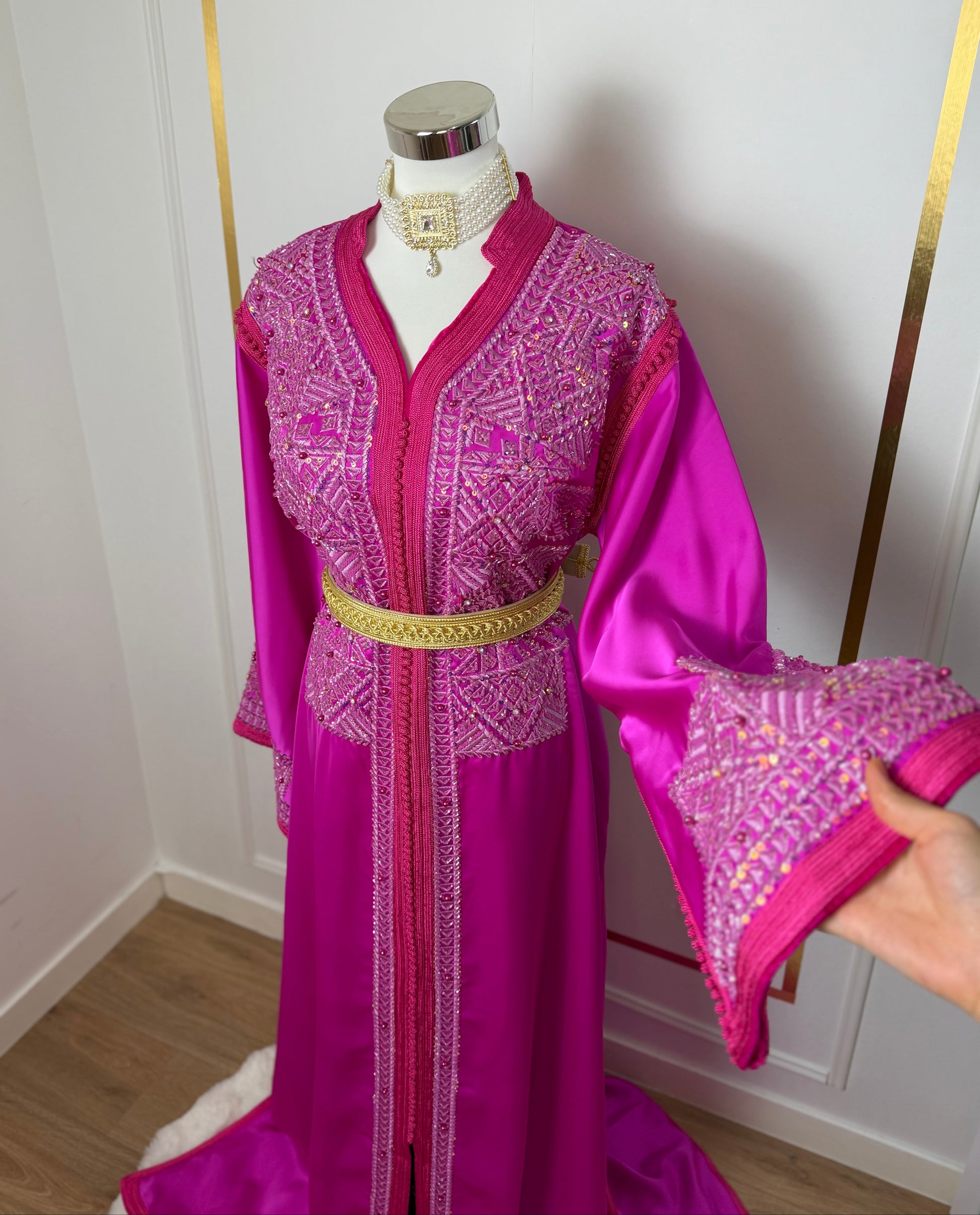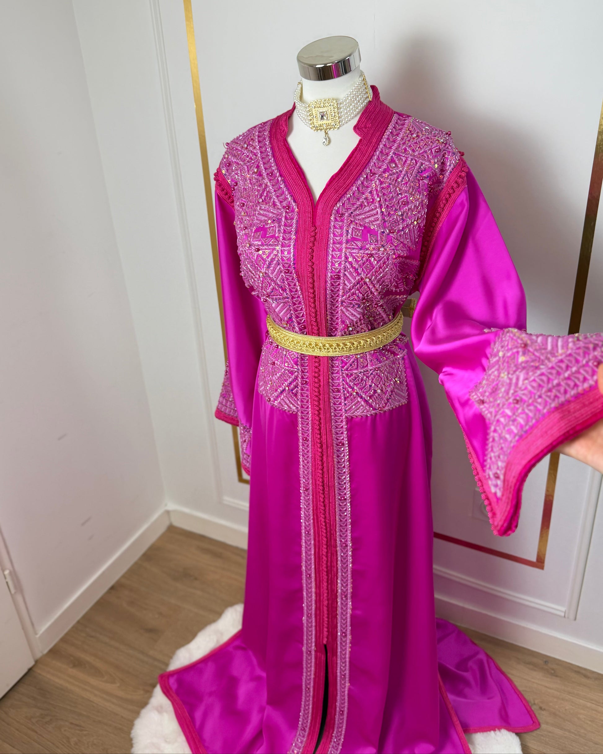 this caftan combines the charm of Moroccan craftsmanship with a contemporary touch,