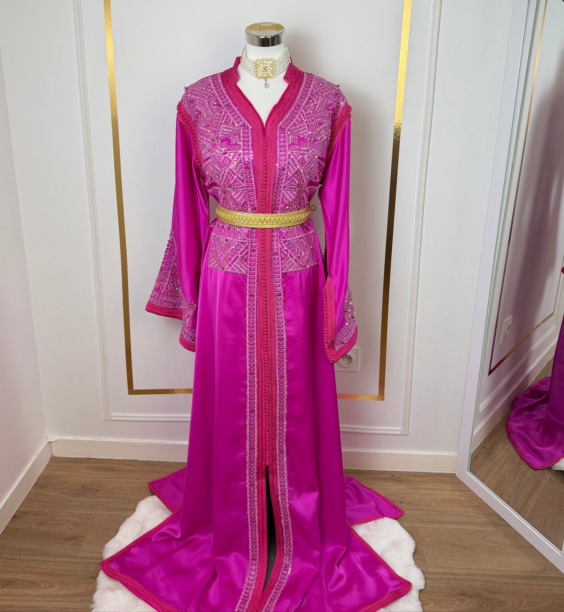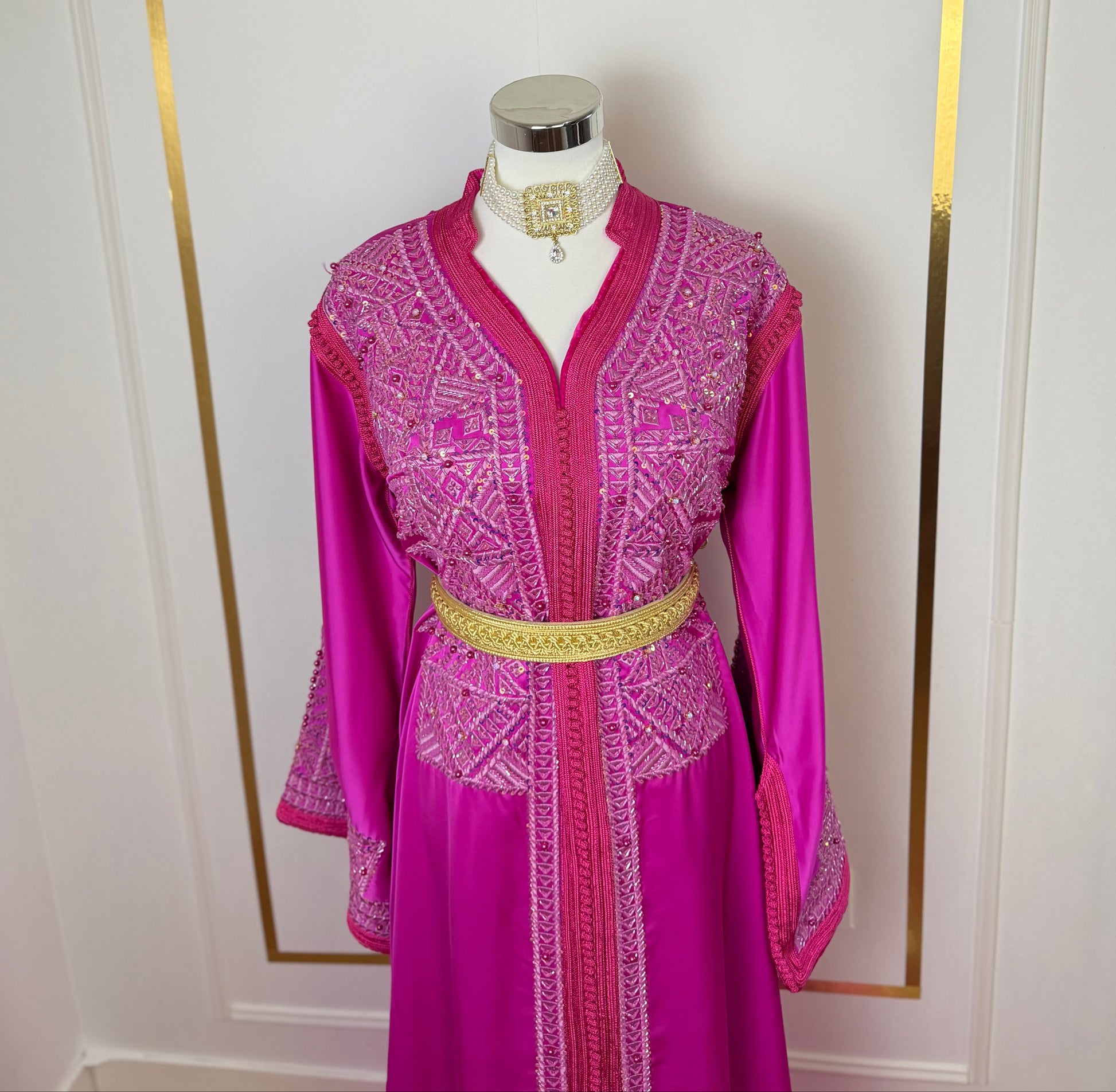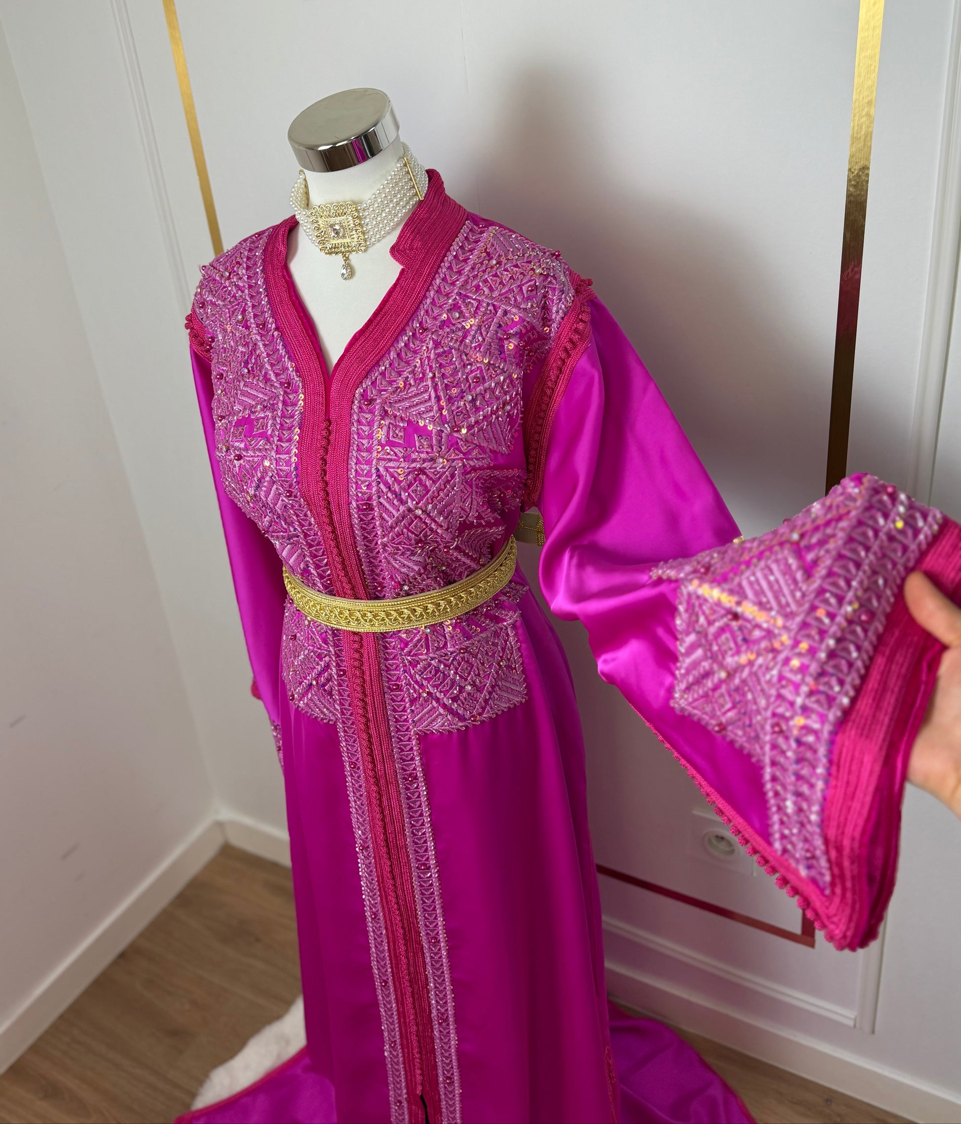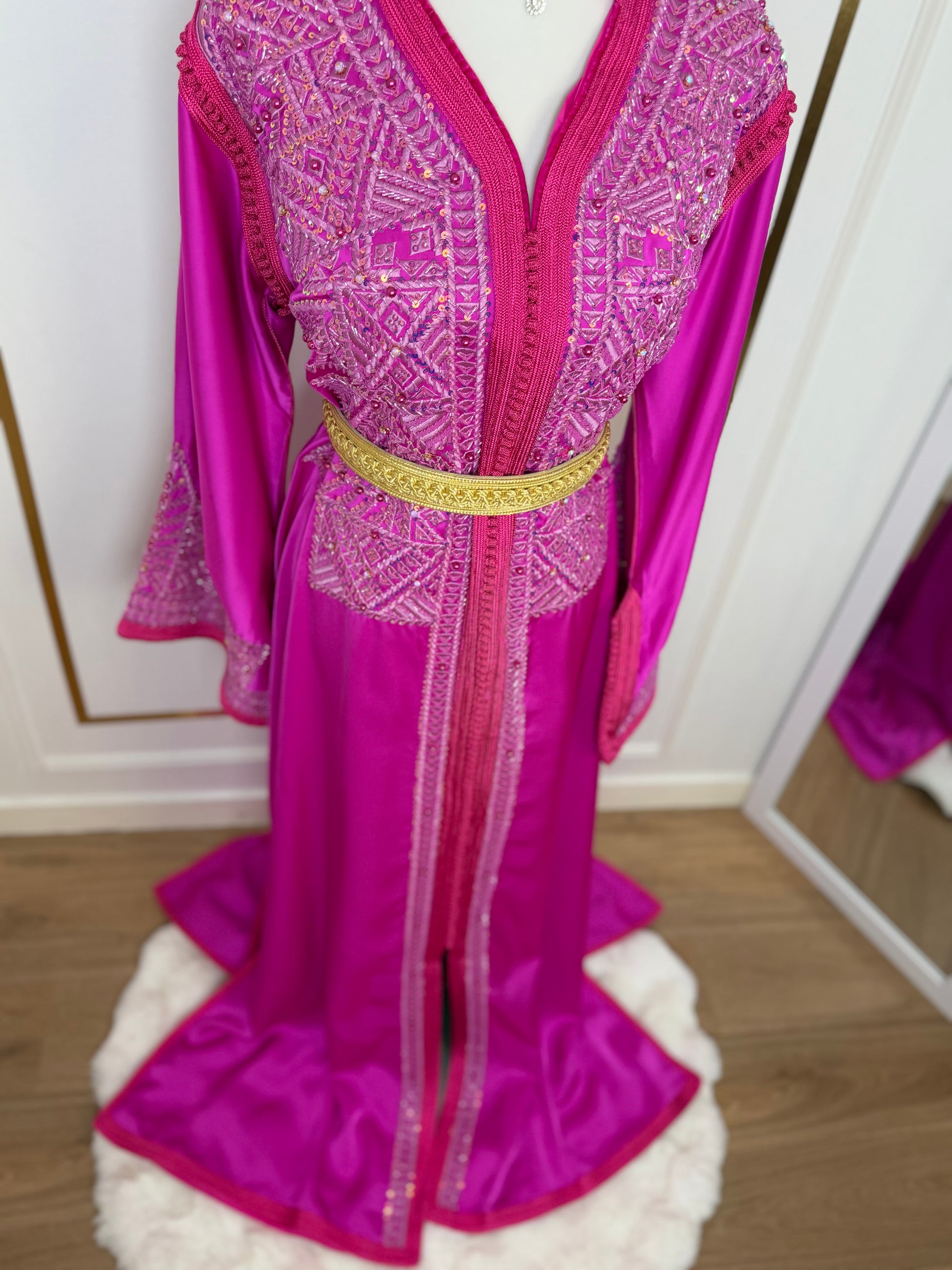 this caftan combines the charm of Moroccan craftsmanship with a contemporary touch,