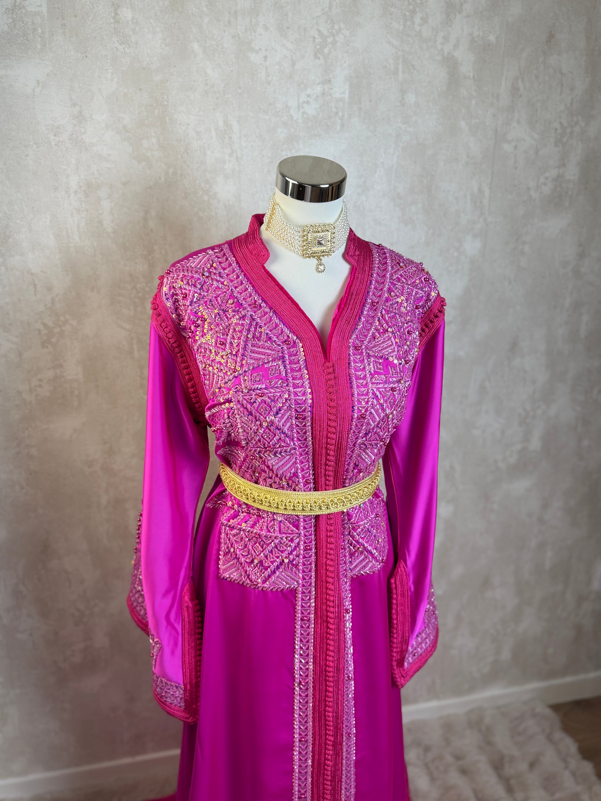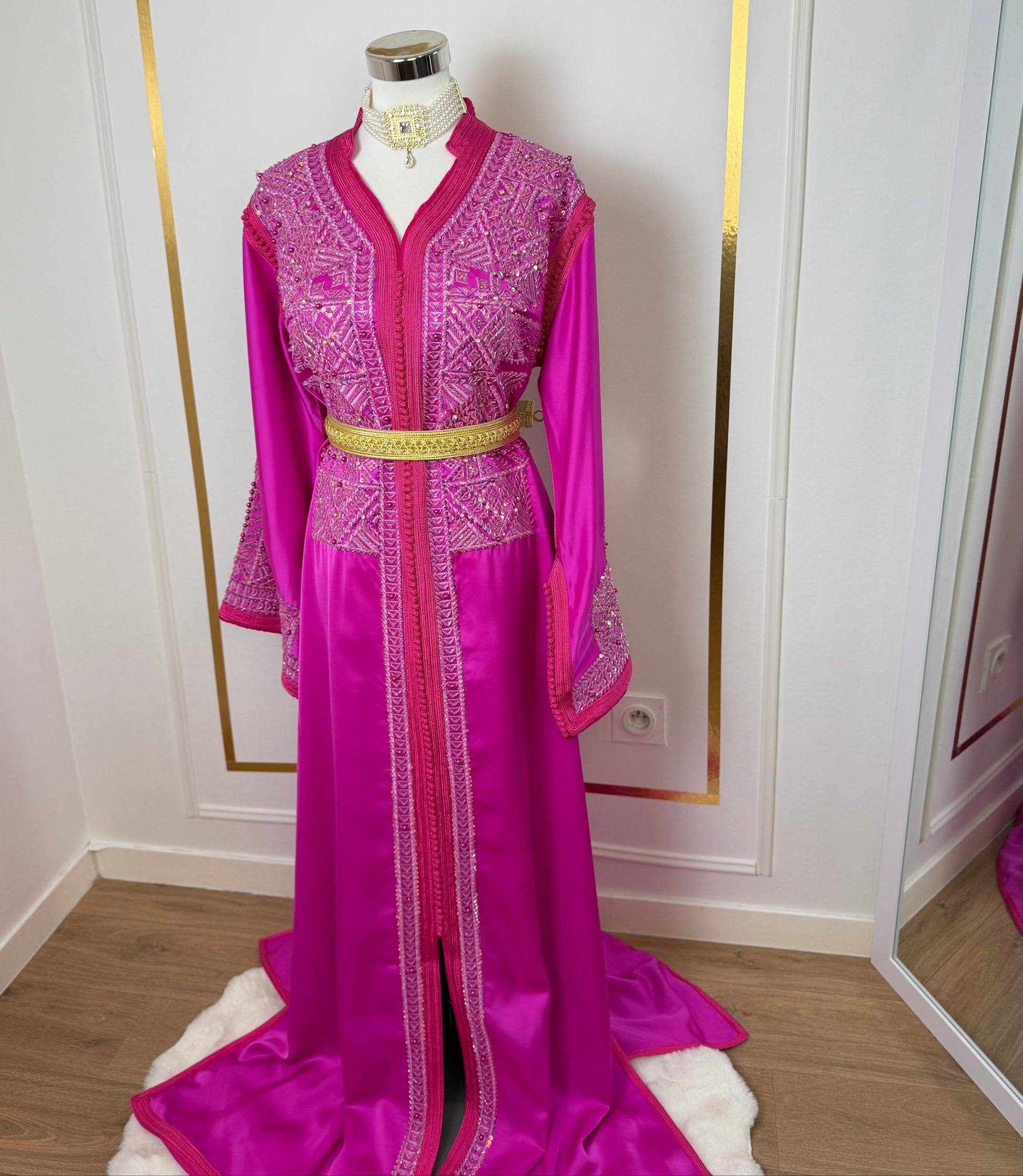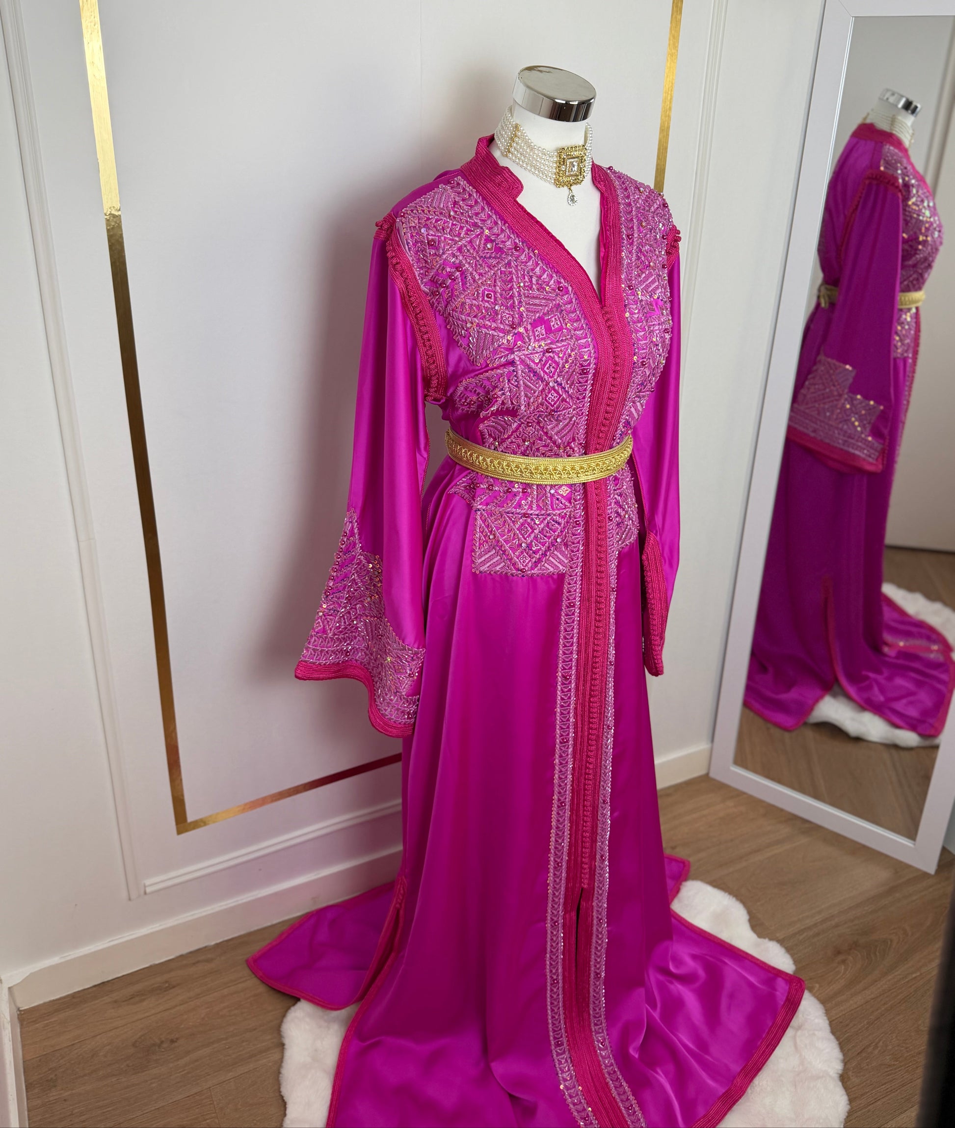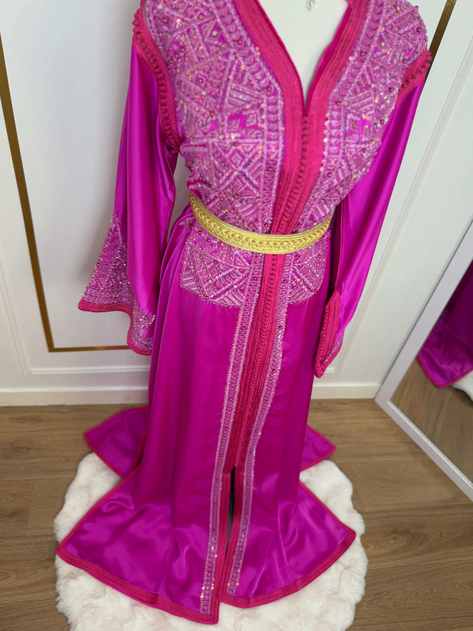 this caftan combines the charm of Moroccan craftsmanship with a contemporary touch,