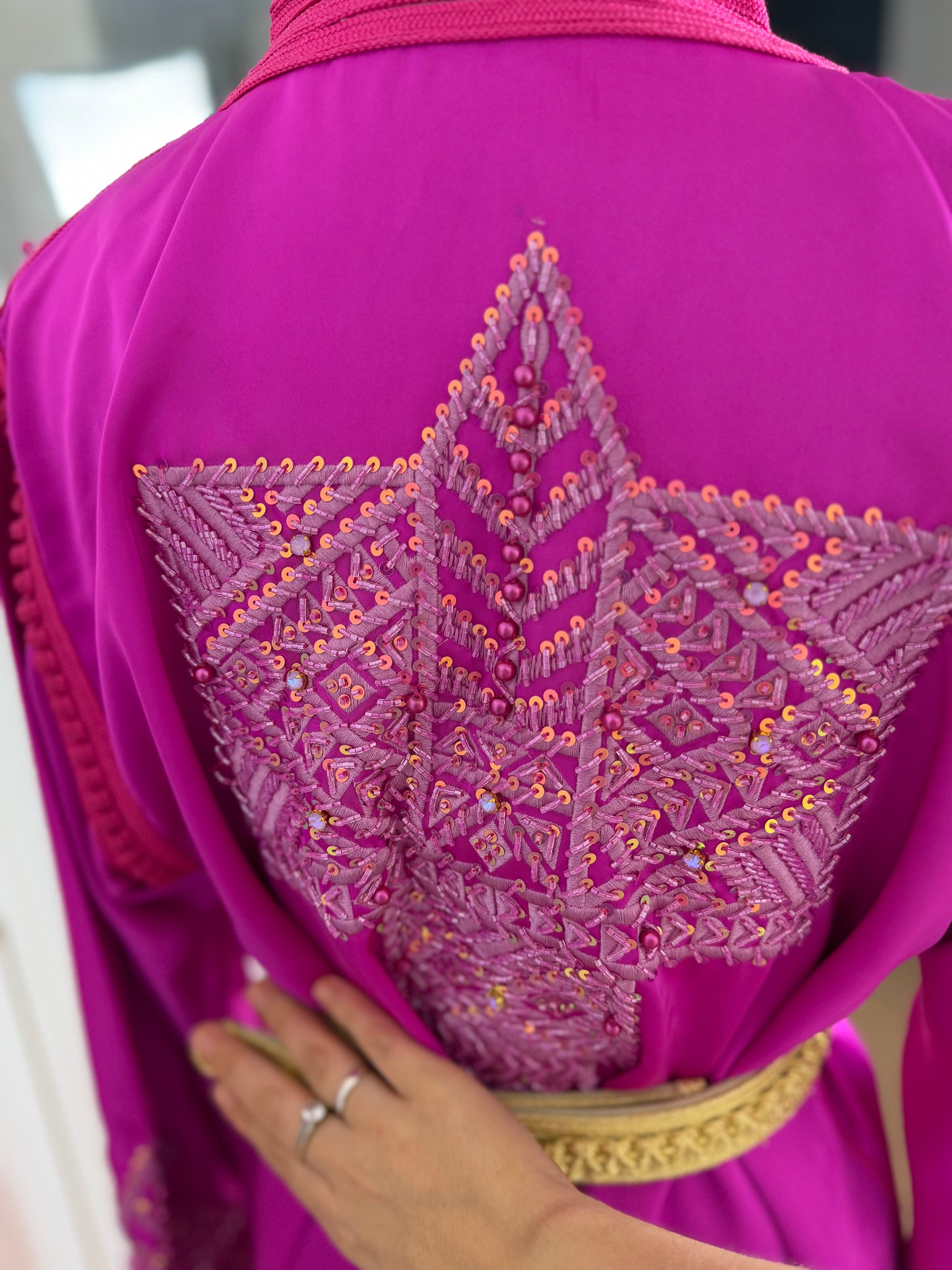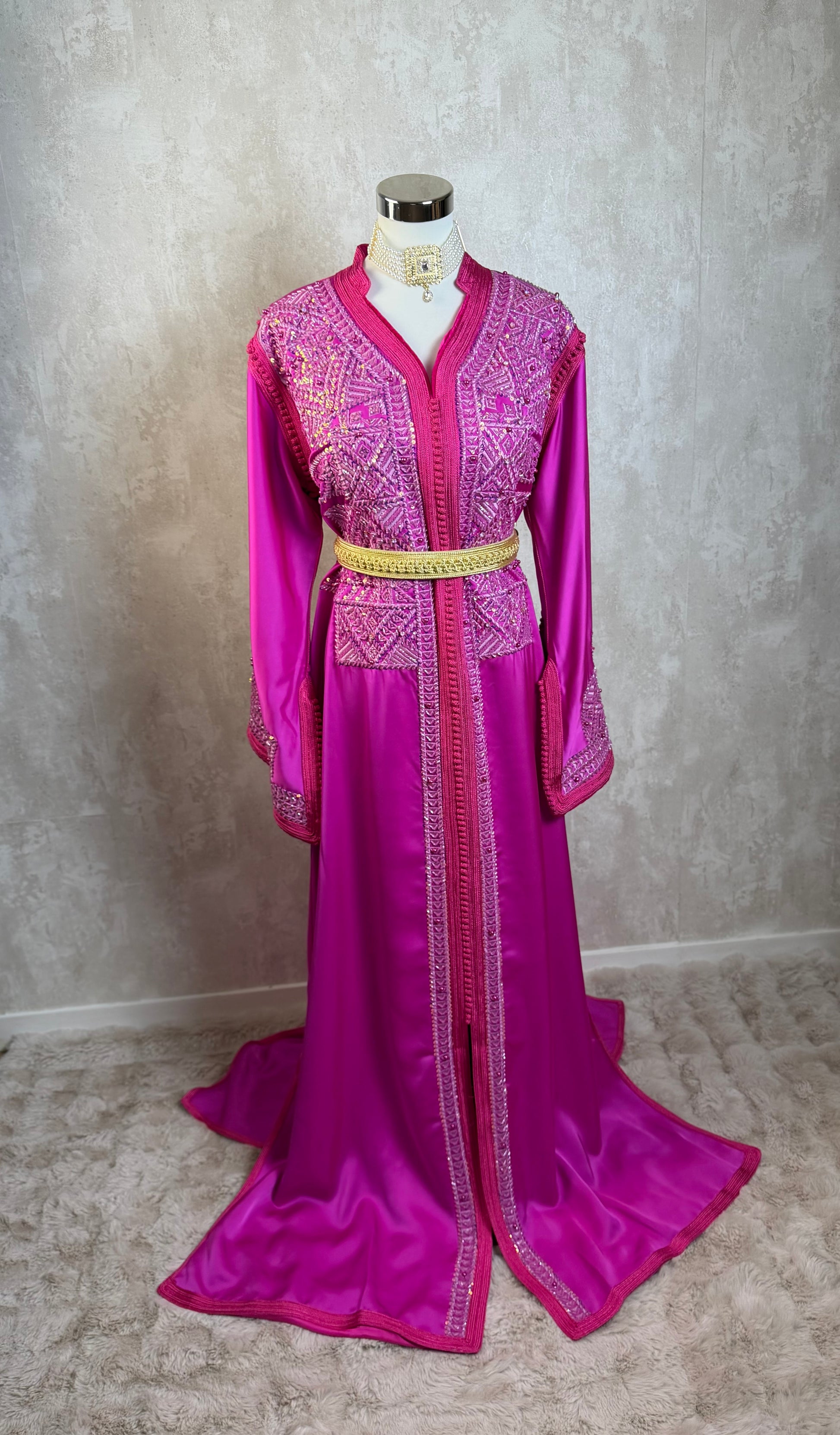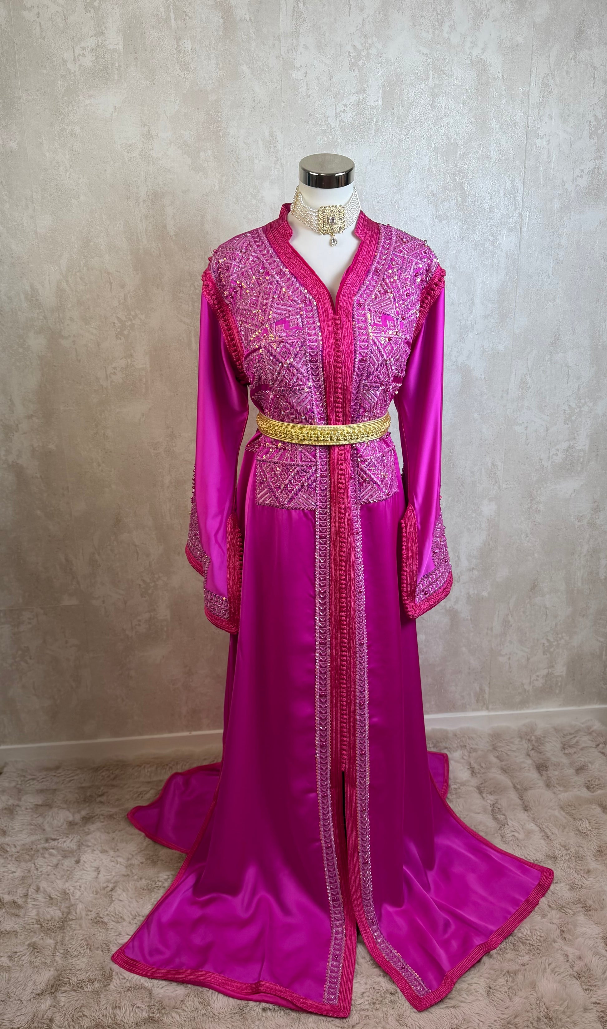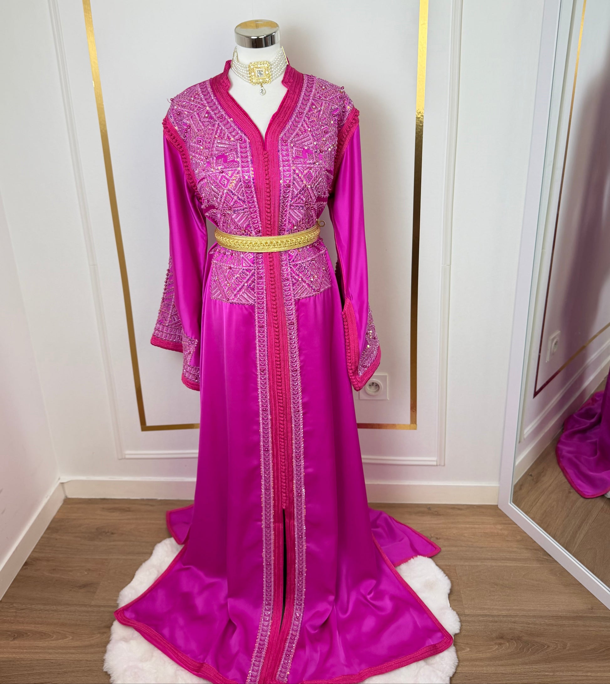 this caftan combines the charm of Moroccan craftsmanship with a contemporary touch,