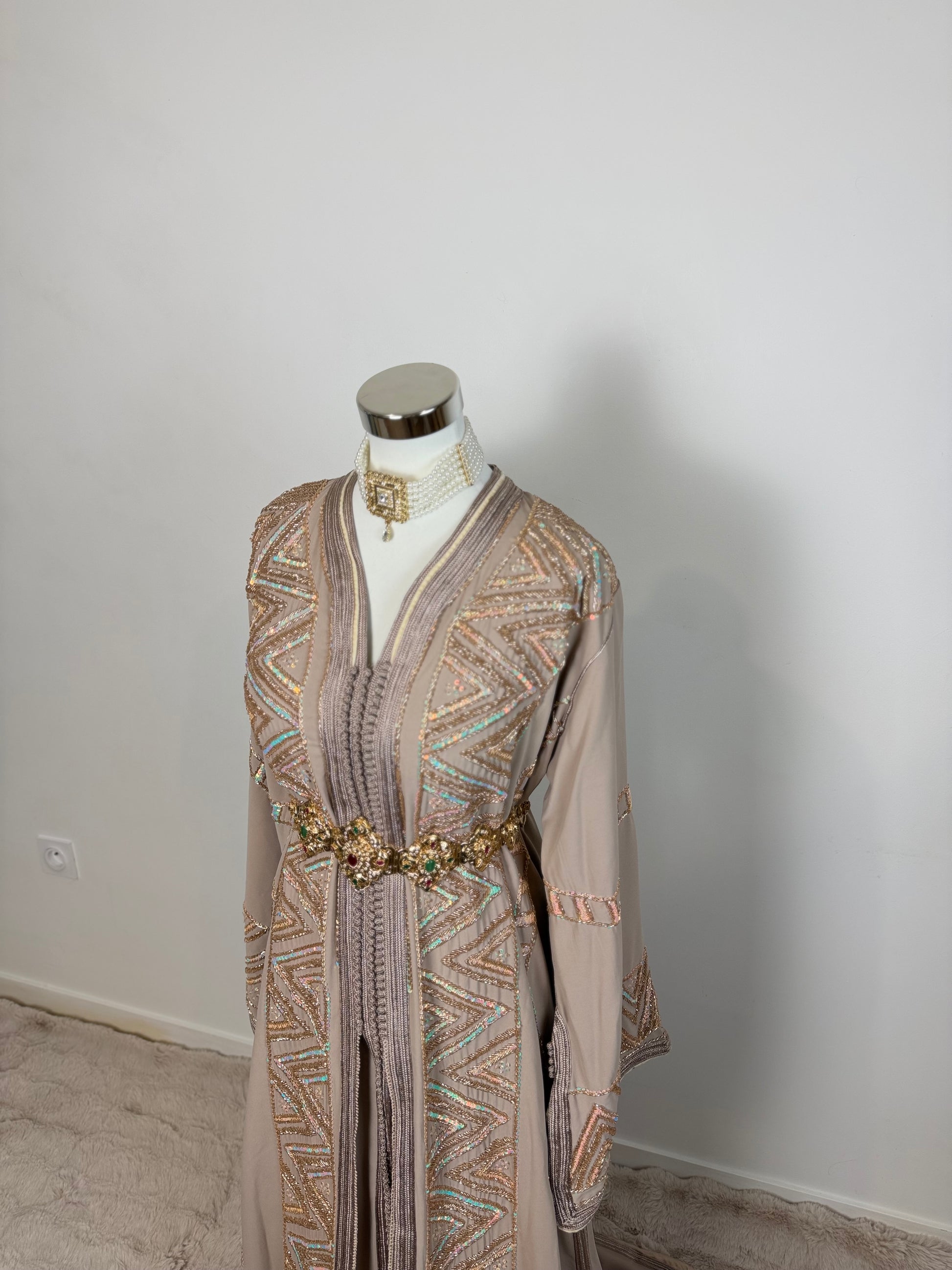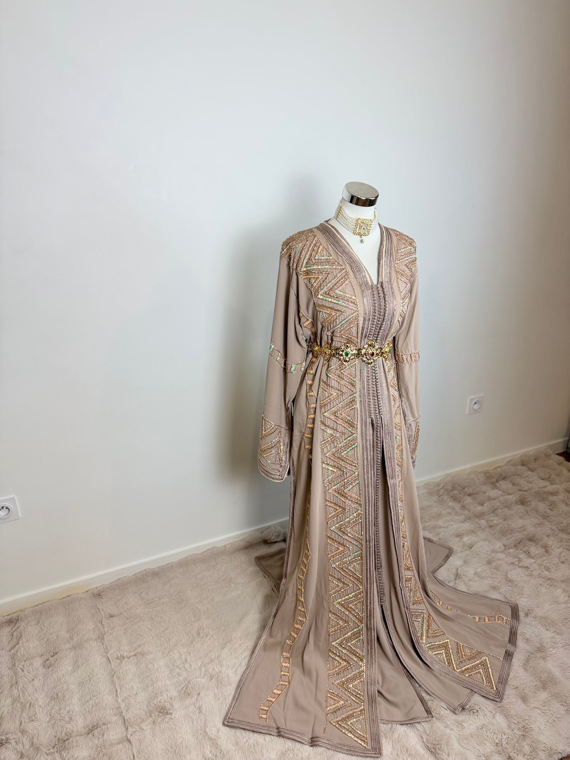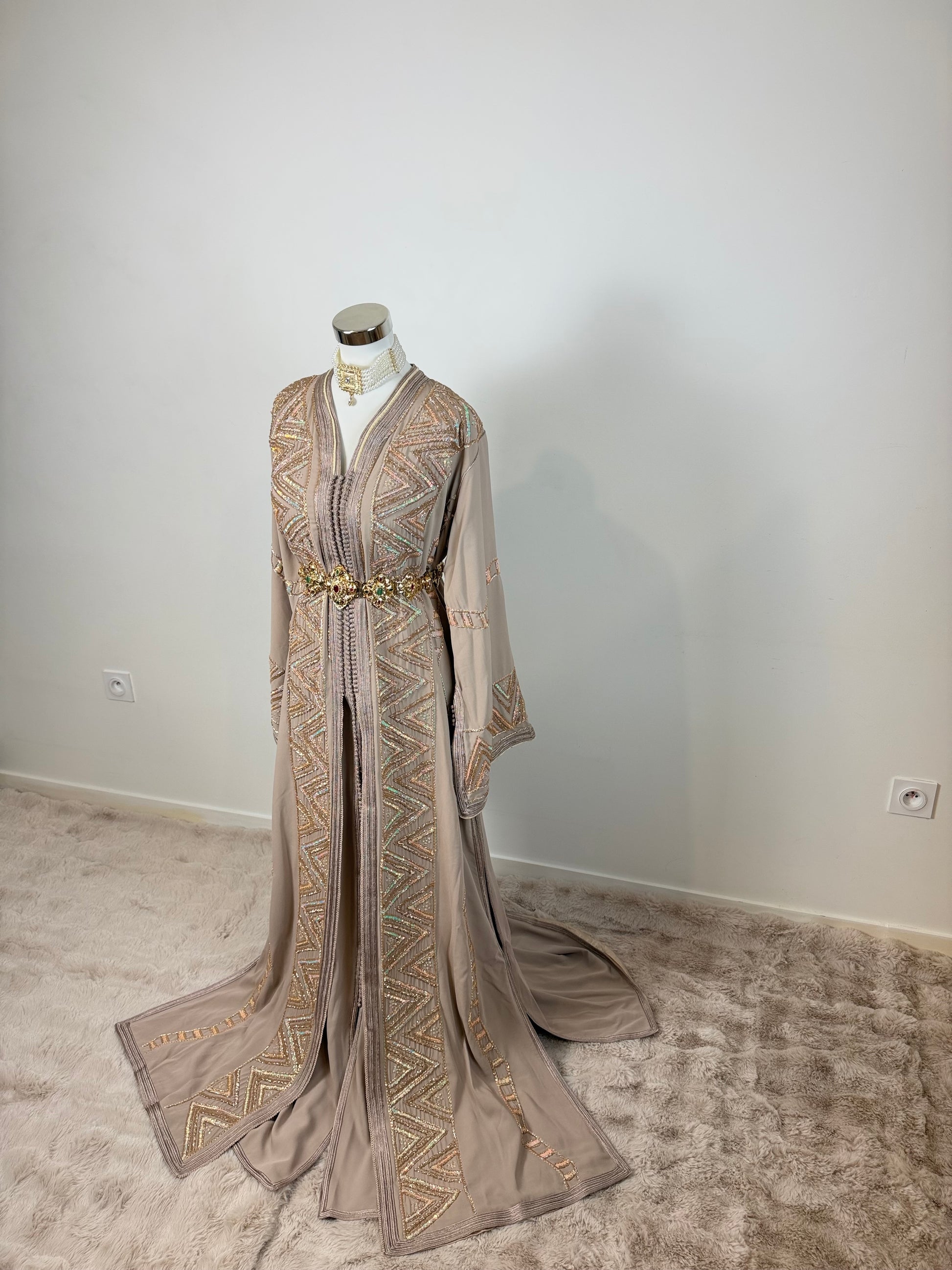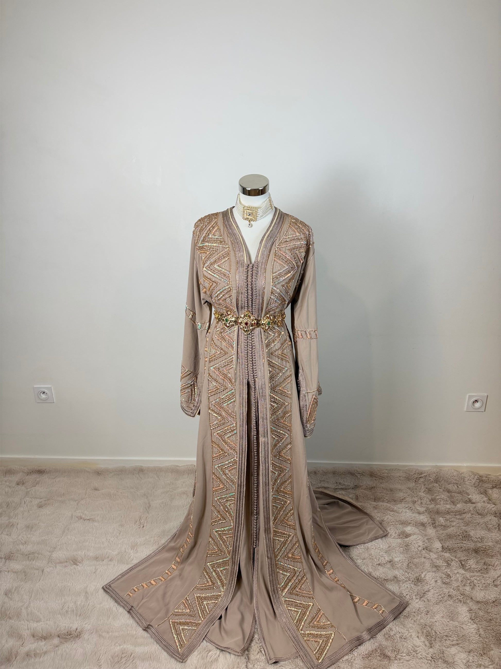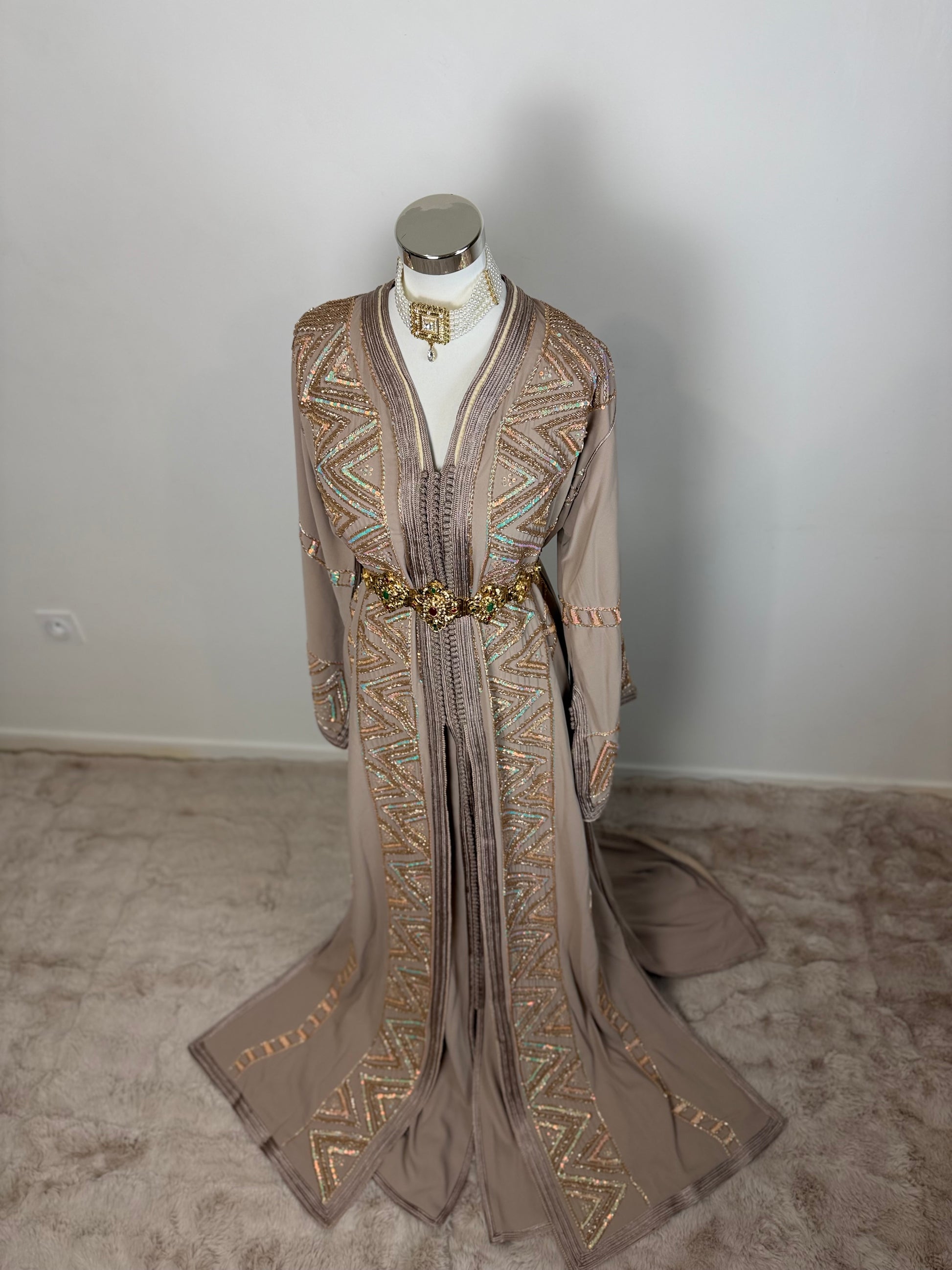 this caftan combines the charm of Moroccan craftsmanship with a contemporary touch,