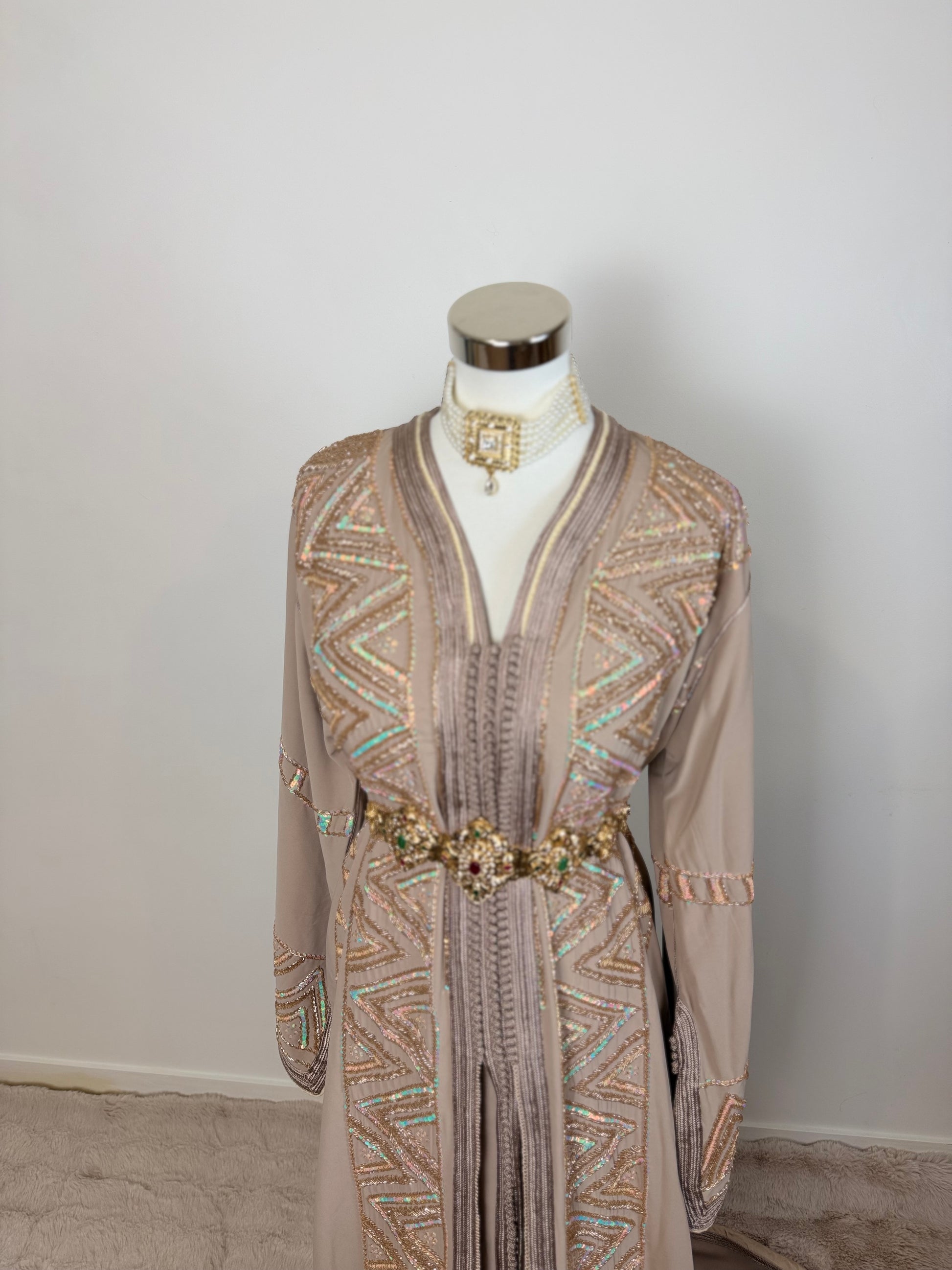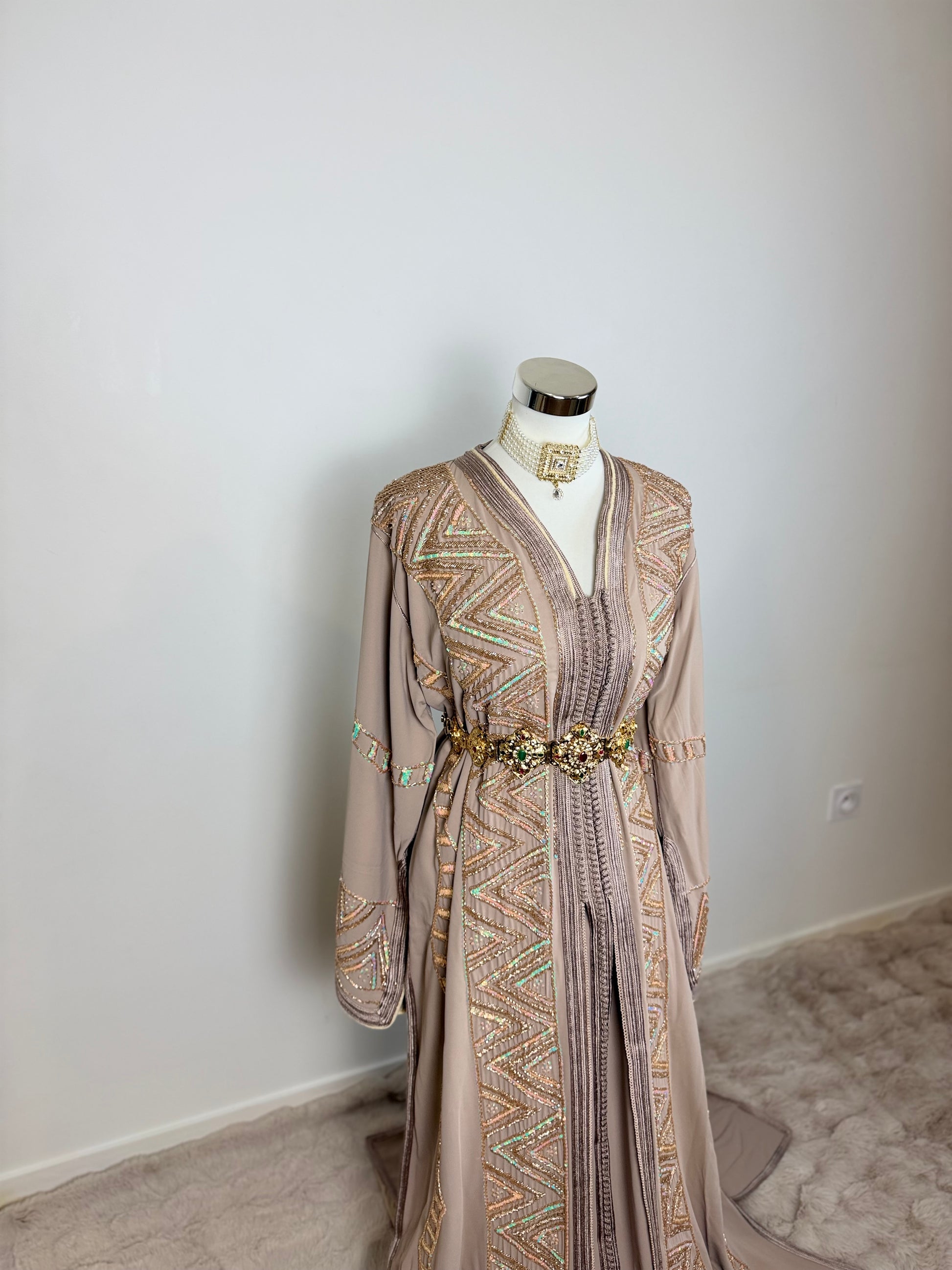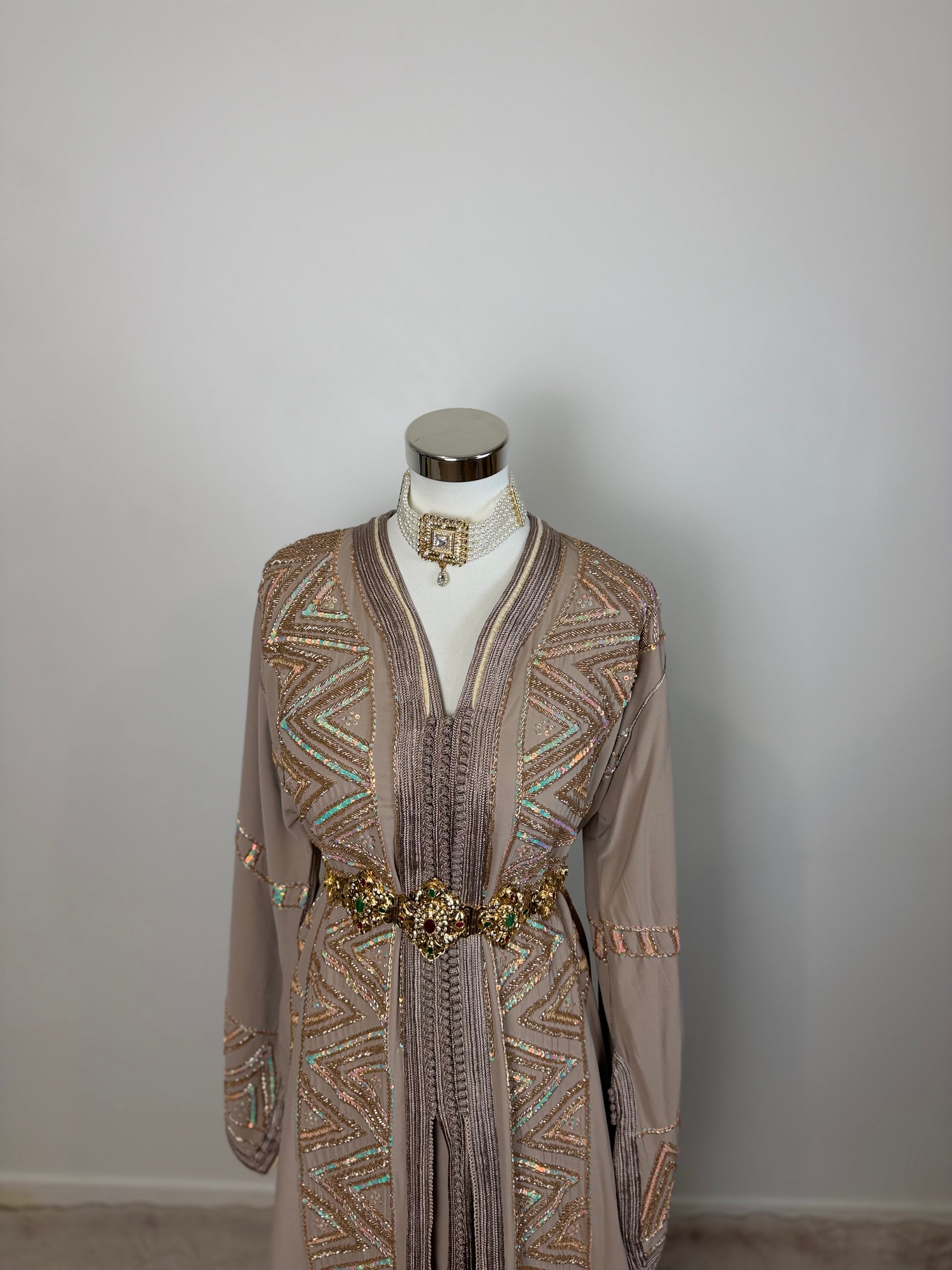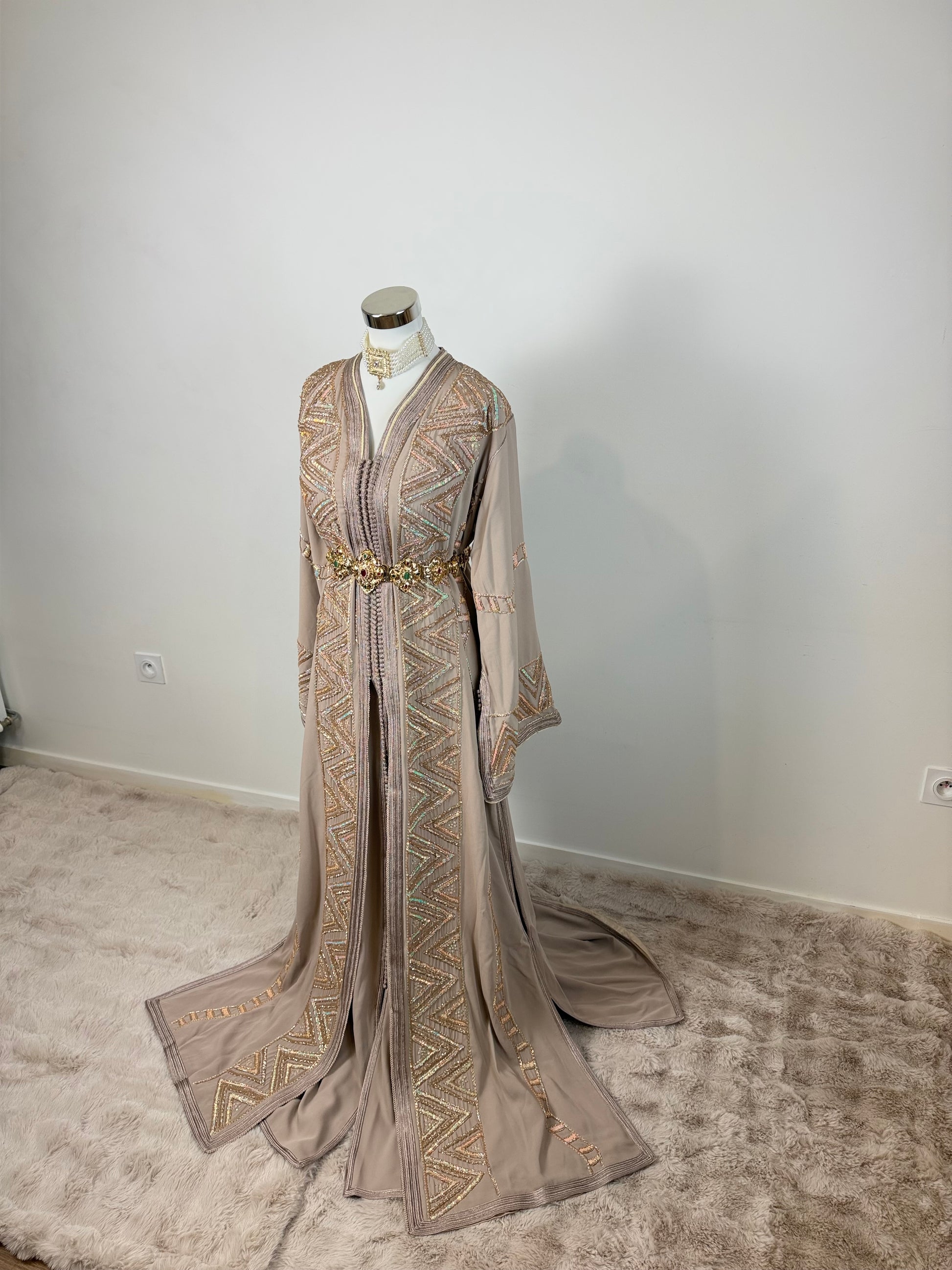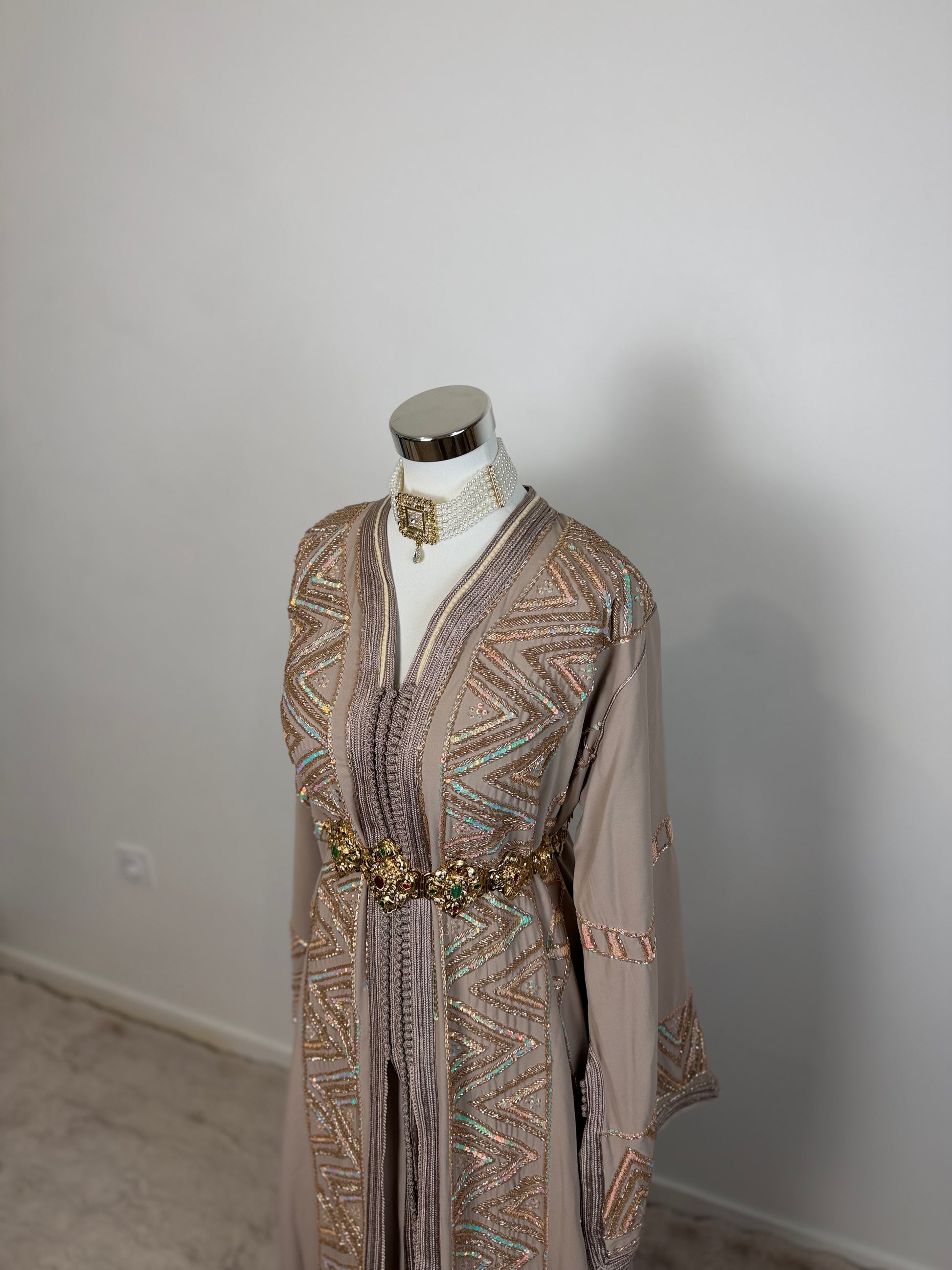 this caftan combines the charm of Moroccan craftsmanship with a contemporary touch,