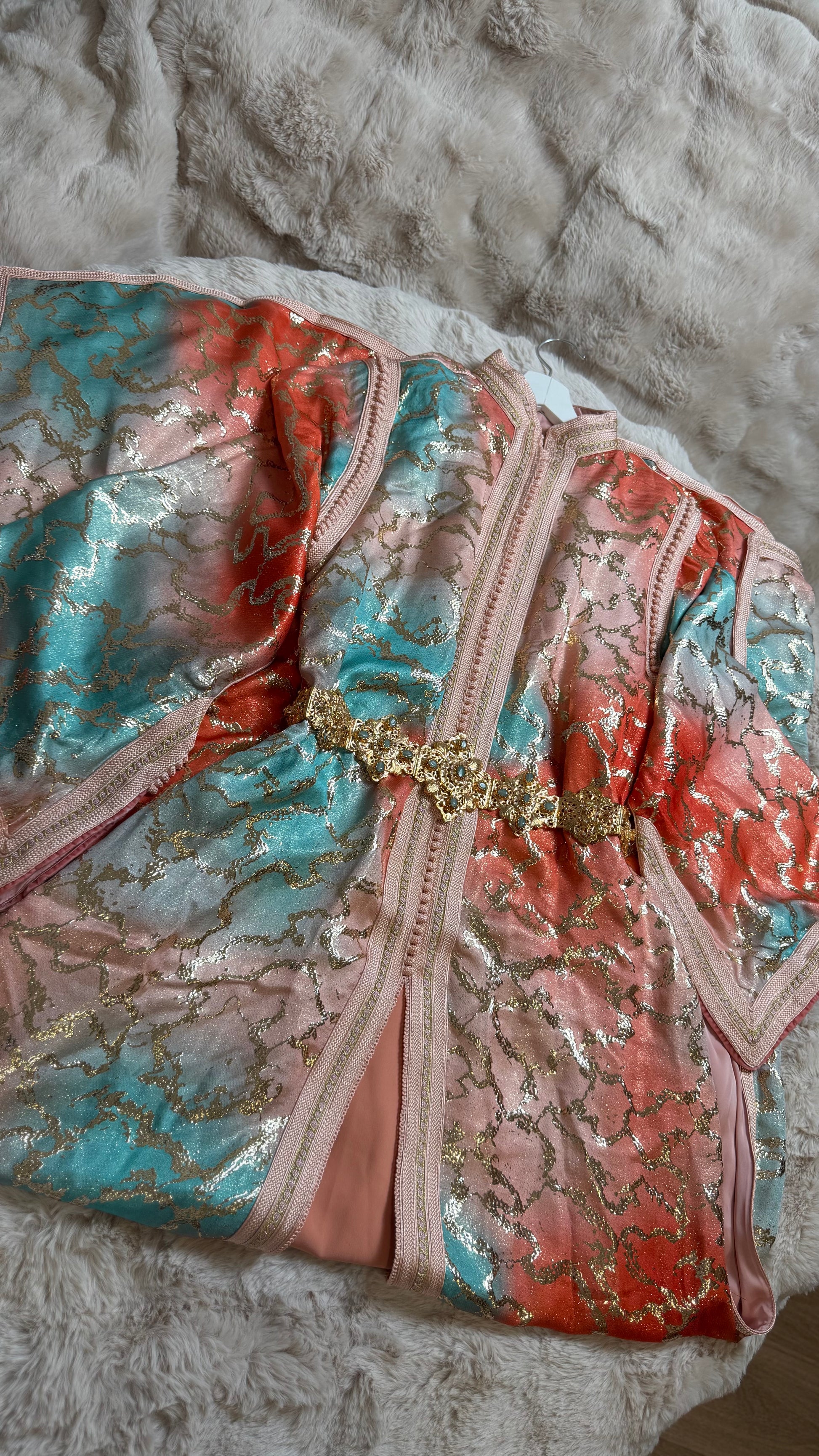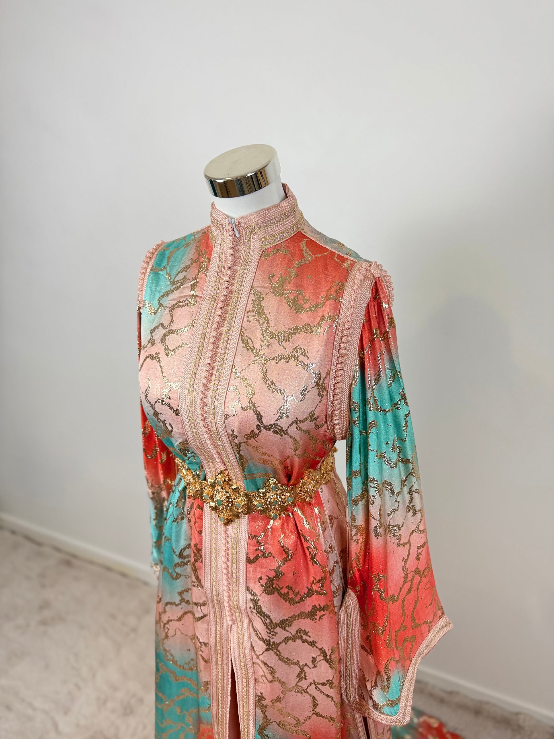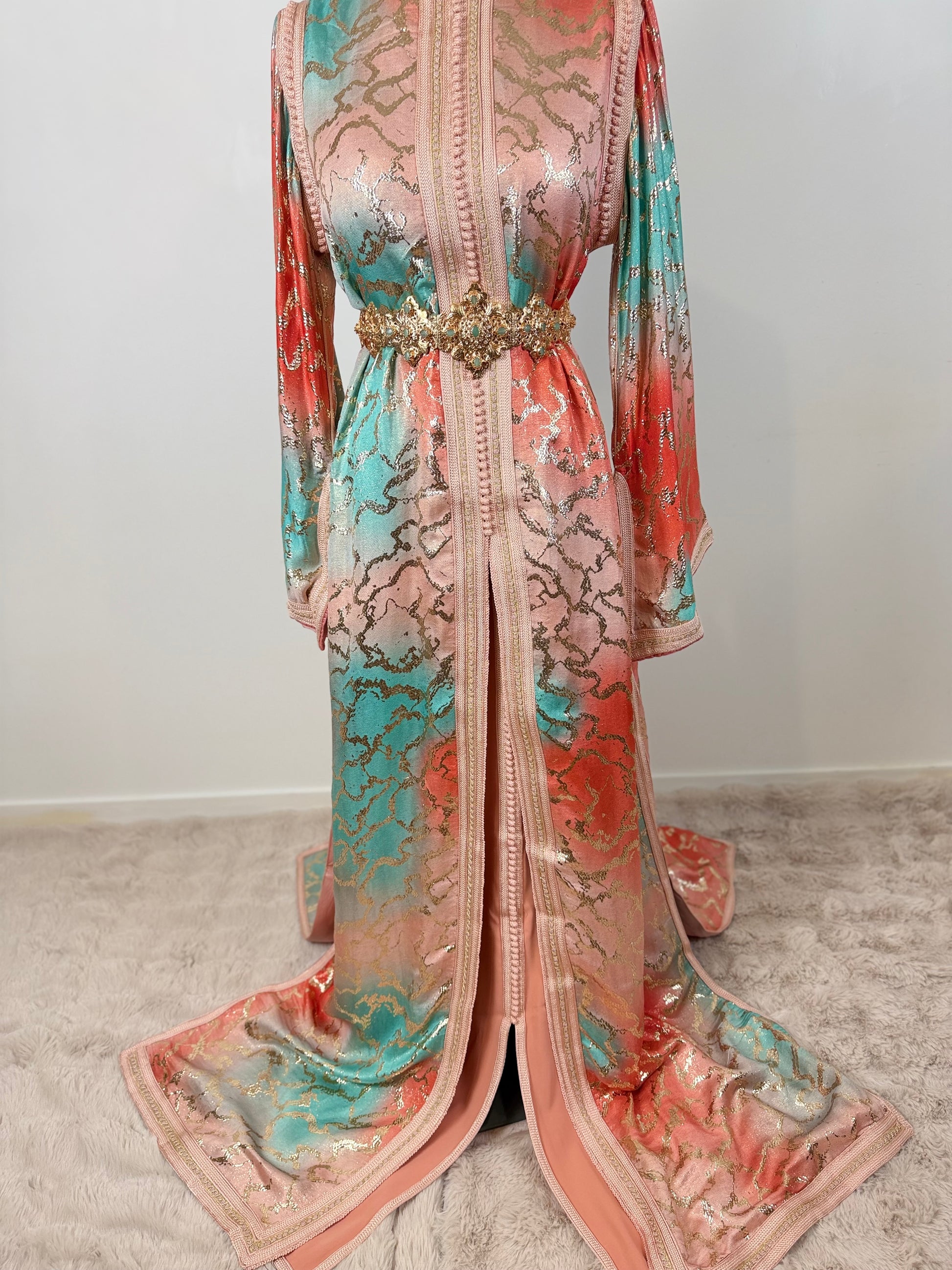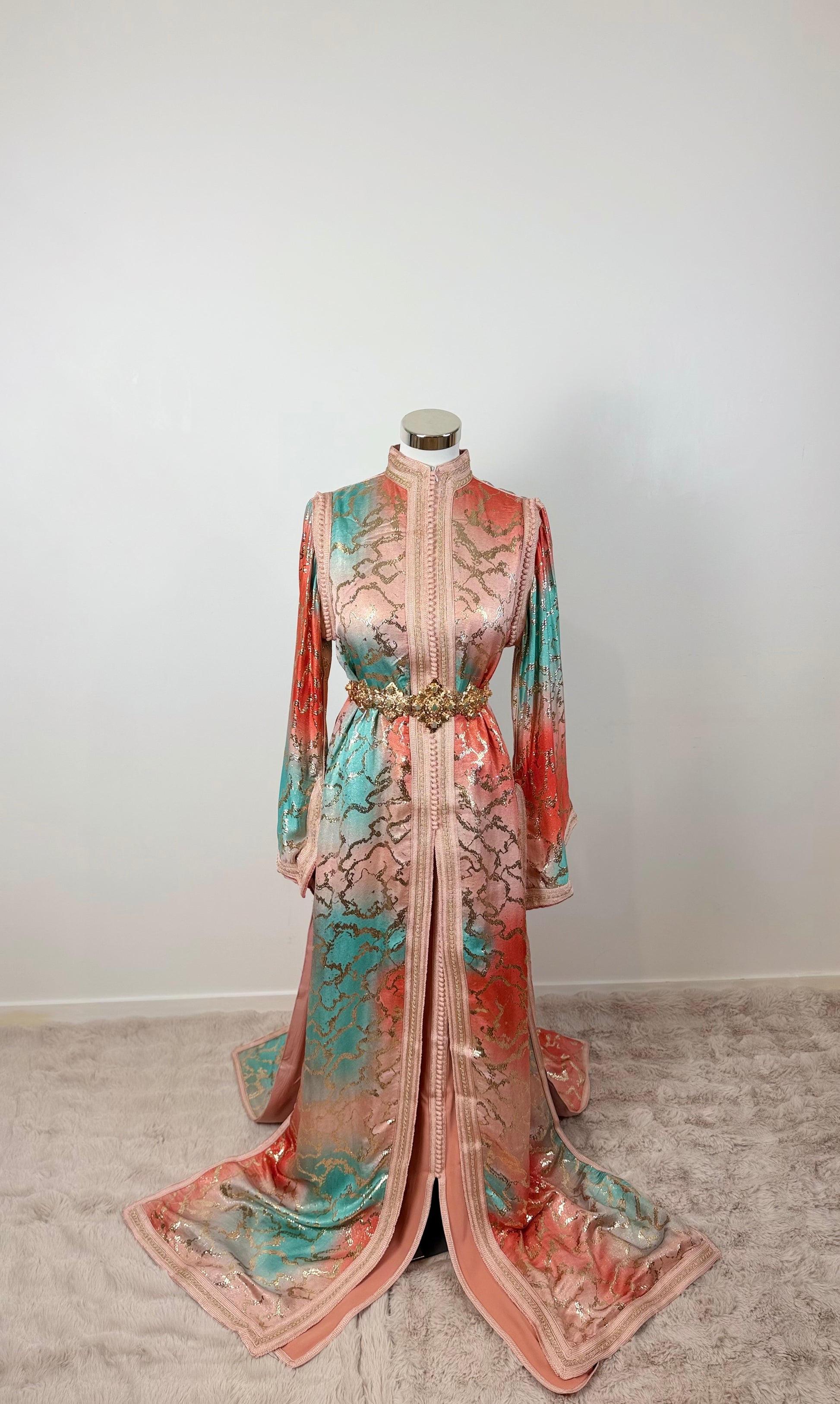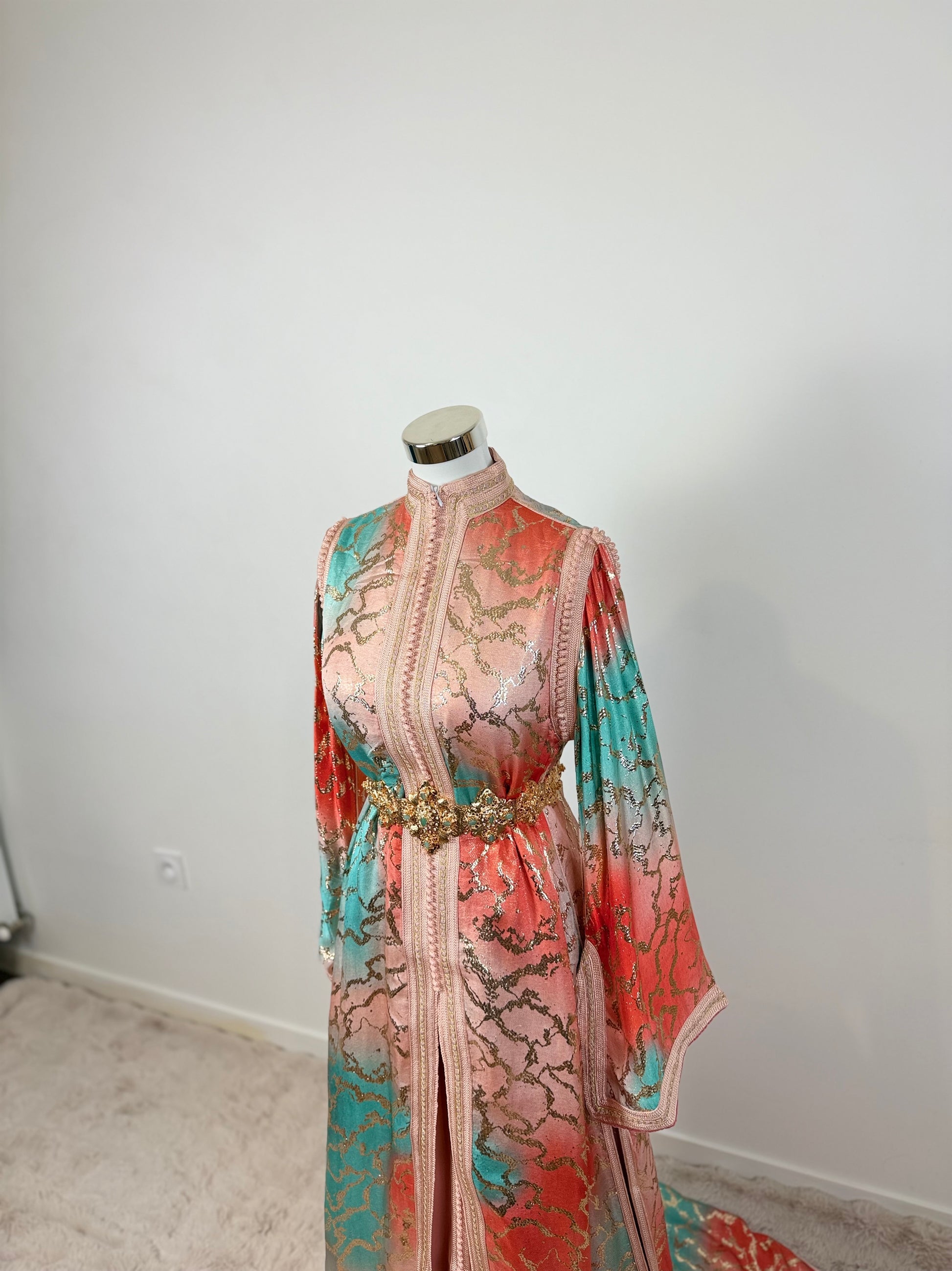 this caftan combines the charm of Moroccan craftsmanship with a contemporary touch,