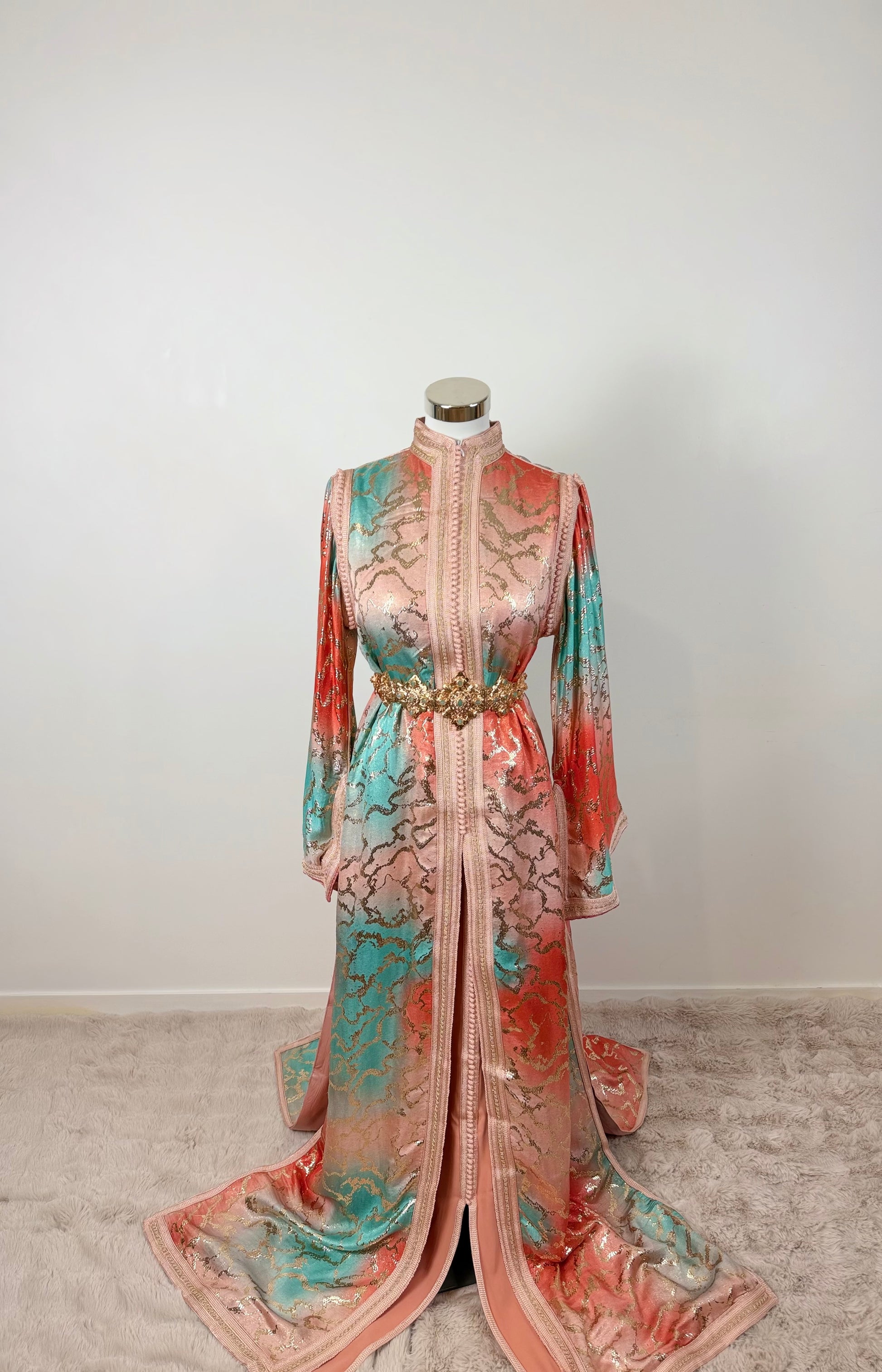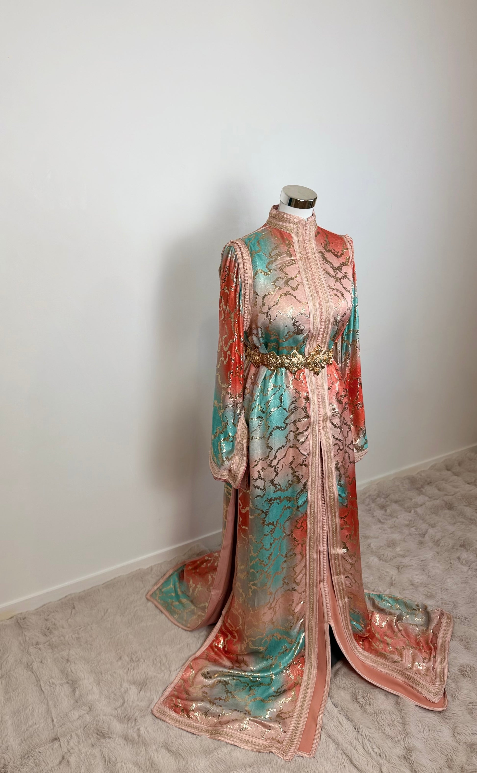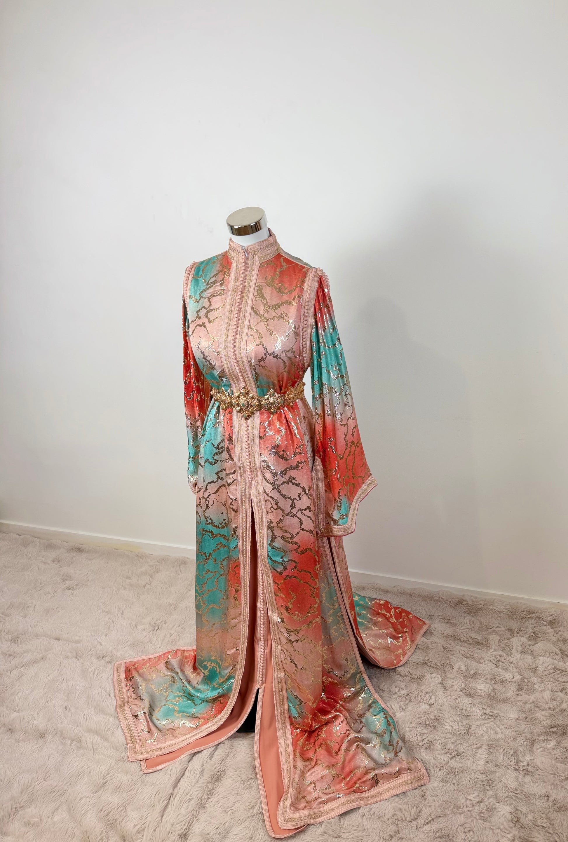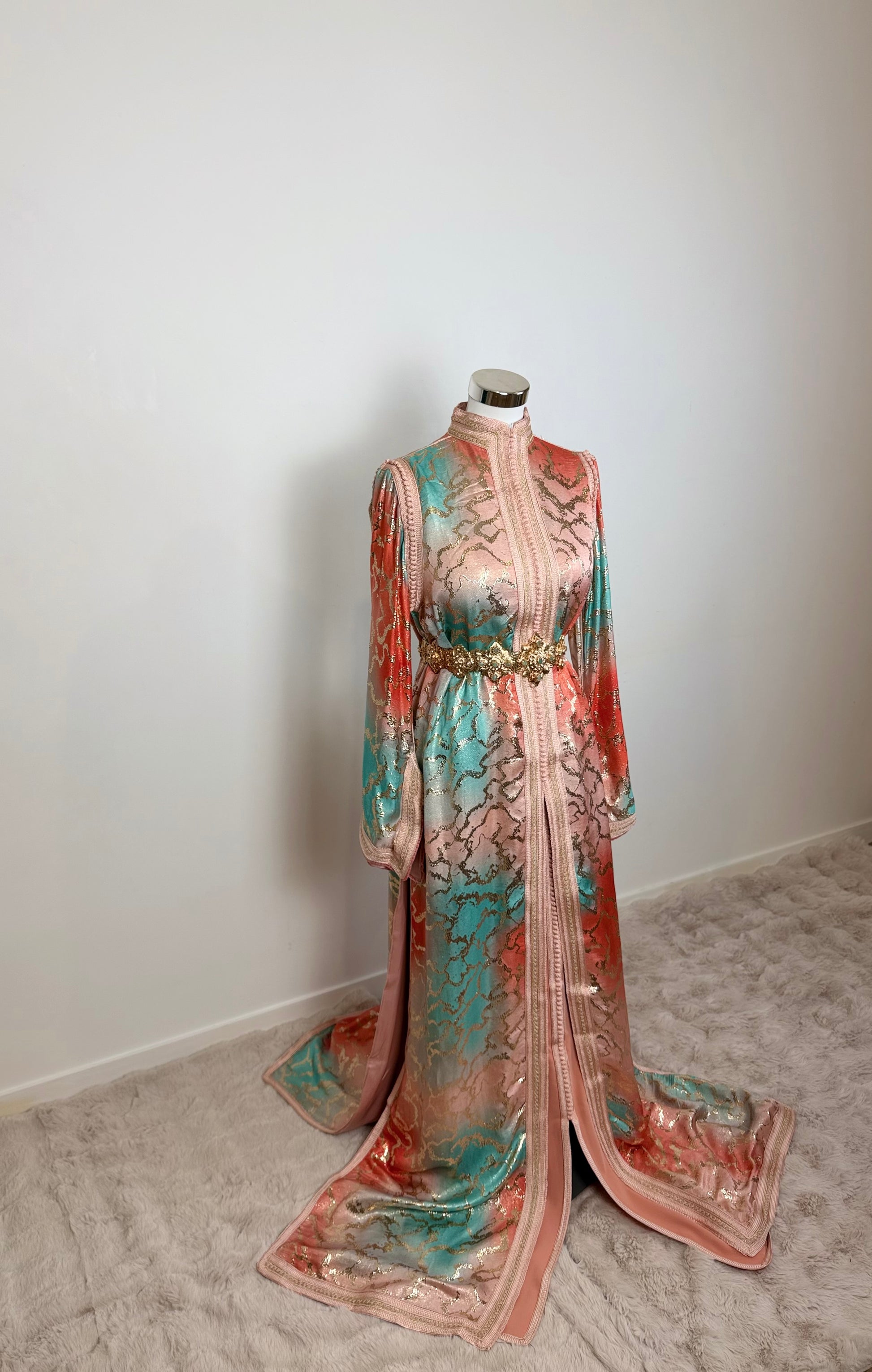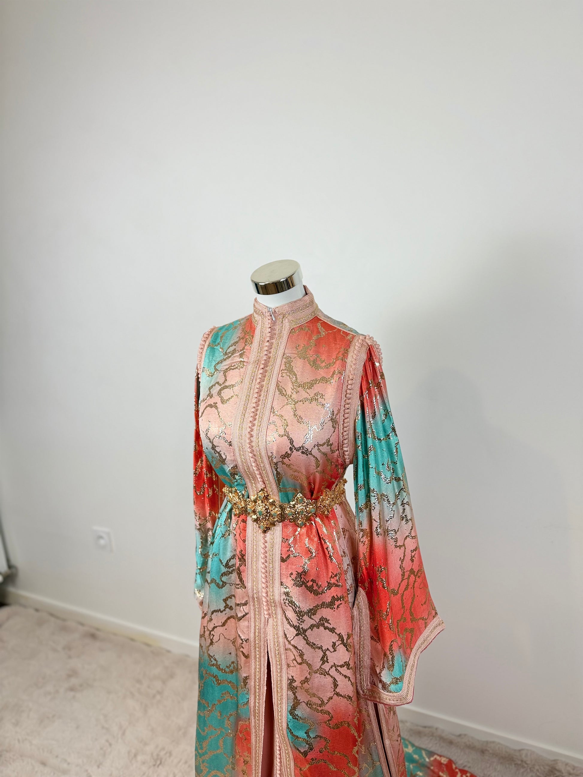 this caftan combines the charm of Moroccan craftsmanship with a contemporary touch,