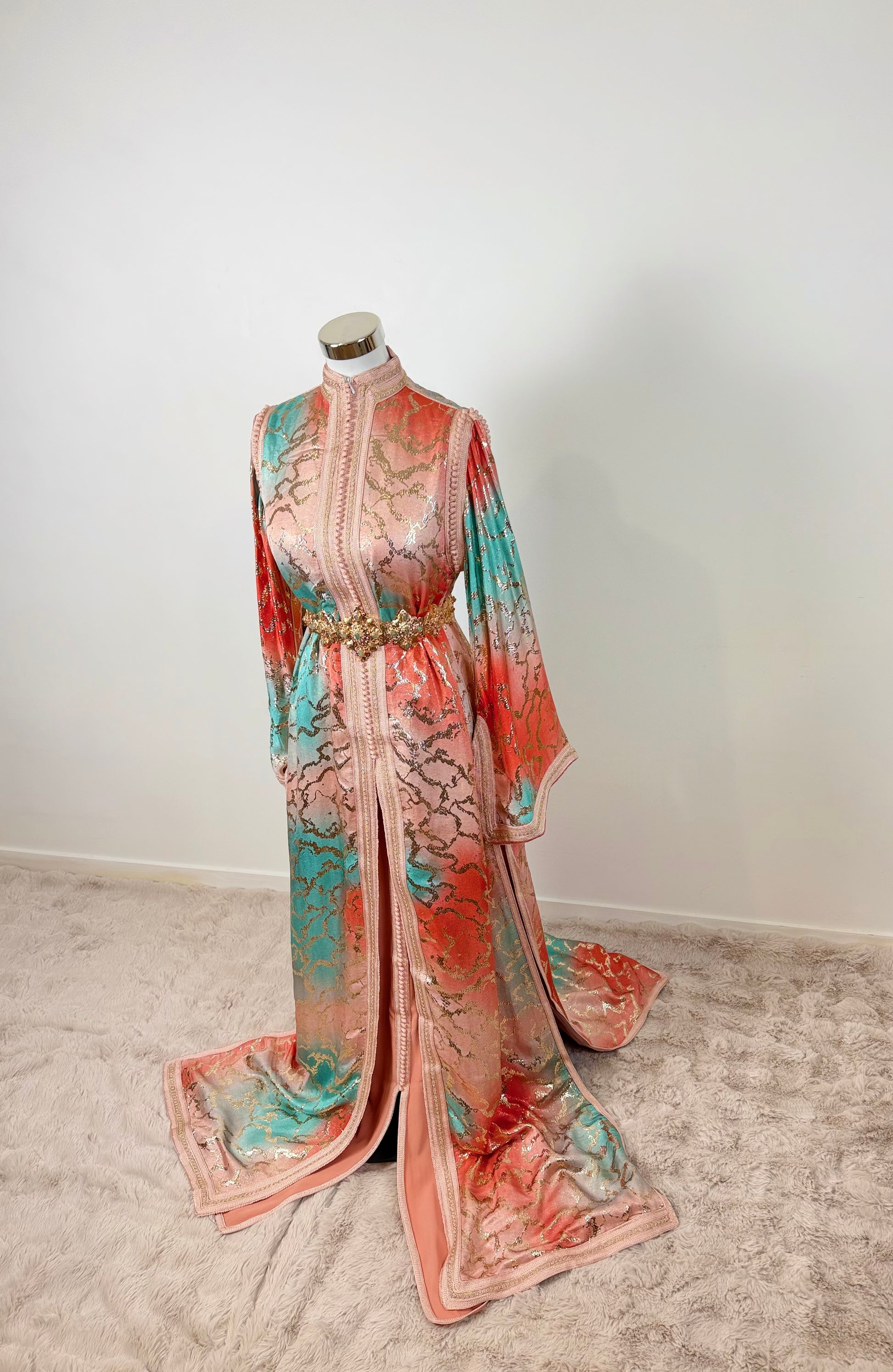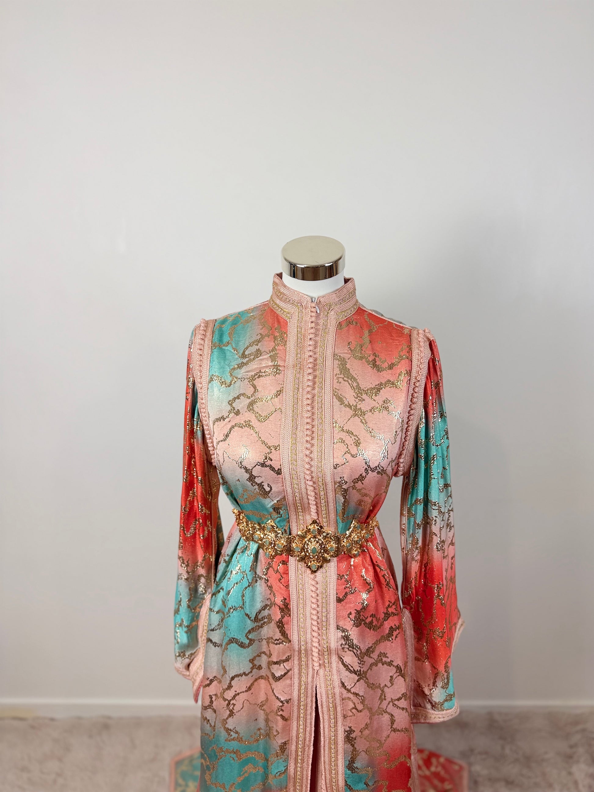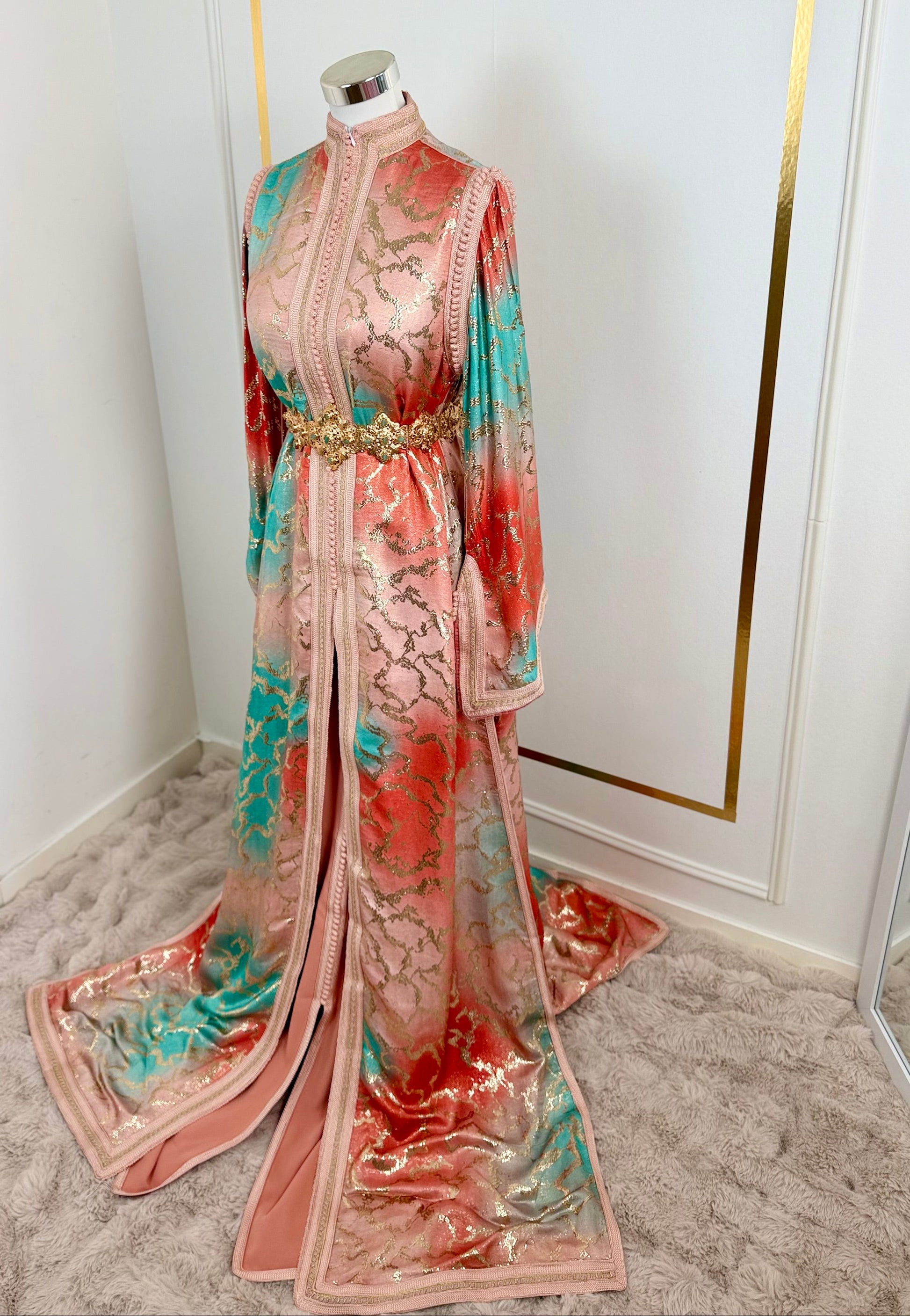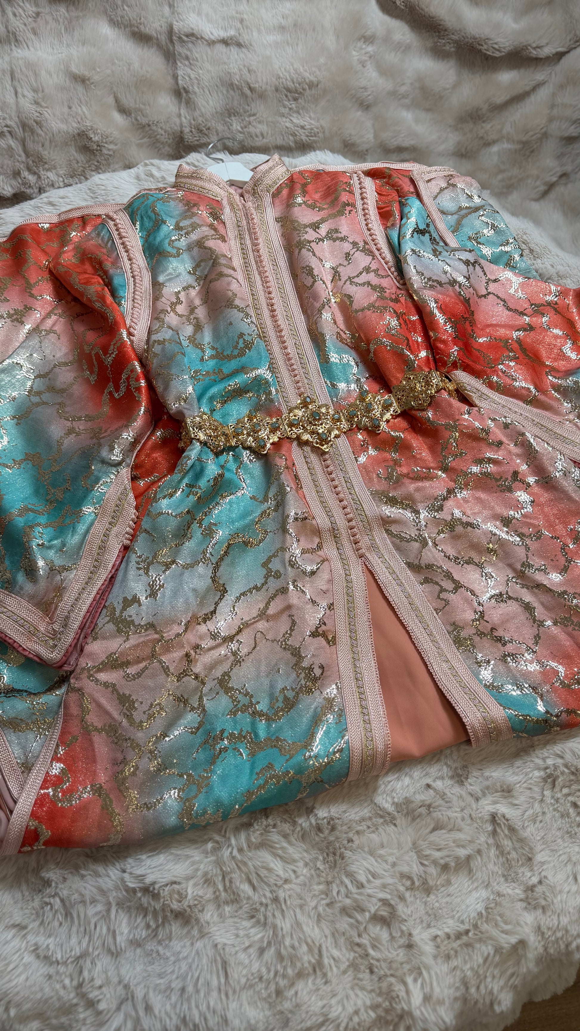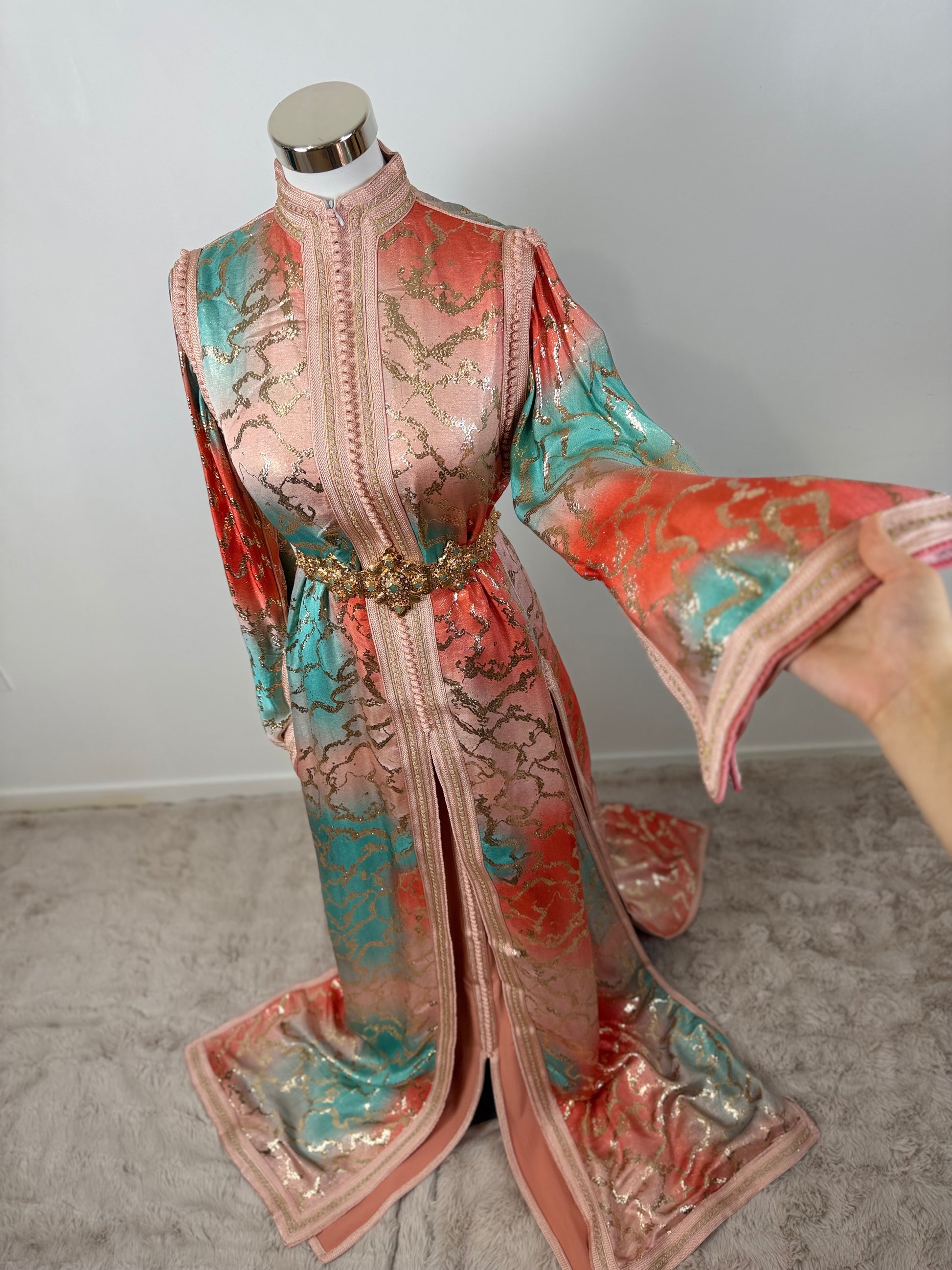 this caftan combines the charm of Moroccan craftsmanship with a contemporary touch,