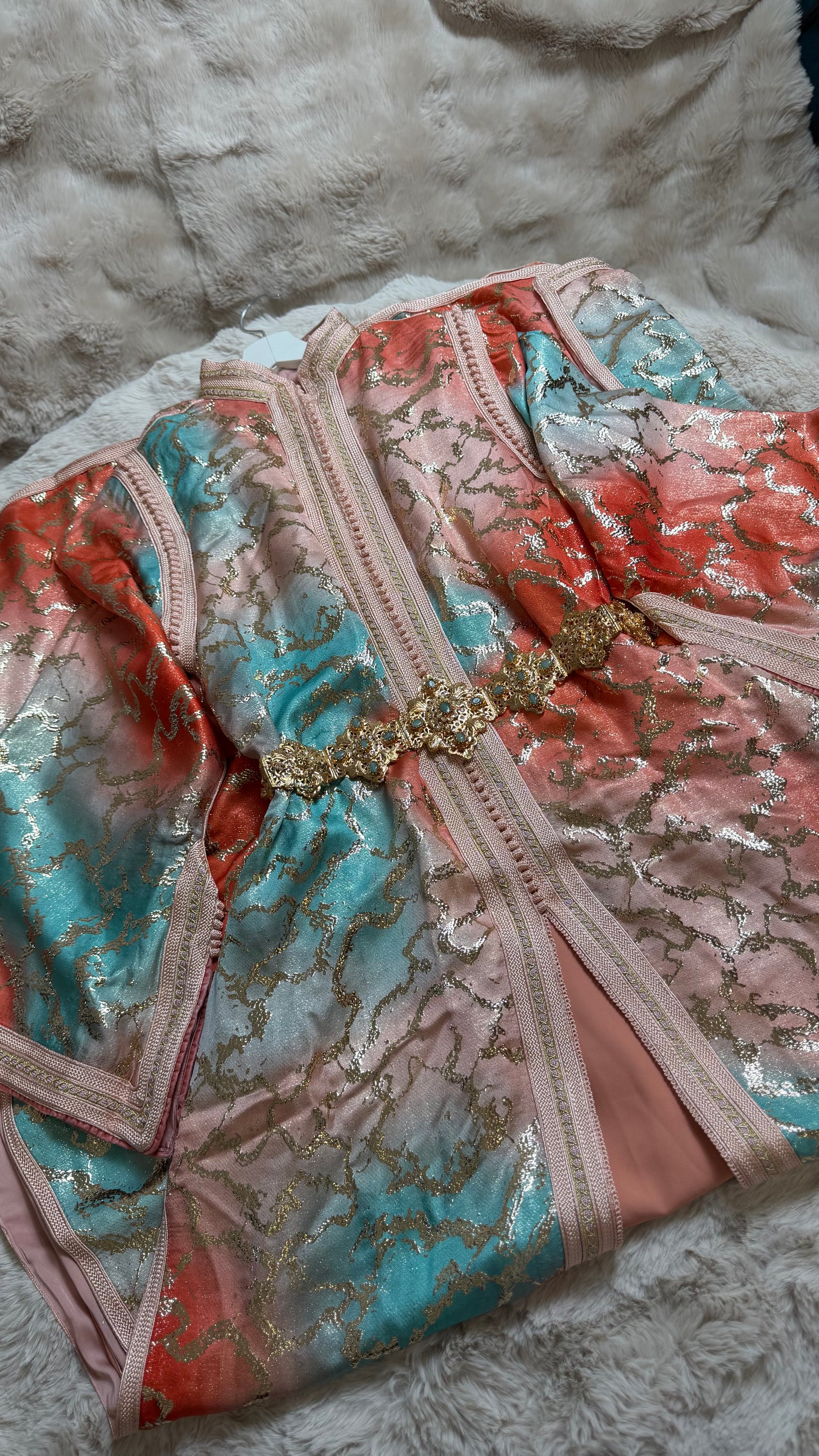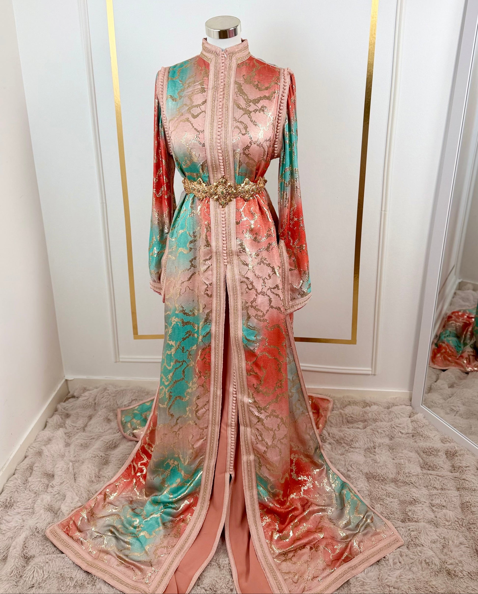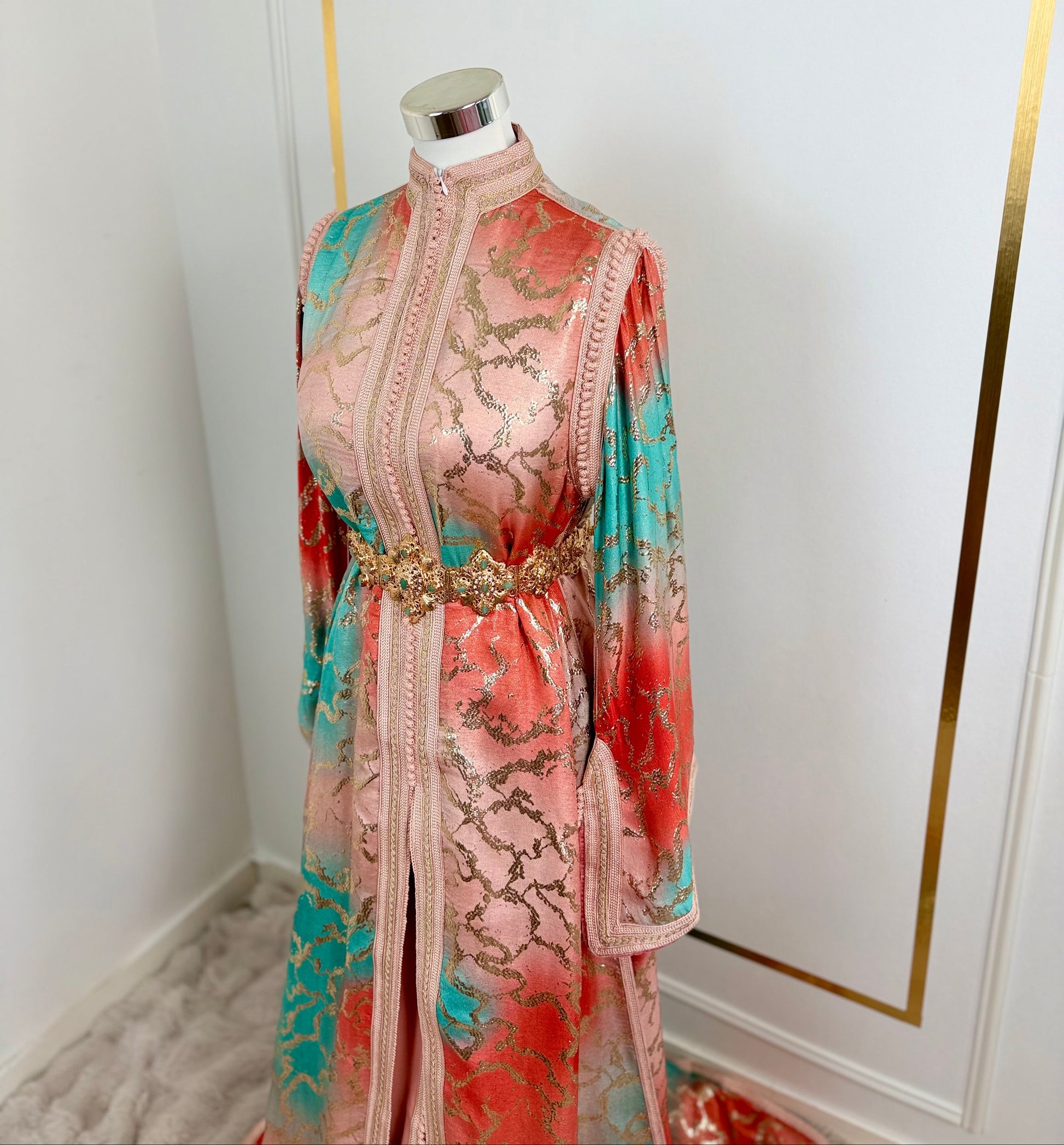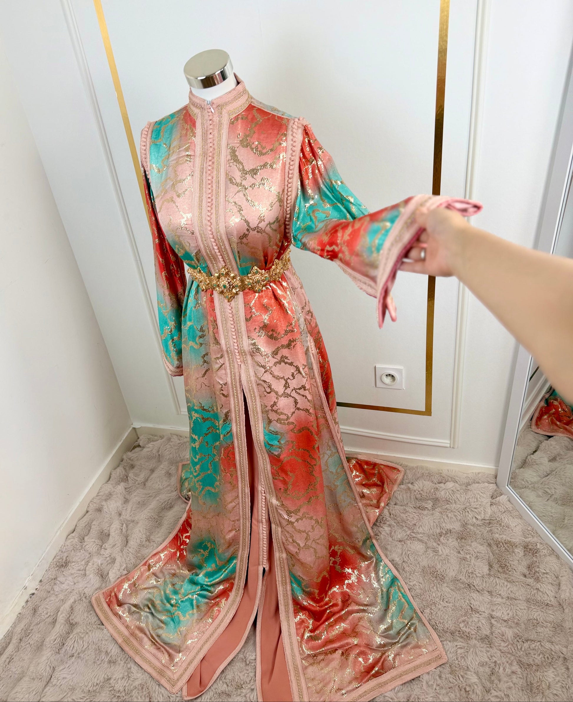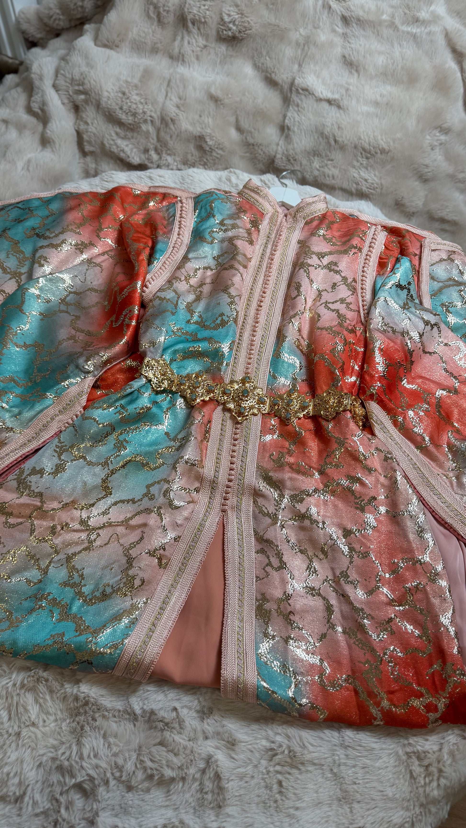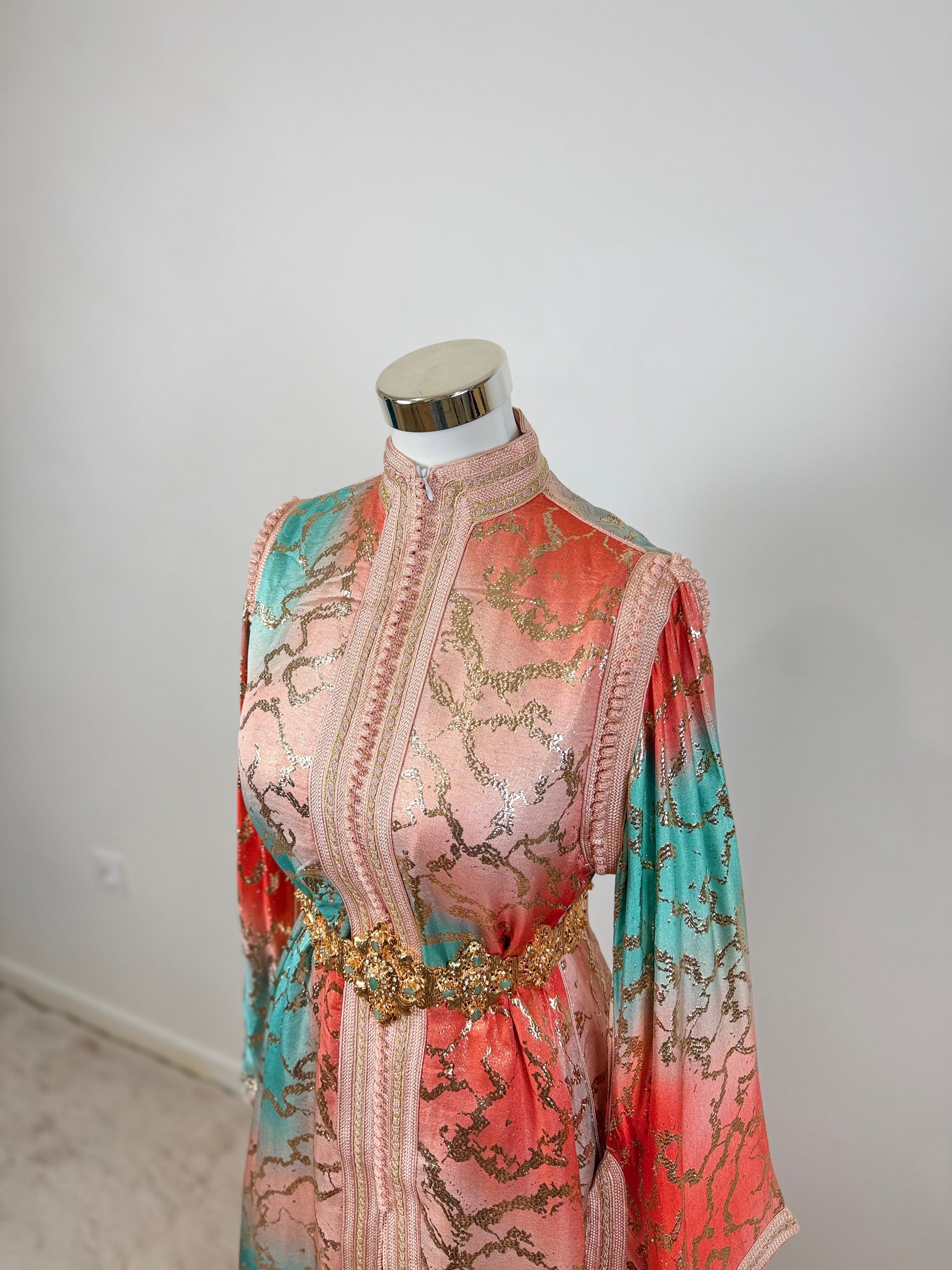 this caftan combines the charm of Moroccan craftsmanship with a contemporary touch,
