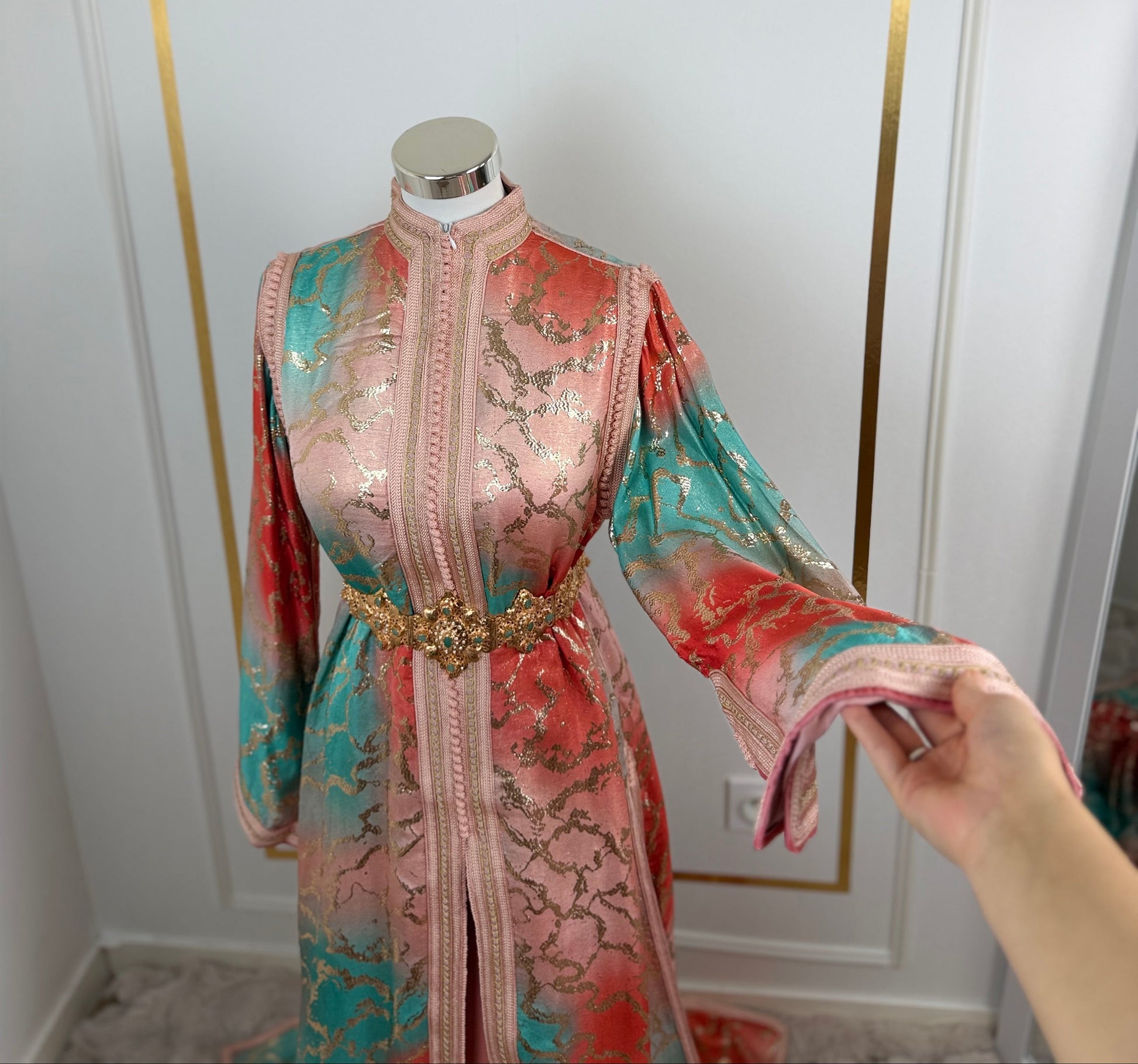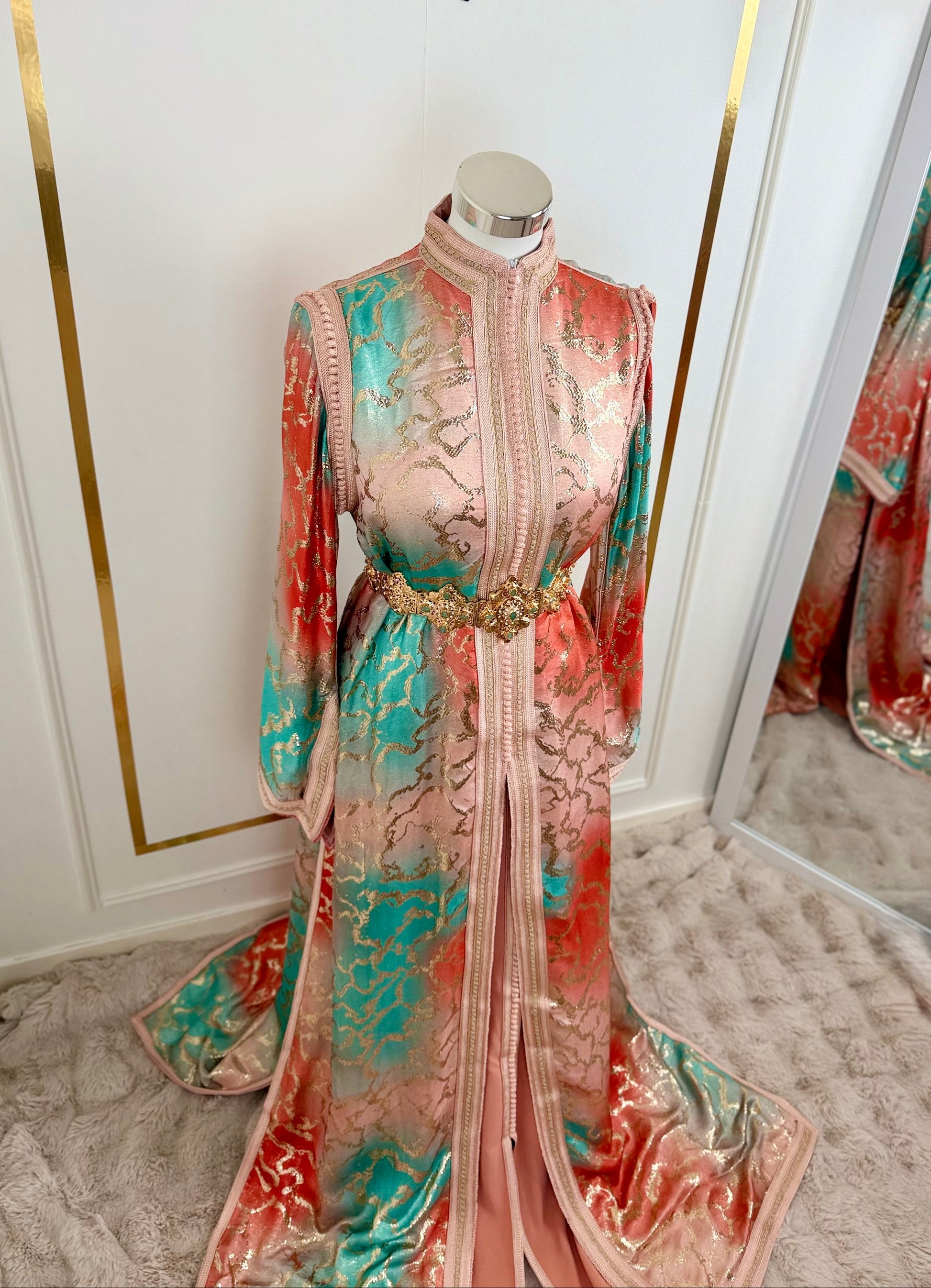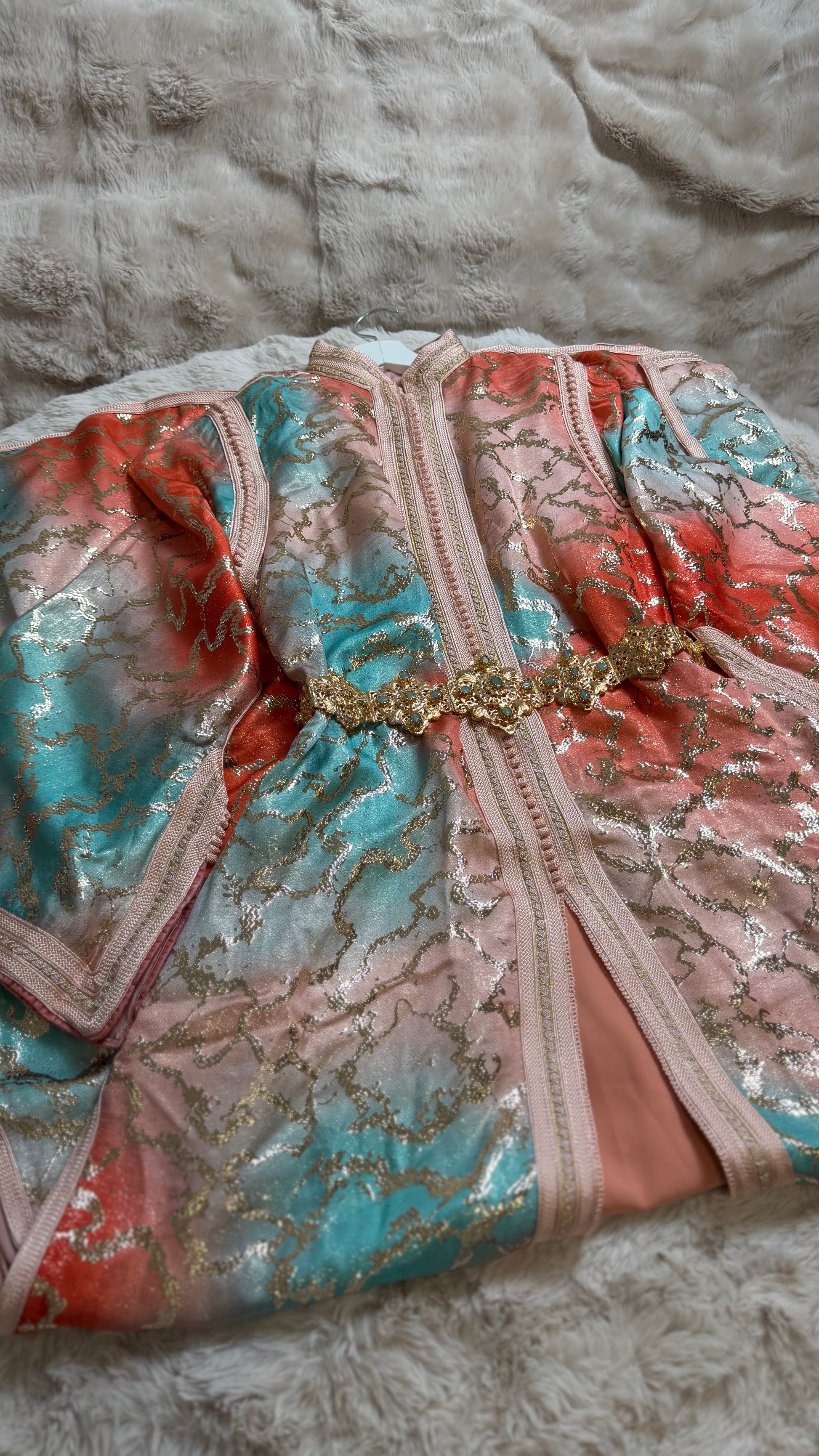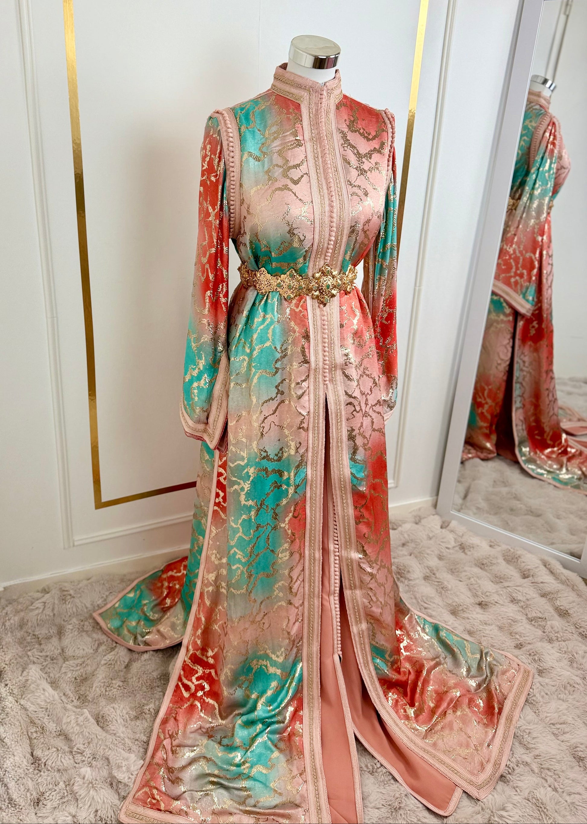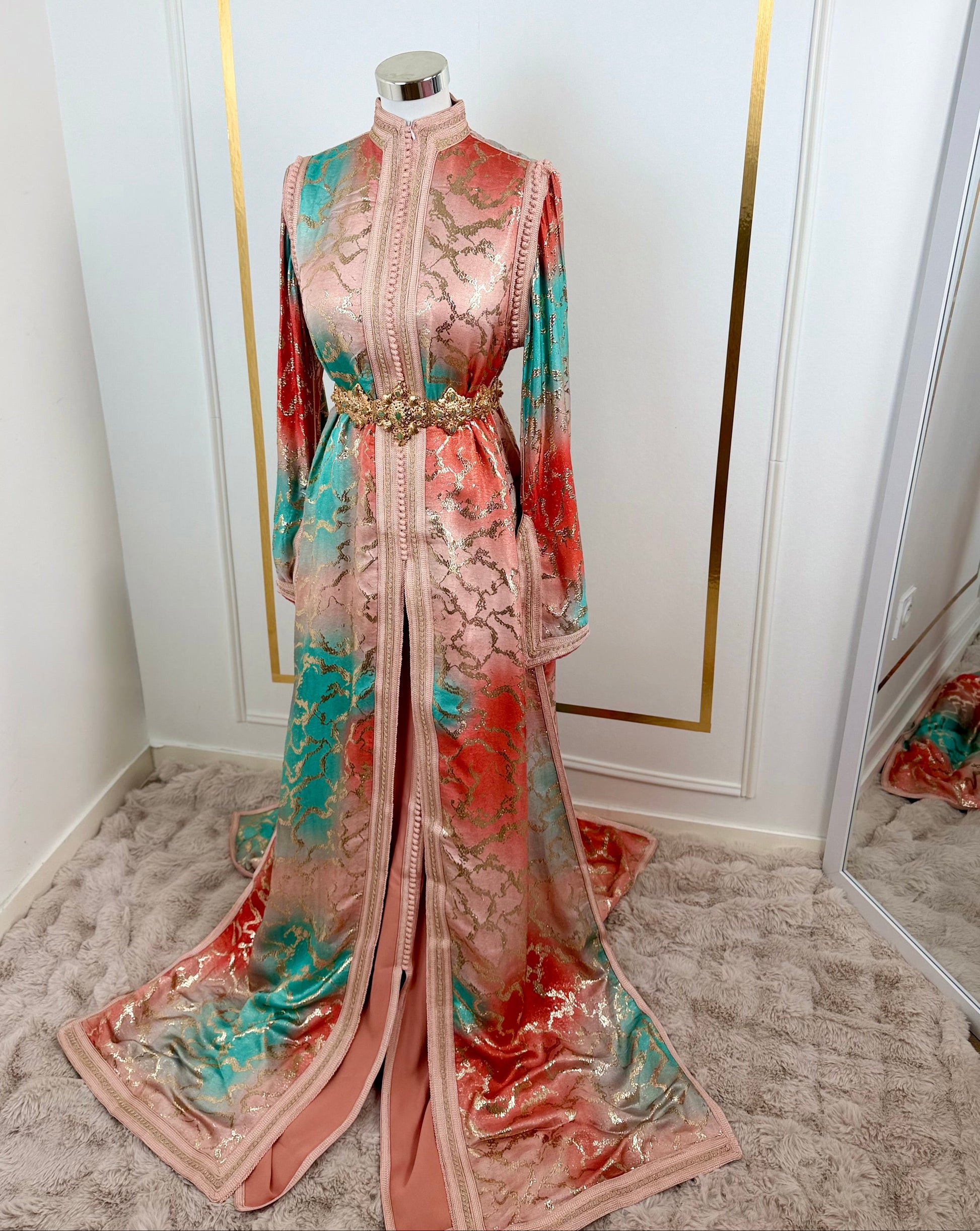 this caftan combines the charm of Moroccan craftsmanship with a contemporary touch,