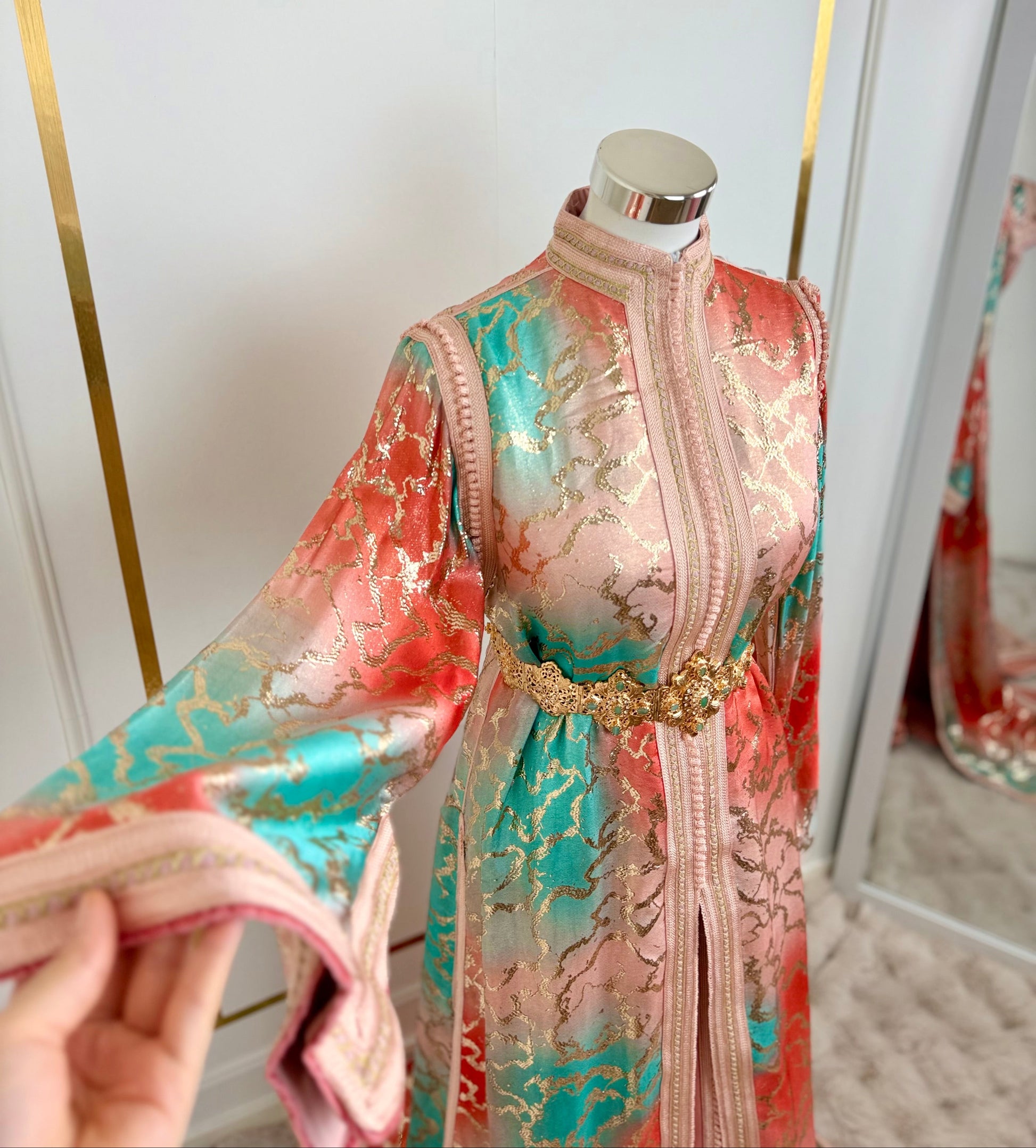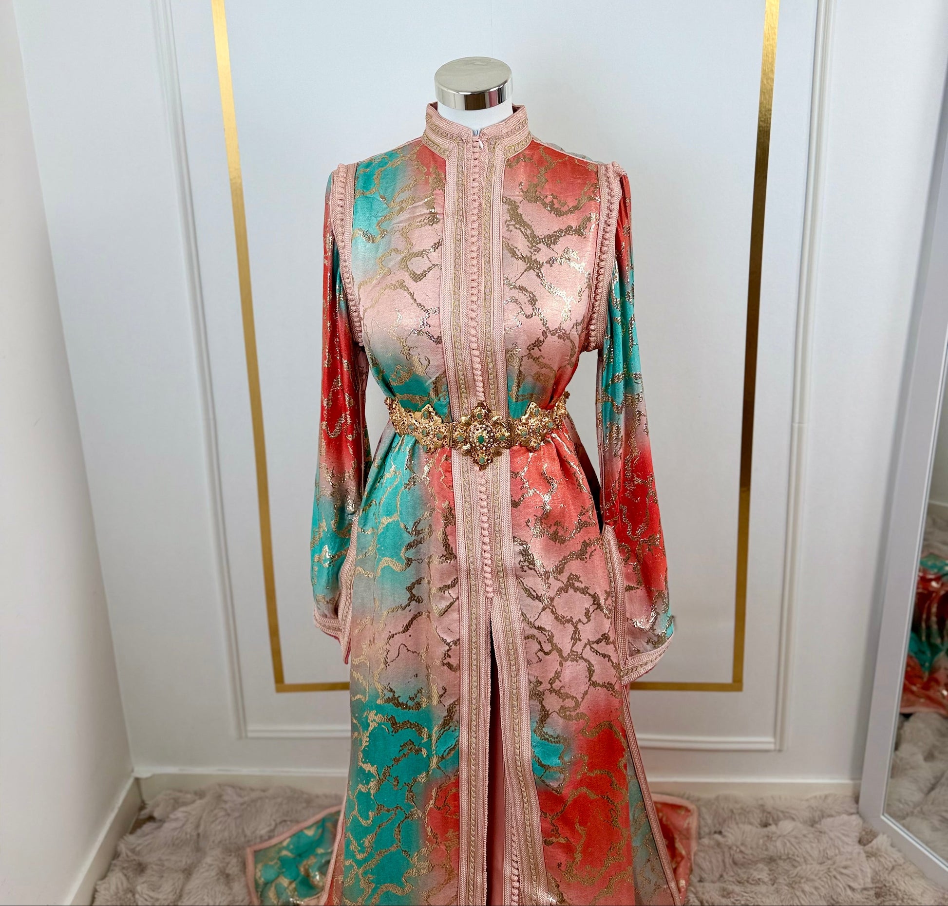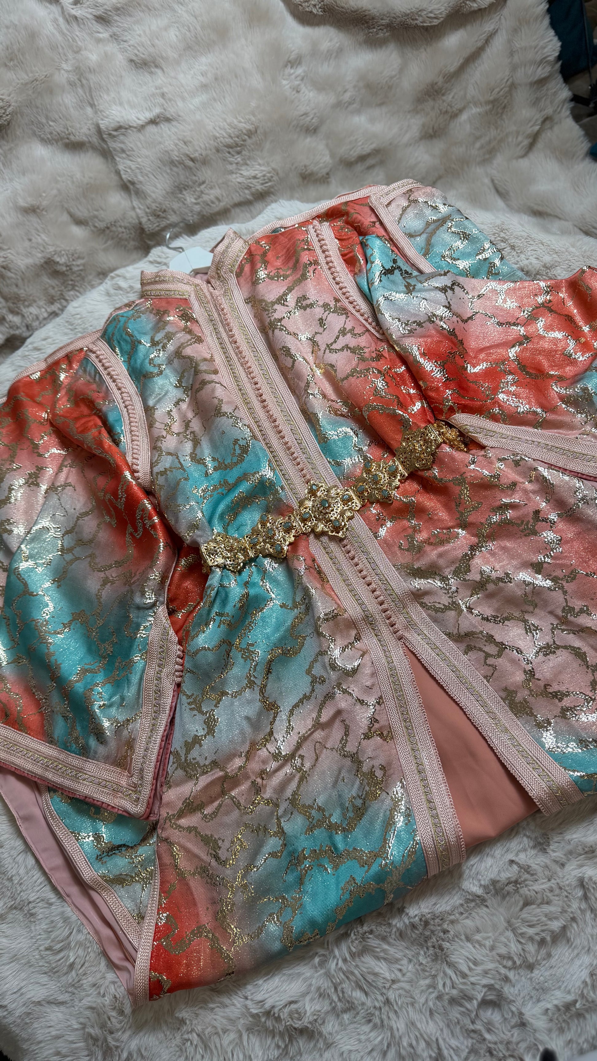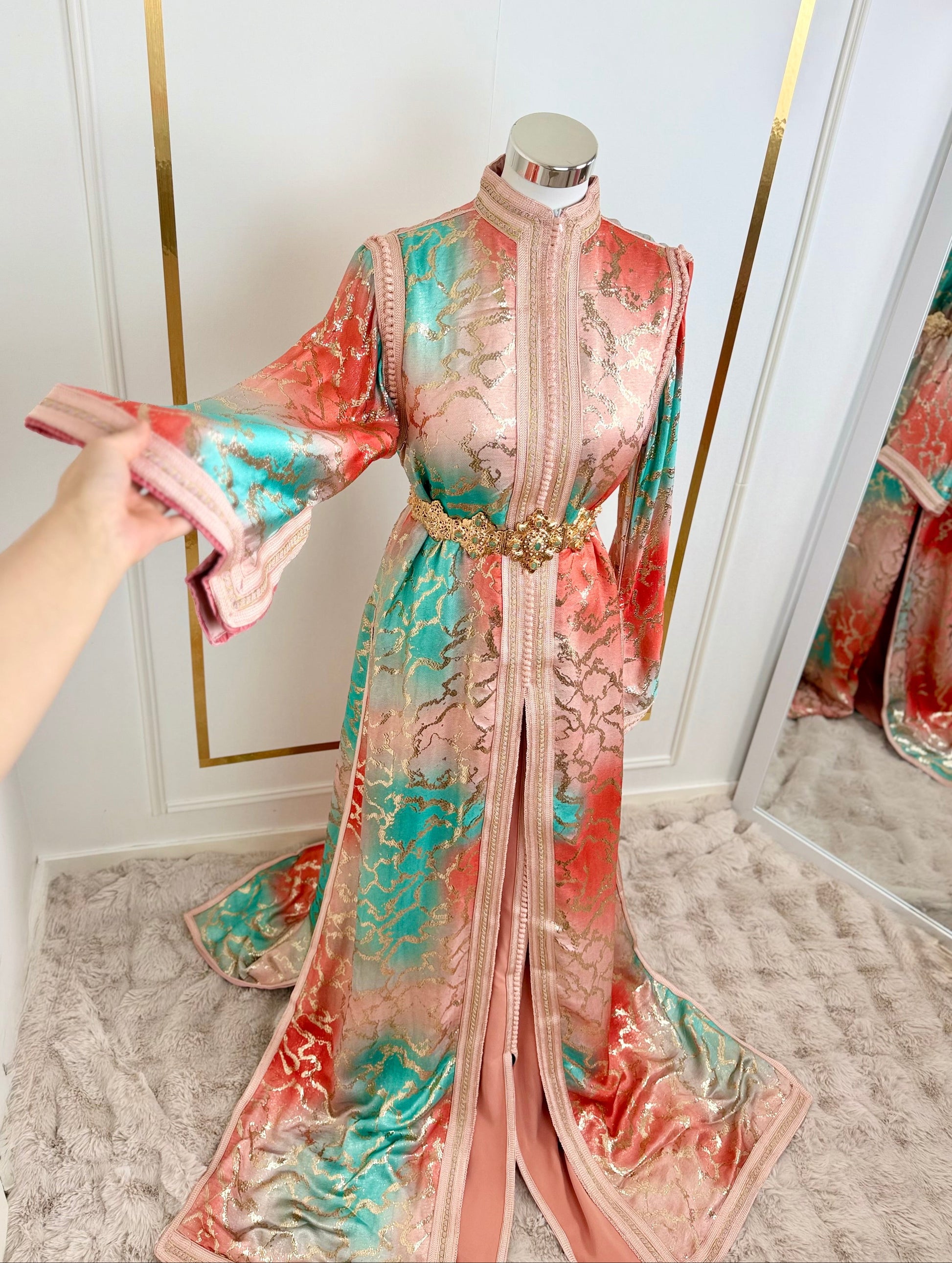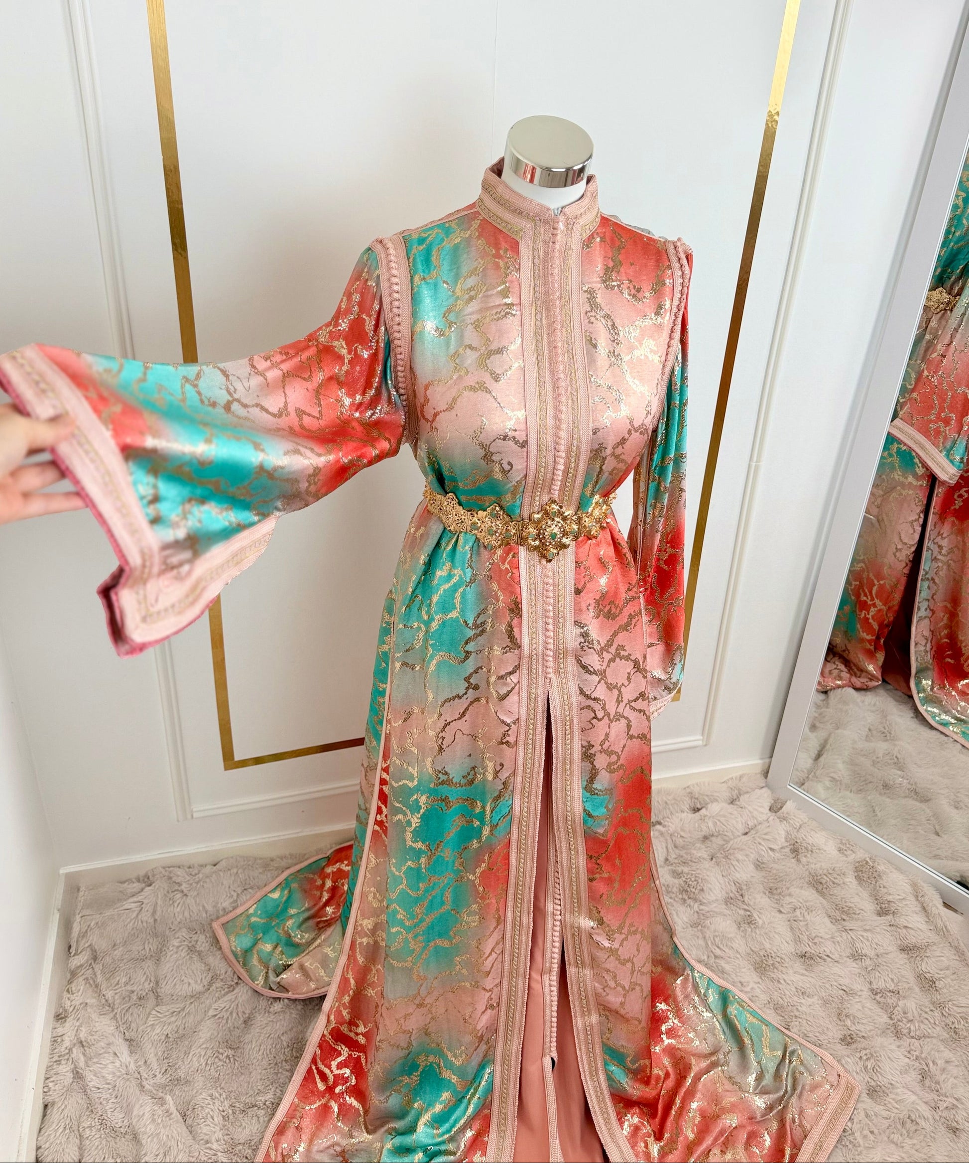 this caftan combines the charm of Moroccan craftsmanship with a contemporary touch,