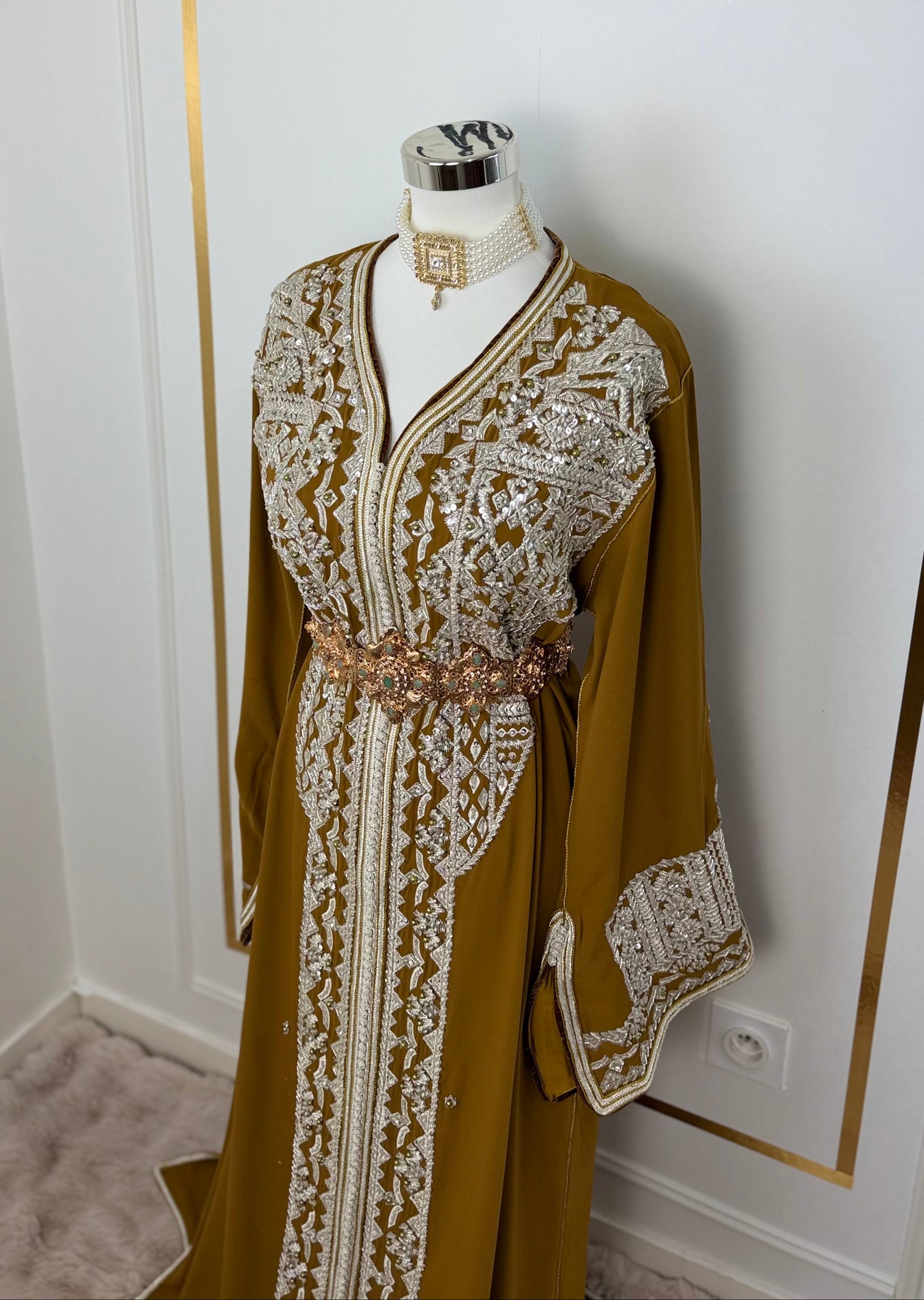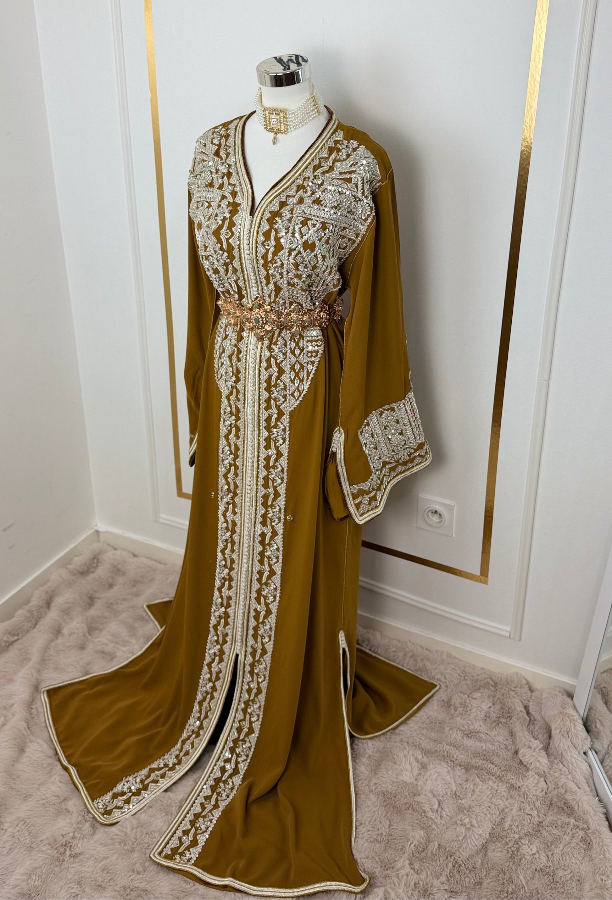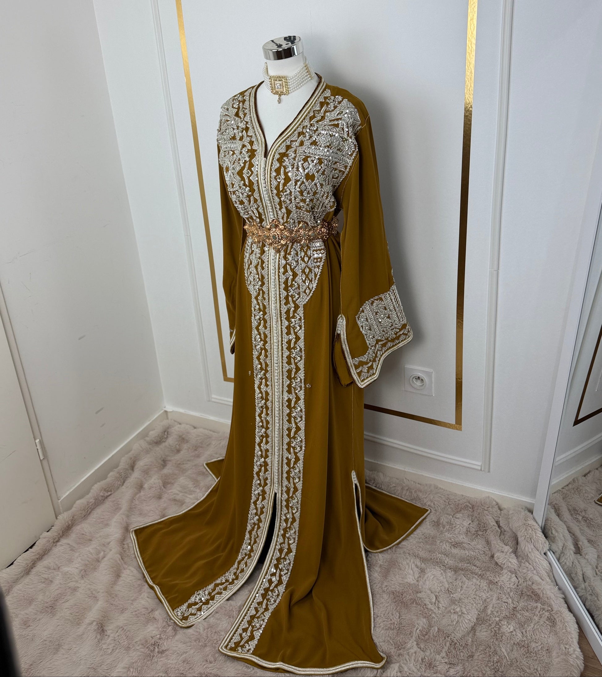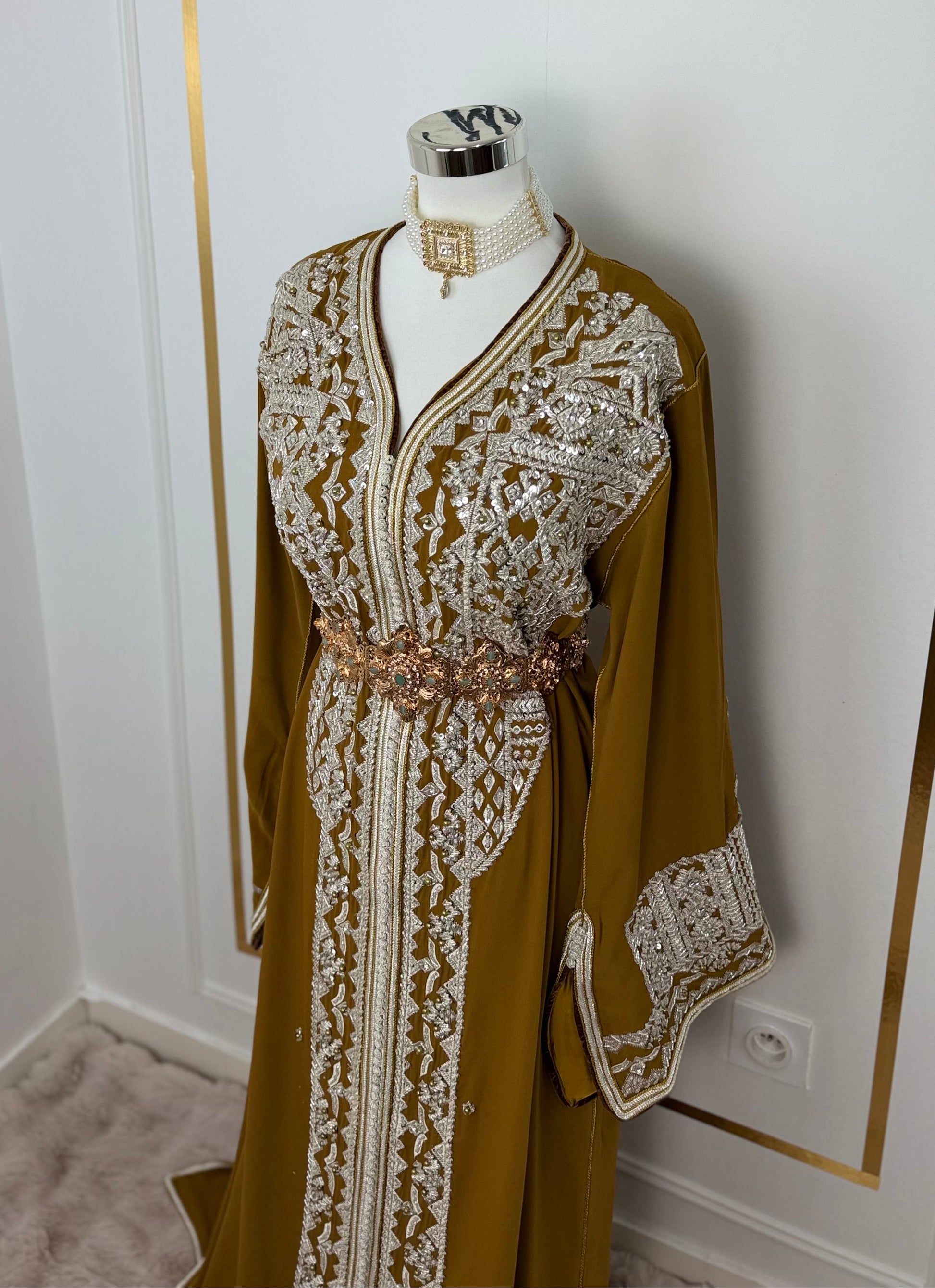 this caftan combines the charm of Moroccan craftsmanship with a contemporary touch,