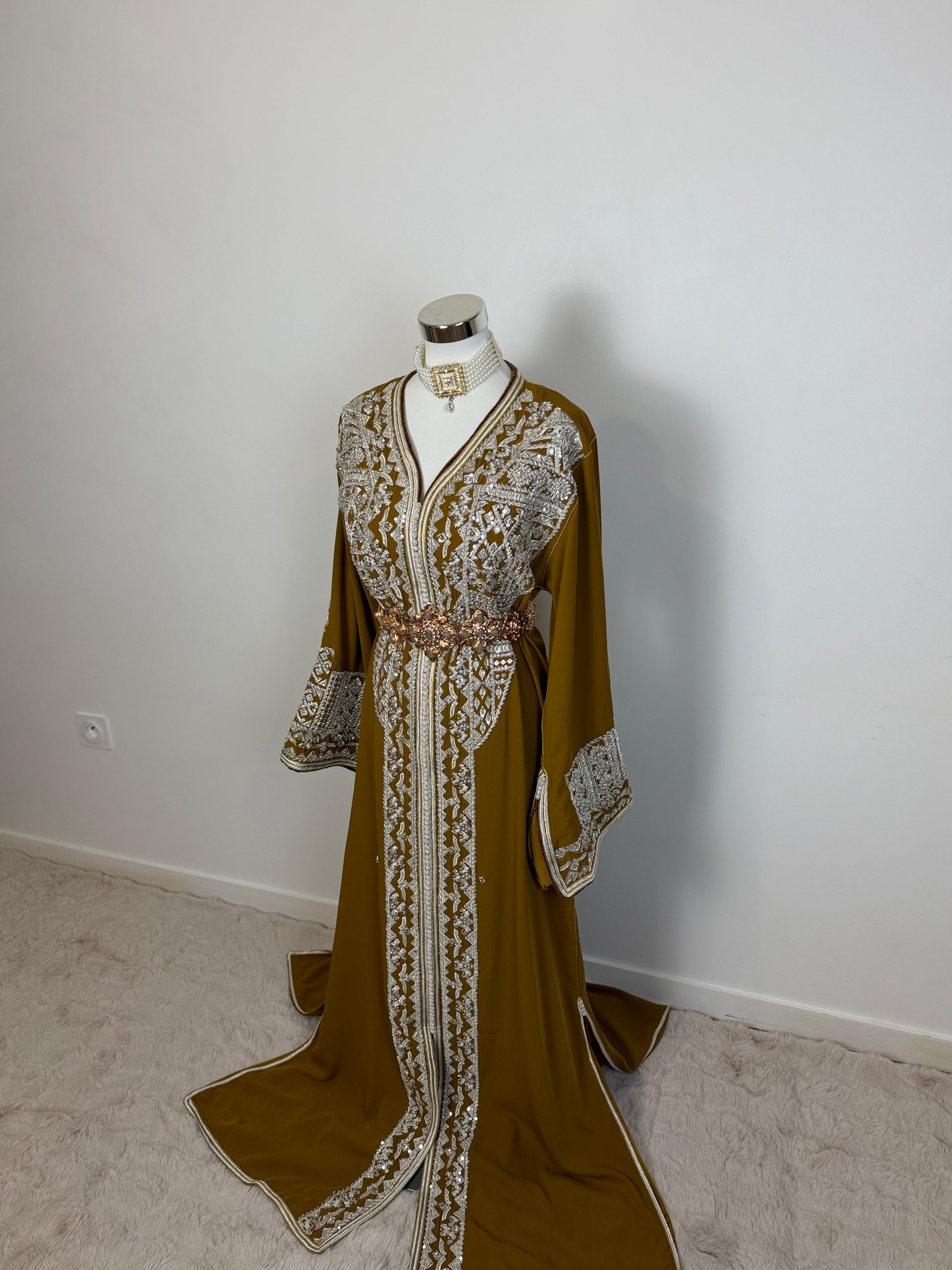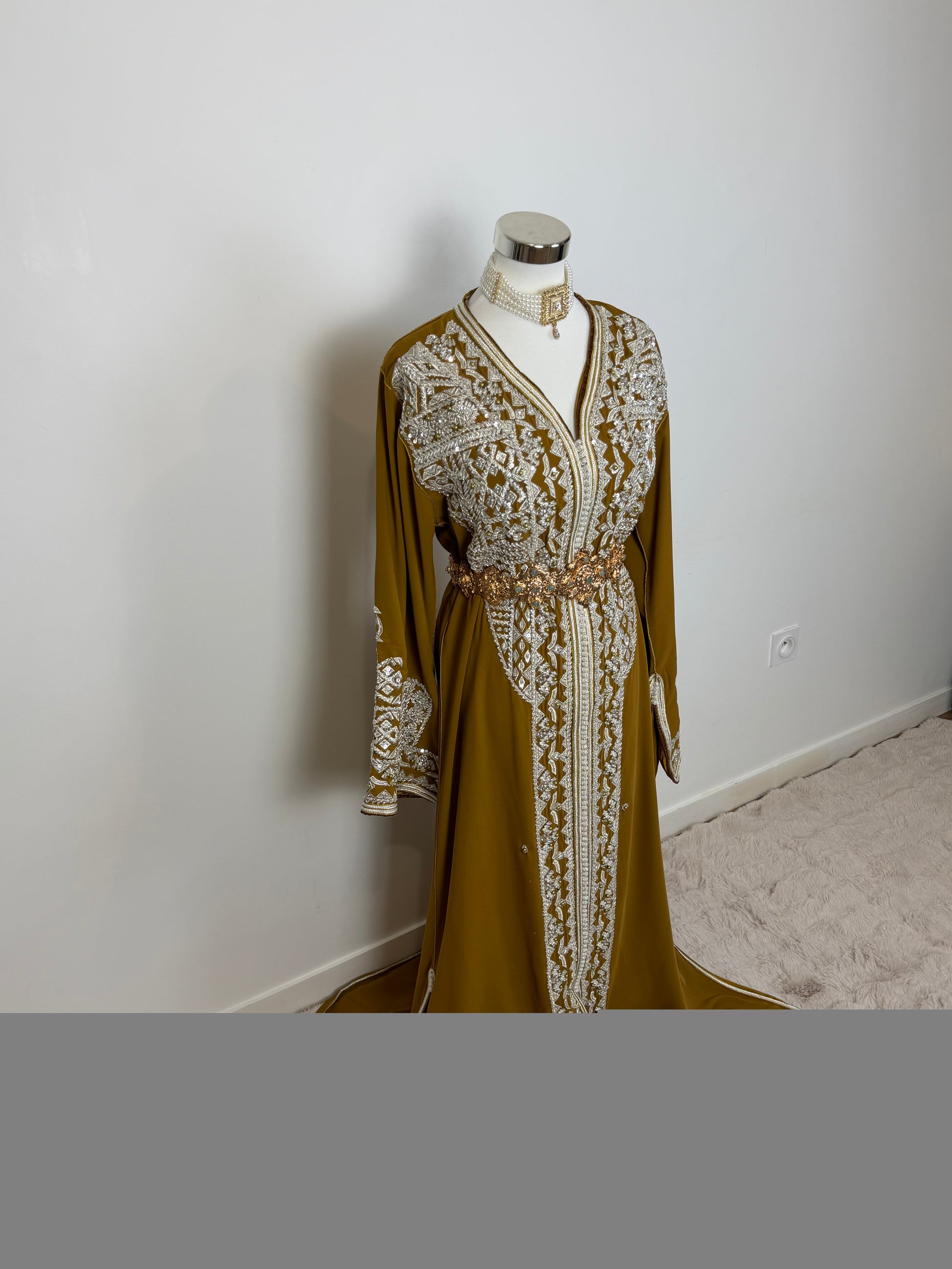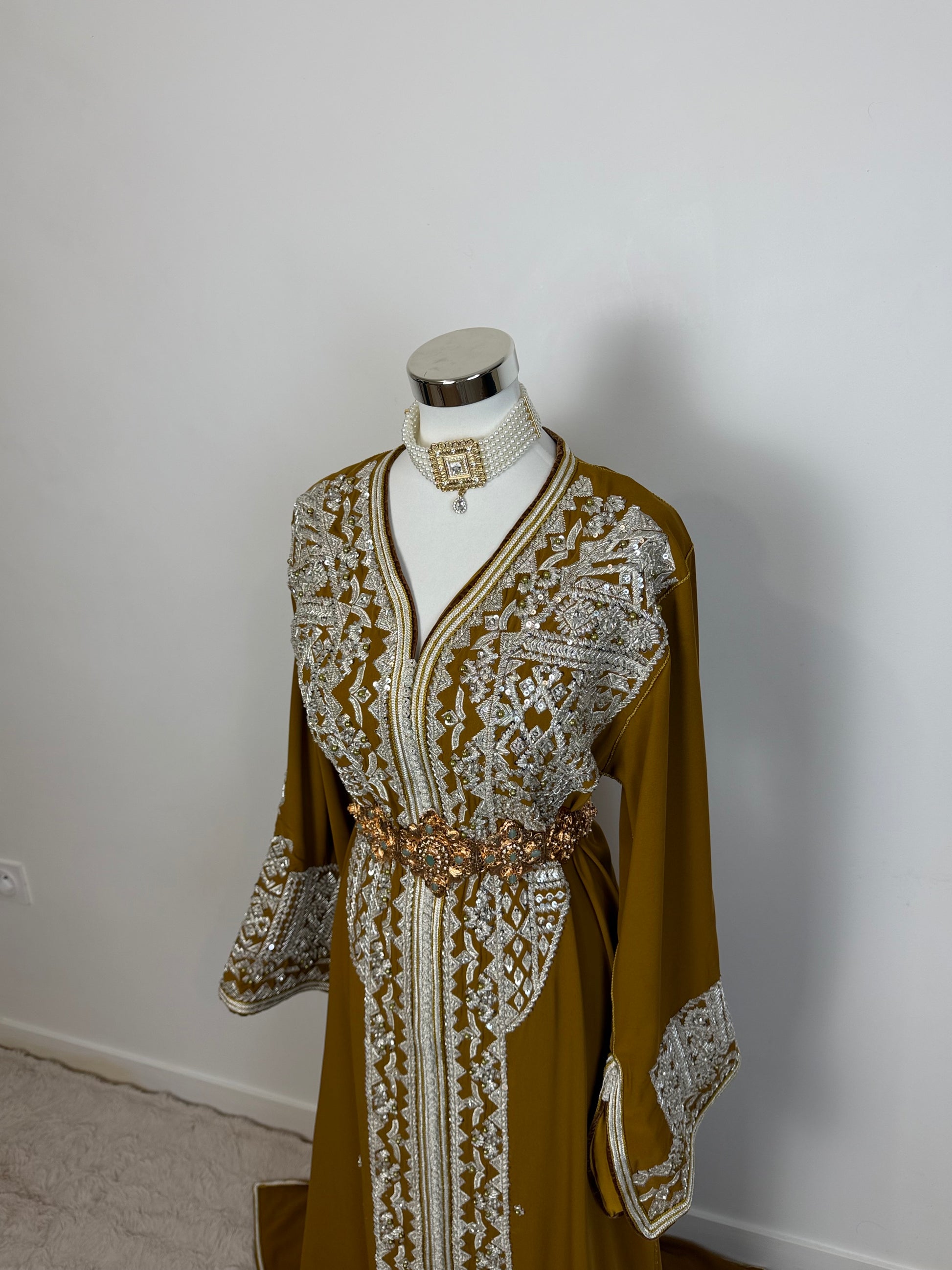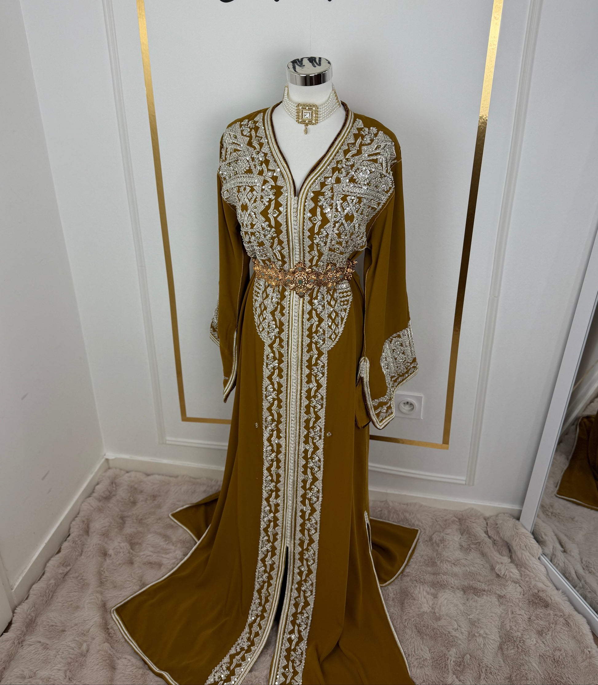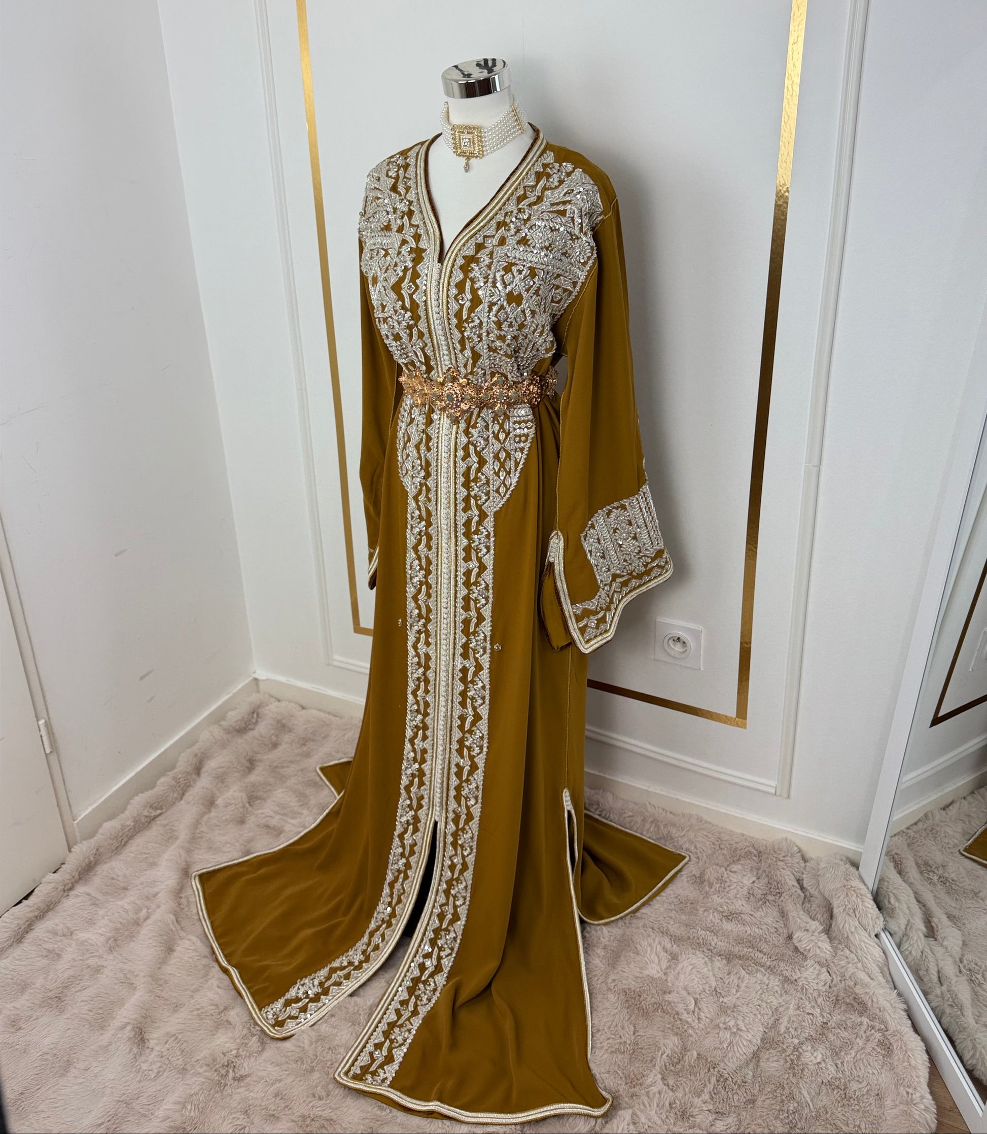 this caftan combines the charm of Moroccan craftsmanship with a contemporary touch,