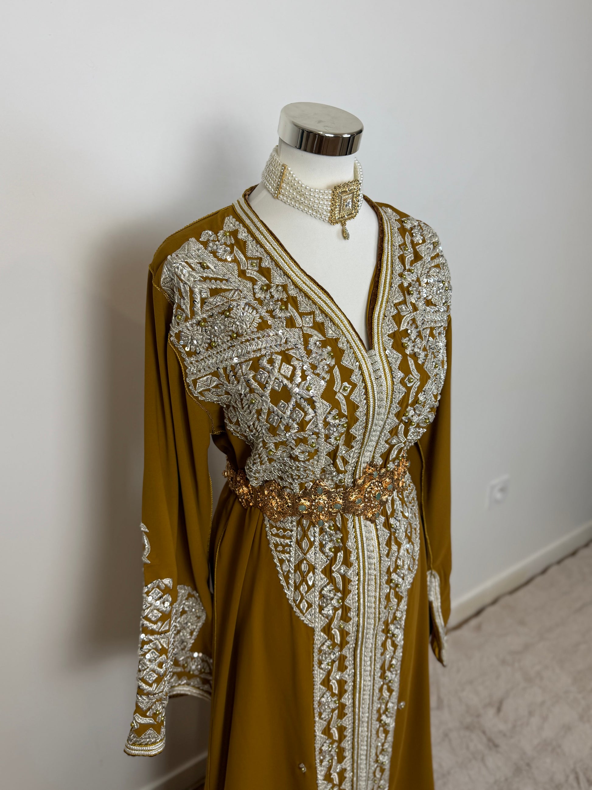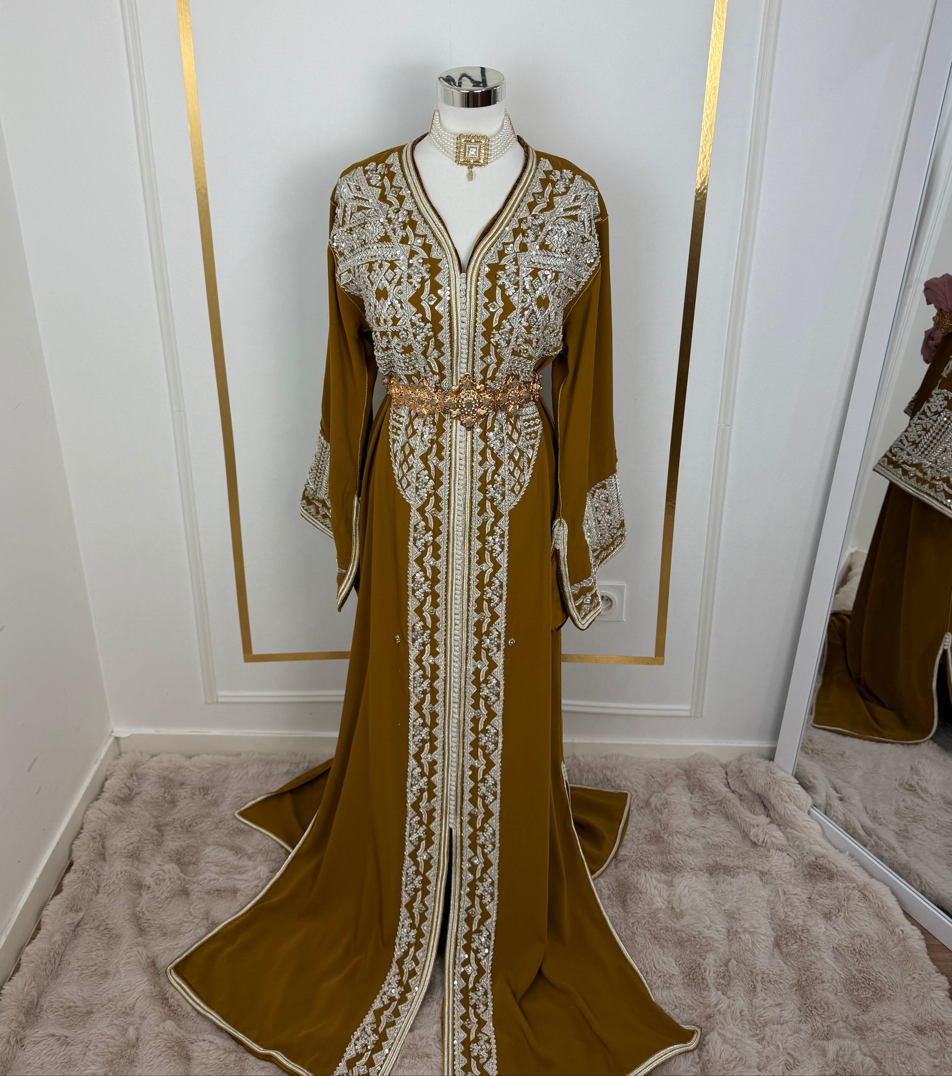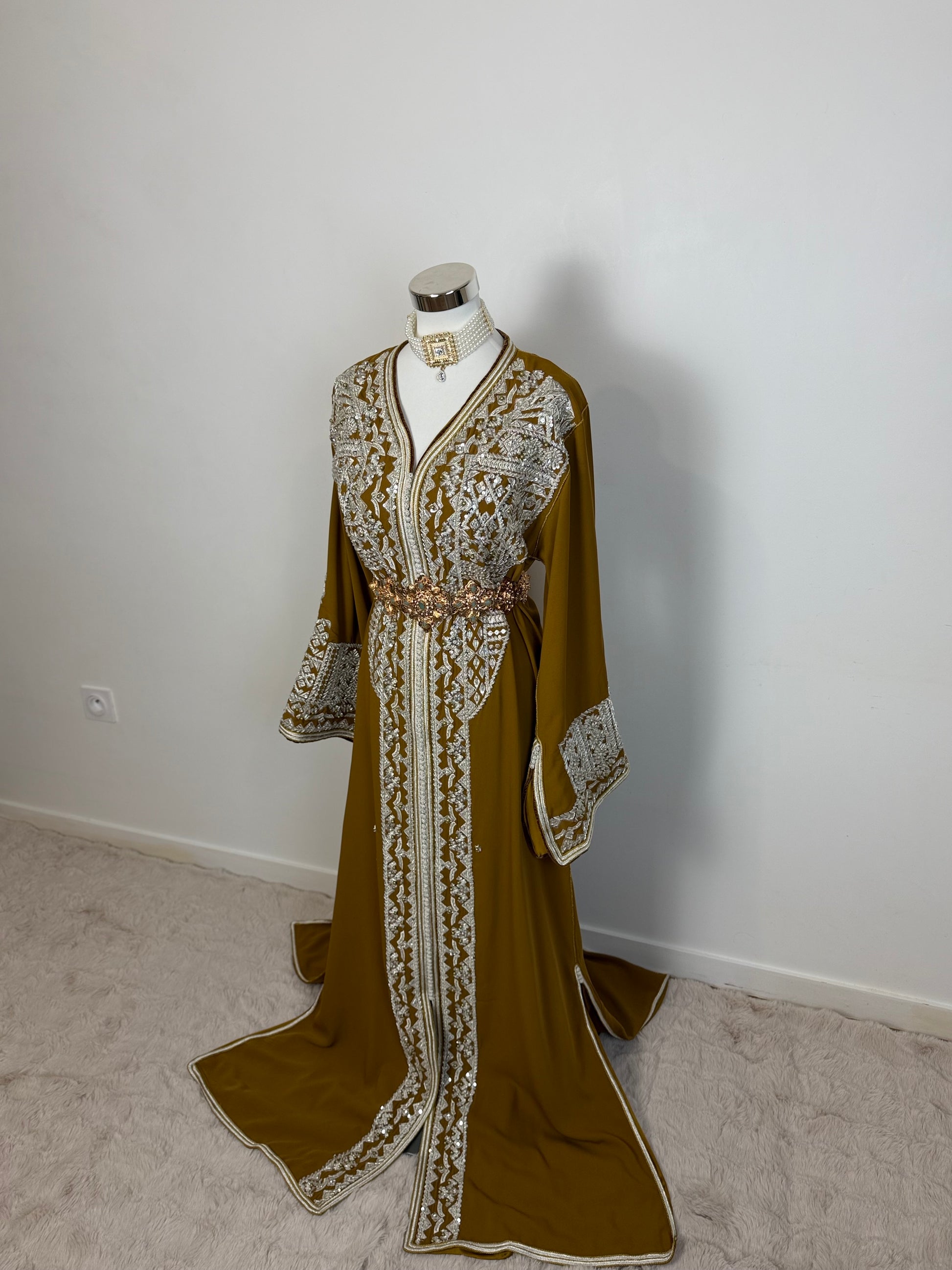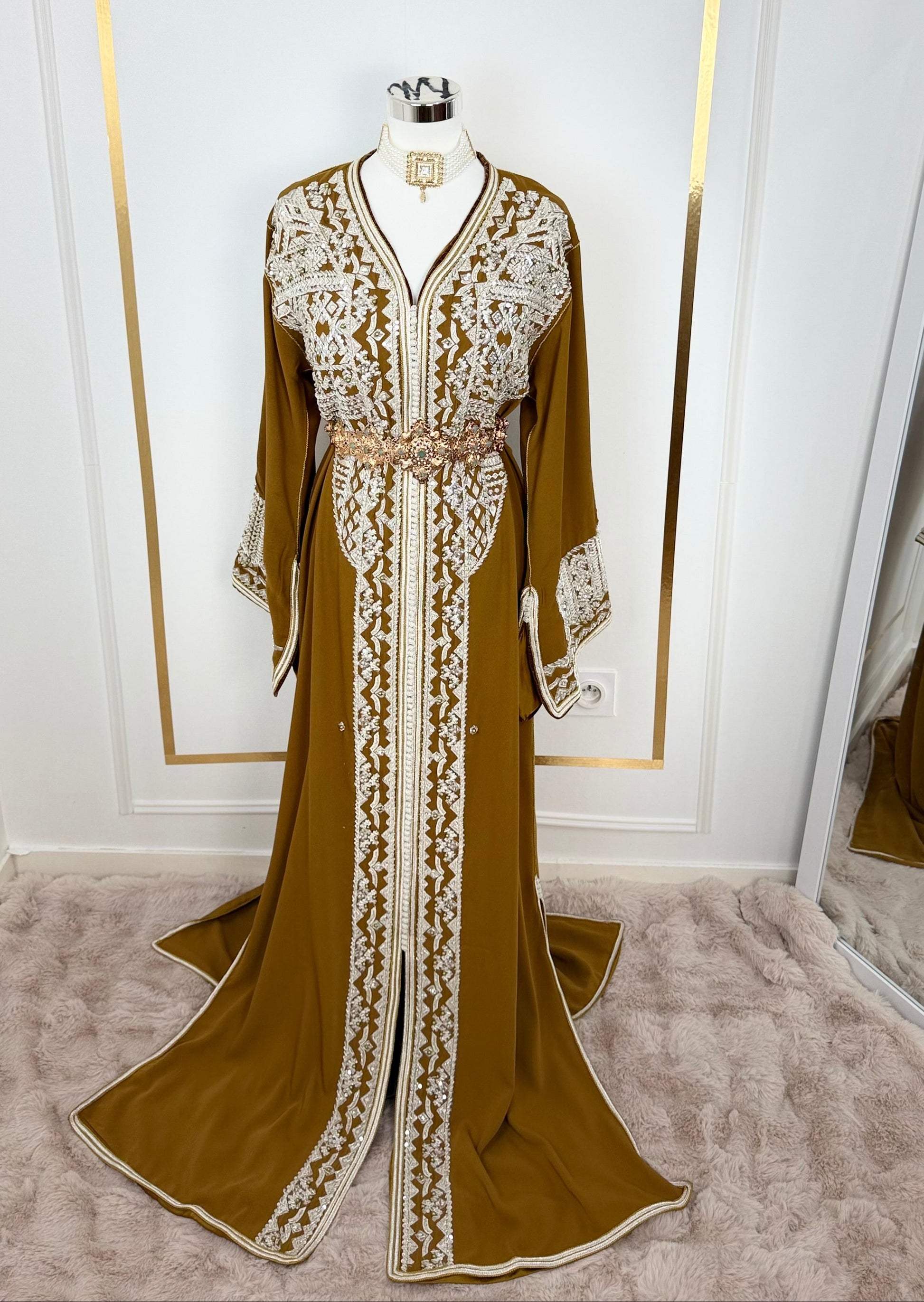 this caftan combines the charm of Moroccan craftsmanship with a contemporary touch,
