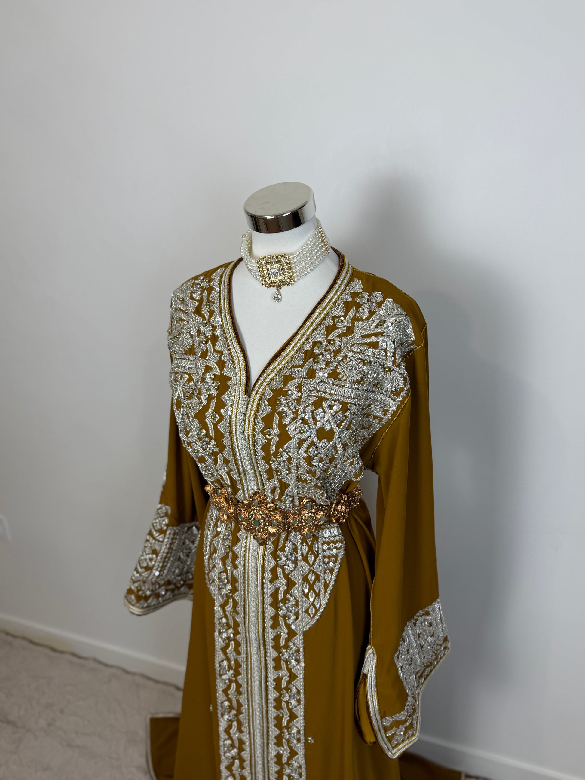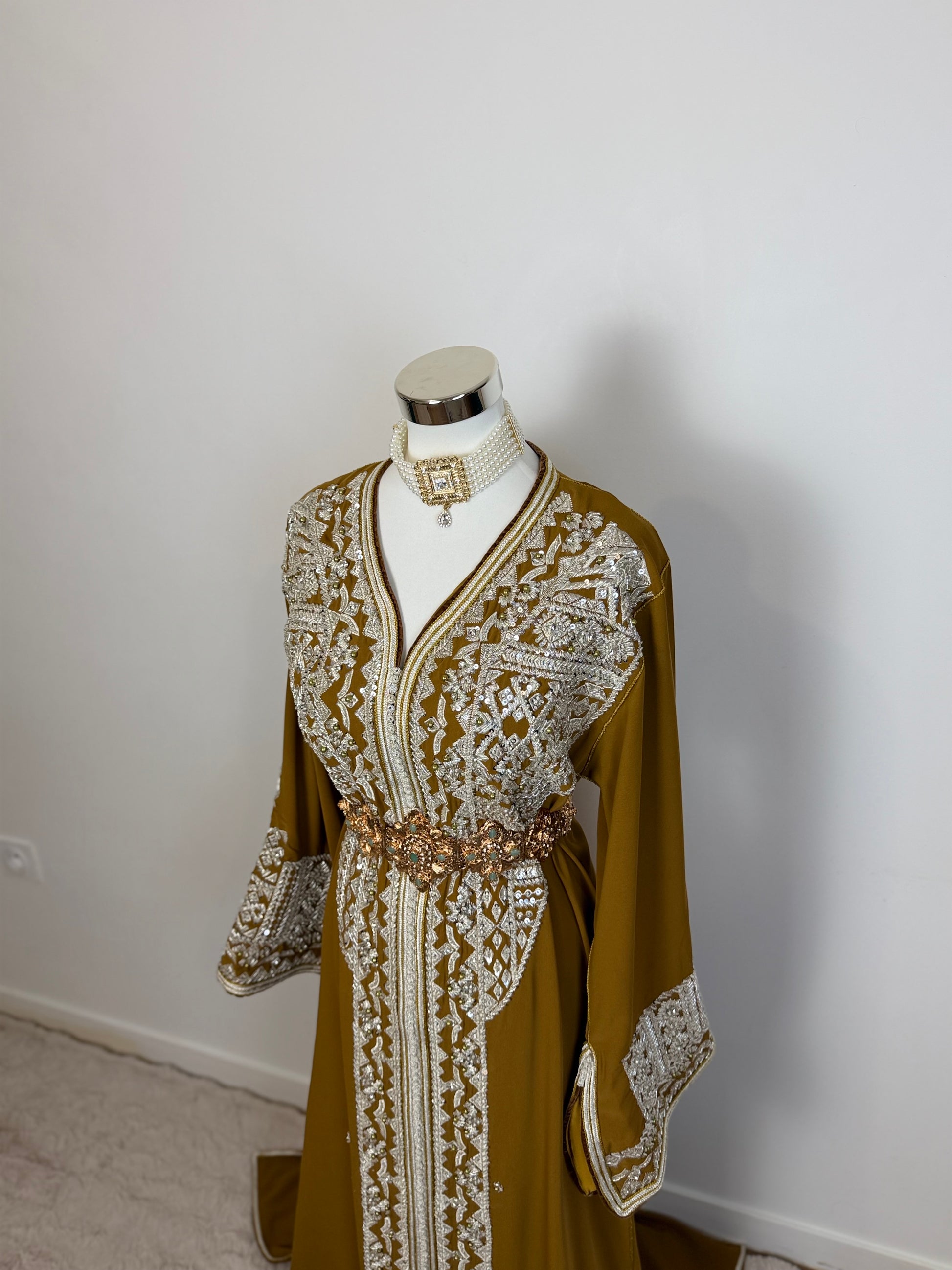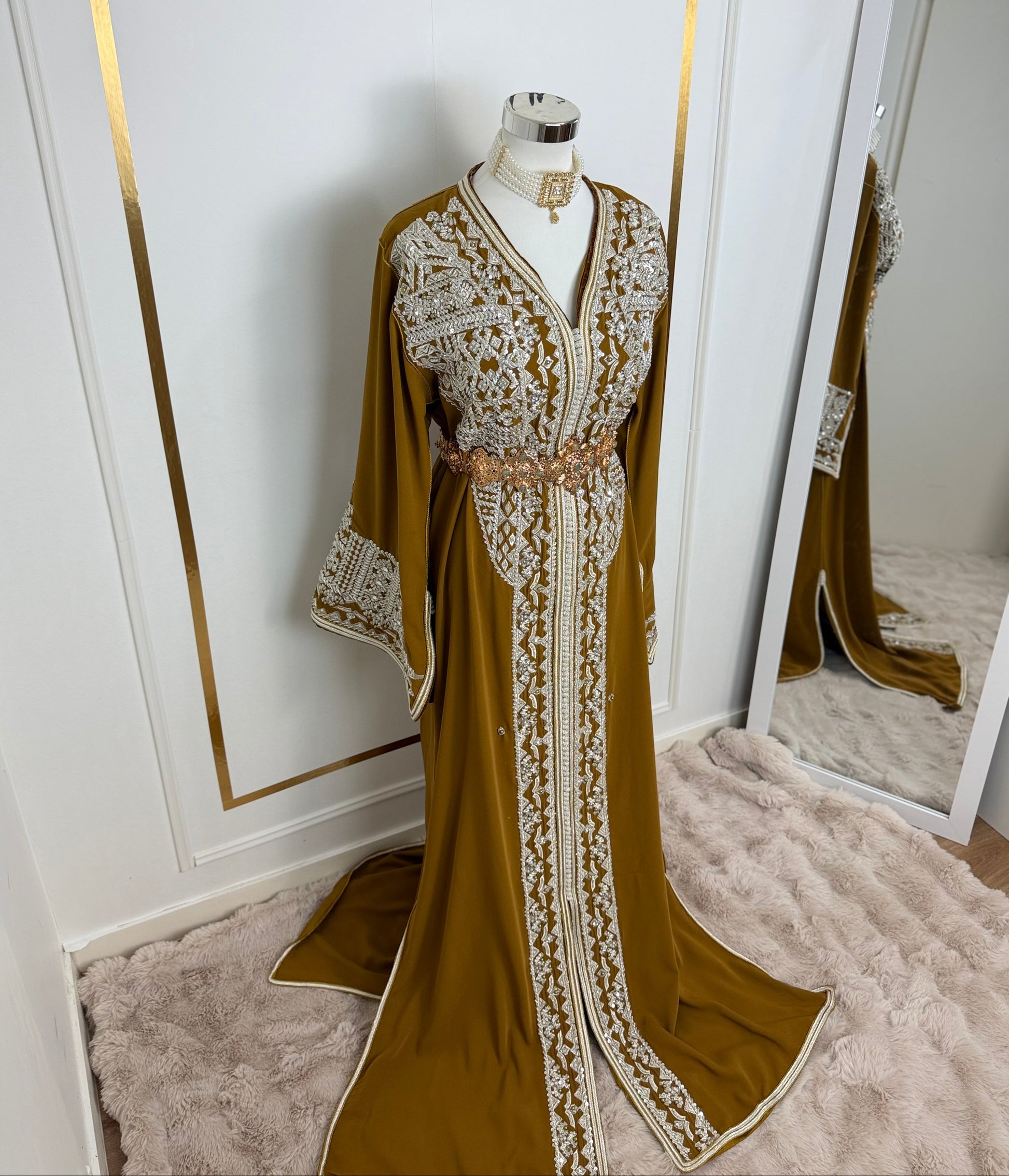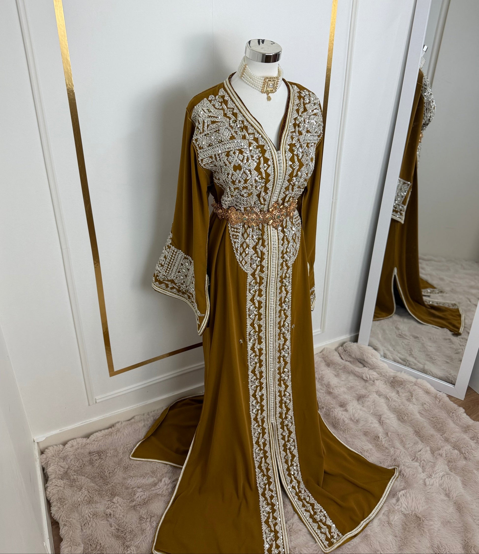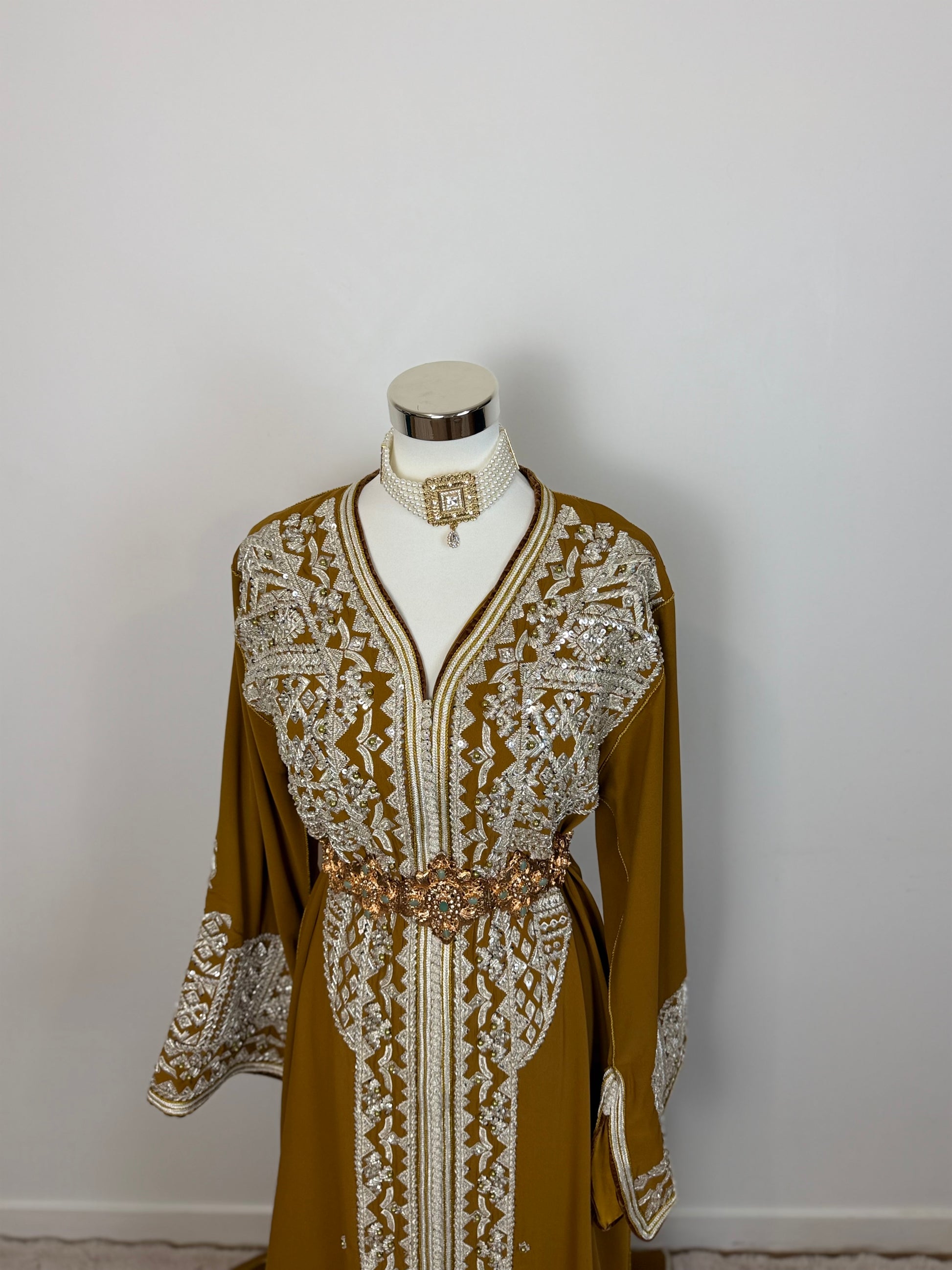 this caftan combines the charm of Moroccan craftsmanship with a contemporary touch,